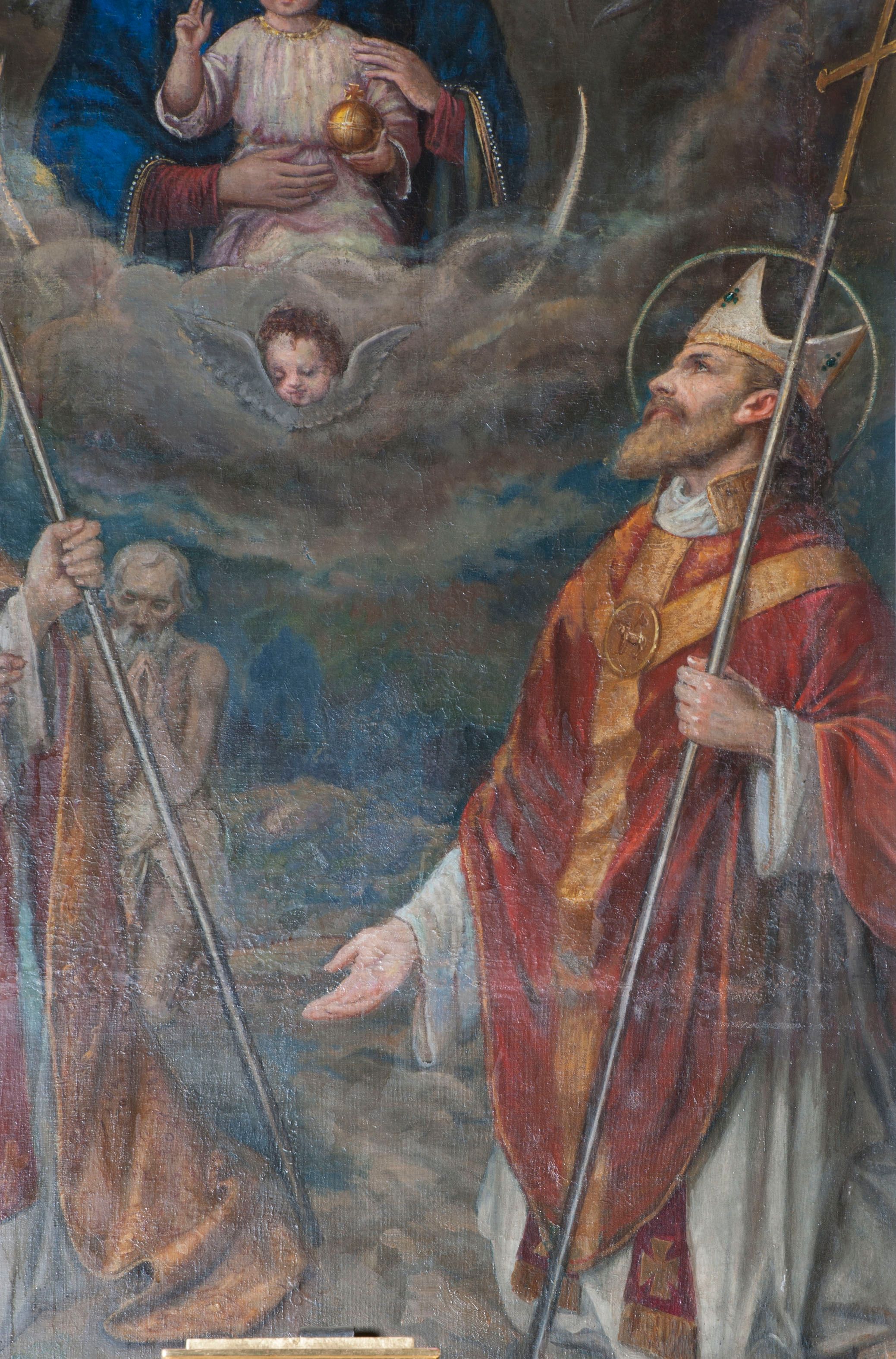 Święty Wojciech natomiast urodził się w Czechach, podczas bierzmowania przyjął imię Adalbertus. Był biskupem Pragi, misjonarzem na Węgrzech, w Polsce i w Prusach, gdzie został zamordowany w 997 roku. Na obrazie w Mucharzu został ukazany bez identyfikujących go jednoznacznie atrybutów, jedynie trzymając ferulę – pastorał zakończony krzyżem – która pozwala ujrzeć w nim jednego z biskupów.