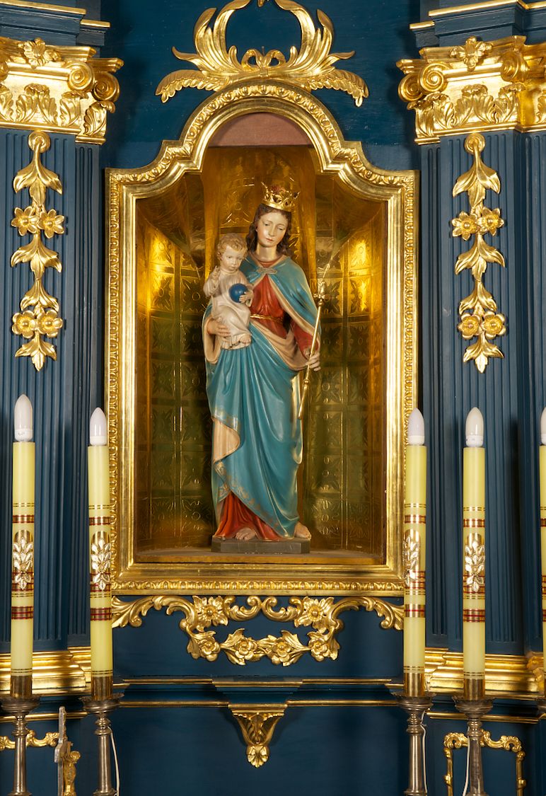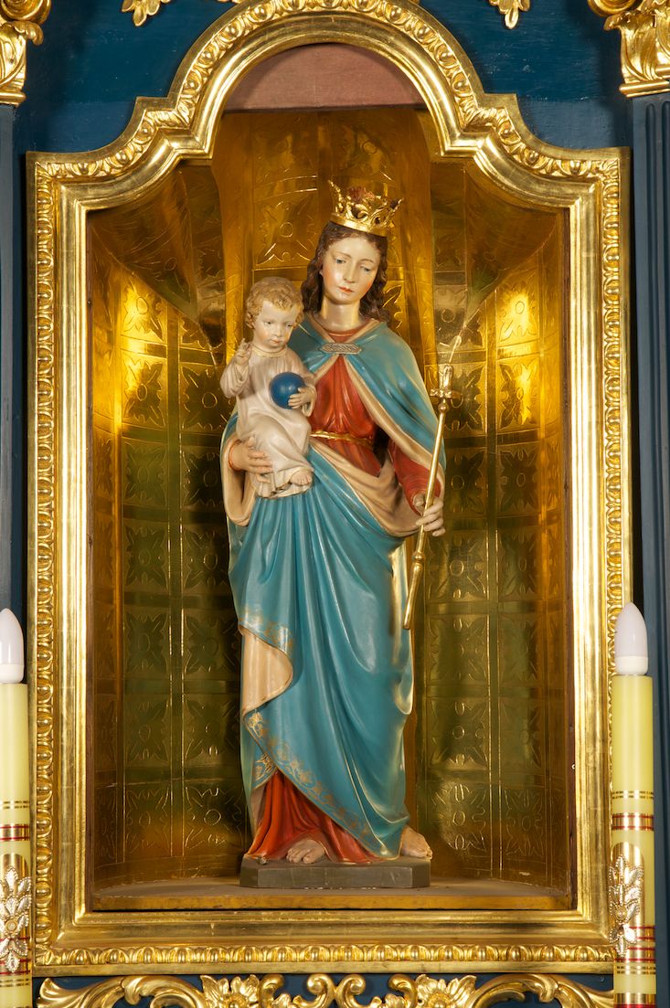 Figura Matki Boskiej z Dzieciątkiem ustawiona na niskiej, ciemnobrązowej podstawie. Maria ukazana frontalnie, w wykroku, z głową lekko przechyloną w lewo; prawą ręką podtrzymuje Dzieciątko, w lewej trzyma złote berło. Twarz ma owalną, o młodzieńczych i regularnych rysach; oczy ma skierowane w dół, prosty, długi nos i wąskie usta. Jasnobrązowe, falowane włosy spływają jej na plecy. Na głowie ma złoconą, otwartą koronę. Jest ubrana w czerwoną suknię przewiązaną w pasie złoconym sznurem oraz niebieski płaszcz z beżową podszewką, spięty na piersi klamrą, okrywający ramiona, nogi i podtrzymywany z przodu. Dzieciątko w pozycji siedzącej, frontalnie, ze skrzyżowanymi nogami, prawą rękę unosi w geście błogosławieństwa, w lewej trzyma niebieską kulę. Ma owalną twarz, małe oczy, wąski nos i niewielkie usta, na policzkach rumieńce, a na głowie krótkie, jasne, kręcone włosy. Jest ubrane w jasną, długą tunikę.
