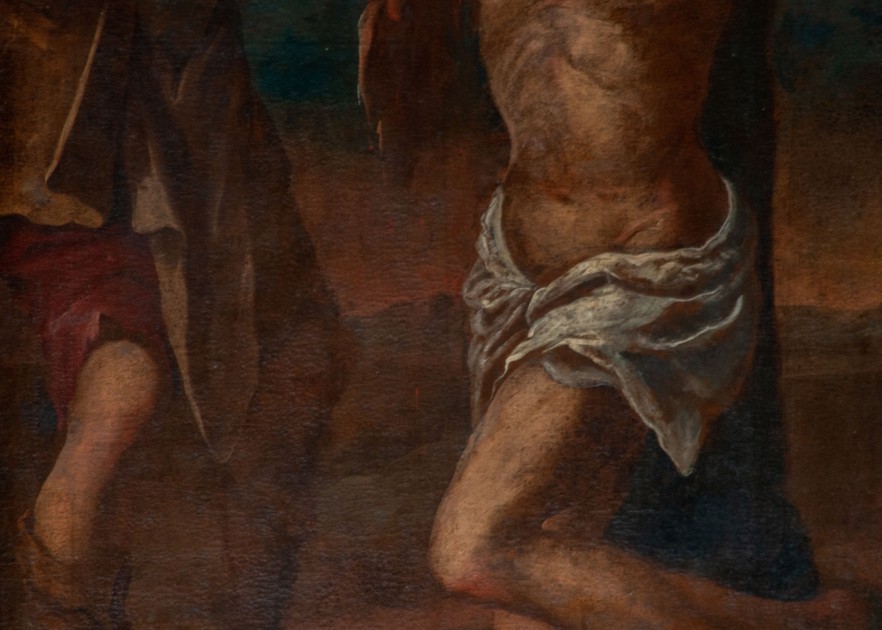 Obraz w kształcie stojącego prostokąta ukazuje przywiązanego do drzewa św. Bartłomieja obdzieranego ze skóry przez dwóch oprawców.