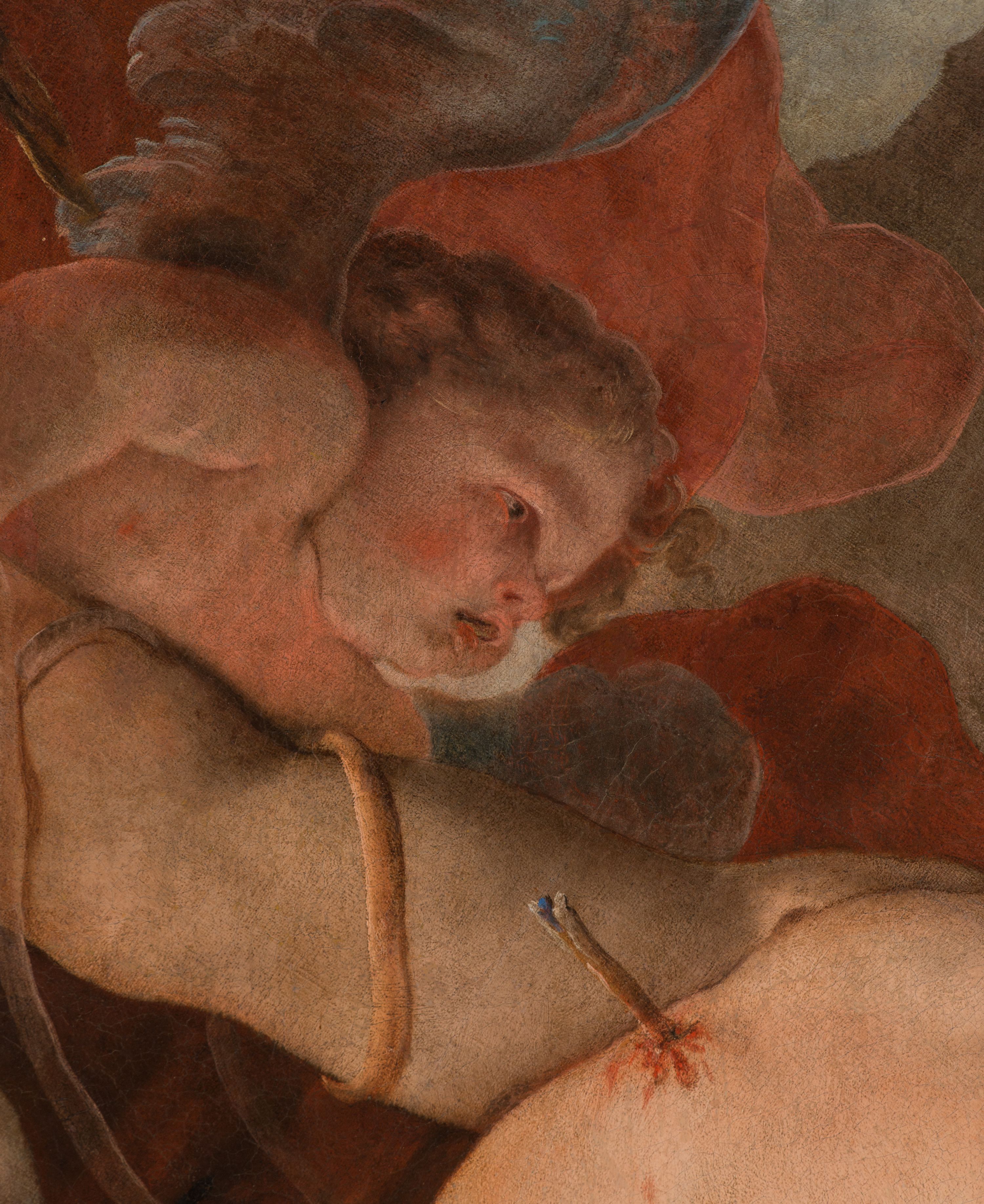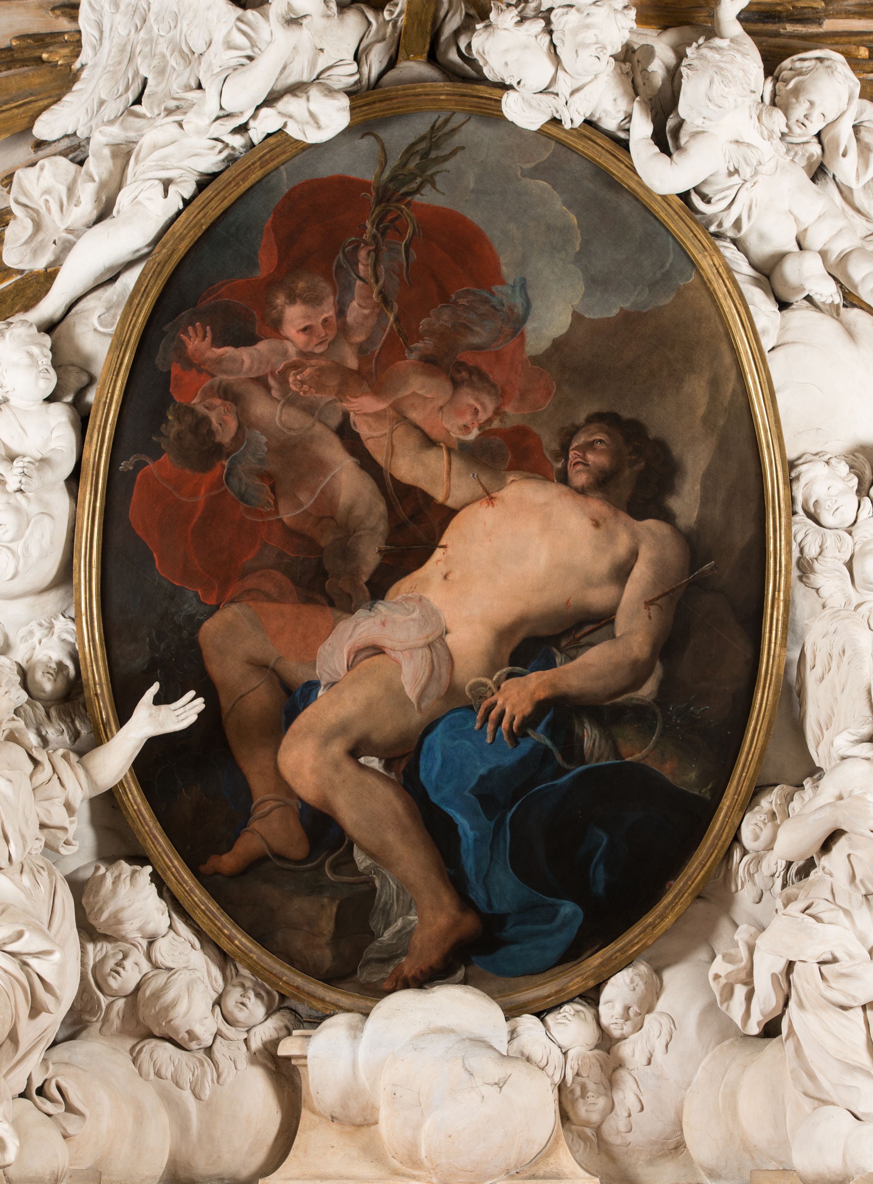 Obraz w kształcie owalu, w profilowanej, złoconej ramie ukazuje na wpół leżącego na skale, niemal nagiego św. Sebastiana przebitego strzałami w towarzystwie uskrzydlonych aniołków. Święty ukazany w trzech czwartych, z silnie wysklepioną klatką piersiową, głowę zwraca ku górze. Jego prawą, uniesioną rękę podtrzymuje anioł, lewa ręka spoczywa na skale. Biodra zasłania biała, zakrwawiona chusta, a na skale rozpostarta jest niebieska szata. Na nogach i rękach widoczne resztki krępujących go sznurów. Ciało przebijają trzy strzały, dwie w klatce piersiowej, jedna w lewym ramieniu. Za świętym trzy nagie niemalże aniołki w zróżnicowanych pozach, z których jeden trzyma palmę męczeństwa; anioły ukazane szkicowo, na tle czerwonej, rozłożystej tkaniny. W tle skłębione niebieskie chmury i szaro-brązowa nieokreślona przestrzeń. Po lewej, u dołu sygnatura „Paolo Pagani Pinxit".