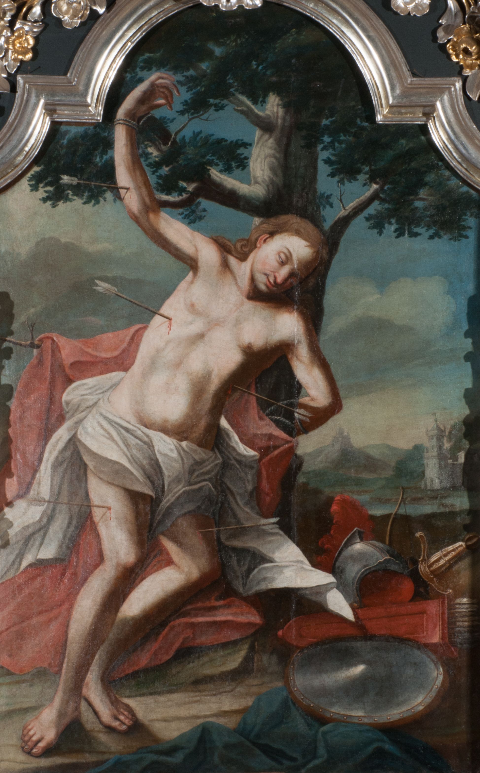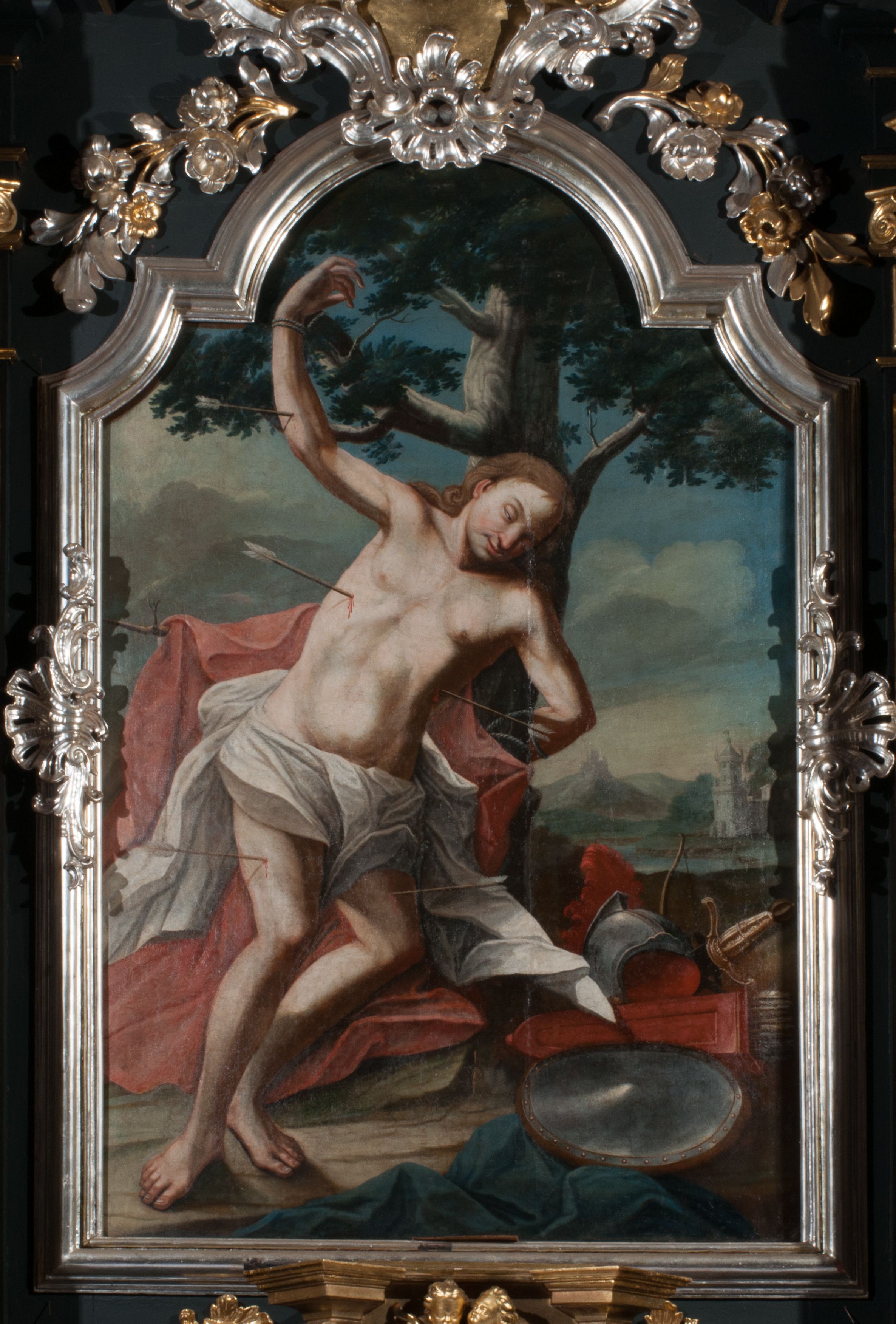 Obraz w formie stojącego prostokąta zamkniętego łukiem półkolistym nadwieszonym z uskokiem. W centrum kompozycji znajduje się św. Sebastian przywiązany do drzewa. Postać zwrócona jest w trzech czwartych w lewo, jej prawa ręka przywiązana jest wysoko do gałęzi, lewa z tyłu, za pniem drzewa. Ciało świętego na lekko ugiętych nogach opada bezwładnie. Jego twarz jest owalna, o młodzieńczych rysach, przymrużonych, migdałowatych oczach, dużym, lekko garbatym nosie oraz wąskich ustach. Okolona jest długimi jasnobrązowymi, kręconymi włosami opadającymi na ramiona. Ciało jest szczupłe, o delikatnie zarysowanej muskulaturze klatki piersiowej i ramion podkreślonej silnym światłocieniem, przebite jest czterema strzałami. Biodra świętego przepasane są białą, silnie drapowaną tkaniną, opadającą po jego bokach. Z tyłu na gałęziach zawieszony jest czerwony płaszcz opadający na ziemię, na który osuwa się ciało. W prawym dolnym rogu obrazu na ziemi leżą hełm, miecz, puklerz, łuk, kołczan ze strzałami oraz drapowana niebieska tkanina. Scena ukazana jest na tle pejzażu z zachmurzonym błękitno-żółtym niebem oraz z widocznymi po prawej stronie obrazu w oddali budynkami. Kolorystyka jasna, pastelowa, forma ciała i tkaniny wydobyte silnie skontrastowanym światłocieniem.