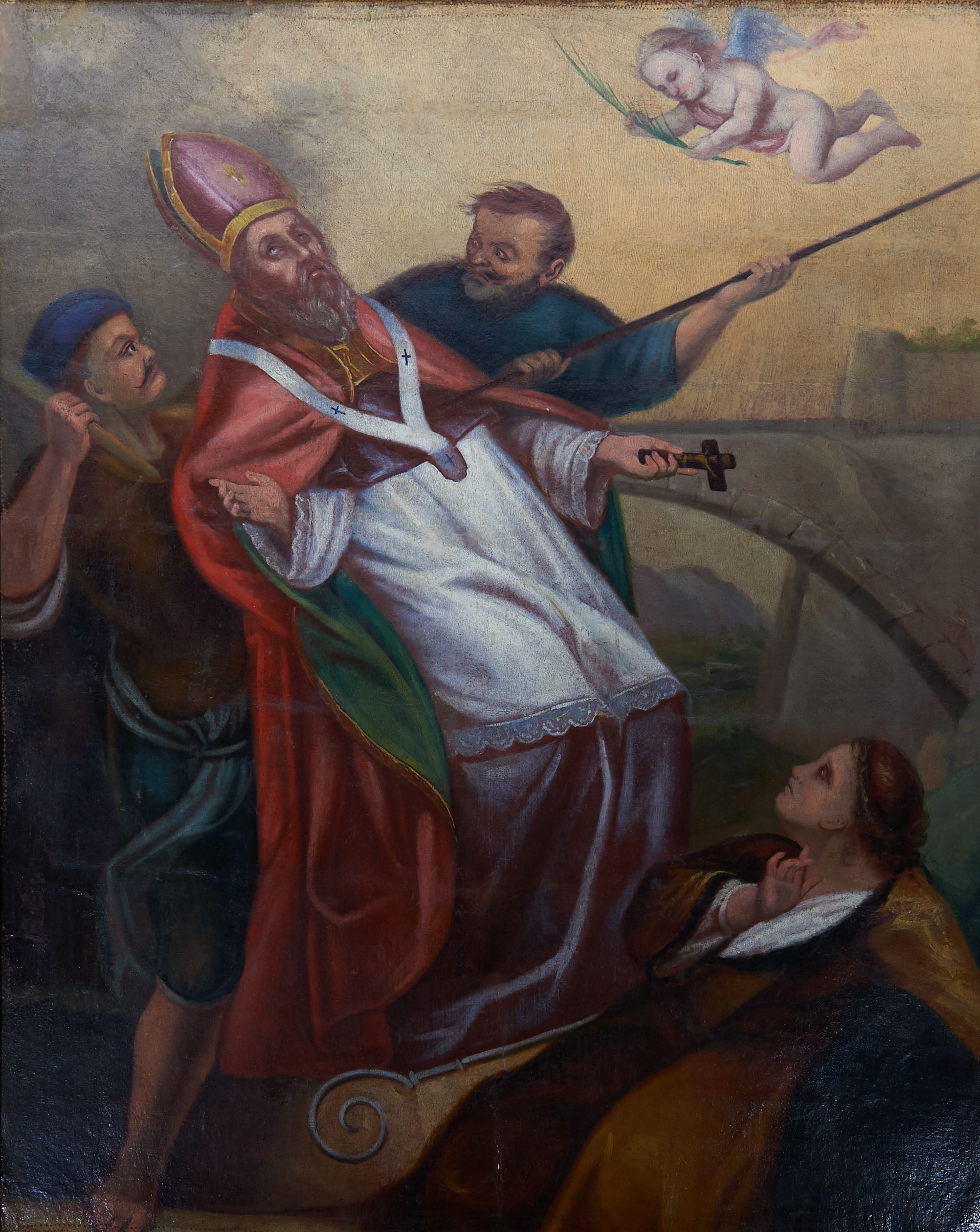 Dostateczny; płótno zdublowane, wzdłuż bocznych krawędzi widoczne ślady pierwotnego umocowania do blejtramu, widoczne również drobne ubytki warstwy malarskiej i przetarcia, obraz poddany konserwacji.