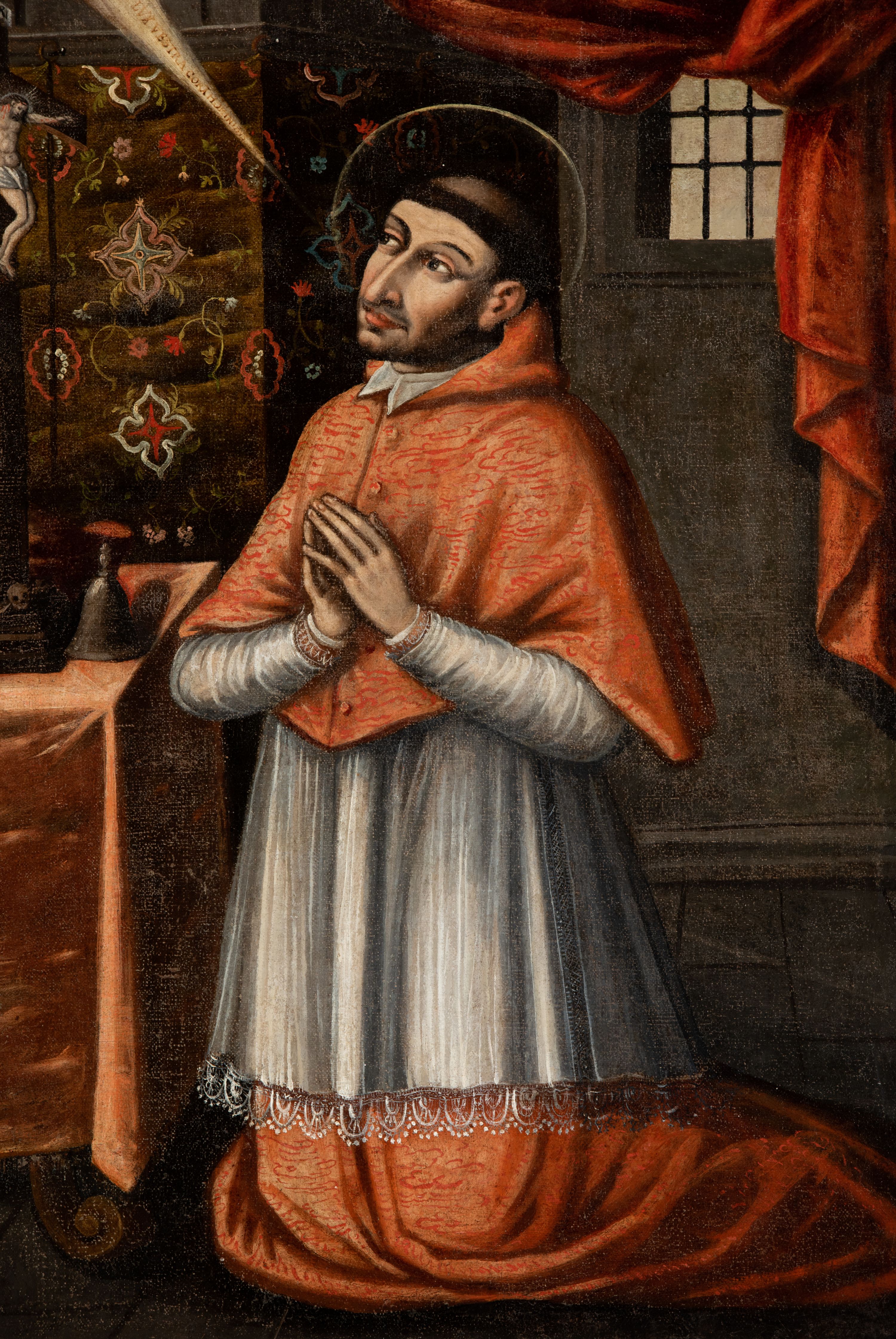Obraz w kształcie stojącego prostokąta zbliżonego do kwadratu ukazuje modlącego się w komnacie św. Karola Boromeusza. Święty ujęty w trzy czwarte w prawo klęczy ze złożonymi rękami do modlitwy przed krucyfiksem. Boromeusz ma lekko uniesioną głowę ukazaną w trzech czwartych. Pogodną twarz charakteryzuje duży nos, wydatne usta oraz nieznaczny zarost. Na głowie otoczonej nimbem widać wydatną tonsurę. Niejako z ust świętego wydobywa się świetlisty promień rozszerzający się przy rogu obrazu na tle którego widnieje łaciński napis: [SI]C LUCEAT LUX VESTRA CORA[M] HOMINIBUS. Święty ubrany jest w purpurową kardynalską sutannę i mucet oraz białą komżę zdobioną u spodu koronką. Krucyfiks przed którym klęczy święty stoi na stole nakrytym czerwono-szkarłatną tkaniną sięgającą posadzki. Obok krzyża stojącego na profilowanym postumencie, zdobionym czaszką z piszczelami, stoi dzwonek, a za nim leży kardynalski biret. Tło dla tych przedmiotów tworzy wzorzysta tkanina zawieszona na ścianie o oliwkowej fakturze pokryta barwnymi motywami roślinno-kwiatowymi. W prawym górnym rogu obrazu widoczna jest purpurowa, zawinięta kotara odsłaniająca zakratowane okno o kamiennym glifie, sięgająca do połowy jego prawej krawędzi.