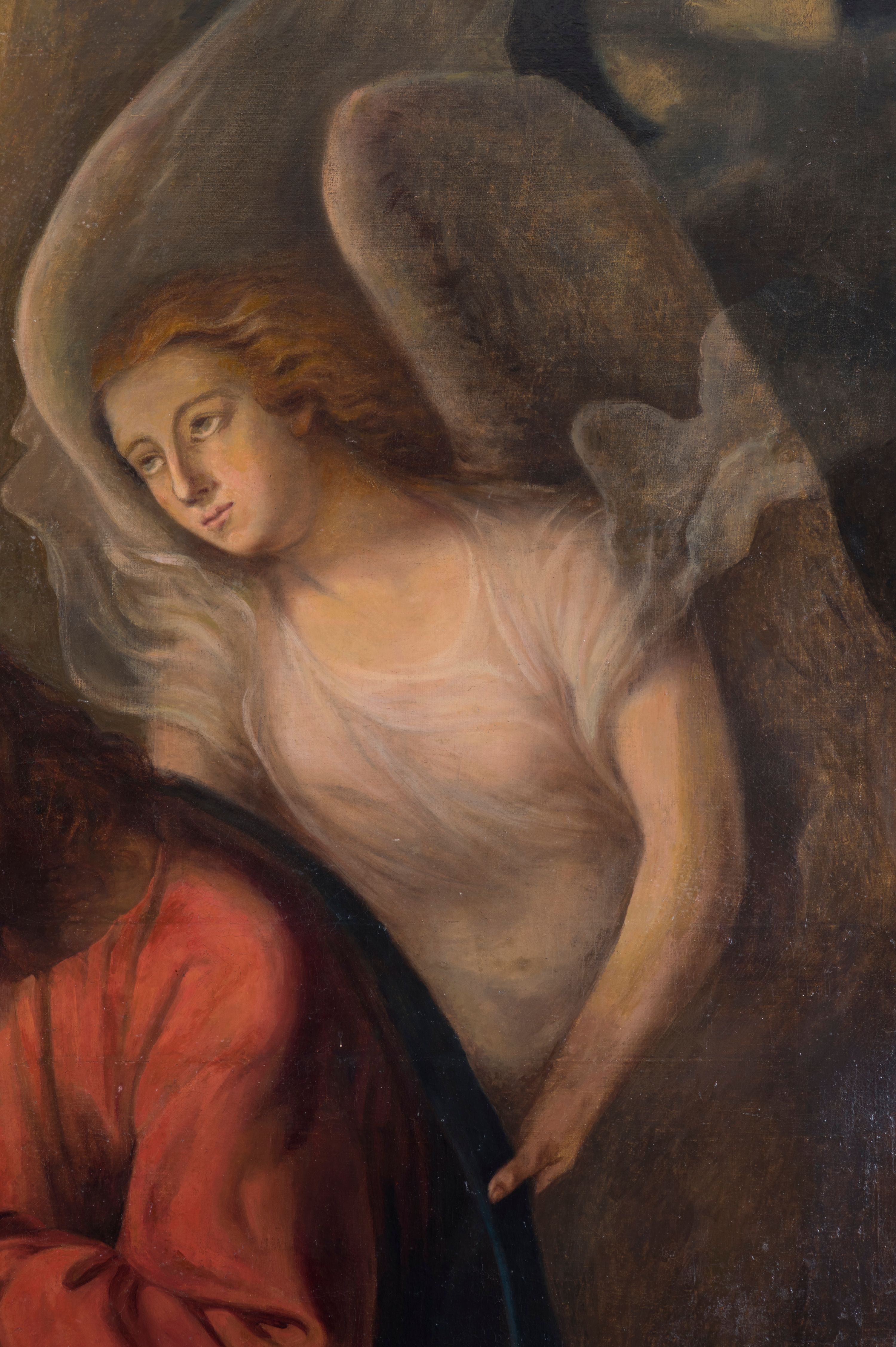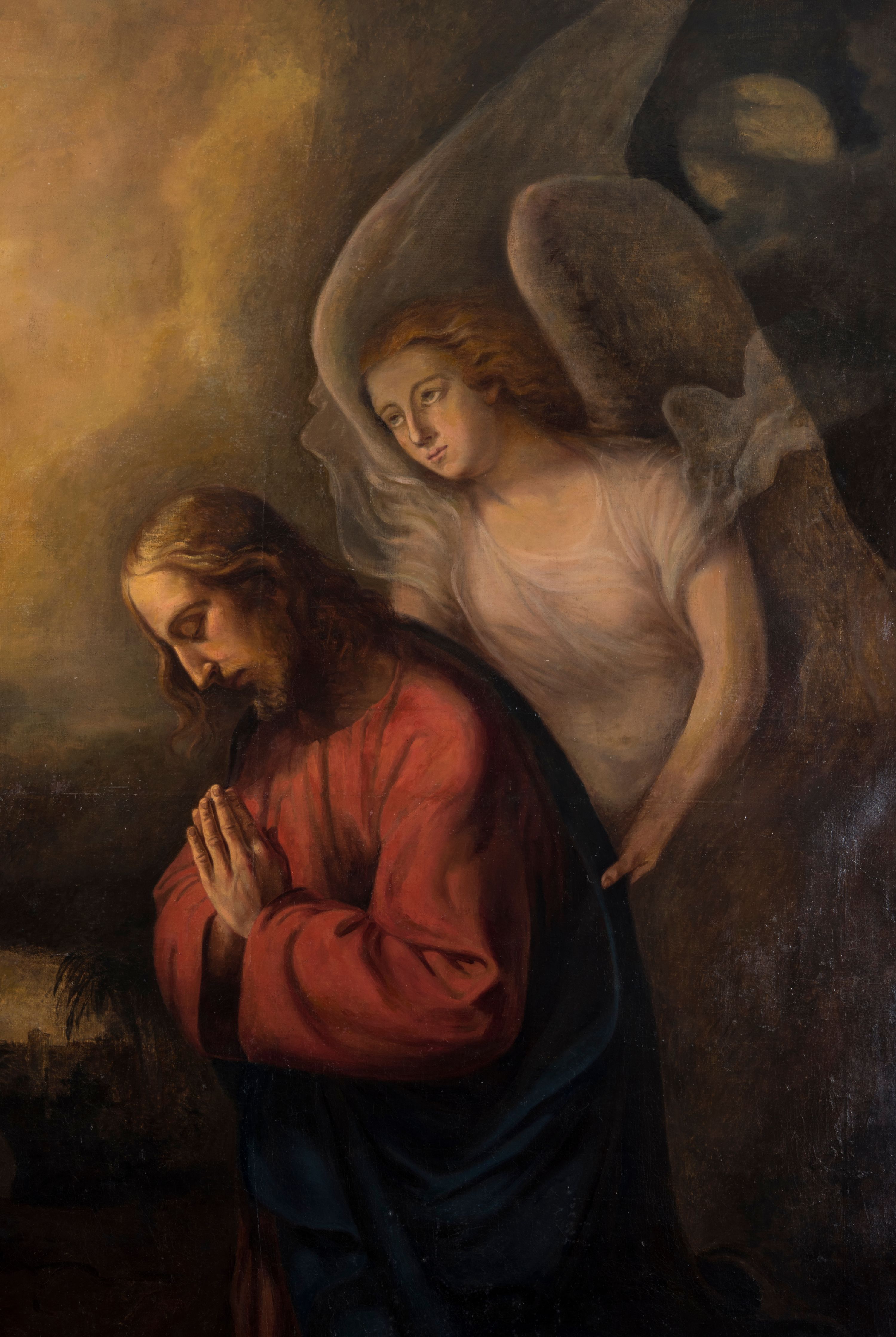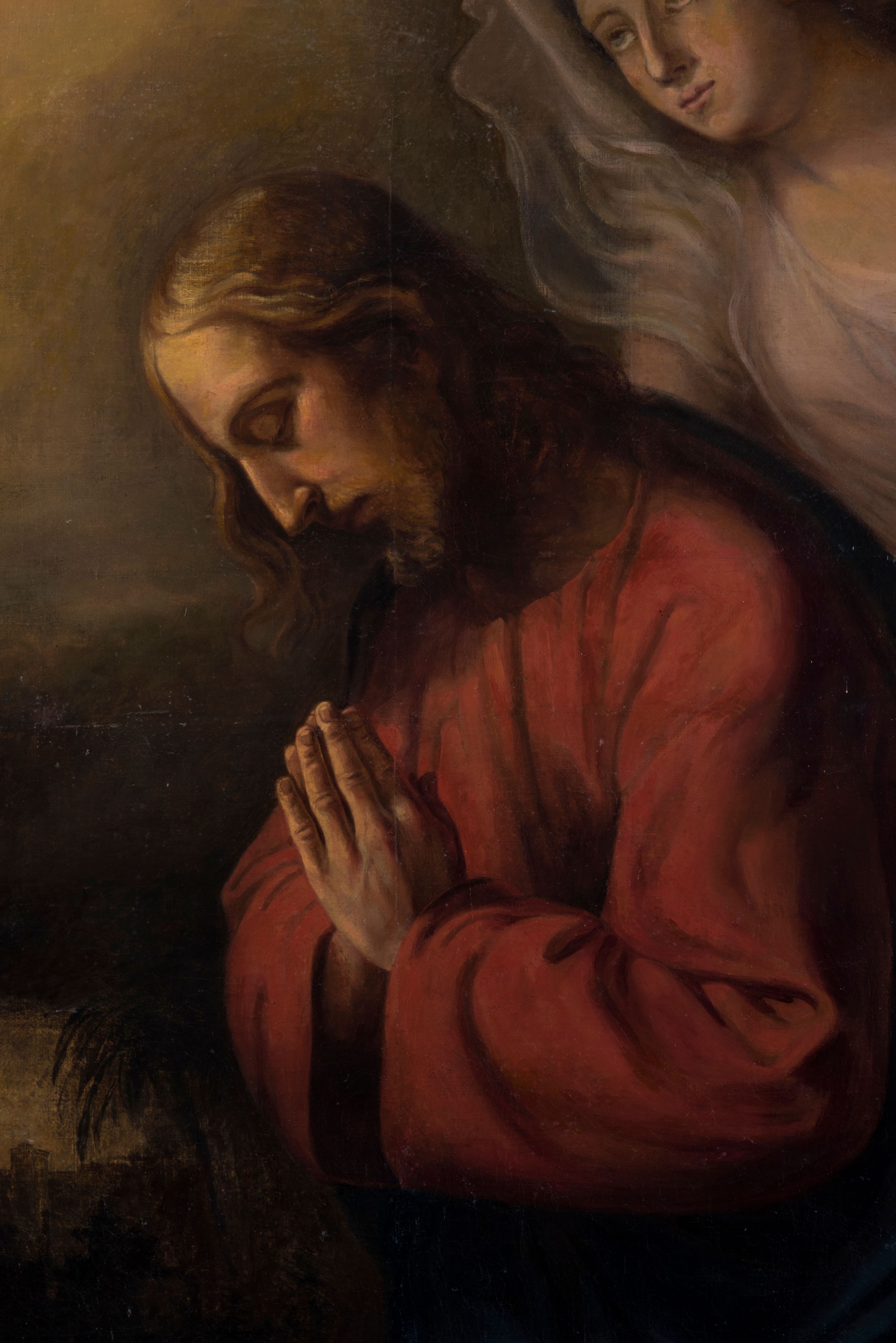 Obraz w kształcie stojącego prostokąta, ujęty profilowaną ramą. Lewą część kompozycji zajmuje całopostaciowa sylwetka klęczącego, modlącego się Jezusa, profilem zwróconego prawo. Pochyloną głowę charakteryzuje pociągła twarz o długim, prostym nosie, krótkim zaroście i przymkniętych oczach. Długie, falowane włosy wspierają się na karku lub luźno opadają wzdłuż twarzy. Jezus ubrany jest w czerwoną suknię i niebieski, narzucony na plecy i podtrzymywany z przodu płaszcz. Tuż za nim znajduje się postać anioła ujmującego go rękami z tyłu. Owalną twarz cechują delikatne rysy i skierowany w dal wzrok. Włosy są rozwiane, rudawe. Anioł ubrany jest w zwiewną, białą suknię, jedno skrzydło ma złożone, drugie uniesione. W lewym, górnym rogu obrazu, na tle rozświetlonego, nocnego nieba, pośród chmur ukazany kielich. Poniżej, w głębi widoczne w cieniu postacie trzech apostołów śpiących wśród drzew. W oddali przedstawiona panorama miasta. W prawym, górnym rogu ukazany pośród ciemnych chmur księżyc. W obrazie dominuje ciepła kolorystyka, oparta na żółcieniach i brązach, postać Chrystusa wyodrębniona z tła intensywnymi barwami.