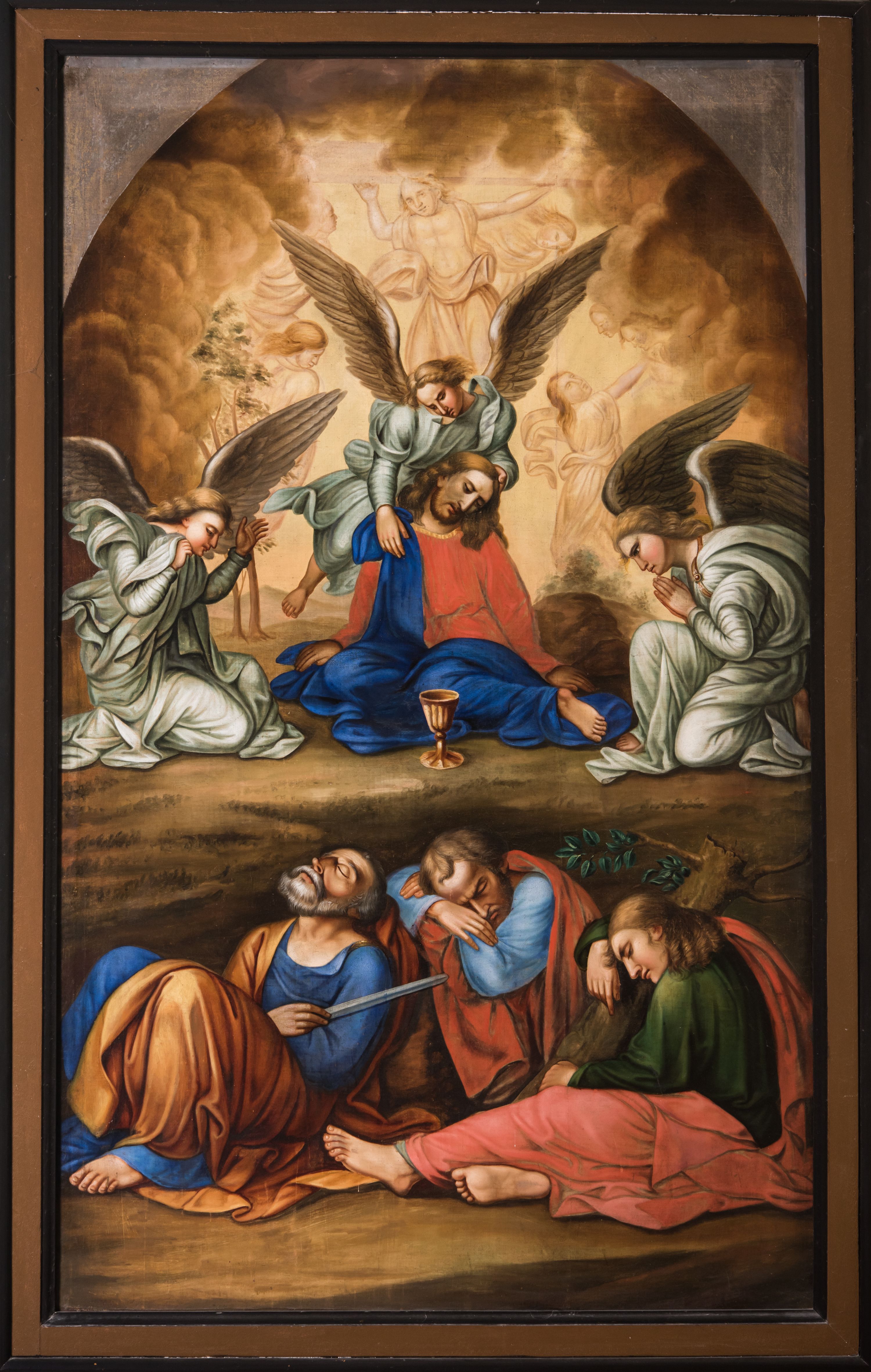 Obraz w kształcie stojącego prostokąta ujętego prostą, drewnianą, polichromowaną ramą, z przedstawieniem Modlitwy w Ogrójcu. Zamkniętą od góry łukiem półkolistym kompozycję charakteryzuje dwustrefowy układ planów. Na pierwszym, w dolnej partii obrazu, ukazani są trzej śpiący apostołowie – od lewej wsparty plecami o skałę św. Piotr charakteryzujący się krótkimi siwymi włosami i zarostem, ubrany w niebieską suknię i jasnobrązowy płaszcz, trzymający miecz. Pośrodku znajduje się św. Jakub Starszy, który śpi, wspierając głowę na złożonych na tej samej skale rękach. Charakteryzują go krótkie, brązowe włosy z lekką łysiną oraz krótki zarost. Ubrany jest w jasnoniebieską suknię i czerwony płaszcz. Po prawej stronie siedzi zwrócony profilem w lewo św. Jan Ewangelista z wyciągniętą przed siebie lewą nogą. Głowę wspiera na podtrzymywanym prawą ręką pniu ściętego drzewa. Charakteryzuje go młodzieńcza twarz oraz półdługie blond włosy dołem mocno skręcone w pukle. Wyżej, drugą część kompozycji zajmuje usytuowana pośrodku sylwetka omdlewającego Jezusa zwróconego na wprost. Ubrany jest w czerwoną suknię i ciemnoniebieski płaszcz. Przechyloną na lewe ramię głowę podtrzymuje unoszący się z tyłu anioł ubrany w długie, białe, rozwiane szaty. Pozostałe dwa anioły pochylone, przyklękają po obydwu stronach Jezusa, składając ręce w geście modlitewnym lub wznosząc je do góry. Pośrodku stoi kielich, w tle na rozświetlonym niebie, ujętym łukiem ciemnych obłoków widoczne są zarysy sylwetek trzech unoszących się aniołów, dwóch smukłych drzew, krzewu oraz niewielkiej skały.