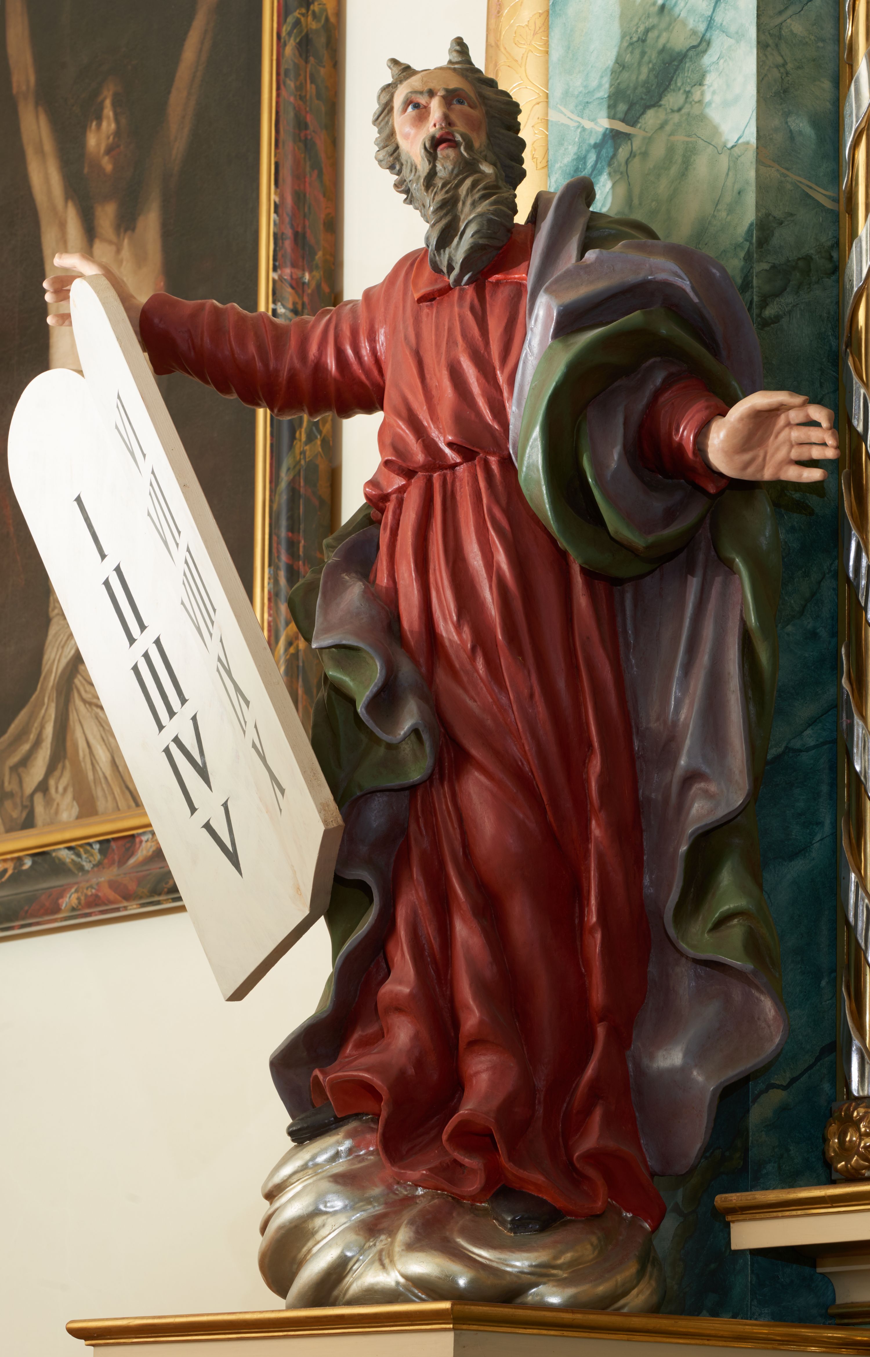 Rzeźba przedstawiająca proroka Mojżesza, ścięta z tyłu, drążona. Prorok ustawiony na niskim cokole w formie posrebrzonego obłoku. Ukazany jest frontalnie w delikatnym kontrapoście z lewą nogą ugiętą w kolanie i z rękami wyciągniętymi szeroko w boki, z głową skierowaną w lewo i uniesioną do góry. W prawej dłoni trzyma tablice Dekalogu. Twarz podłużna z długim nosem, otwartymi ustami i zmarszczonymi łukami brwiowymi; okolona długą, ciemną brodą i średniej długości włosami, zasłaniającymi uszy i uformowanymi nad czołem w dwa rogi. Ubrany jest w długą, czerwoną suknię z kołnierzem, przewiązaną w talii, obficie drapowaną oraz zielony płaszcz z fioletową podszewką, zawinięty wokół lewego ramienia; na stopach ma założone pełne, brązowe buty. Polichromia w odsłoniętych partiach ciała jest naturalistyczna, policzki zaczerwienione.