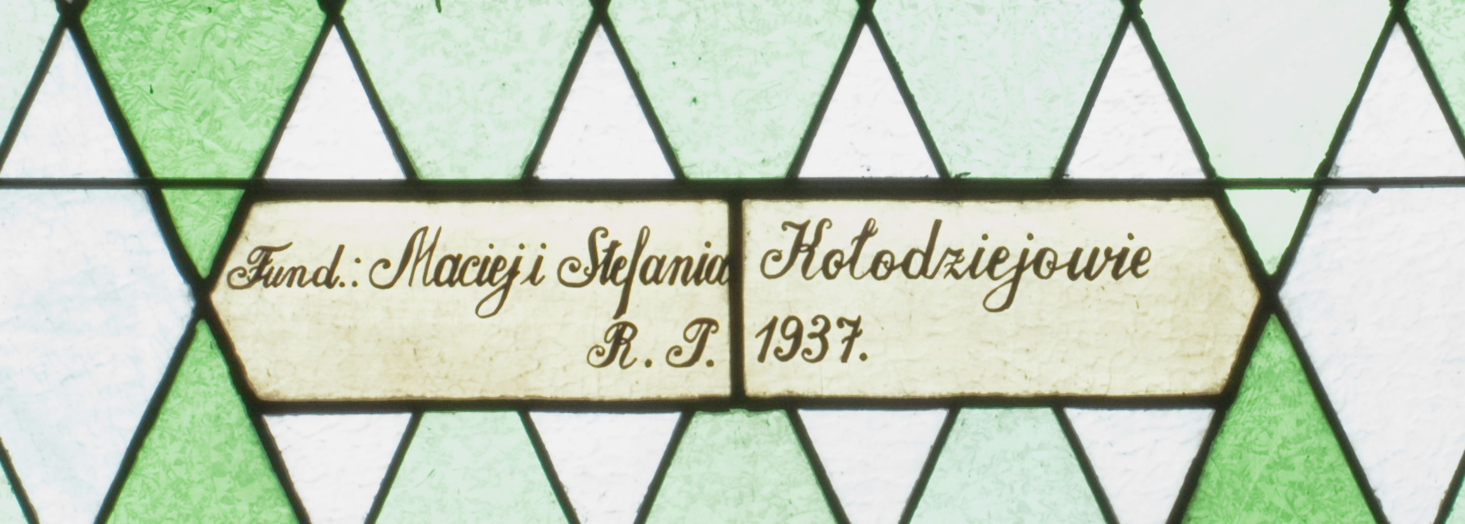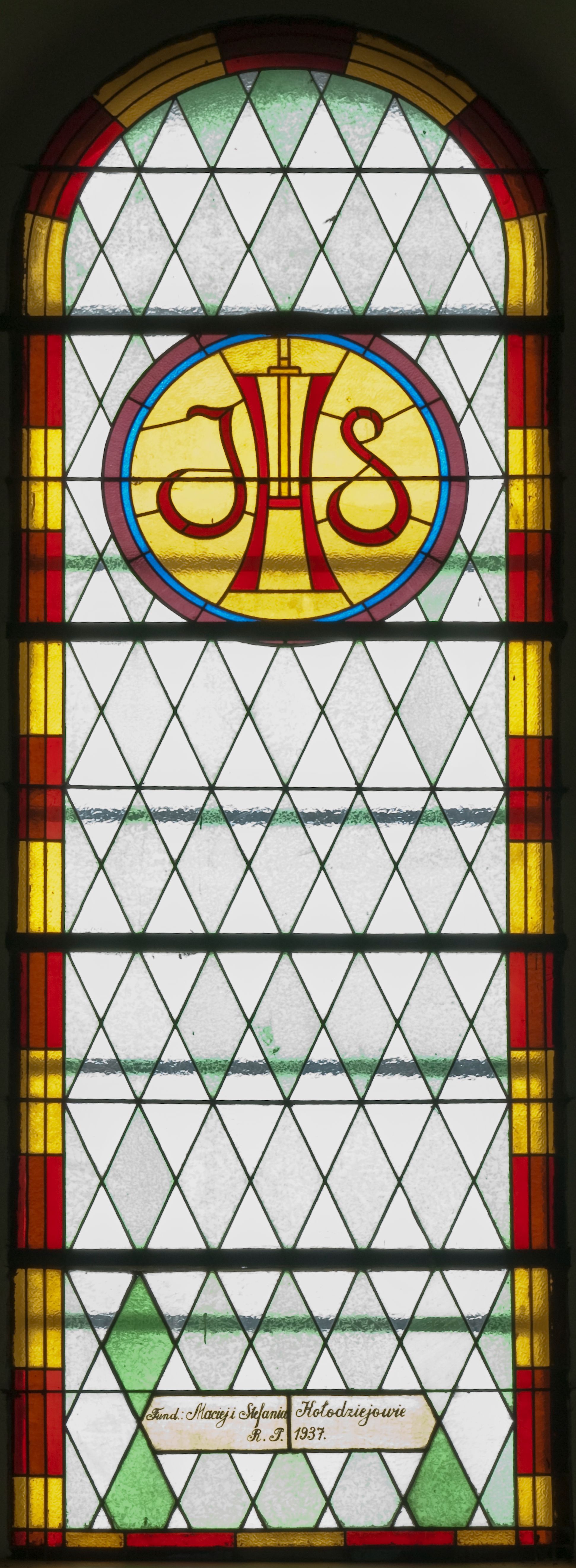 Witraż w kształcie stojącego prostokąta zamkniętego półkoliście ujęty geometryczną bordiurą dekorowaną czerwonymi i żółtymi prostokątami. W polu ukośna kratka wypełniona białymi i jasnozielonymi rombami. W górnej części witraża okrągły medalion z czerwonym monogramem IHS umieszczonym na żółtym tle. W dolej kwaterze prostokątne pole z napisem: „Fund[acja]: Maciej i Stefania Kołodziejowie / R[OKU] P[AŃSKIEGO] 1937".