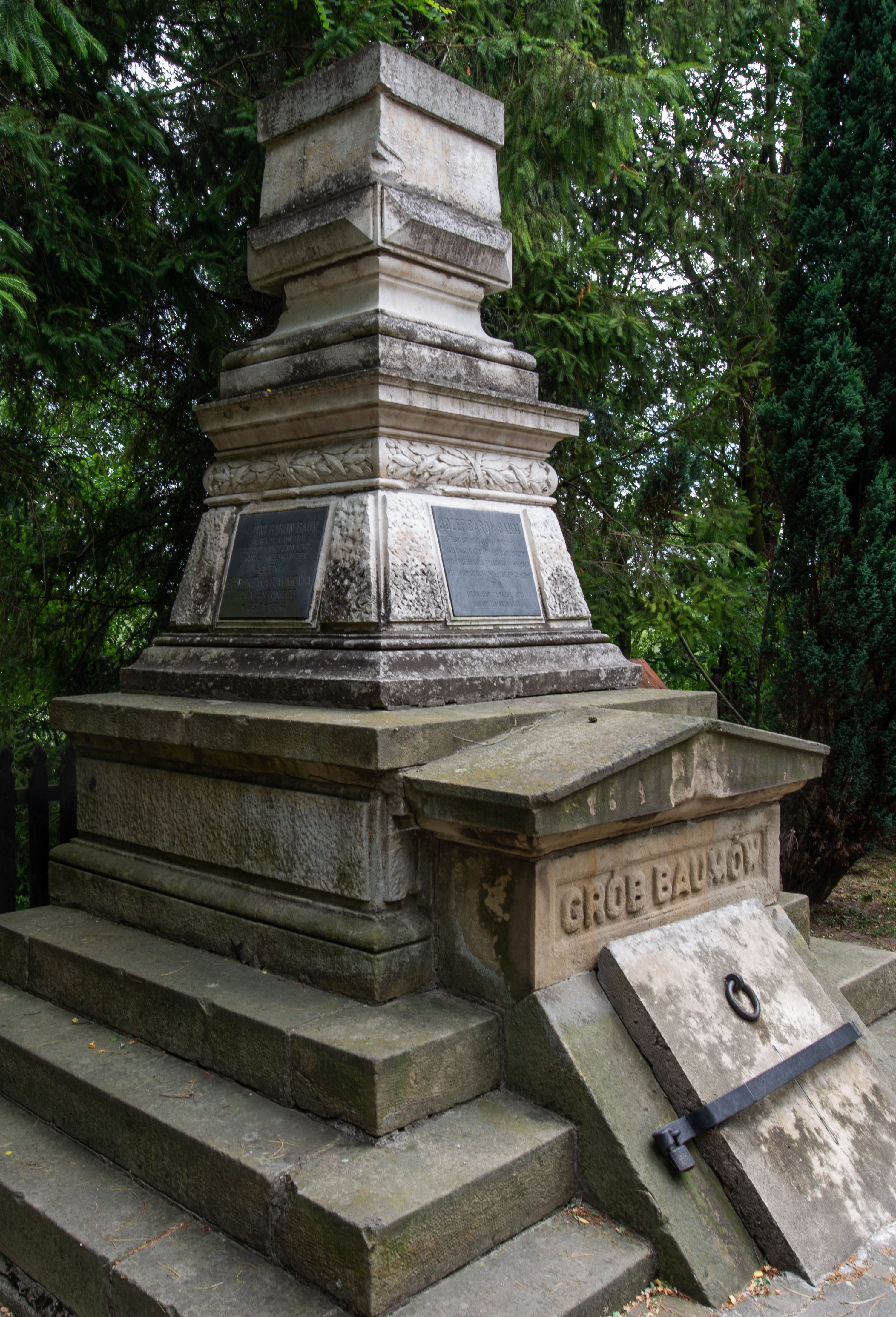 Monumentalny grobowiec rodziny Baumów został wykonany przez Edwarda Stehlika (1825-1888) w drugiej połowie XIX wieku. W jego przedsiębiorstwie kamieniarskim powstało dziesiątki pomników nagrobnych, epitafiów, kaplic grobowych, ołtarzy i innych dzieł sztuki. Grobowiec poświęcony jest rodzinie Baumów. Pochowano w nim: Antoniego Bauma (1763-1829) i jego żonę Helenę (1797-1884); jego syna Józefa Bauma (1821-1883); a także dzieci Józefa: Wiktora Józefa Bauma (23.10.1845-3.10.1846) i Józefę Baumównę (4.04.1854-18.04.1854).