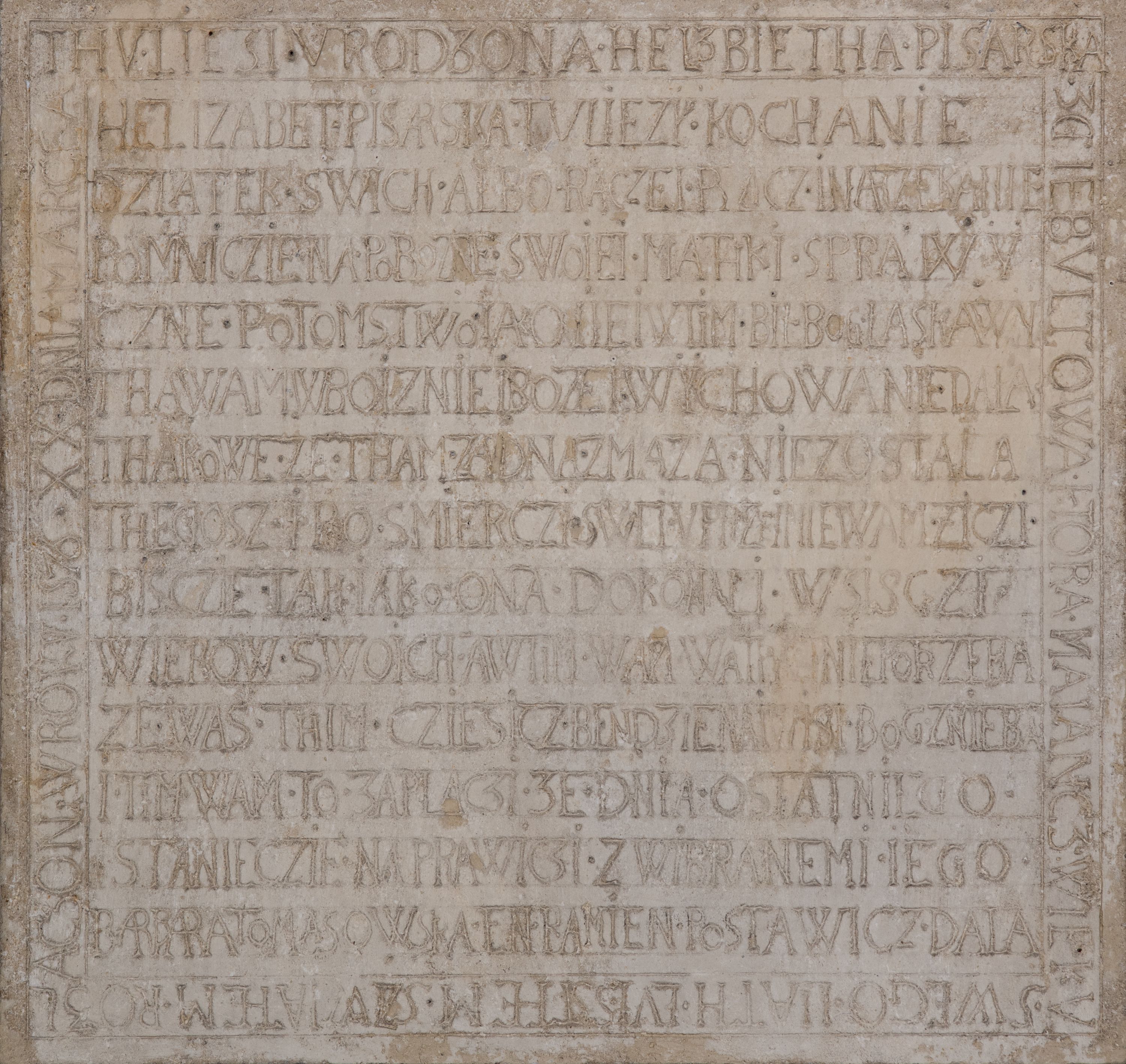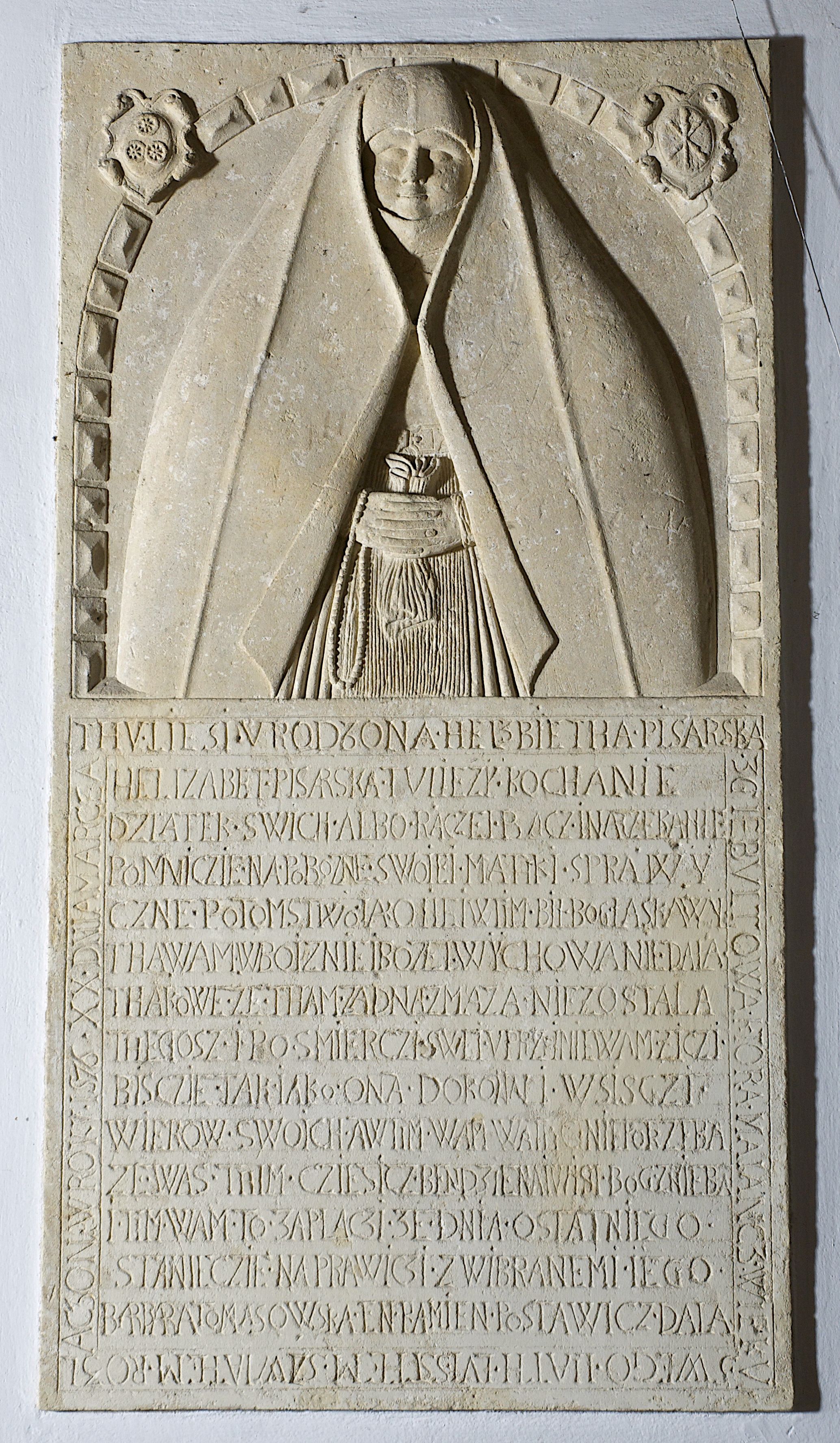 Nagrobek zmarłej w 1576 roku Elżbiety z Giebułtowskich Pisarskiej został ufundowany przez Barbarę Tomaszewską. Pierwotnie wmurowana w ścianę północną między amboną a ołtarzem bocznym, w latach sześćdziesiątych XX wieku został przeniesiony w obecne miejsce.