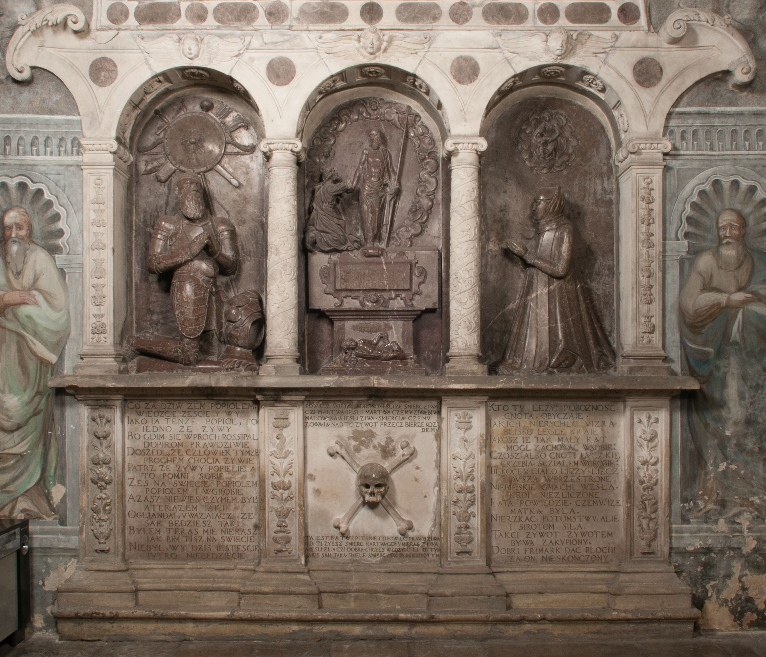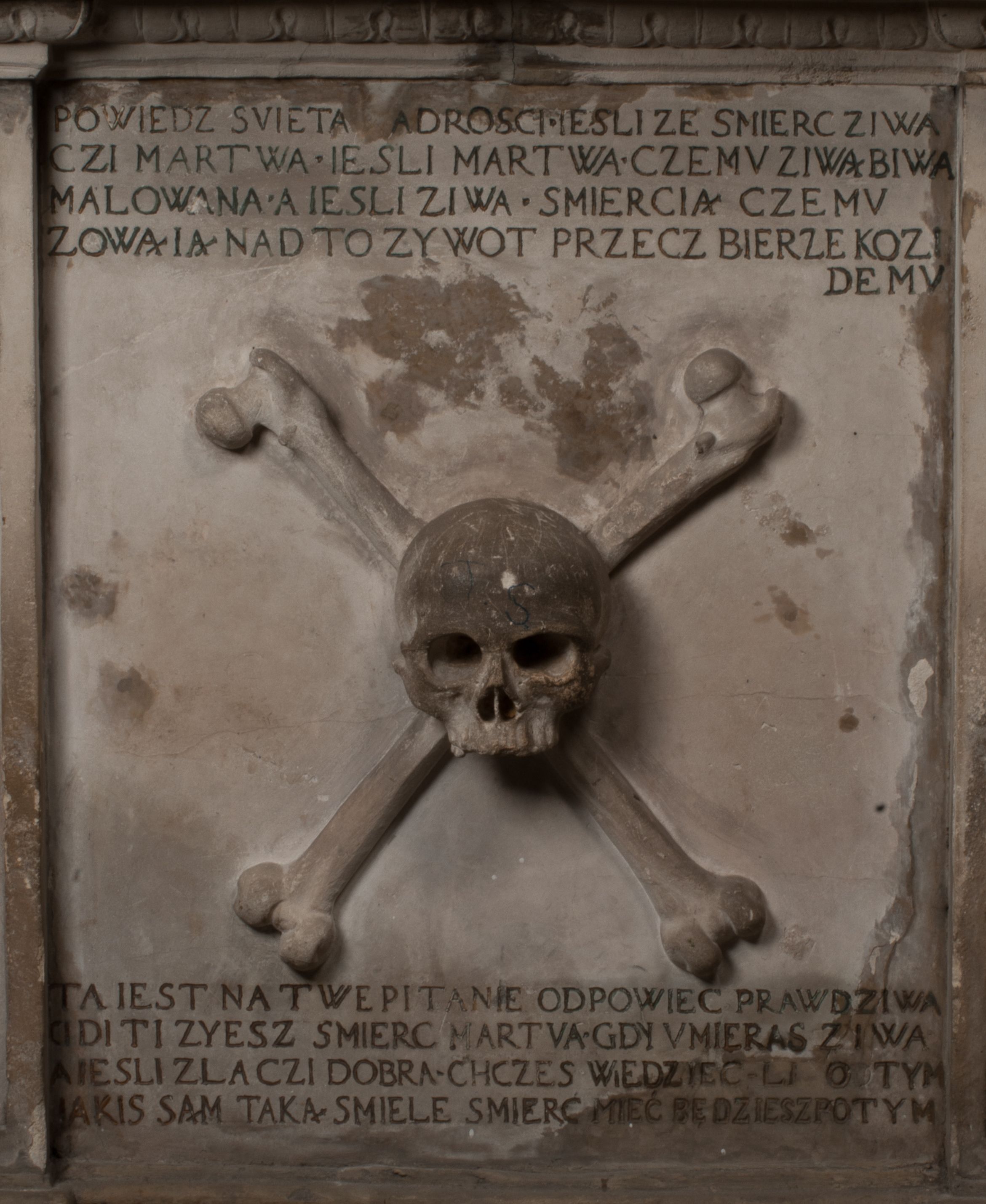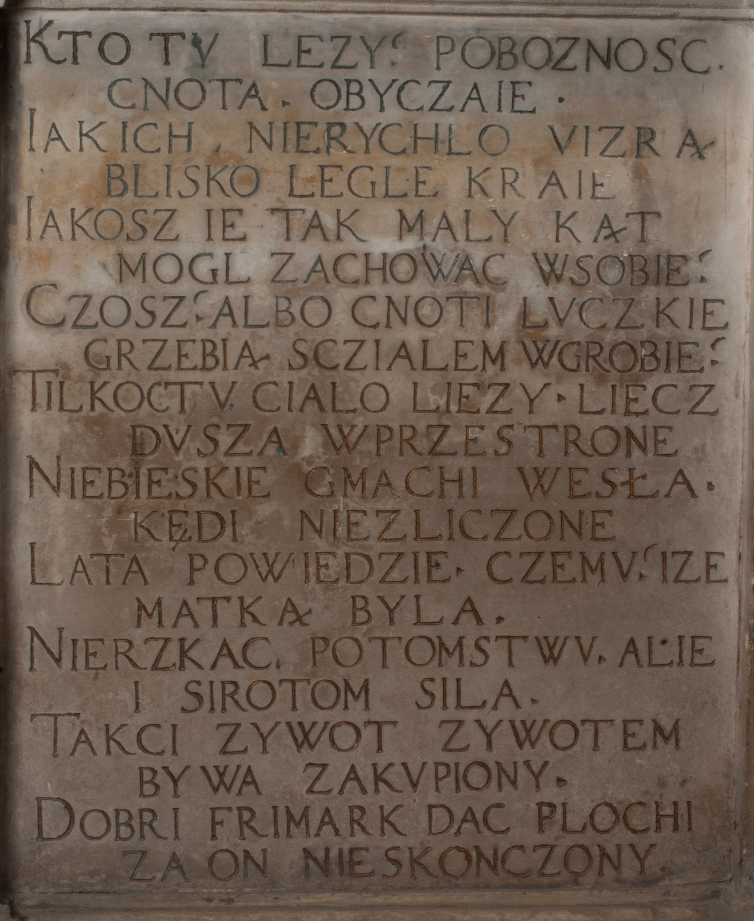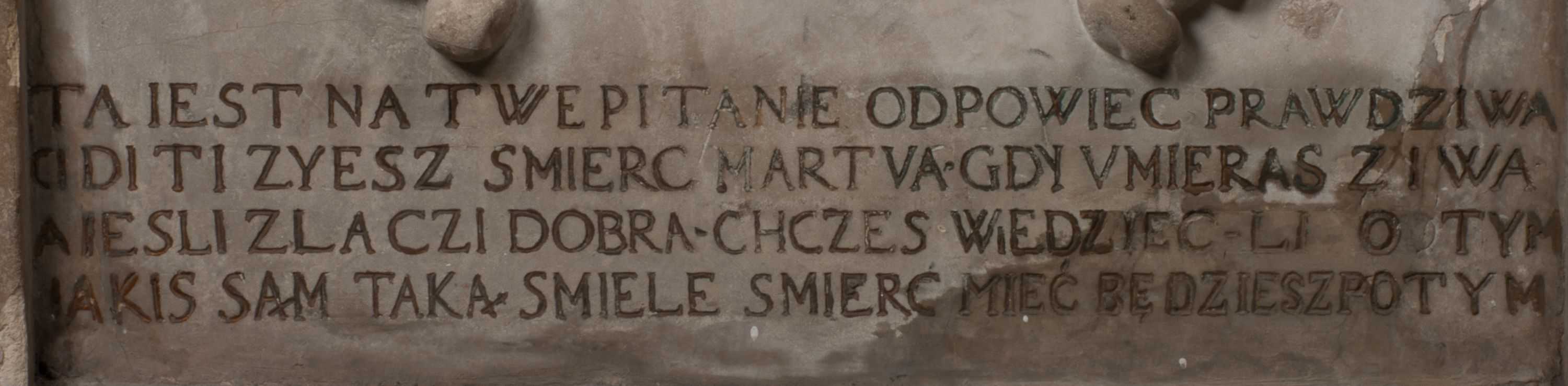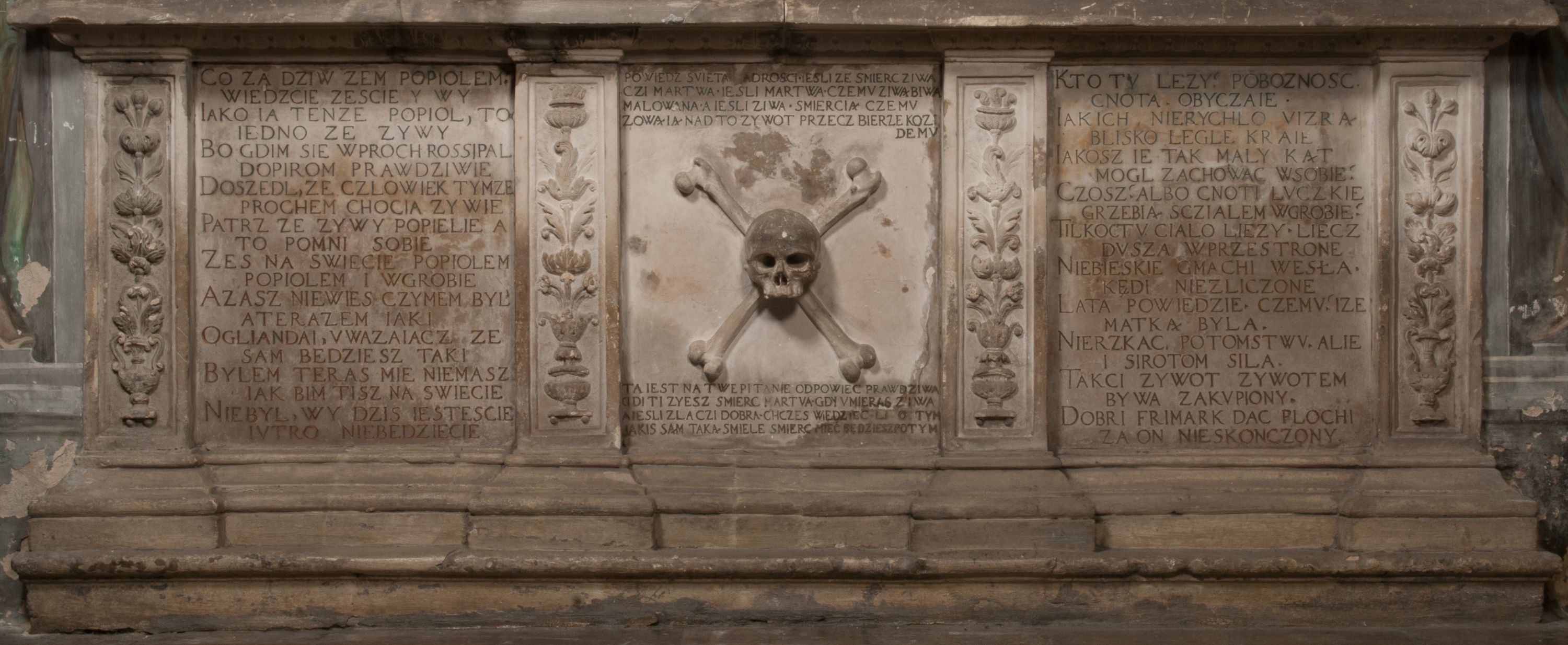 Dolna część artykułowa lizenami ozdobionymi motywami kandelabrowymi. W polu środkowym czaszka ze skrzyżowanymi piszczelami z inskrypcją w górnej i dolnej części: „POWIEDZ SVIETA [M]ADROSCI IESLI ZE SMIERC ZIWA / CZI MARTWA IESLI MARTWA CZEMV ZIWĄ BIWA / MALOWANA A IESLI ZIWA SMIERCIĄ CZEMV / ZOWIĄ IĄ NAD TO ZYWOT PRZECZ BIERZE KOZI/DEMV / TA IEST NA TWE PITANIE ODPOWIEC PRAWDZIWA / GDI TI ZYESZ SMIERC MARTVA GDY VMIERAS ZIWA / A IESLI ZLA CZI DOBRA CHCZES WIEDZIEC LI O TYM / IAKIS SĄM TAKĄ SMIELE SMIERC MIEĆ BĘDZIESZ PO TYM”. Na lewym polu inskrypcja „CO ZA DZIW ZEM POPIOLEM / WIEDZCIE ZESCIE WY / IAKO IA TENZE POPIOL, TO / IEDNO ZE ZYWY / BO GDIM SIĘ W PROCH ROSSIPAL / DOPIROM PRAWDZIWIE DOSZEDL, ZE CZLOWIEK TYMZE / PROCHEM CHOCIA ZYWIE / PATRZ ZE ZYWY POPIELIE A / TO POMNI SOBIE / ZES NA SWIECIE POPIOLEM / POPIOLEM I W GROBIE / A ZASZ NIEWIES CZYMEM BYL / A TERAZEM IAKI / OGLIANDAI, VWAZAIACZ ZE / SAM BEDZIESZ TAKI / BYLEM TERAS MIE NIE MASZ / IAK BIM TISZ NA SWIECIE / NIE BYL WY DZIS IESTESCIE / IUTRO NIEBEDZIECIE”. W polu cokołu „KTO TV LEZY POBOZNOSC / CNOTA OBYCZAIE / IAKICH NIERYCHLO VIZRĄ / BLISKO LEGLE KRAIE / IAKOSZ IE TAK MALY KĄT / MOGL ZACHOWAC W SOBIE / CZOSZ ALBO CNOTI LVCZKIE / GRZEBIĄ SCZIALEM W GROBIE / TILKOC TV CIALO LIEZY LIECZ / DVSZA W PRZESTRONE / NIEBIESKIE GMACHI WESŁA / KĘDI NIEZLICZONE / LATA POWIEDZIE. CZEMV IZE / MATKĄ BYLA / NIERZKAC POTOMSTWV ALIE / I SIROTOM SILA / TAKCI ZYWOT ZYWOTEM BYWA ZAKVPIONY / DOBRI FRIMARK DAC PLOCHI / ZA ON NIESKONCZONY”. Cokół zamyka wąski, silnie wysunięty gzyms z kimationem jońskim.