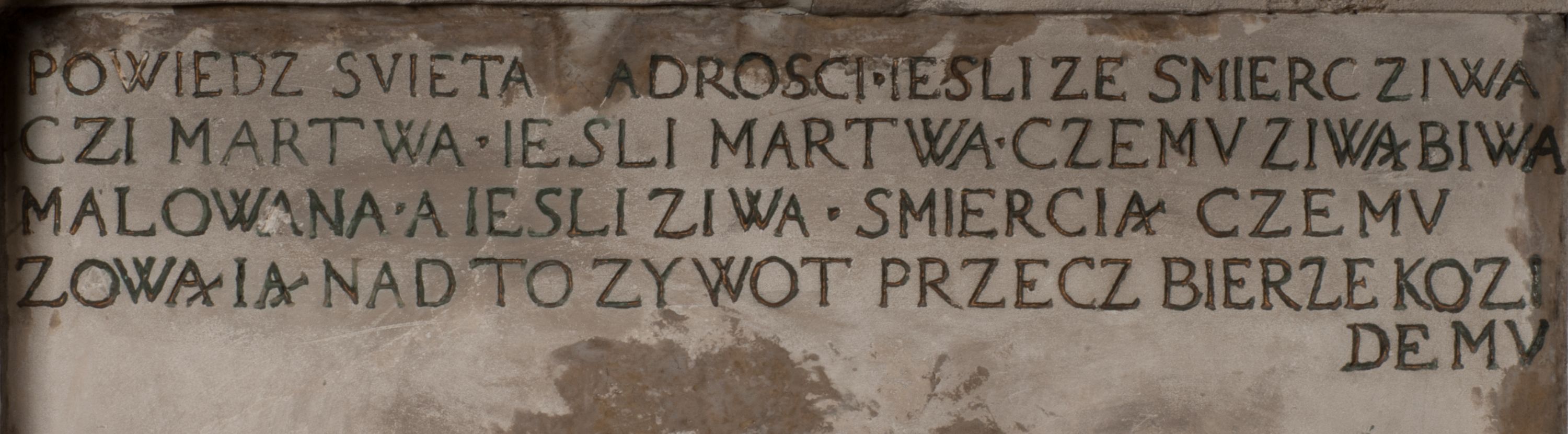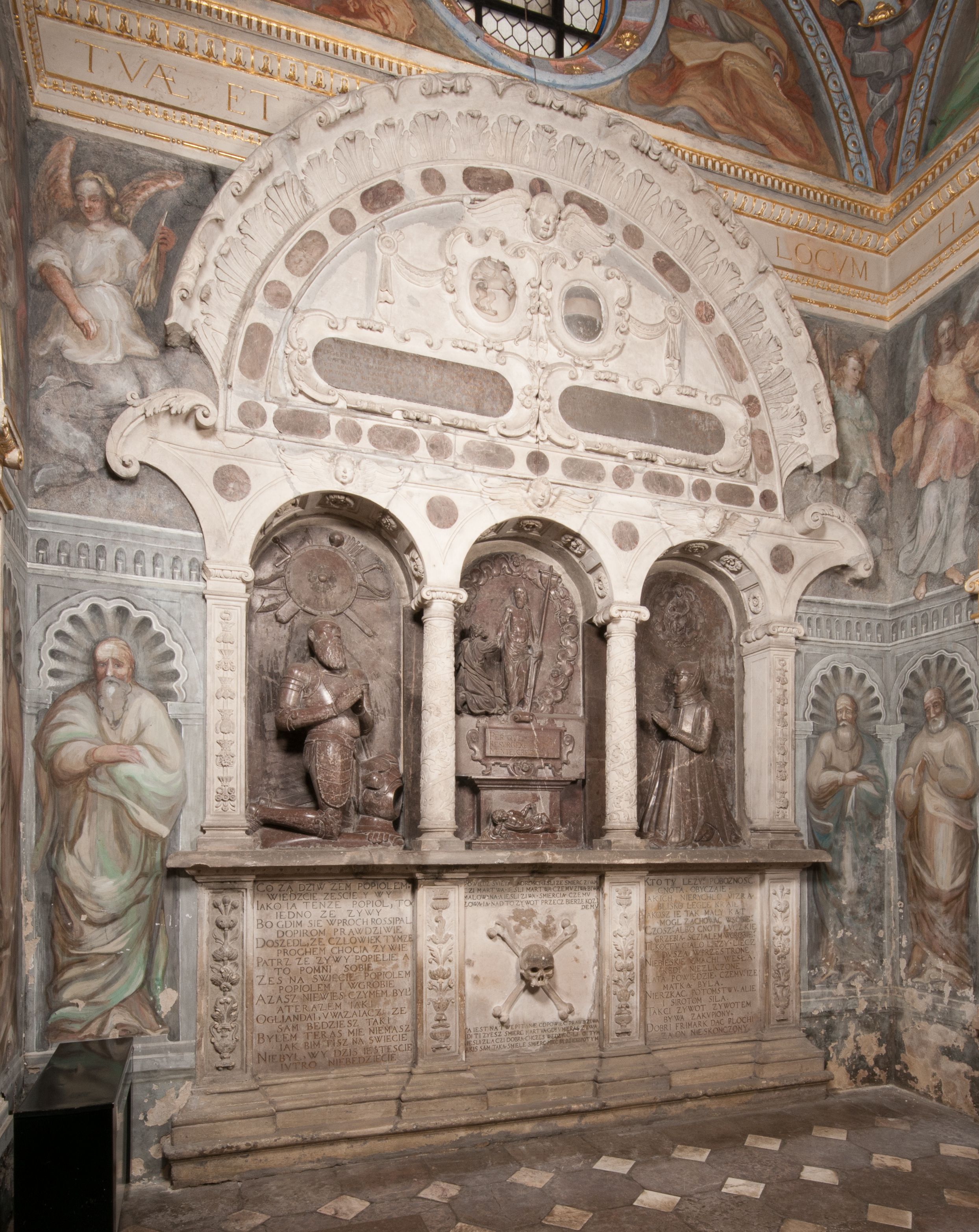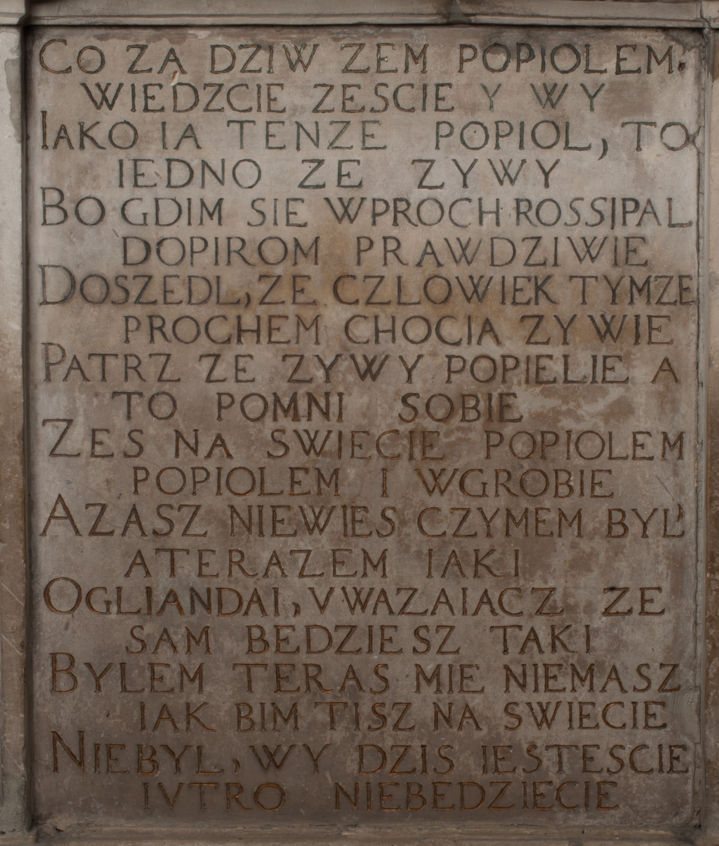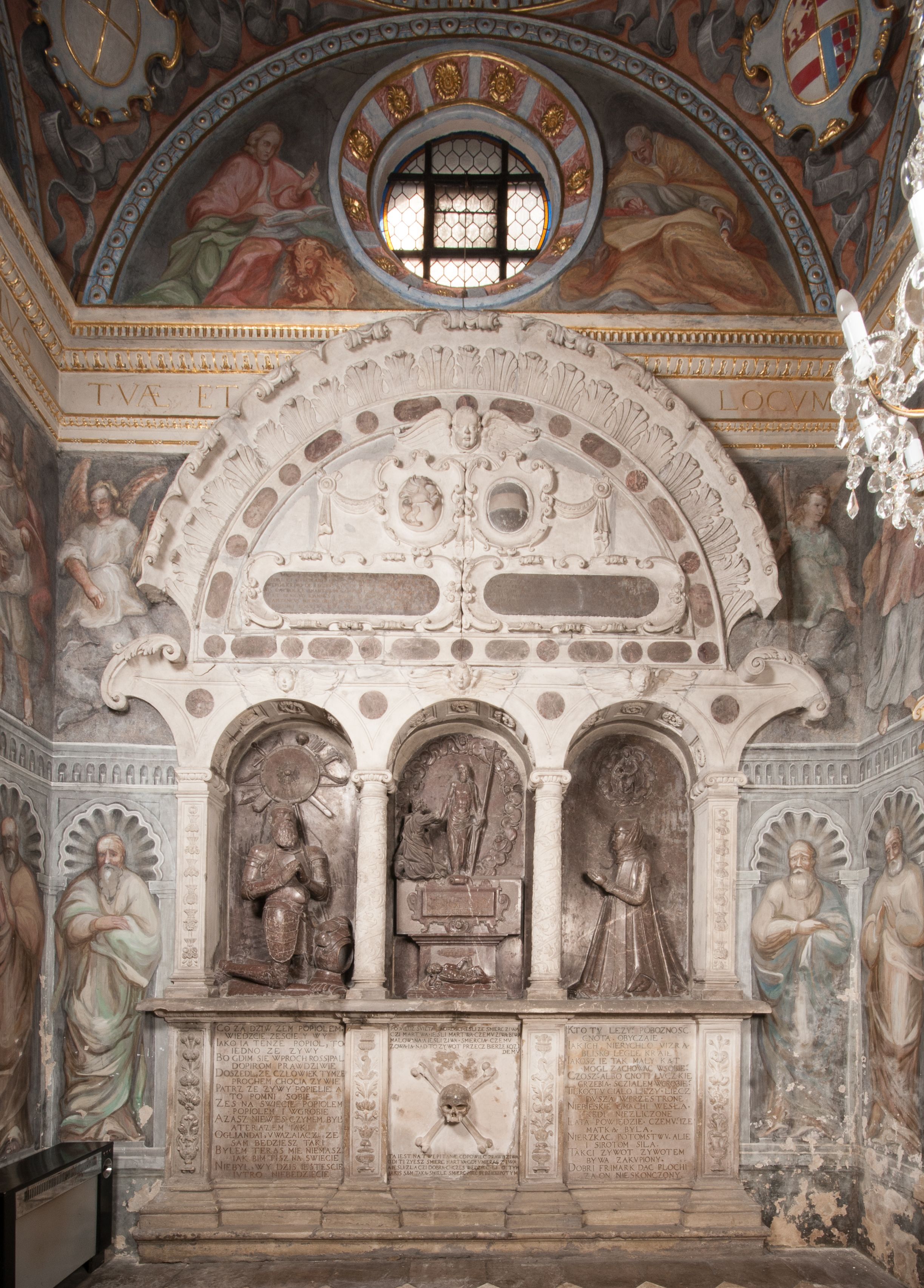 Dolna część artykułowa lizenami ozdobionymi motywami kandelabrowymi. W polu środkowym czaszka ze skrzyżowanymi piszczelami z inskrypcją w górnej i dolnej części: „POWIEDZ SVIETA [M]ADROSCI IESLI ZE SMIERC ZIWA / CZI MARTWA IESLI MARTWA CZEMV ZIWĄ BIWA / MALOWANA A IESLI ZIWA SMIERCIĄ CZEMV / ZOWIĄ IĄ NAD TO ZYWOT PRZECZ BIERZE KOZI/DEMV / TA IEST NA TWE PITANIE ODPOWIEC PRAWDZIWA / GDI TI ZYESZ SMIERC MARTVA GDY VMIERAS ZIWA / A IESLI ZLA CZI DOBRA CHCZES WIEDZIEC LI O TYM / IAKIS SĄM TAKĄ SMIELE SMIERC MIEĆ BĘDZIESZ PO TYM”. Na lewym polu inskrypcja „CO ZA DZIW ZEM POPIOLEM / WIEDZCIE ZESCIE WY / IAKO IA TENZE POPIOL, TO / IEDNO ZE ZYWY / BO GDIM SIĘ W PROCH ROSSIPAL / DOPIROM PRAWDZIWIE DOSZEDL, ZE CZLOWIEK TYMZE / PROCHEM CHOCIA ZYWIE / PATRZ ZE ZYWY POPIELIE A / TO POMNI SOBIE / ZES NA SWIECIE POPIOLEM / POPIOLEM I W GROBIE / A ZASZ NIEWIES CZYMEM BYL / A TERAZEM IAKI / OGLIANDAI, VWAZAIACZ ZE / SAM BEDZIESZ TAKI / BYLEM TERAS MIE NIE MASZ / IAK BIM TISZ NA SWIECIE / NIE BYL WY DZIS IESTESCIE / IUTRO NIEBEDZIECIE”. W polu cokołu „KTO TV LEZY POBOZNOSC / CNOTA OBYCZAIE / IAKICH NIERYCHLO VIZRĄ / BLISKO LEGLE KRAIE / IAKOSZ IE TAK MALY KĄT / MOGL ZACHOWAC W SOBIE / CZOSZ ALBO CNOTI LVCZKIE / GRZEBIĄ SCZIALEM W GROBIE / TILKOC TV CIALO LIEZY LIECZ / DVSZA W PRZESTRONE / NIEBIESKIE GMACHI WESŁA / KĘDI NIEZLICZONE / LATA POWIEDZIE. CZEMV IZE / MATKĄ BYLA / NIERZKAC POTOMSTWV ALIE / I SIROTOM SILA / TAKCI ZYWOT ZYWOTEM BYWA ZAKVPIONY / DOBRI FRIMARK DAC PLOCHI / ZA ON NIESKONCZONY”. Cokół zamyka wąski, silnie wysunięty gzyms z kimationem jońskim.