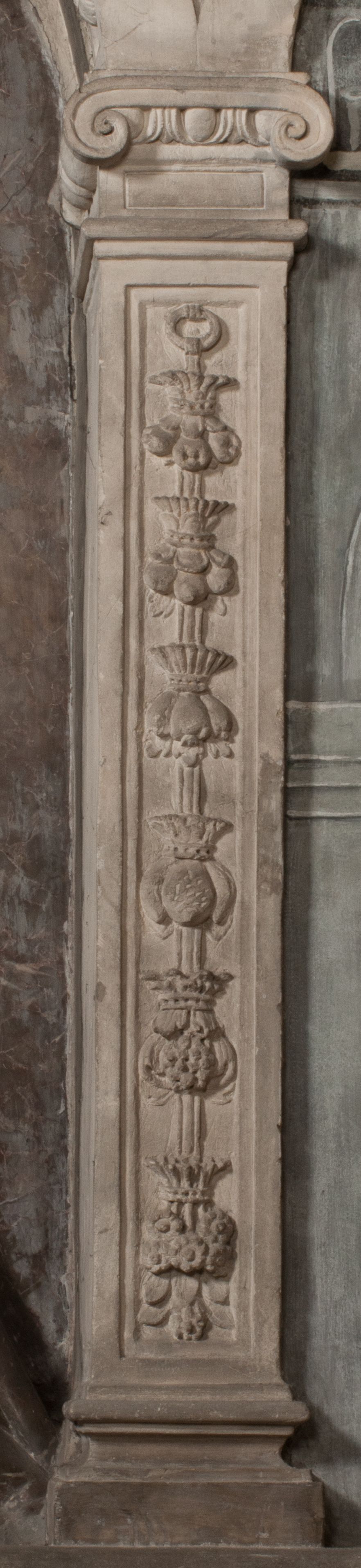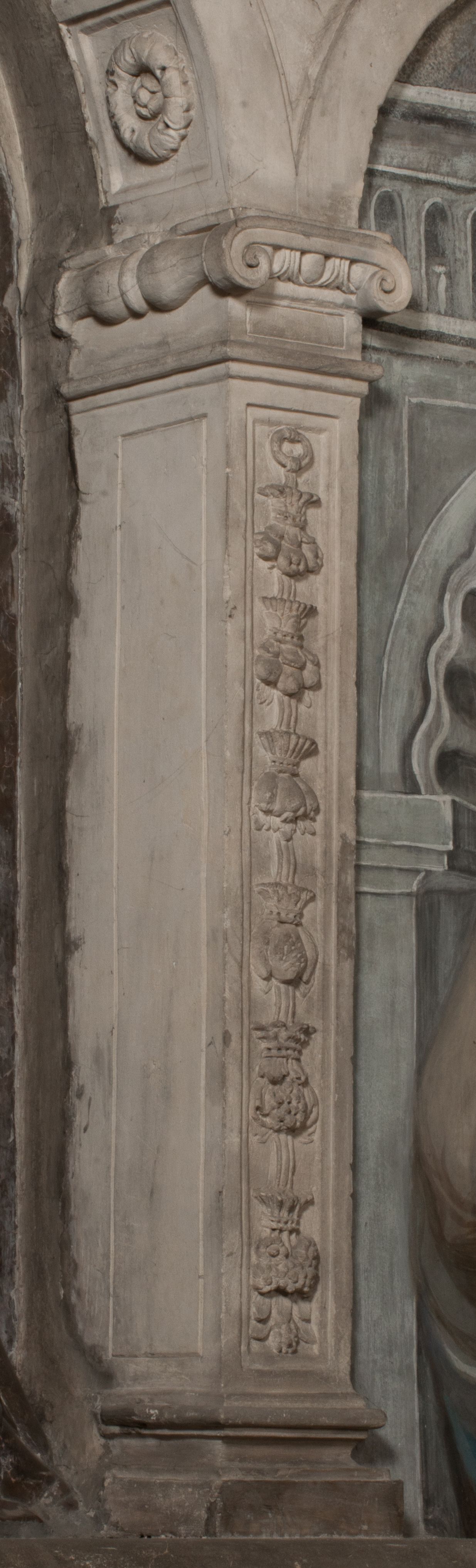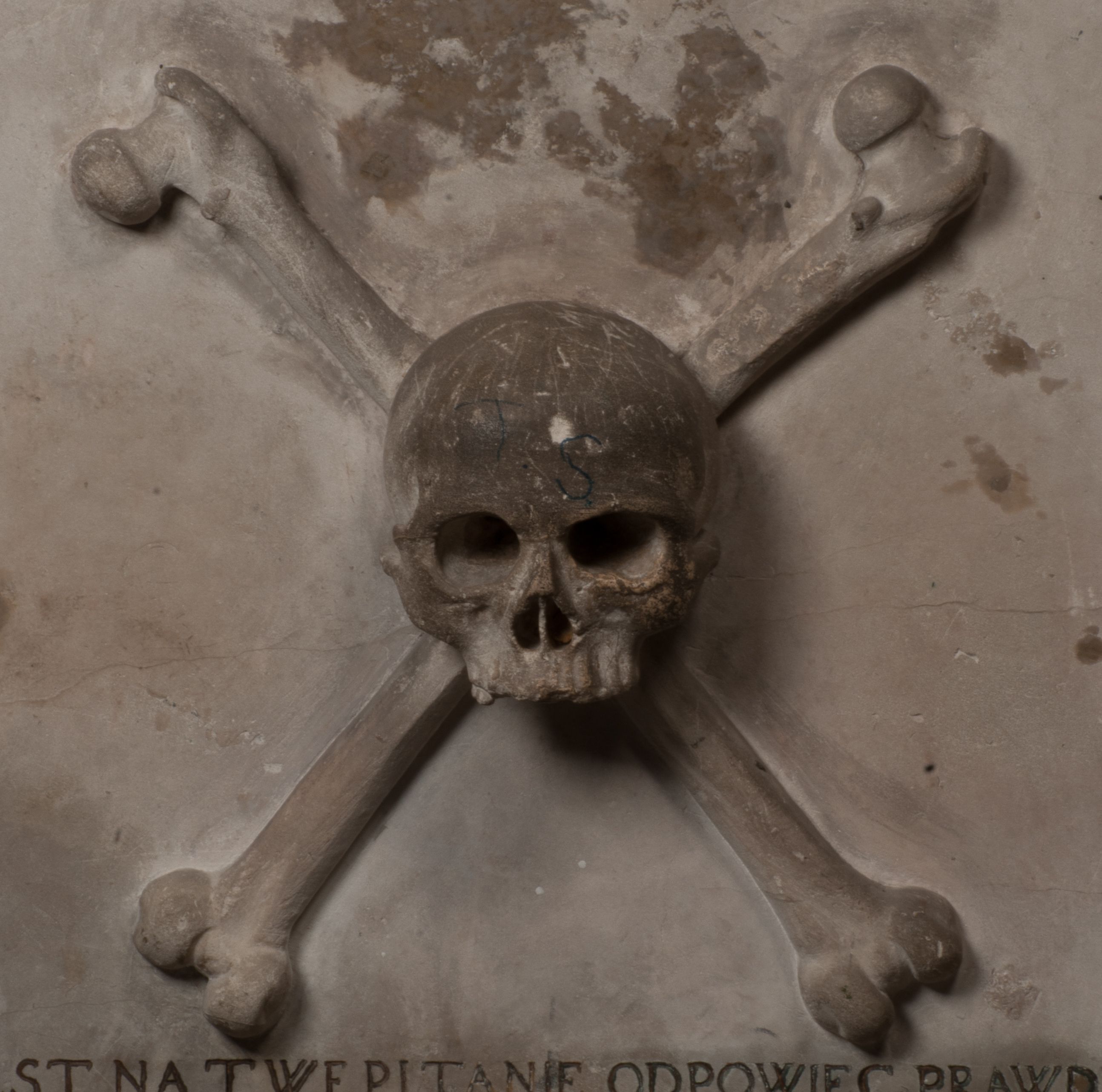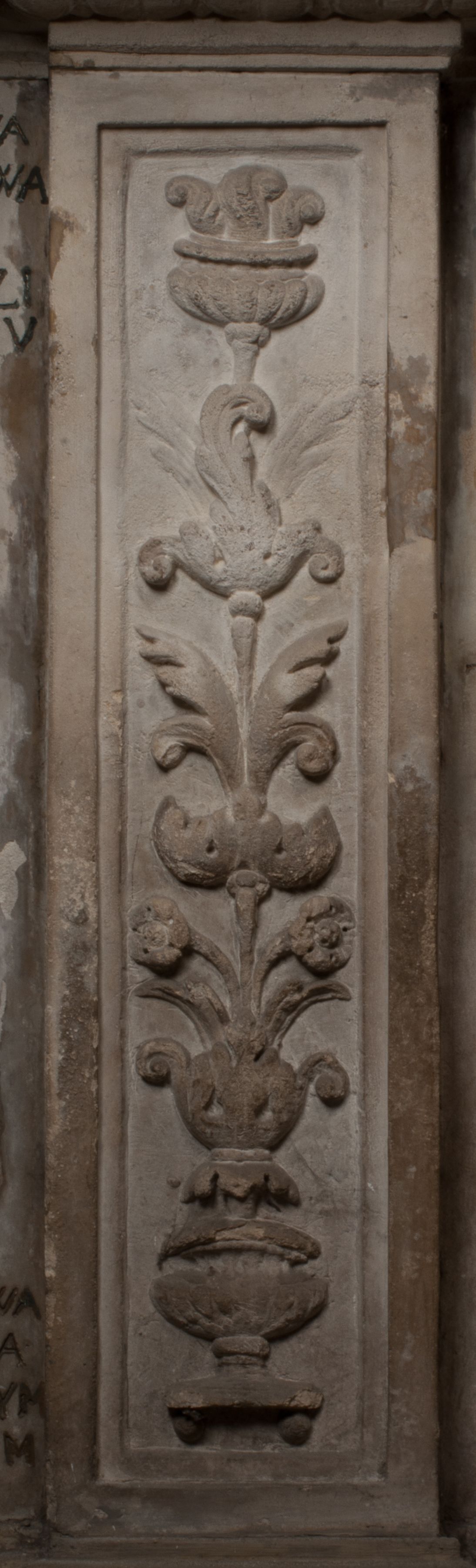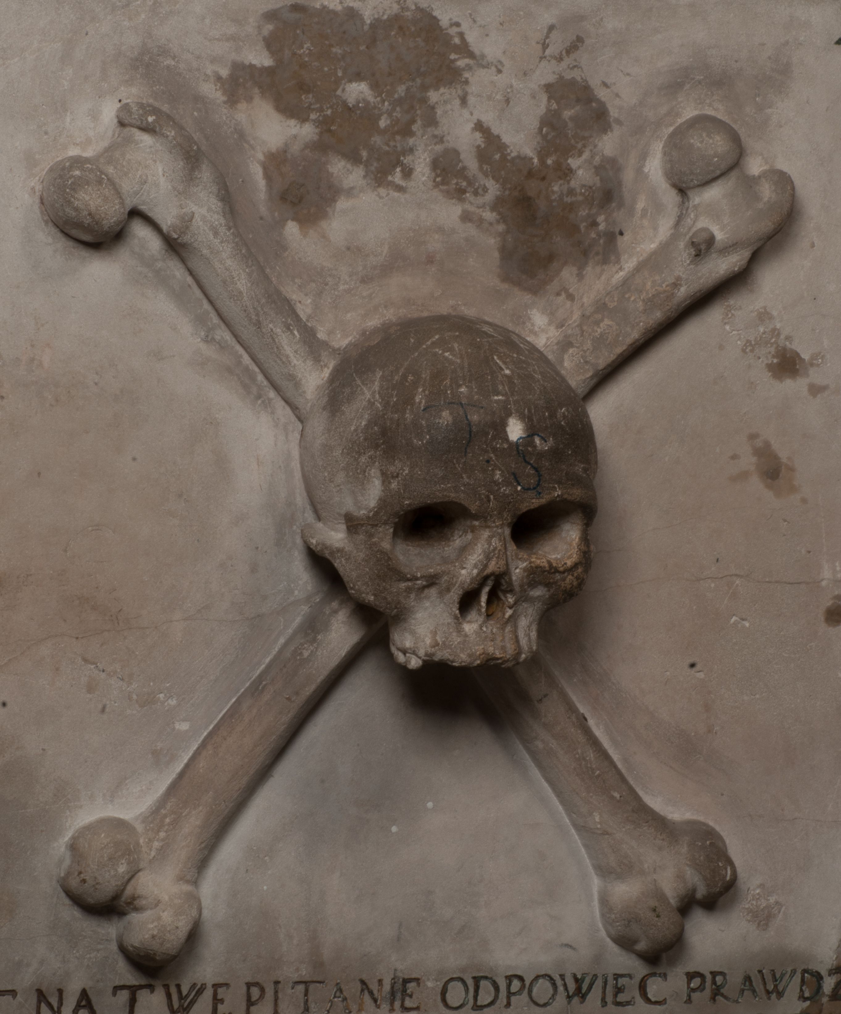 Dolna część artykułowa lizenami ozdobionymi motywami kandelabrowymi. W polu środkowym czaszka ze skrzyżowanymi piszczelami z inskrypcją w górnej i dolnej części: „POWIEDZ SVIETA [M]ADROSCI IESLI ZE SMIERC ZIWA / CZI MARTWA IESLI MARTWA CZEMV ZIWĄ BIWA / MALOWANA A IESLI ZIWA SMIERCIĄ CZEMV / ZOWIĄ IĄ NAD TO ZYWOT PRZECZ BIERZE KOZI/DEMV / TA IEST NA TWE PITANIE ODPOWIEC PRAWDZIWA / GDI TI ZYESZ SMIERC MARTVA GDY VMIERAS ZIWA / A IESLI ZLA CZI DOBRA CHCZES WIEDZIEC LI O TYM / IAKIS SĄM TAKĄ SMIELE SMIERC MIEĆ BĘDZIESZ PO TYM”. Na lewym polu inskrypcja „CO ZA DZIW ZEM POPIOLEM / WIEDZCIE ZESCIE WY / IAKO IA TENZE POPIOL, TO / IEDNO ZE ZYWY / BO GDIM SIĘ W PROCH ROSSIPAL / DOPIROM PRAWDZIWIE DOSZEDL, ZE CZLOWIEK TYMZE / PROCHEM CHOCIA ZYWIE / PATRZ ZE ZYWY POPIELIE A / TO POMNI SOBIE / ZES NA SWIECIE POPIOLEM / POPIOLEM I W GROBIE / A ZASZ NIEWIES CZYMEM BYL / A TERAZEM IAKI / OGLIANDAI, VWAZAIACZ ZE / SAM BEDZIESZ TAKI / BYLEM TERAS MIE NIE MASZ / IAK BIM TISZ NA SWIECIE / NIE BYL WY DZIS IESTESCIE / IUTRO NIEBEDZIECIE”. W polu cokołu „KTO TV LEZY POBOZNOSC / CNOTA OBYCZAIE / IAKICH NIERYCHLO VIZRĄ / BLISKO LEGLE KRAIE / IAKOSZ IE TAK MALY KĄT / MOGL ZACHOWAC W SOBIE / CZOSZ ALBO CNOTI LVCZKIE / GRZEBIĄ SCZIALEM W GROBIE / TILKOC TV CIALO LIEZY LIECZ / DVSZA W PRZESTRONE / NIEBIESKIE GMACHI WESŁA / KĘDI NIEZLICZONE / LATA POWIEDZIE. CZEMV IZE / MATKĄ BYLA / NIERZKAC POTOMSTWV ALIE / I SIROTOM SILA / TAKCI ZYWOT ZYWOTEM BYWA ZAKVPIONY / DOBRI FRIMARK DAC PLOCHI / ZA ON NIESKONCZONY”. Cokół zamyka wąski, silnie wysunięty gzyms z kimationem jońskim.