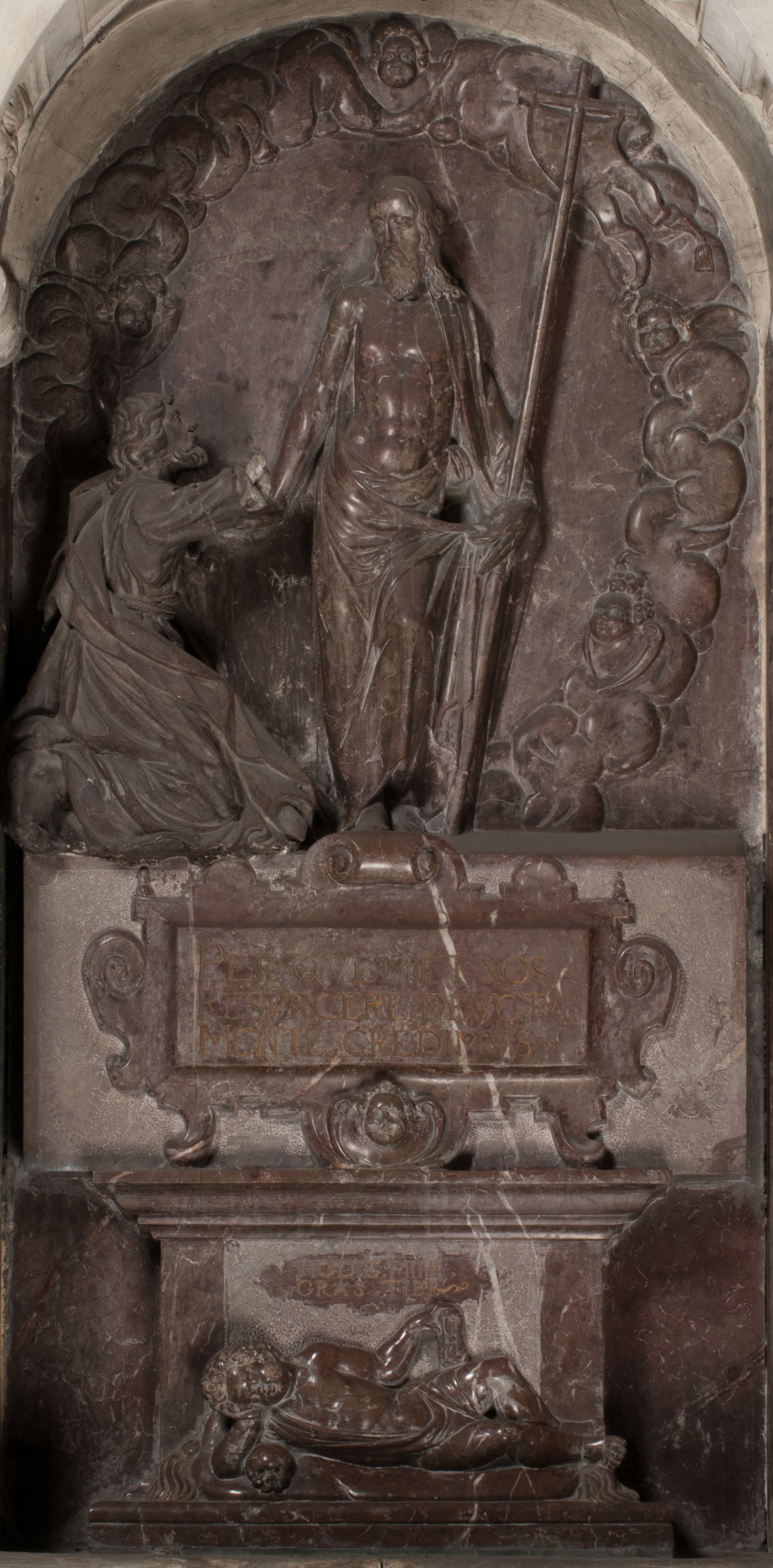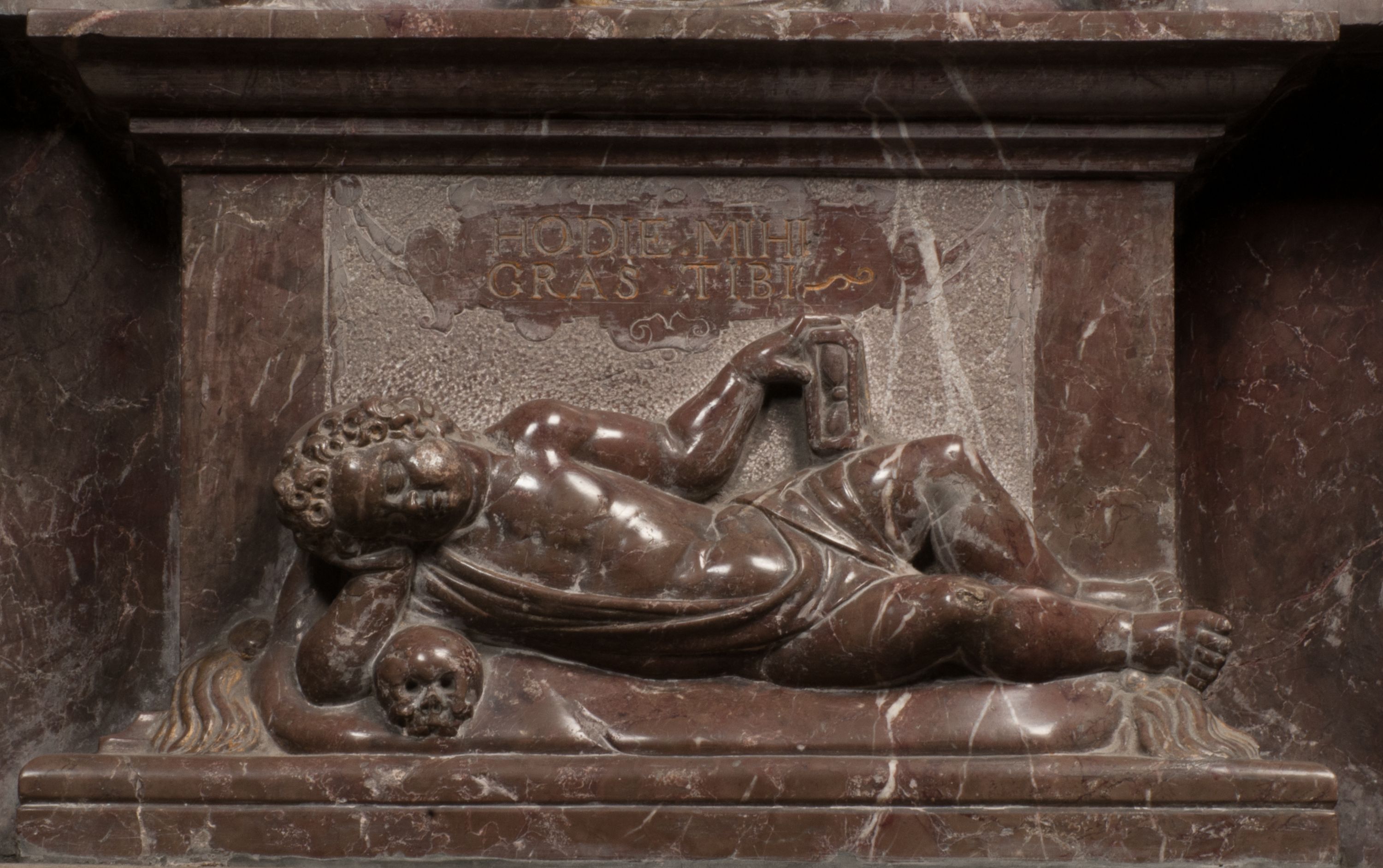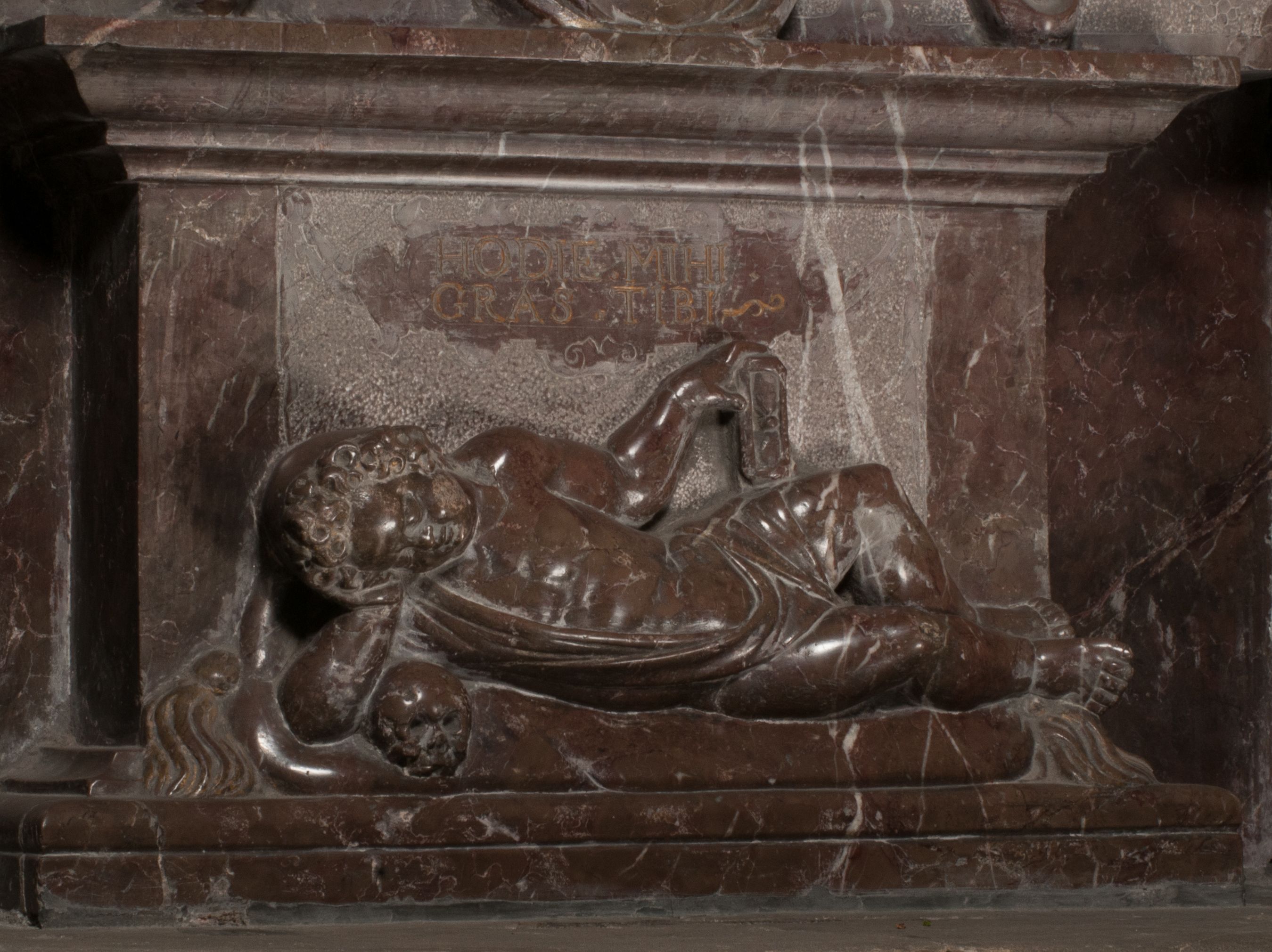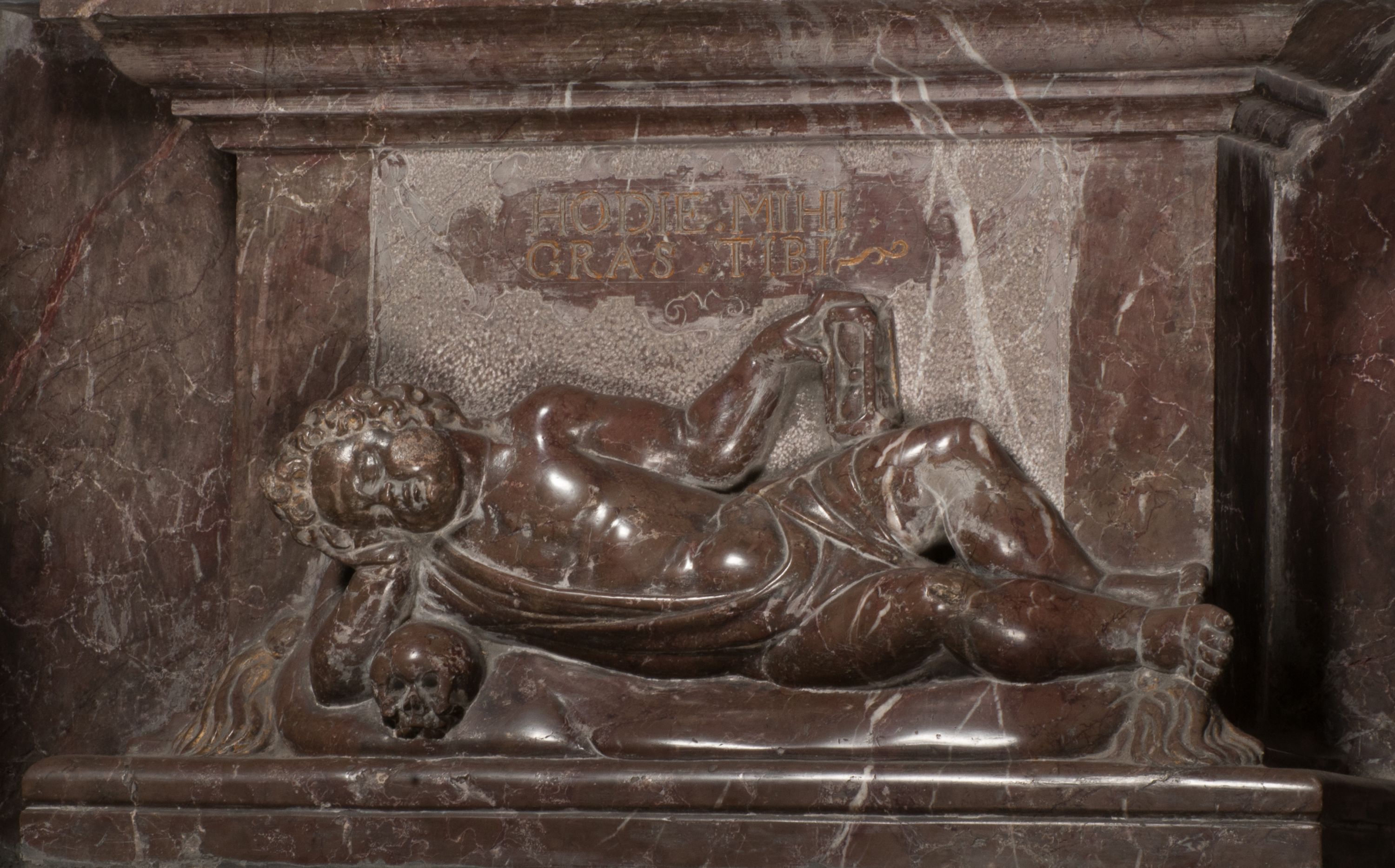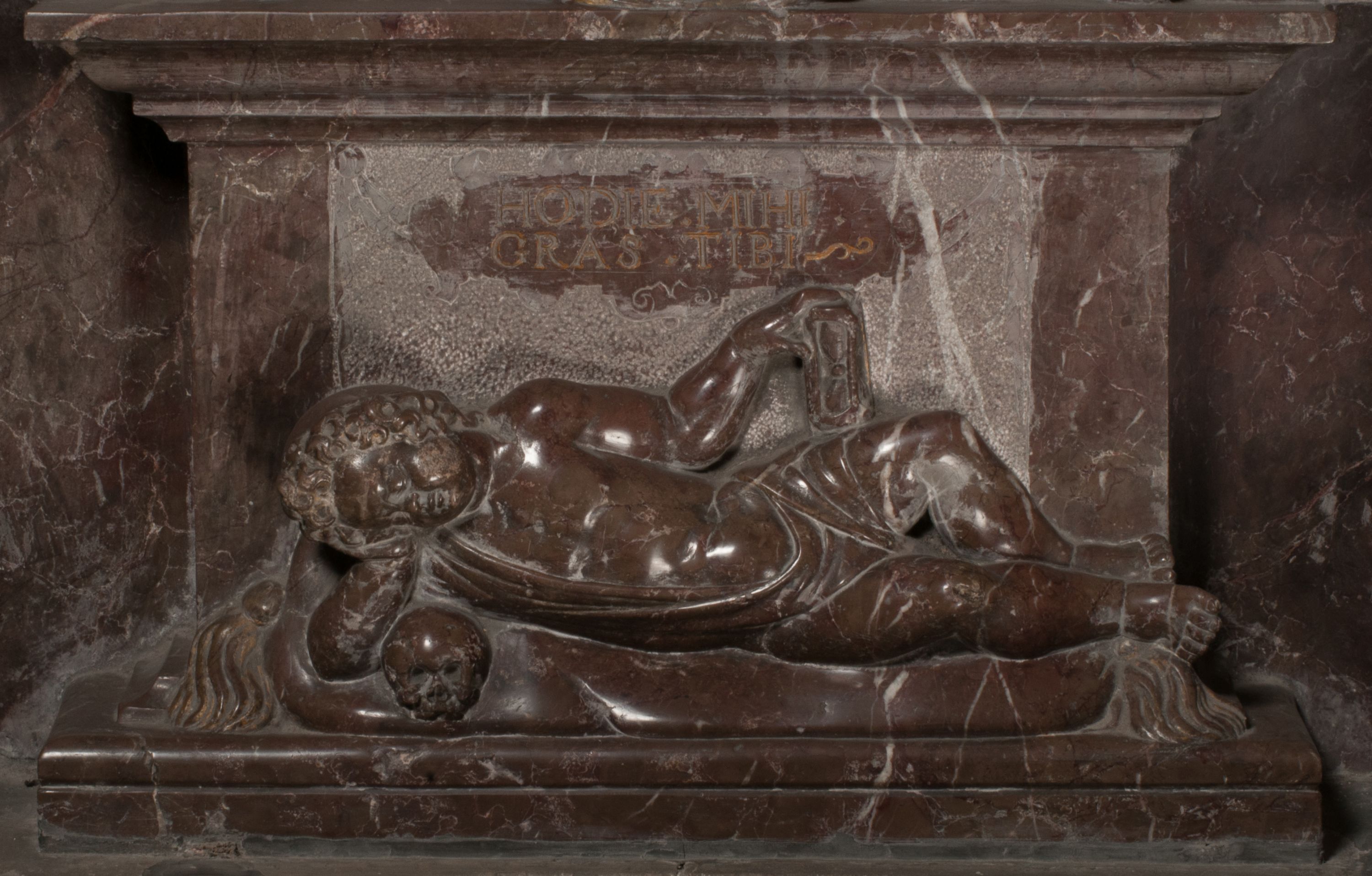 Postacie stoją na podwójnym postumencie. W jego górnej części wyryto sentencję łacińską na prostokątnej tablicy umieszczonej w ozdobnym kartuszu, z zawiniętym spiralnie wycięciem krawędzi górnej i z dodaną w krawędzi dolnej główką uskrzydlonego putta. Napis na postumencie: „PER QVEM ET NOS / RESVRGERE DEVOTA / MENTE, CREDIMVS”. Na płycie poniżej płaskorzeźbione, leżące na prawym boku putto podpierające głowę na prawej ręce, natomiast w lewej trzymające klepsydrę. Nagie ciało, lekko przysłonięte draperią, spoczywa na poduszce z dwoma pomponami. Prawa noga jest wyprostowana, lewa zgięta w kolanie. Twarz pucołowata, z otwartymi oczami, otoczona gęstymi puklami loków. Przed dzieckiem leży czaszka. Nad nim znajduje się grawerowany kartusz z napisem: „HODIE MIHI / CRAS TIBI”.