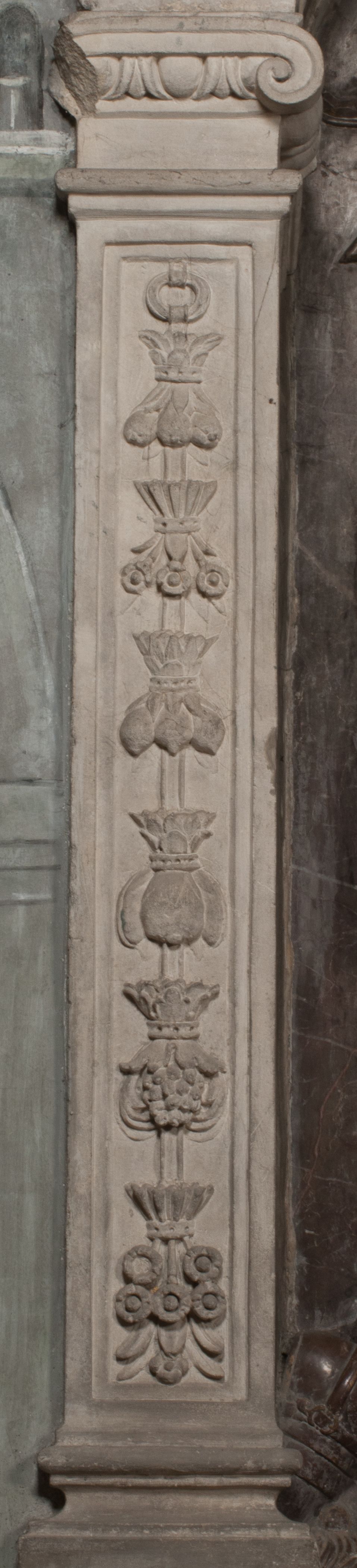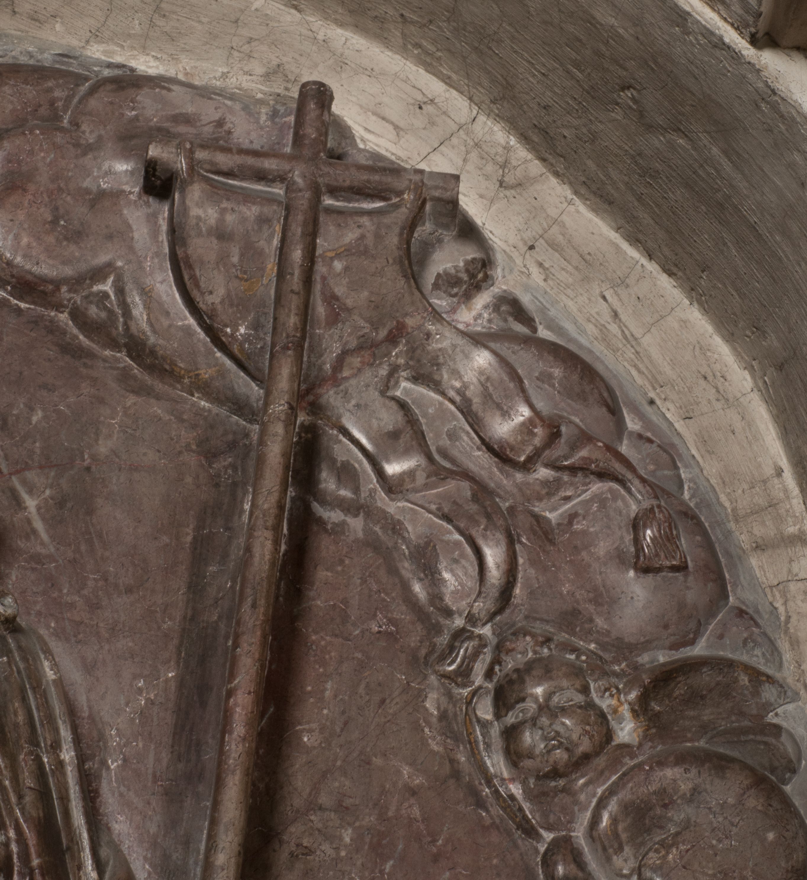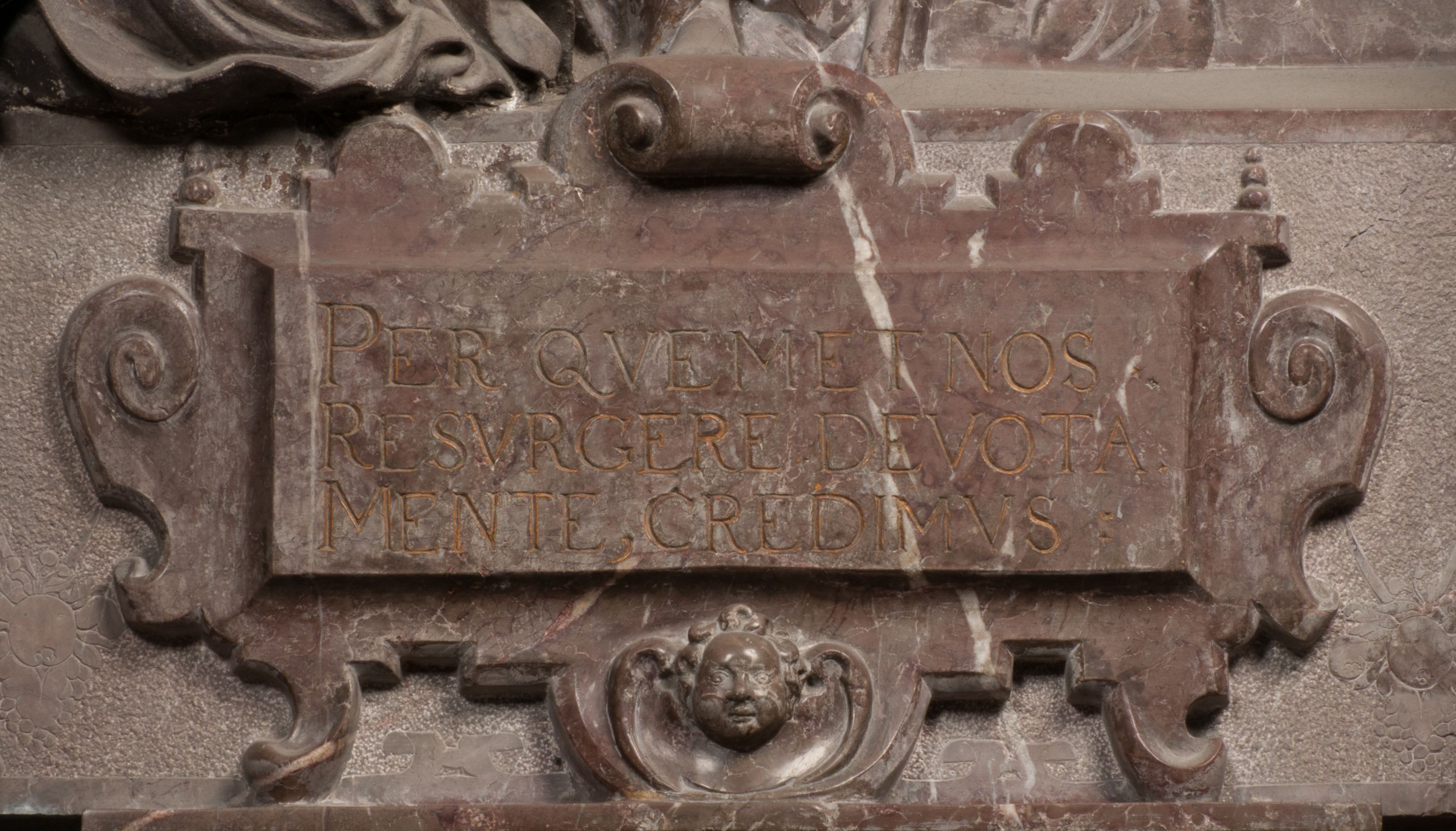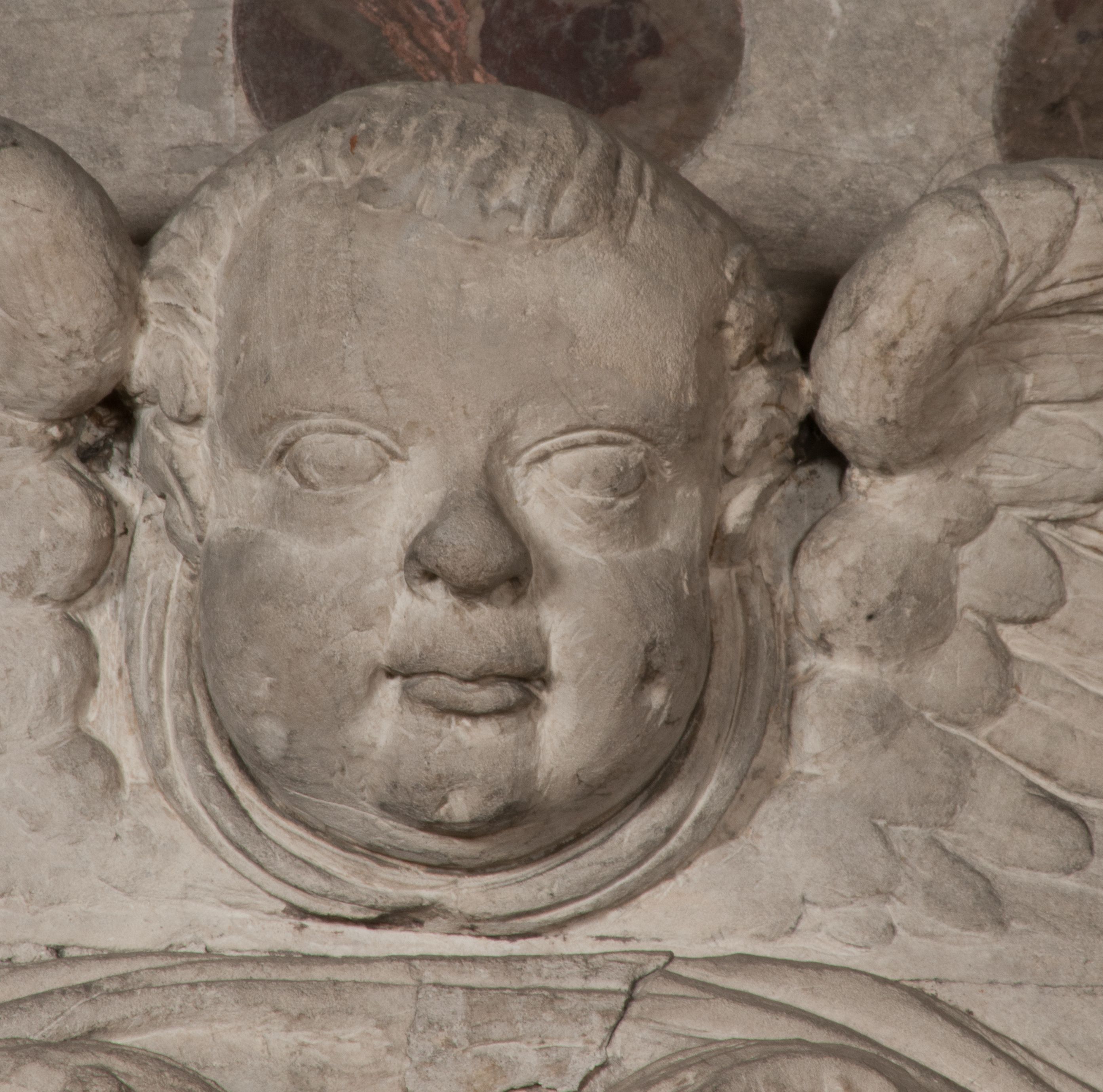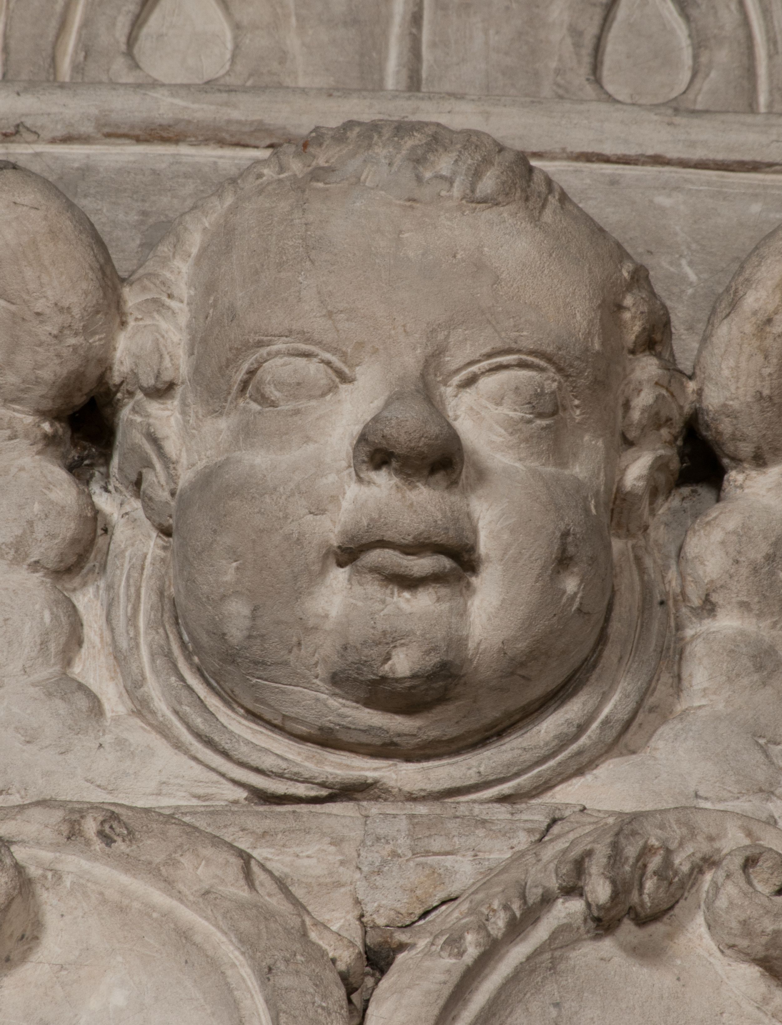 Postacie stoją na podwójnym postumencie. W jego górnej części wyryto sentencję łacińską na prostokątnej tablicy umieszczonej w ozdobnym kartuszu, z zawiniętym spiralnie wycięciem krawędzi górnej i z dodaną w krawędzi dolnej główką uskrzydlonego putta. Napis na postumencie: „PER QVEM ET NOS / RESVRGERE DEVOTA / MENTE, CREDIMVS”. Na płycie poniżej płaskorzeźbione, leżące na prawym boku putto podpierające głowę na prawej ręce, natomiast w lewej trzymające klepsydrę. Nagie ciało, lekko przysłonięte draperią, spoczywa na poduszce z dwoma pomponami. Prawa noga jest wyprostowana, lewa zgięta w kolanie. Twarz pucołowata, z otwartymi oczami, otoczona gęstymi puklami loków. Przed dzieckiem leży czaszka. Nad nim znajduje się grawerowany kartusz z napisem: „HODIE MIHI / CRAS TIBI”.