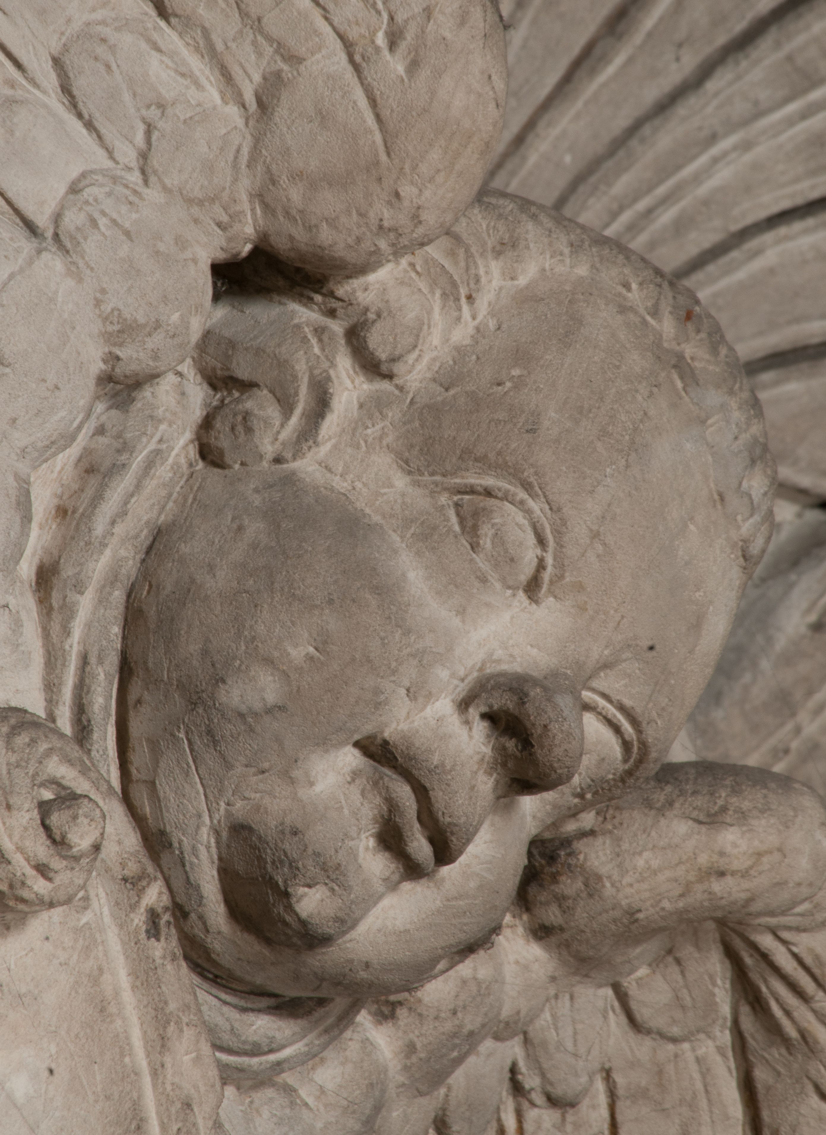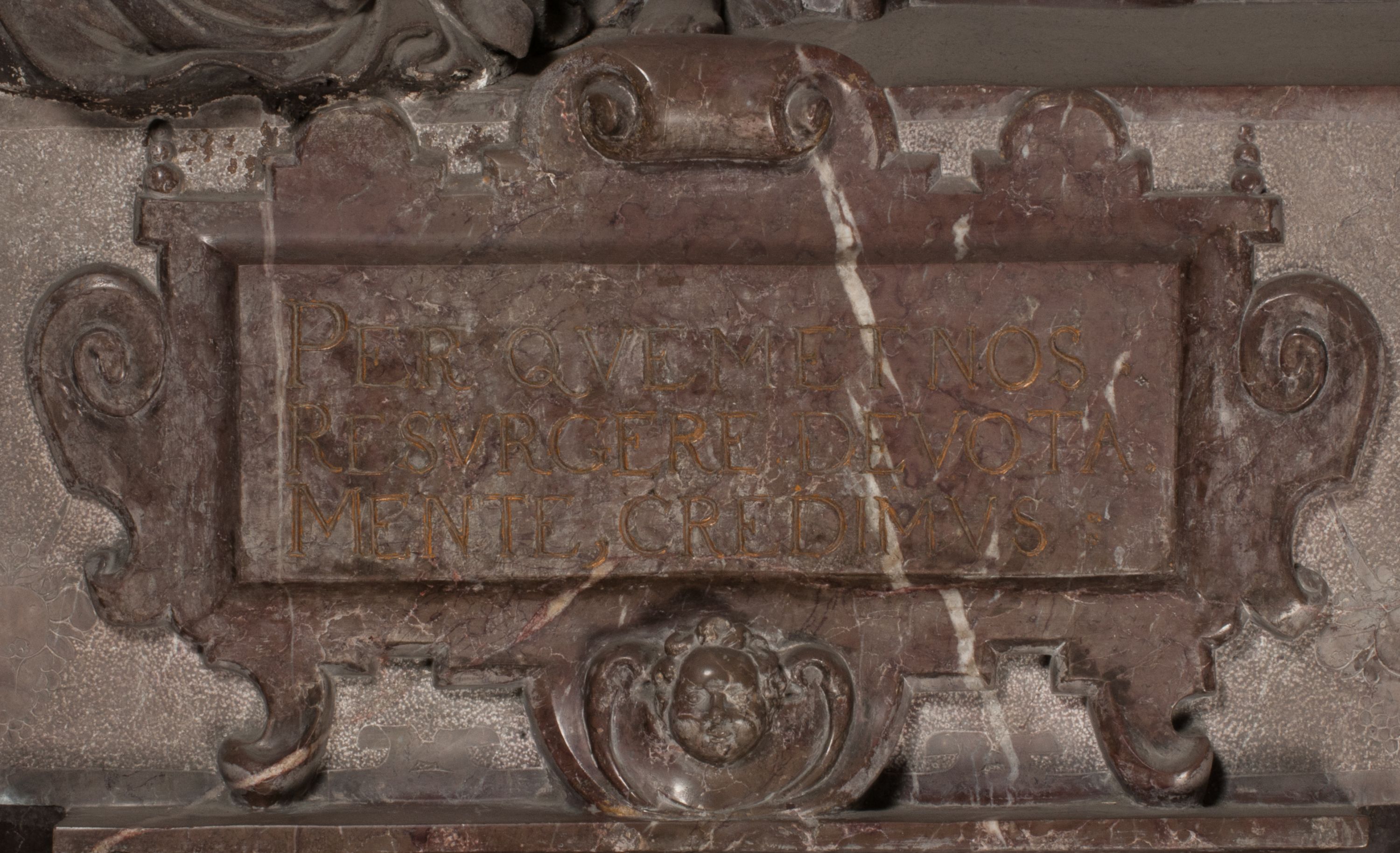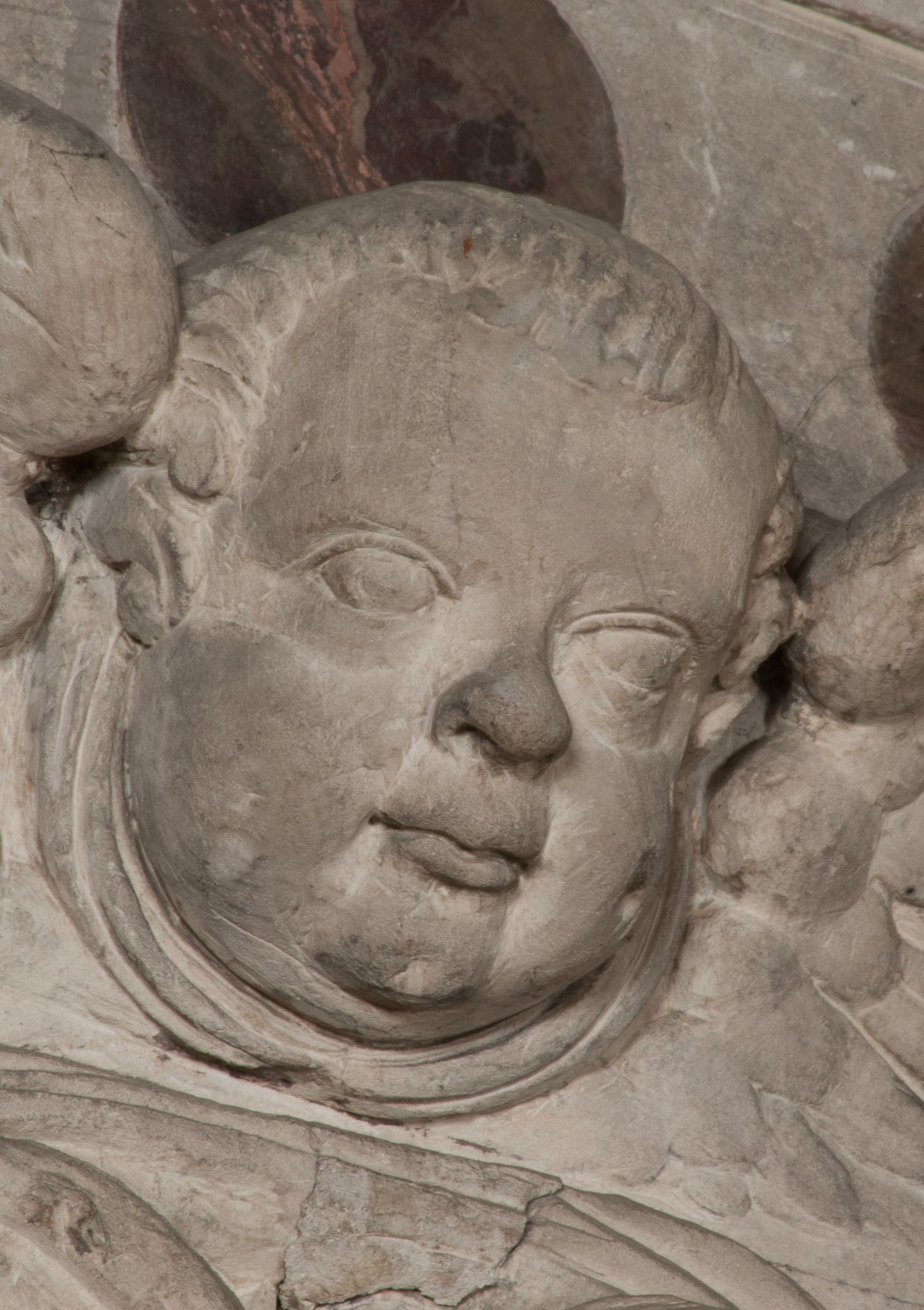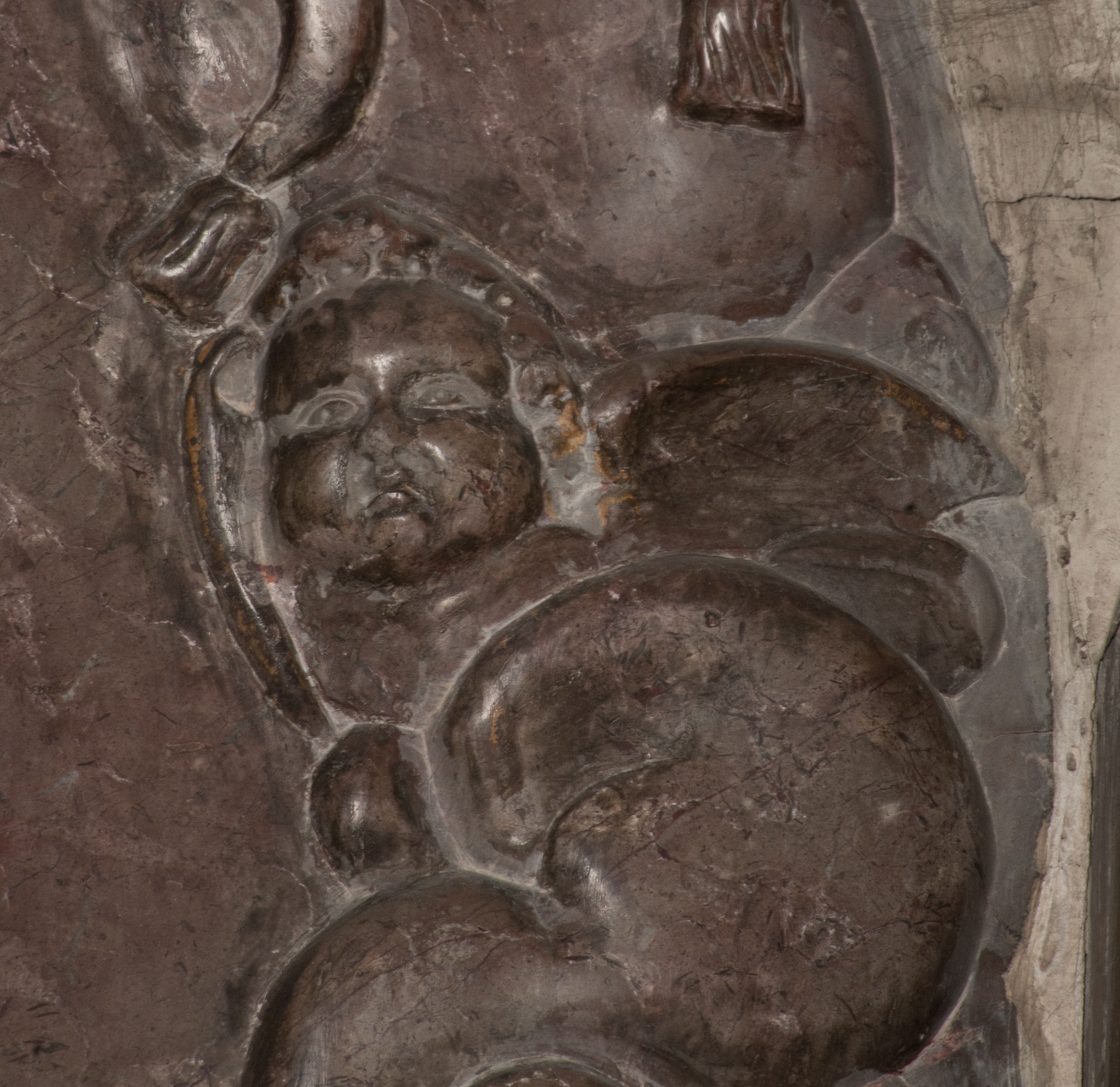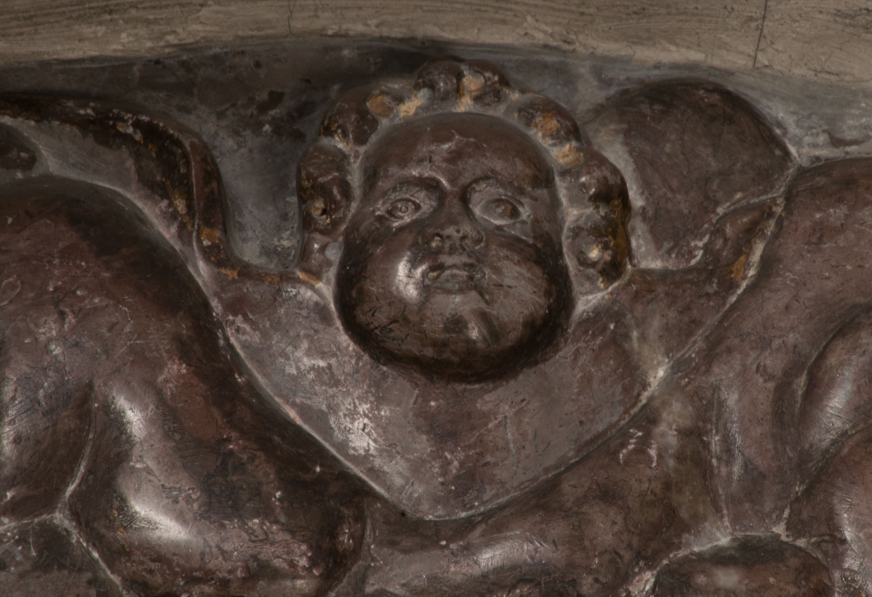 Postacie stoją na podwójnym postumencie. W jego górnej części wyryto sentencję łacińską na prostokątnej tablicy umieszczonej w ozdobnym kartuszu, z zawiniętym spiralnie wycięciem krawędzi górnej i z dodaną w krawędzi dolnej główką uskrzydlonego putta. Napis na postumencie: „PER QVEM ET NOS / RESVRGERE DEVOTA / MENTE, CREDIMVS”. Na płycie poniżej płaskorzeźbione, leżące na prawym boku putto podpierające głowę na prawej ręce, natomiast w lewej trzymające klepsydrę. Nagie ciało, lekko przysłonięte draperią, spoczywa na poduszce z dwoma pomponami. Prawa noga jest wyprostowana, lewa zgięta w kolanie. Twarz pucołowata, z otwartymi oczami, otoczona gęstymi puklami loków. Przed dzieckiem leży czaszka. Nad nim znajduje się grawerowany kartusz z napisem: „HODIE MIHI / CRAS TIBI”.