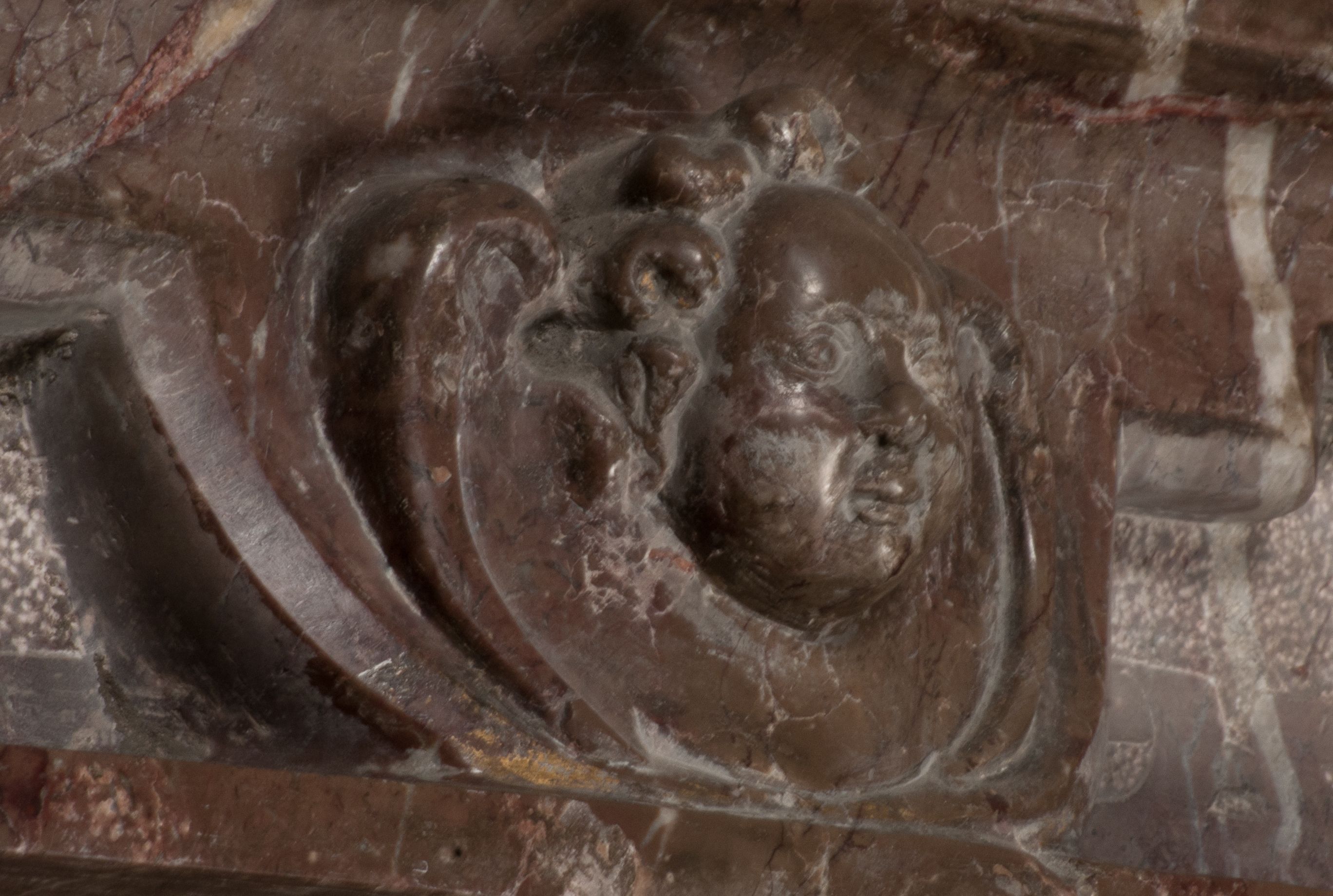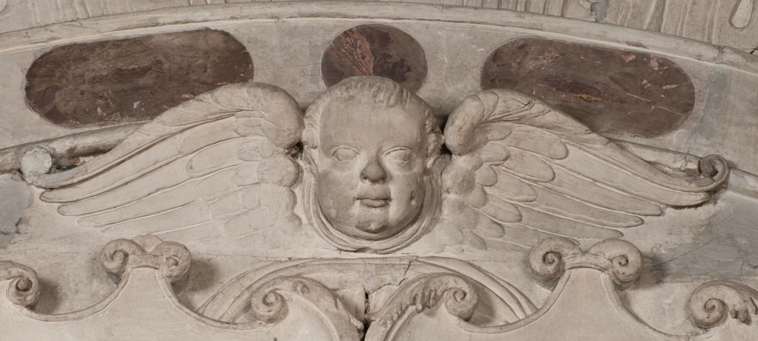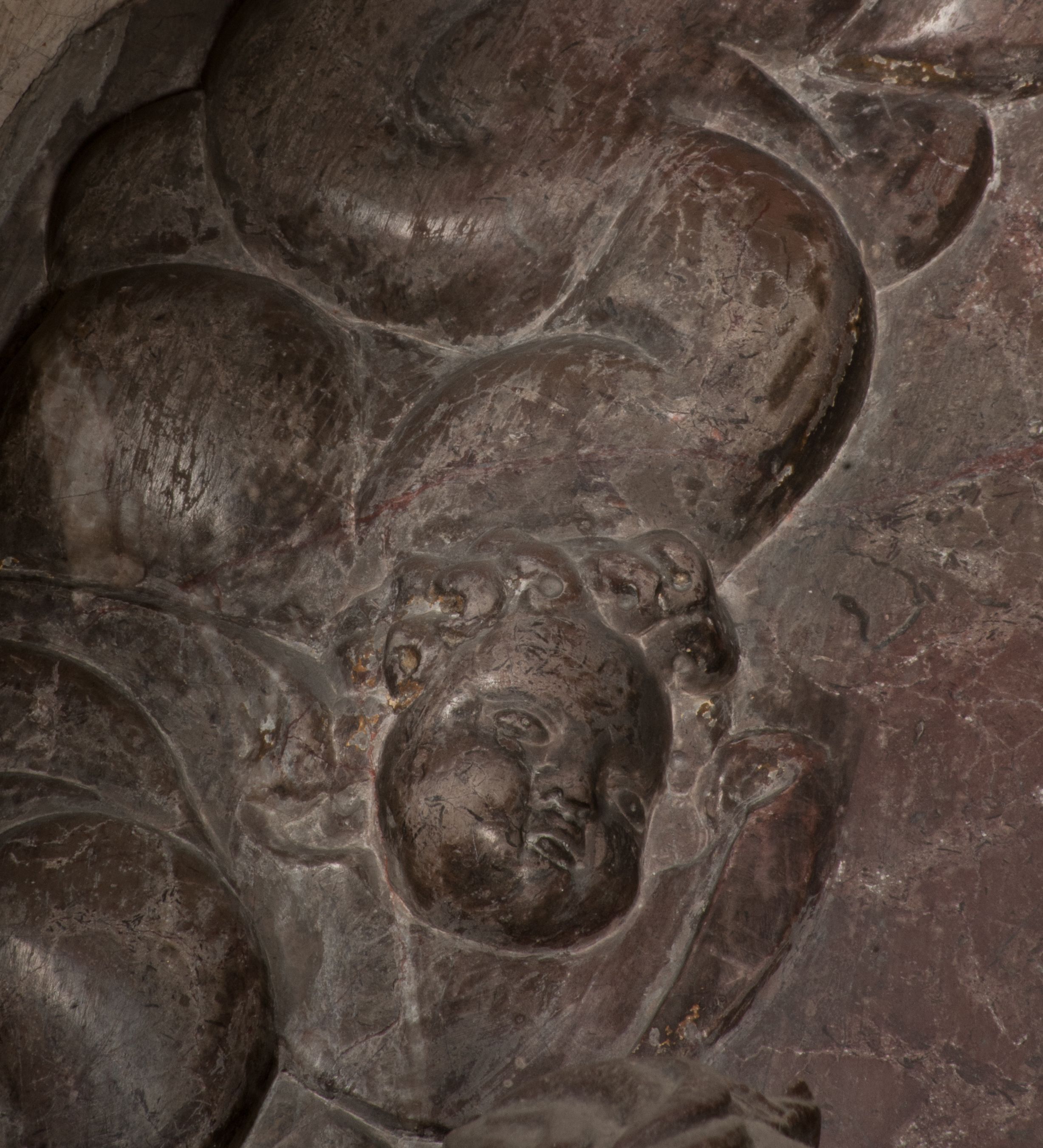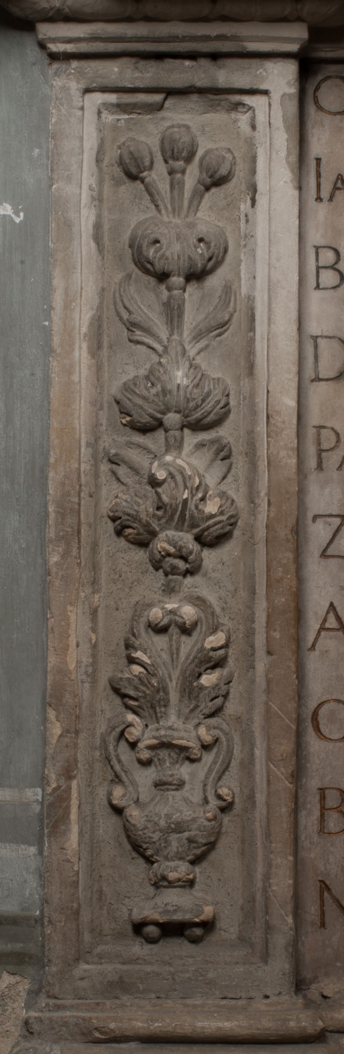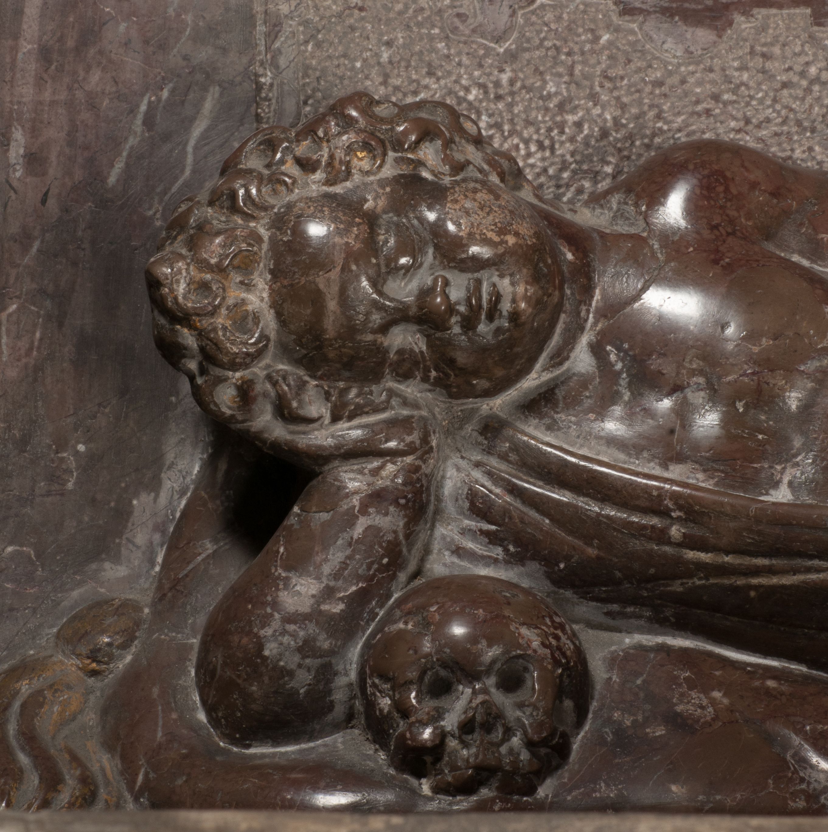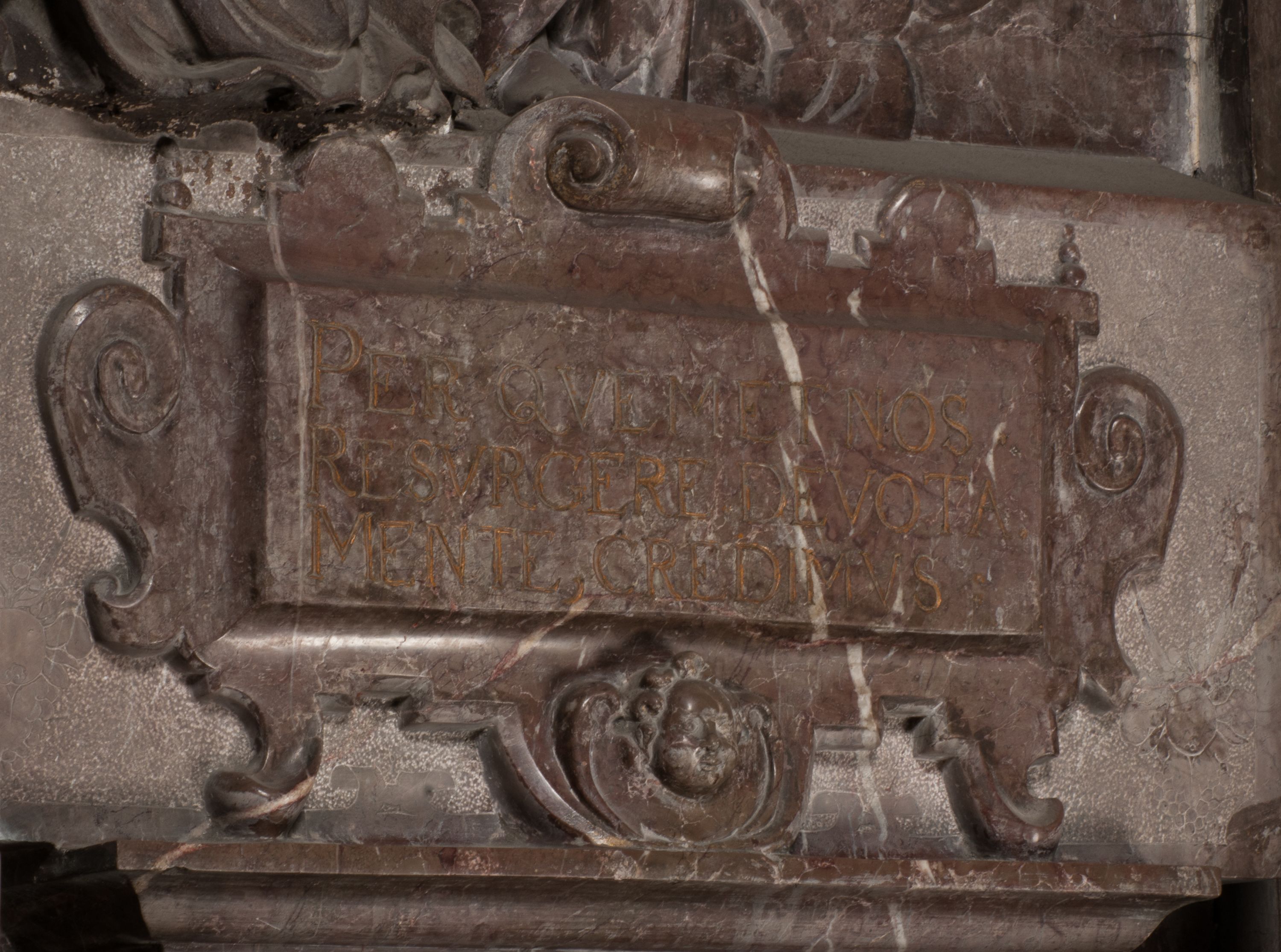 Postacie stoją na podwójnym postumencie. W jego górnej części wyryto sentencję łacińską na prostokątnej tablicy umieszczonej w ozdobnym kartuszu, z zawiniętym spiralnie wycięciem krawędzi górnej i z dodaną w krawędzi dolnej główką uskrzydlonego putta. Napis na postumencie: „PER QVEM ET NOS / RESVRGERE DEVOTA / MENTE, CREDIMVS”. Na płycie poniżej płaskorzeźbione, leżące na prawym boku putto podpierające głowę na prawej ręce, natomiast w lewej trzymające klepsydrę. Nagie ciało, lekko przysłonięte draperią, spoczywa na poduszce z dwoma pomponami. Prawa noga jest wyprostowana, lewa zgięta w kolanie. Twarz pucołowata, z otwartymi oczami, otoczona gęstymi puklami loków. Przed dzieckiem leży czaszka. Nad nim znajduje się grawerowany kartusz z napisem: „HODIE MIHI / CRAS TIBI”.