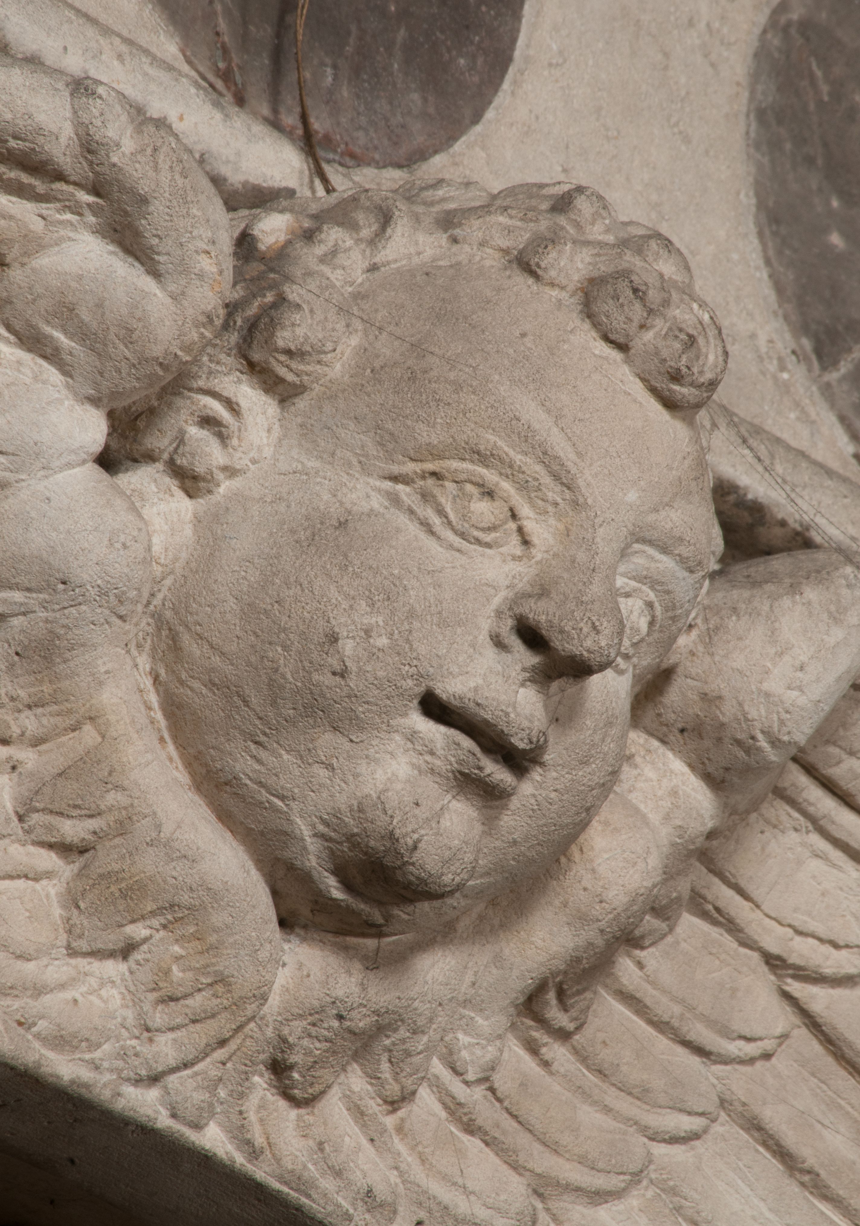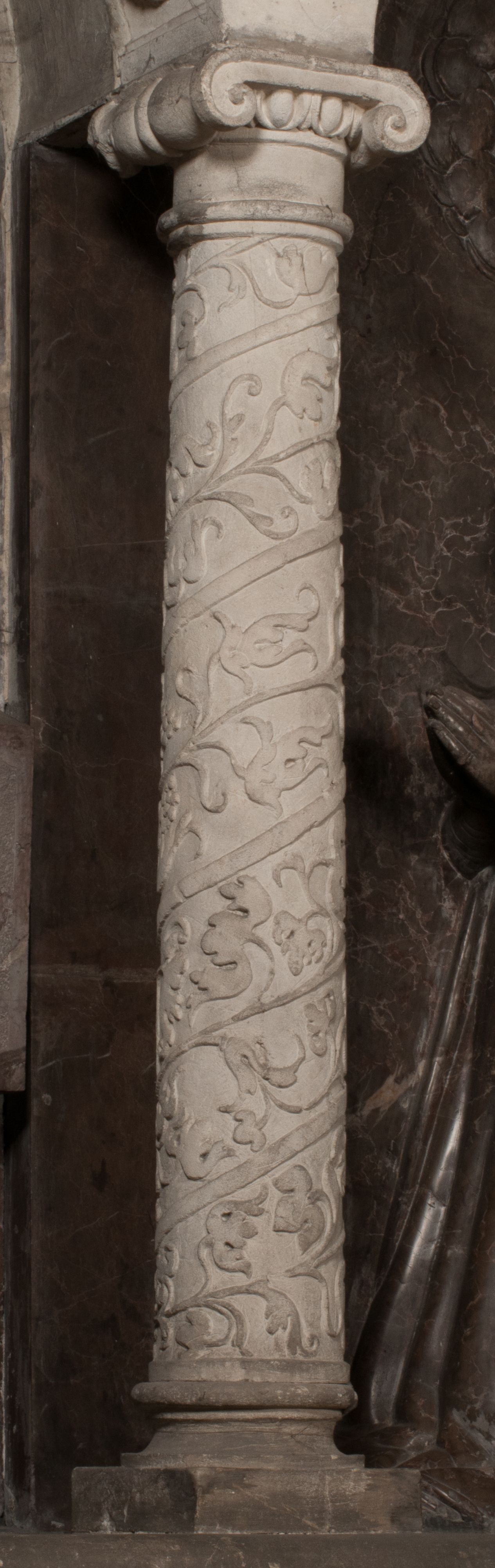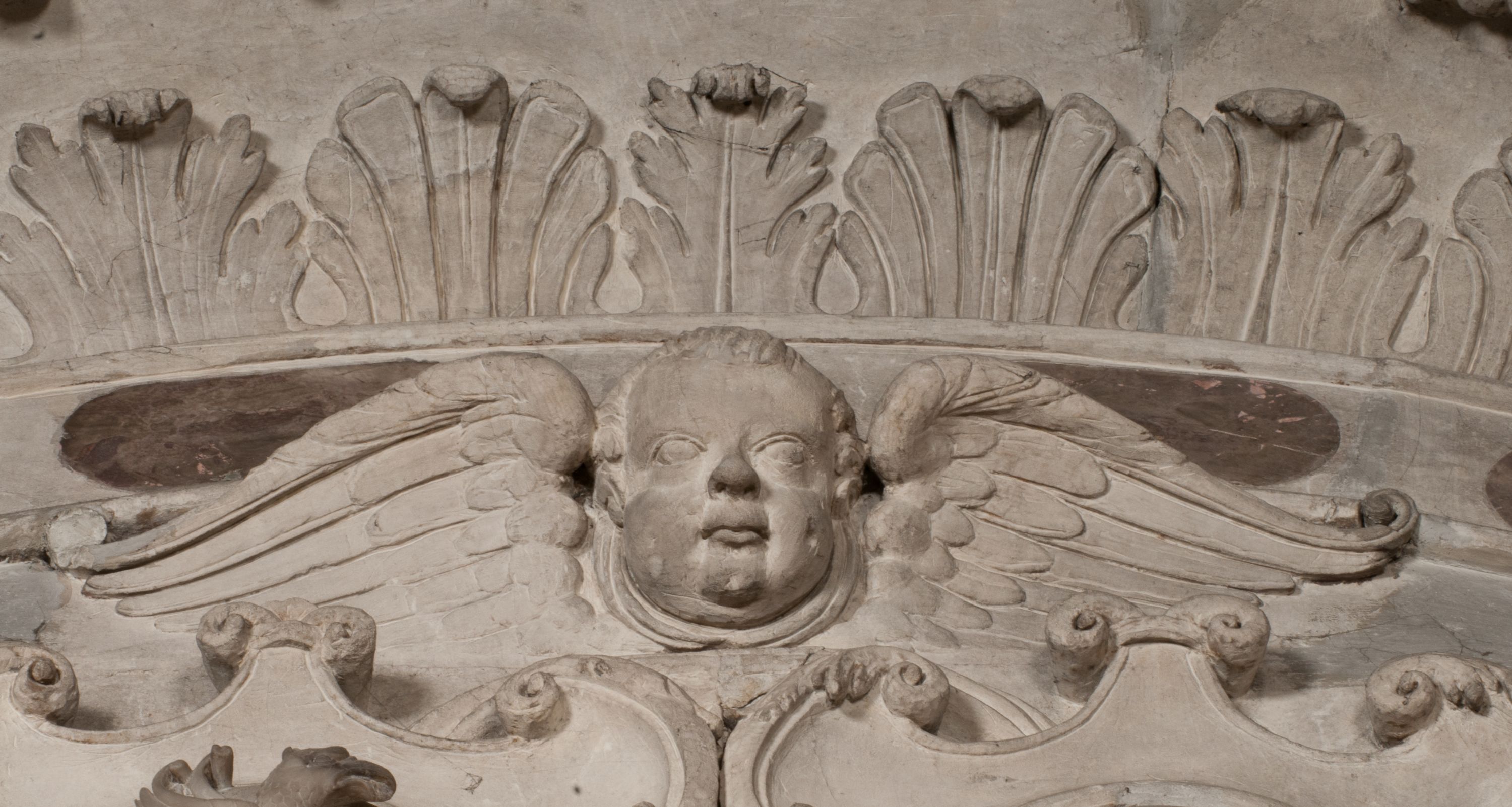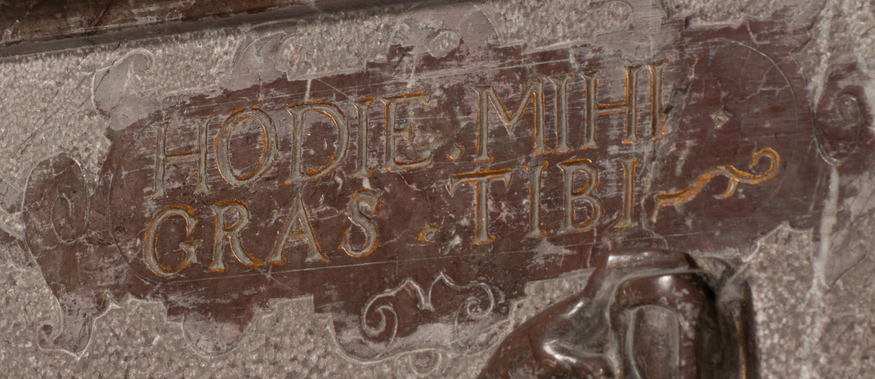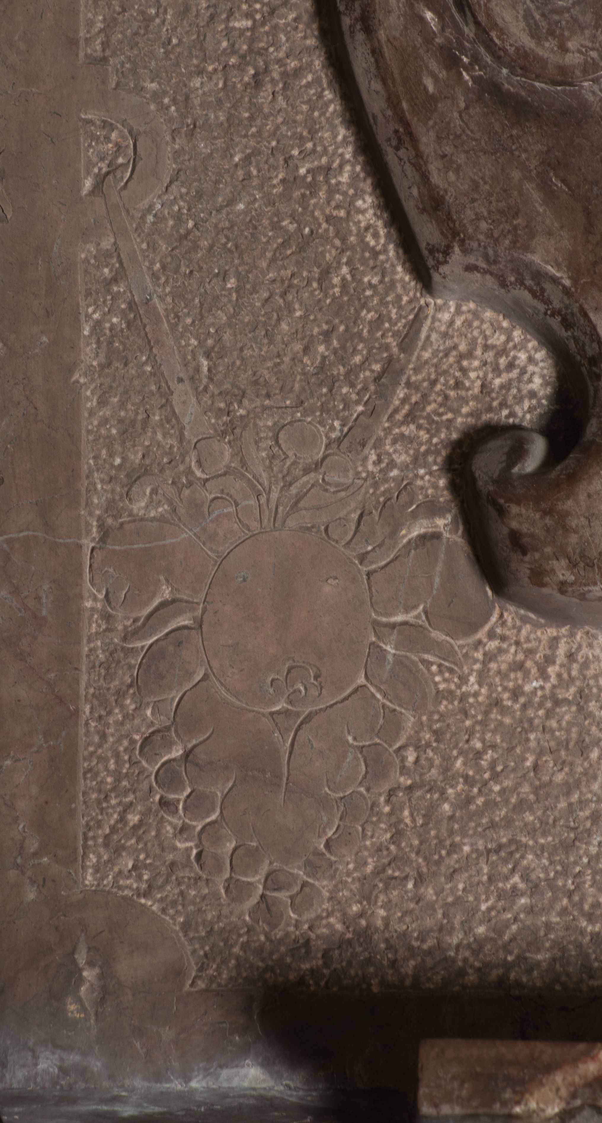 Postacie stoją na podwójnym postumencie. W jego górnej części wyryto sentencję łacińską na prostokątnej tablicy umieszczonej w ozdobnym kartuszu, z zawiniętym spiralnie wycięciem krawędzi górnej i z dodaną w krawędzi dolnej główką uskrzydlonego putta. Napis na postumencie: „PER QVEM ET NOS / RESVRGERE DEVOTA / MENTE, CREDIMVS”. Na płycie poniżej płaskorzeźbione, leżące na prawym boku putto podpierające głowę na prawej ręce, natomiast w lewej trzymające klepsydrę. Nagie ciało, lekko przysłonięte draperią, spoczywa na poduszce z dwoma pomponami. Prawa noga jest wyprostowana, lewa zgięta w kolanie. Twarz pucołowata, z otwartymi oczami, otoczona gęstymi puklami loków. Przed dzieckiem leży czaszka. Nad nim znajduje się grawerowany kartusz z napisem: „HODIE MIHI / CRAS TIBI”.