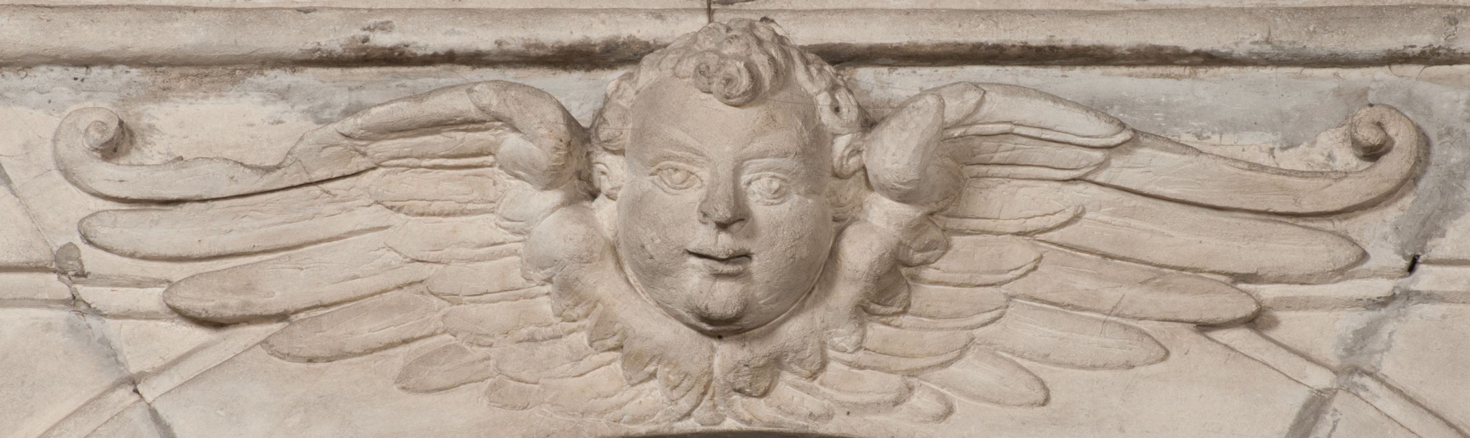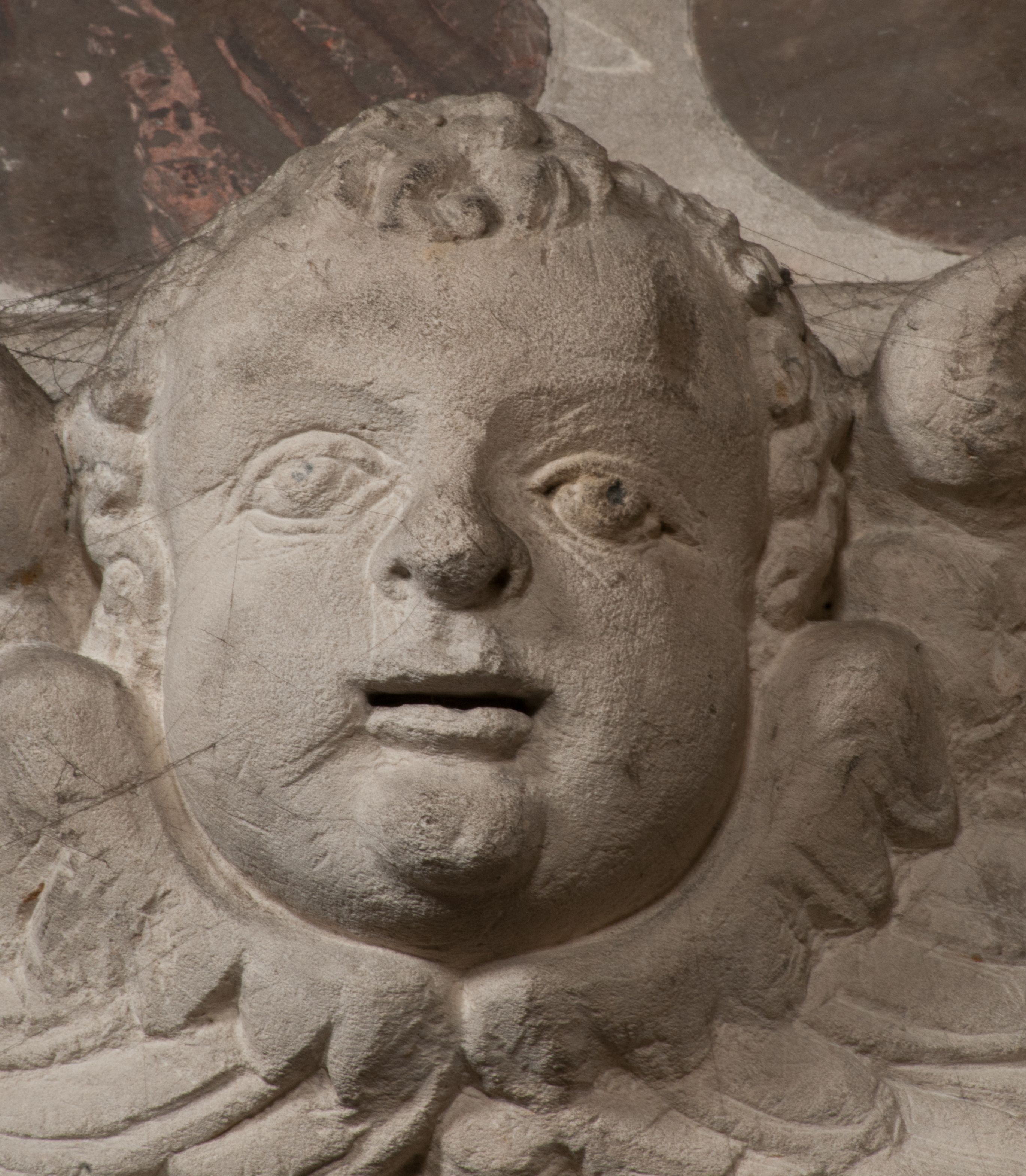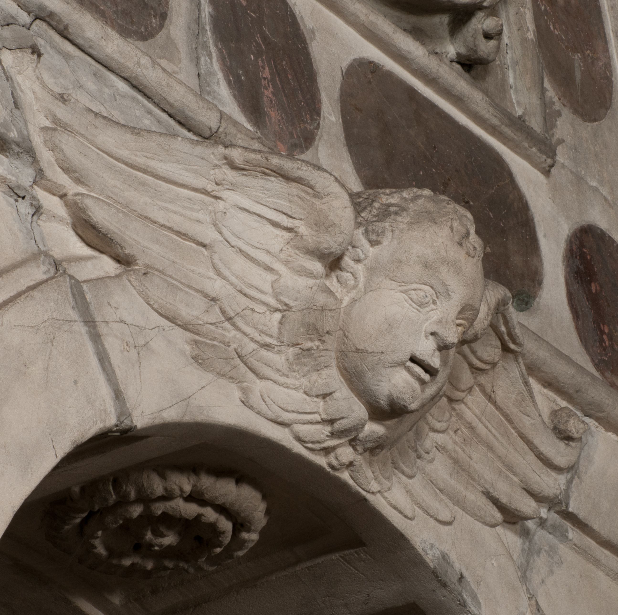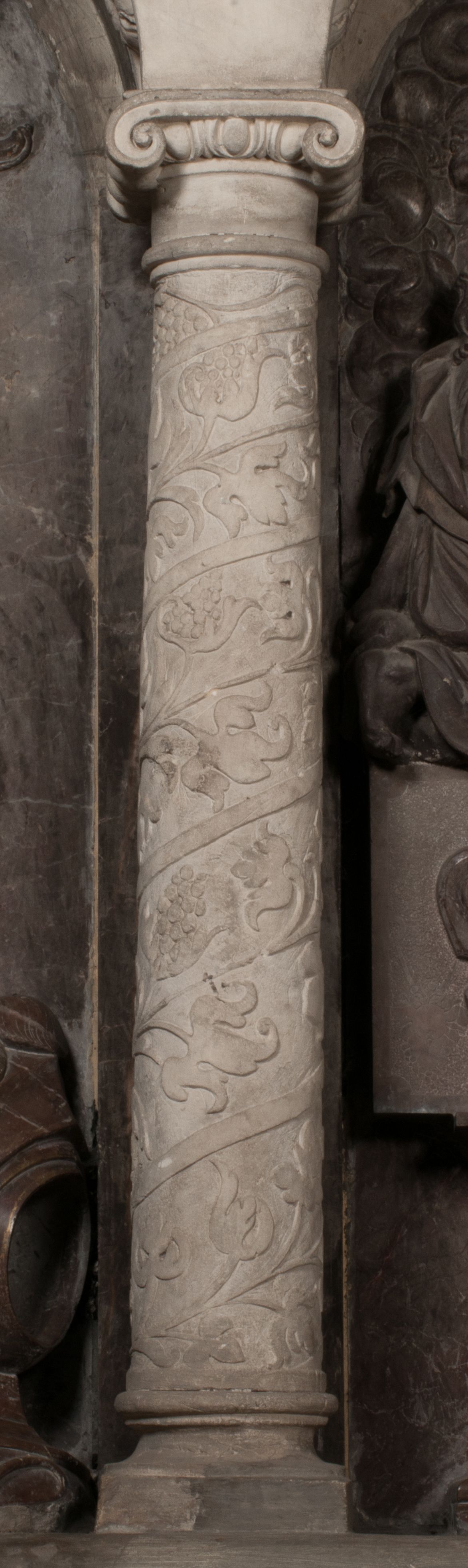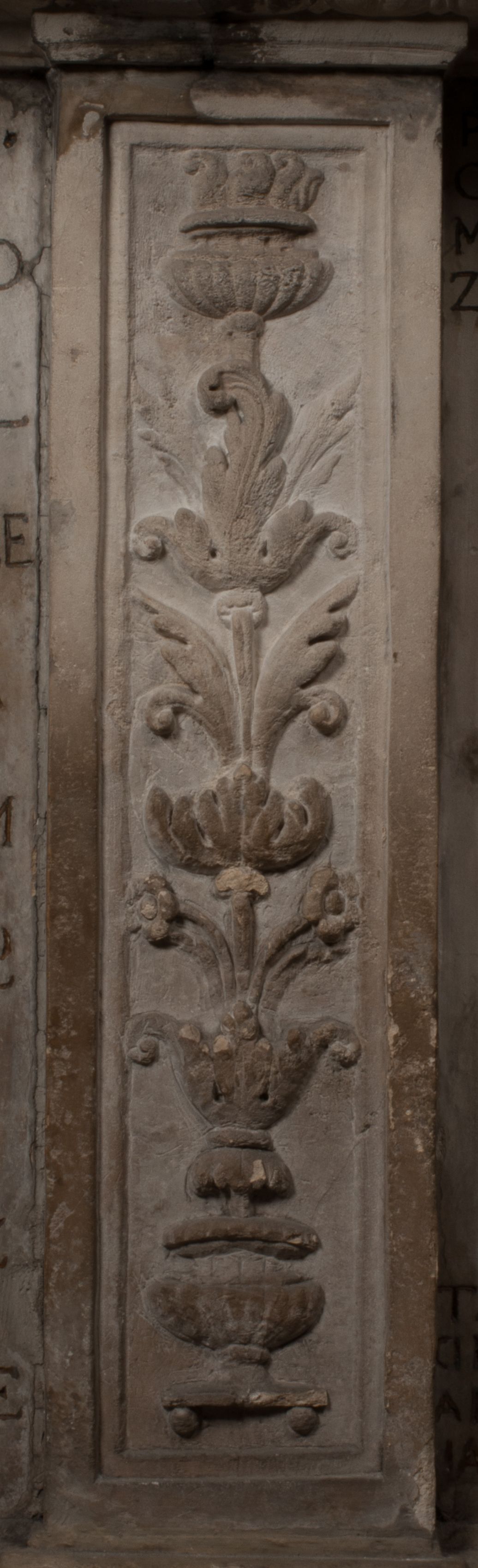 Postacie stoją na podwójnym postumencie. W jego górnej części wyryto sentencję łacińską na prostokątnej tablicy umieszczonej w ozdobnym kartuszu, z zawiniętym spiralnie wycięciem krawędzi górnej i z dodaną w krawędzi dolnej główką uskrzydlonego putta. Napis na postumencie: „PER QVEM ET NOS / RESVRGERE DEVOTA / MENTE, CREDIMVS”. Na płycie poniżej płaskorzeźbione, leżące na prawym boku putto podpierające głowę na prawej ręce, natomiast w lewej trzymające klepsydrę. Nagie ciało, lekko przysłonięte draperią, spoczywa na poduszce z dwoma pomponami. Prawa noga jest wyprostowana, lewa zgięta w kolanie. Twarz pucołowata, z otwartymi oczami, otoczona gęstymi puklami loków. Przed dzieckiem leży czaszka. Nad nim znajduje się grawerowany kartusz z napisem: „HODIE MIHI / CRAS TIBI”.