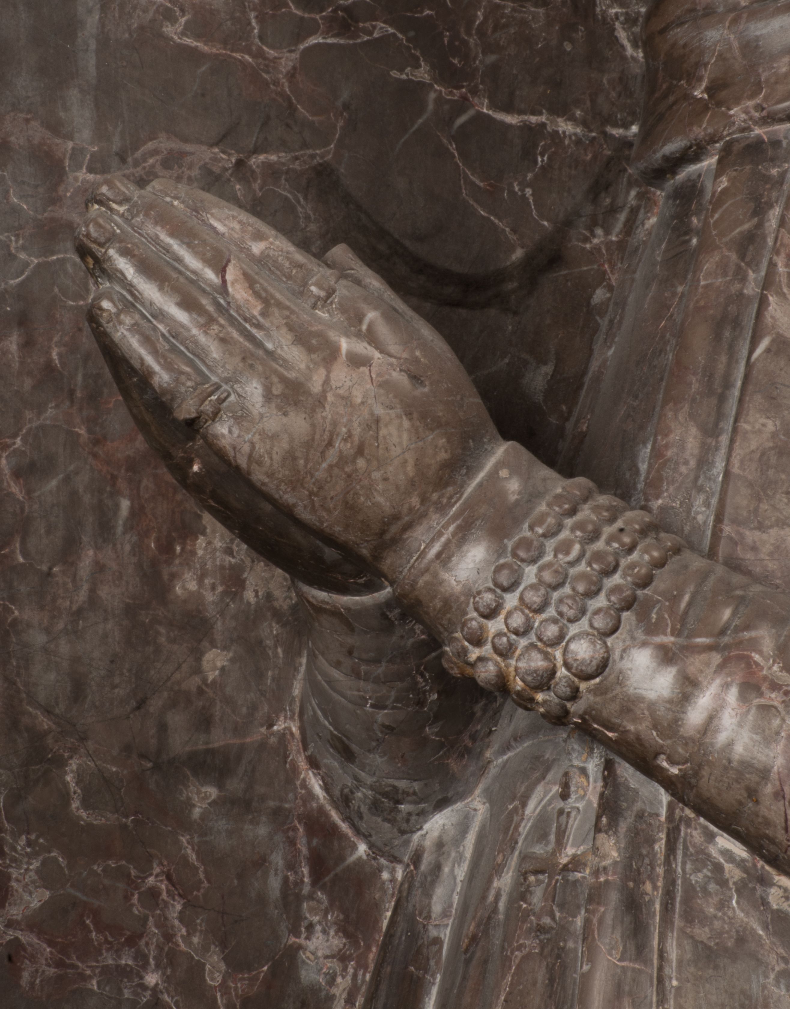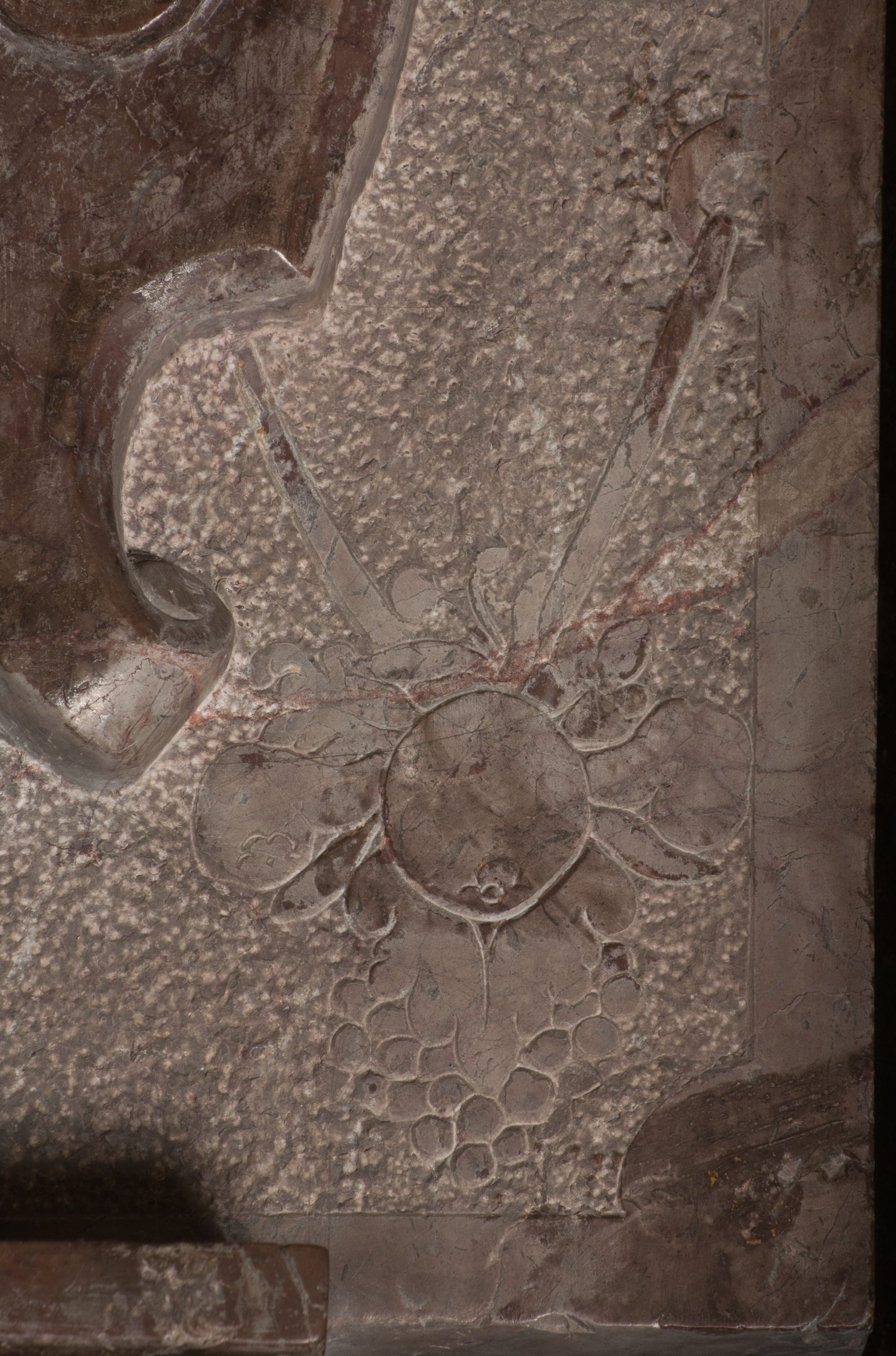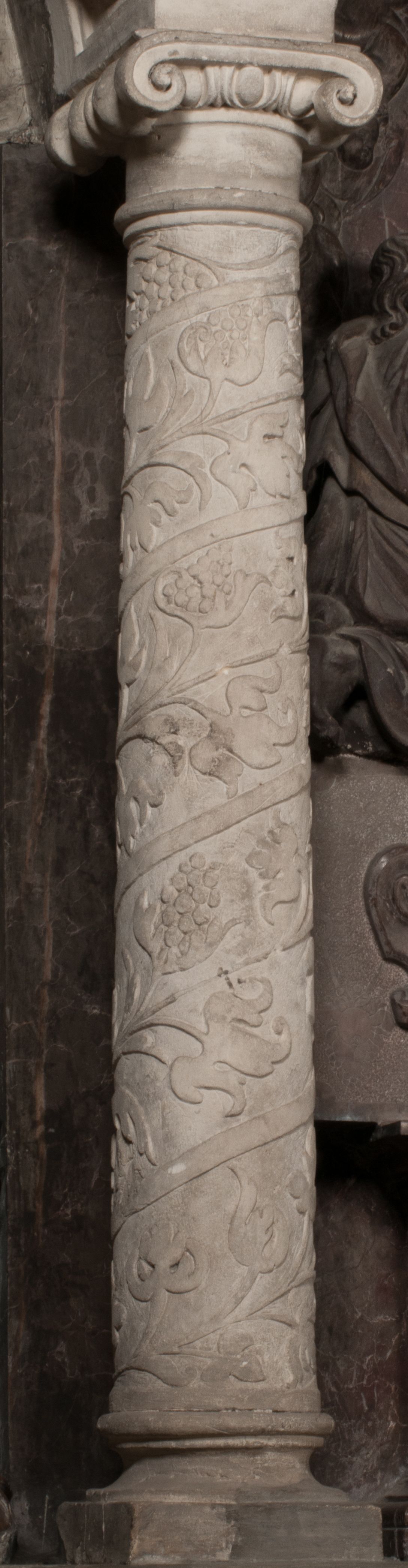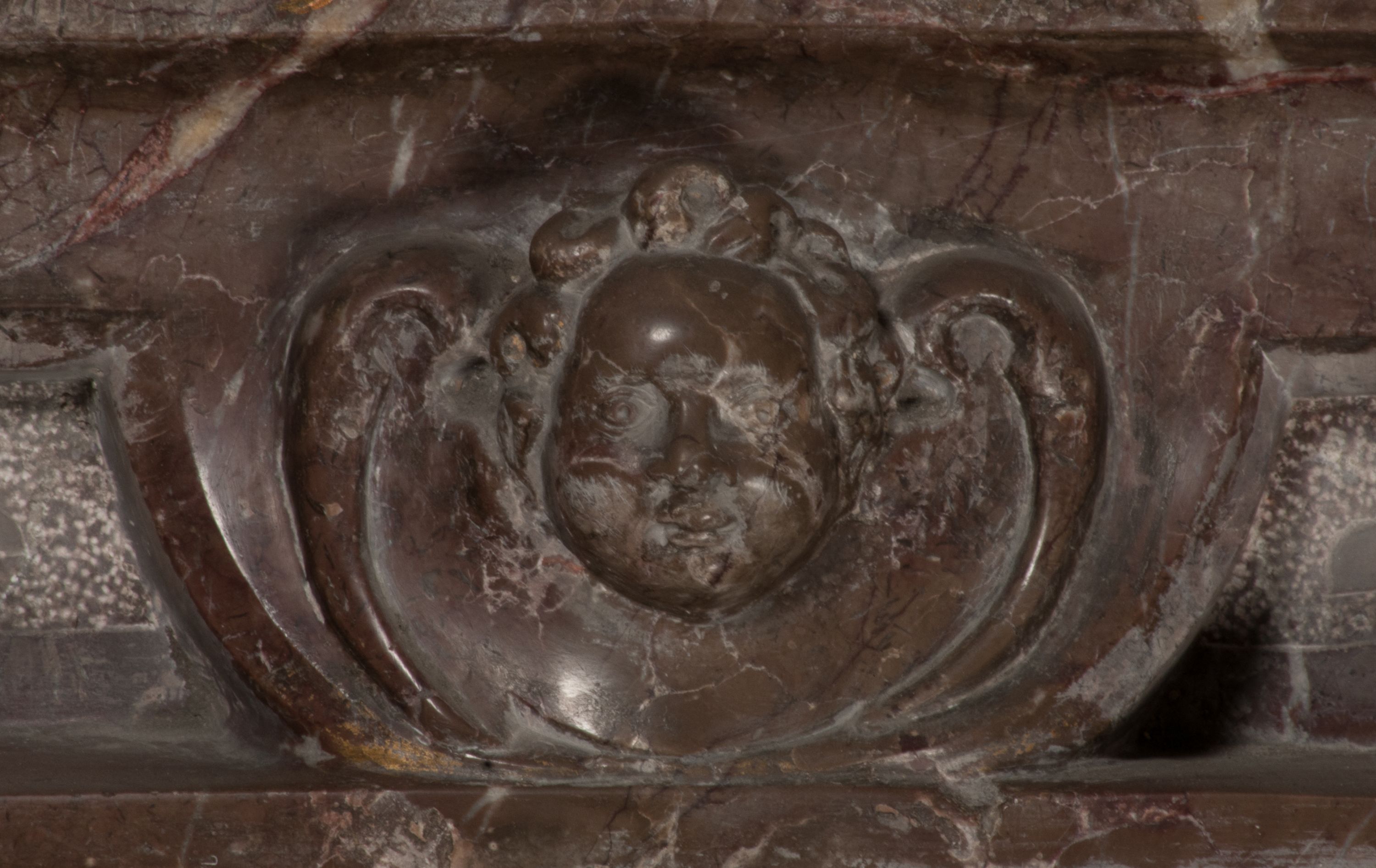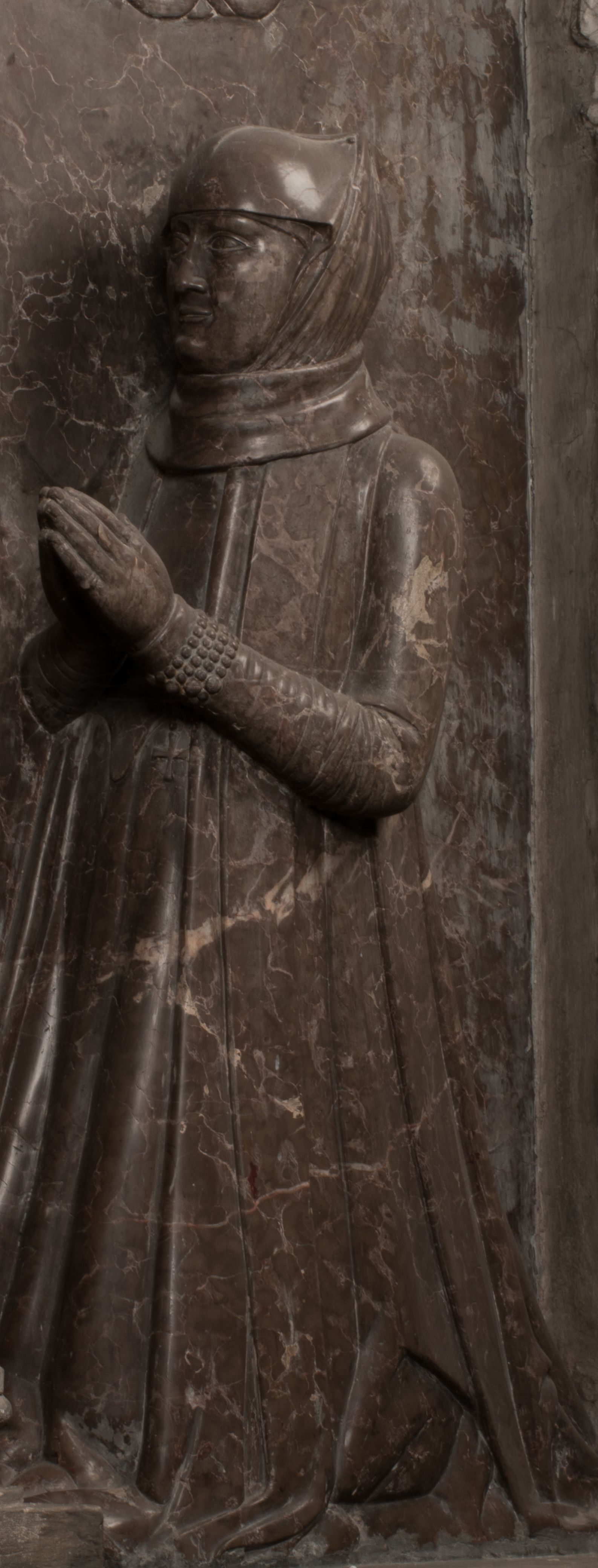 Postacie stoją na podwójnym postumencie. W jego górnej części wyryto sentencję łacińską na prostokątnej tablicy umieszczonej w ozdobnym kartuszu, z zawiniętym spiralnie wycięciem krawędzi górnej i z dodaną w krawędzi dolnej główką uskrzydlonego putta. Napis na postumencie: „PER QVEM ET NOS / RESVRGERE DEVOTA / MENTE, CREDIMVS”. Na płycie poniżej płaskorzeźbione, leżące na prawym boku putto podpierające głowę na prawej ręce, natomiast w lewej trzymające klepsydrę. Nagie ciało, lekko przysłonięte draperią, spoczywa na poduszce z dwoma pomponami. Prawa noga jest wyprostowana, lewa zgięta w kolanie. Twarz pucołowata, z otwartymi oczami, otoczona gęstymi puklami loków. Przed dzieckiem leży czaszka. Nad nim znajduje się grawerowany kartusz z napisem: „HODIE MIHI / CRAS TIBI”.