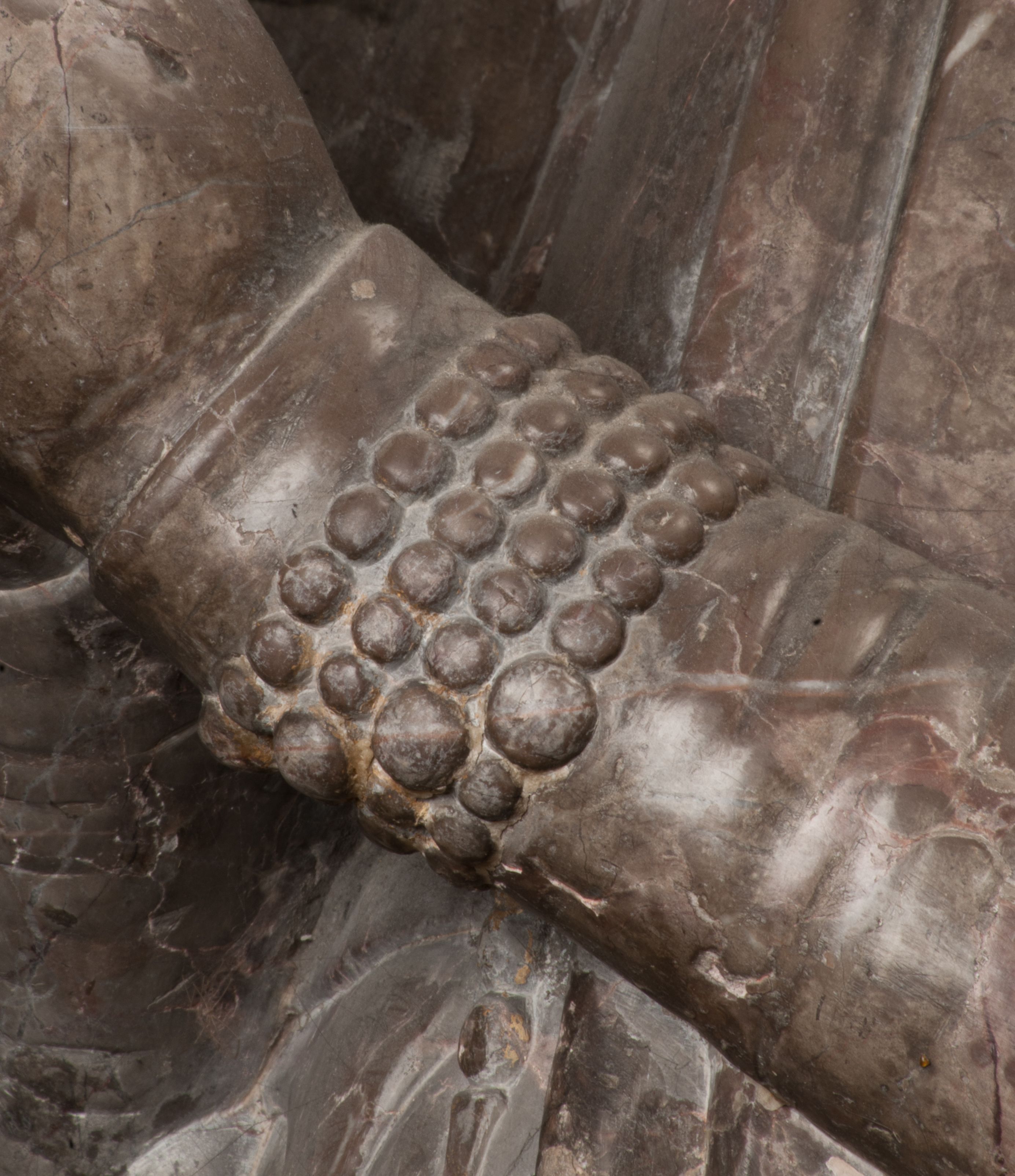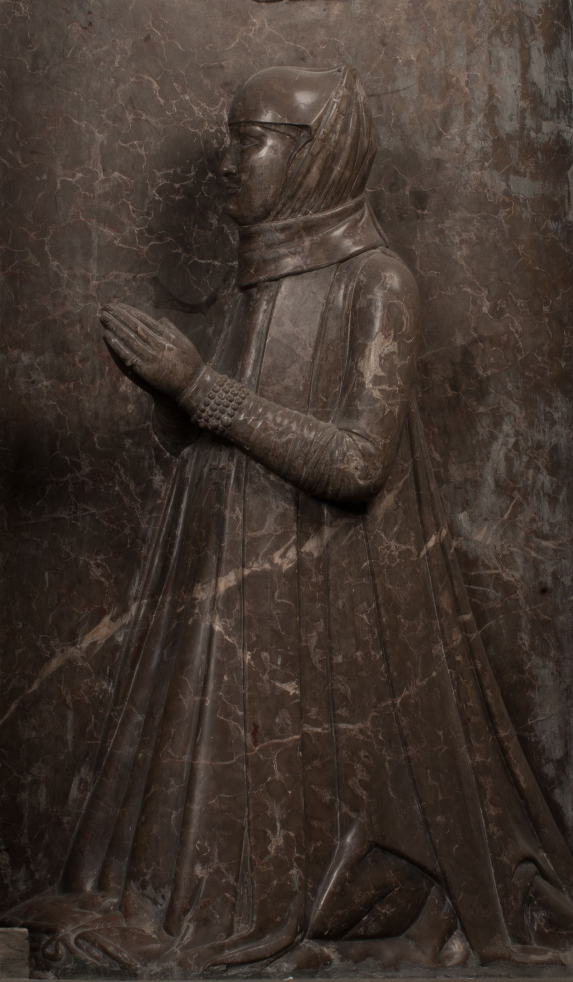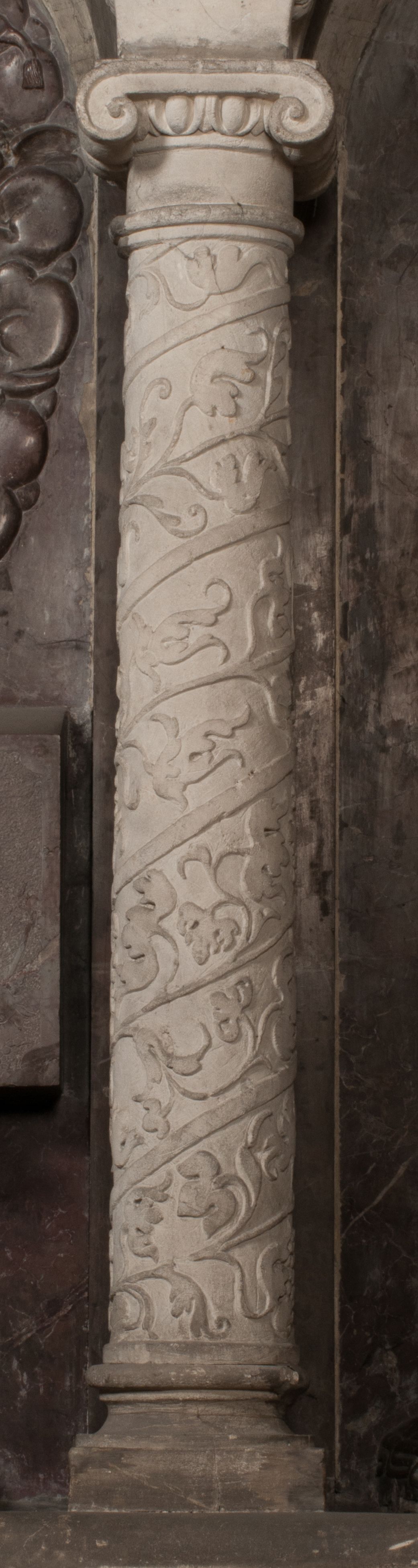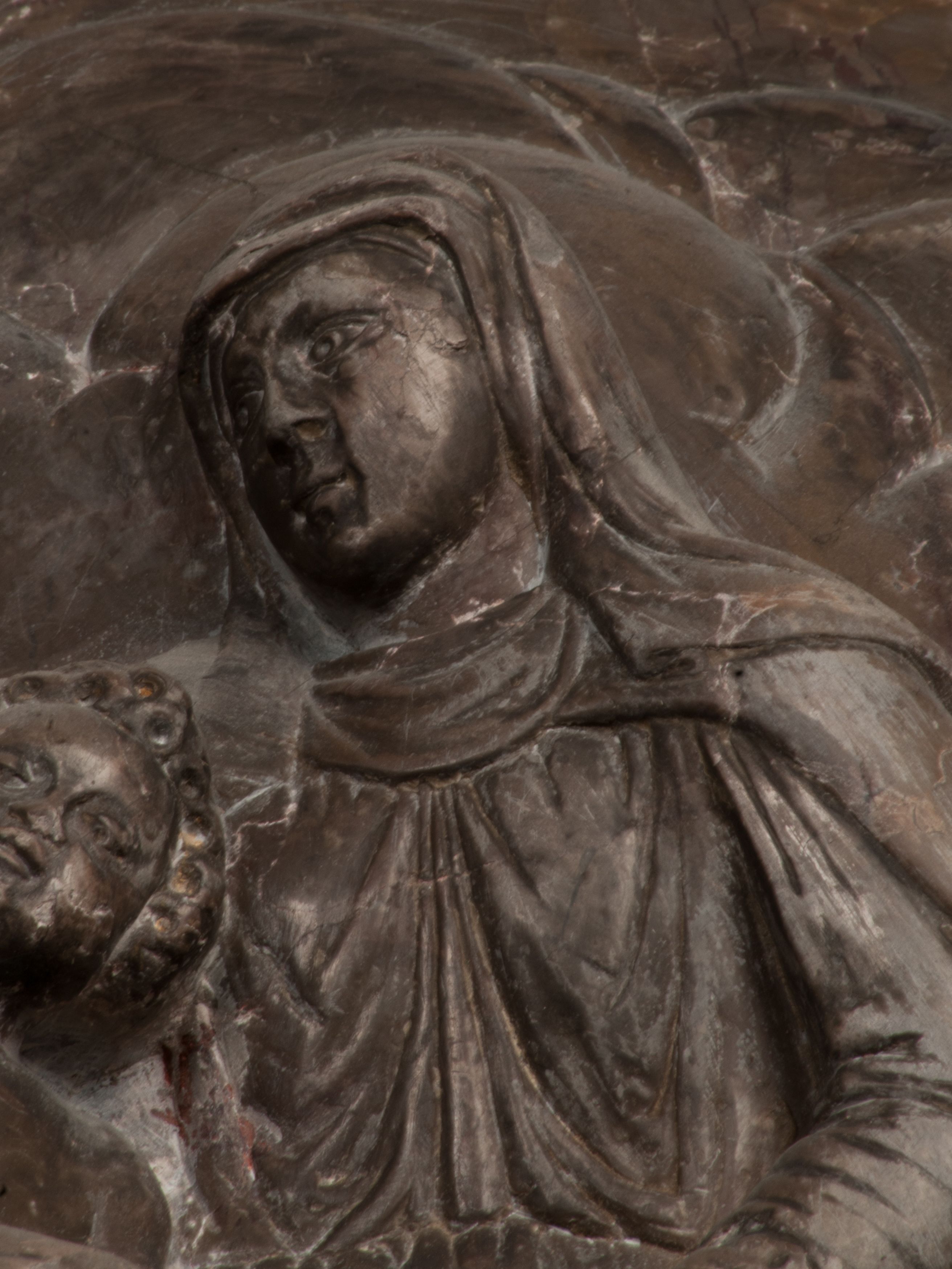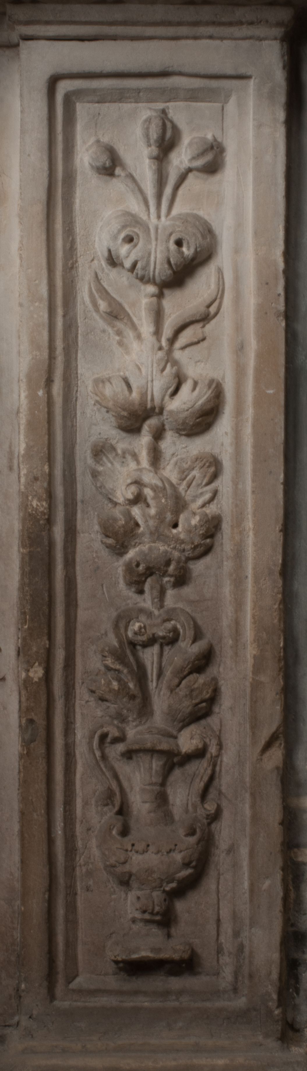 Postacie stoją na podwójnym postumencie. W jego górnej części wyryto sentencję łacińską na prostokątnej tablicy umieszczonej w ozdobnym kartuszu, z zawiniętym spiralnie wycięciem krawędzi górnej i z dodaną w krawędzi dolnej główką uskrzydlonego putta. Napis na postumencie: „PER QVEM ET NOS / RESVRGERE DEVOTA / MENTE, CREDIMVS”. Na płycie poniżej płaskorzeźbione, leżące na prawym boku putto podpierające głowę na prawej ręce, natomiast w lewej trzymające klepsydrę. Nagie ciało, lekko przysłonięte draperią, spoczywa na poduszce z dwoma pomponami. Prawa noga jest wyprostowana, lewa zgięta w kolanie. Twarz pucołowata, z otwartymi oczami, otoczona gęstymi puklami loków. Przed dzieckiem leży czaszka. Nad nim znajduje się grawerowany kartusz z napisem: „HODIE MIHI / CRAS TIBI”.
