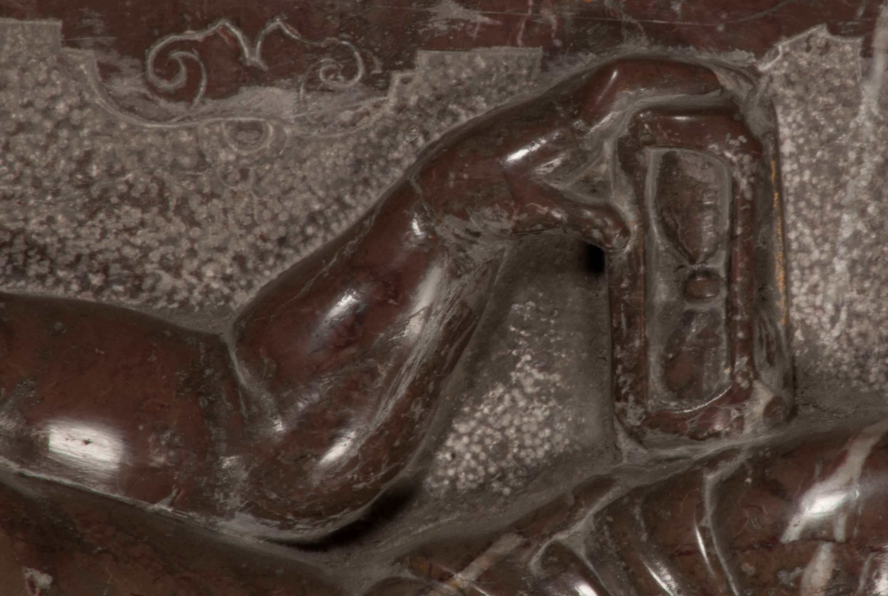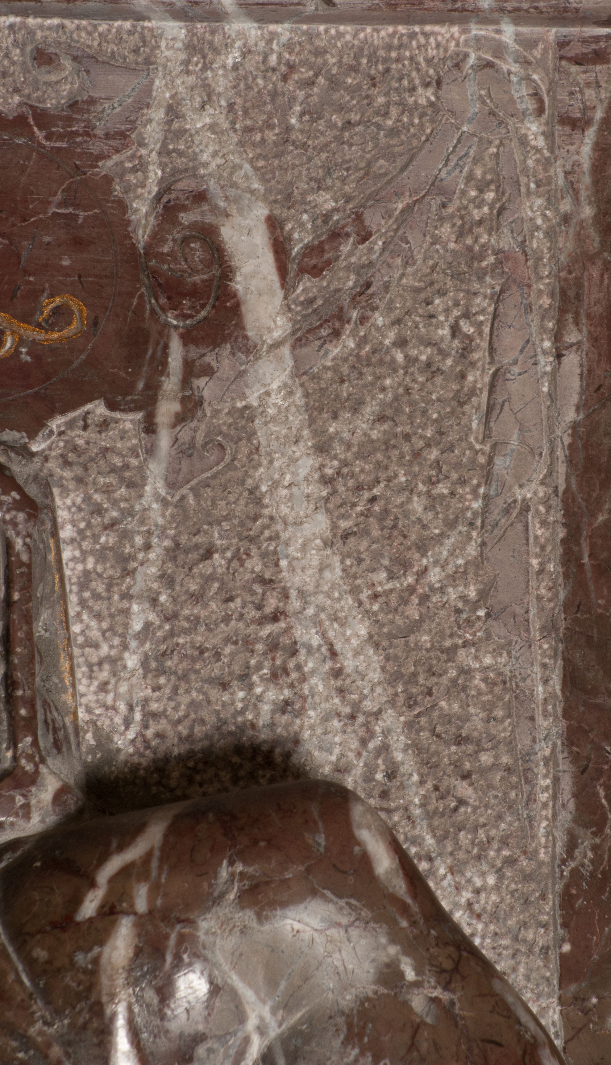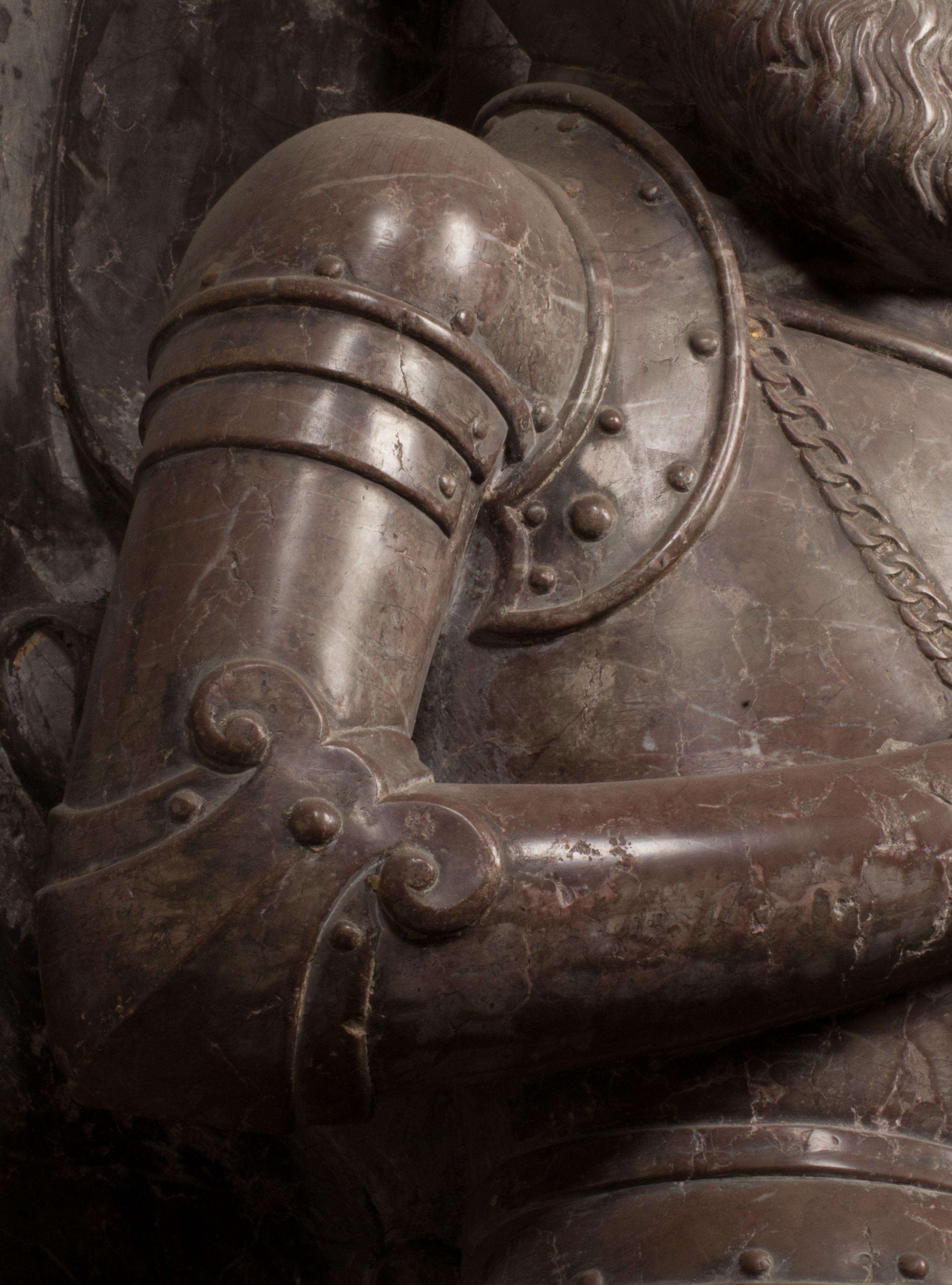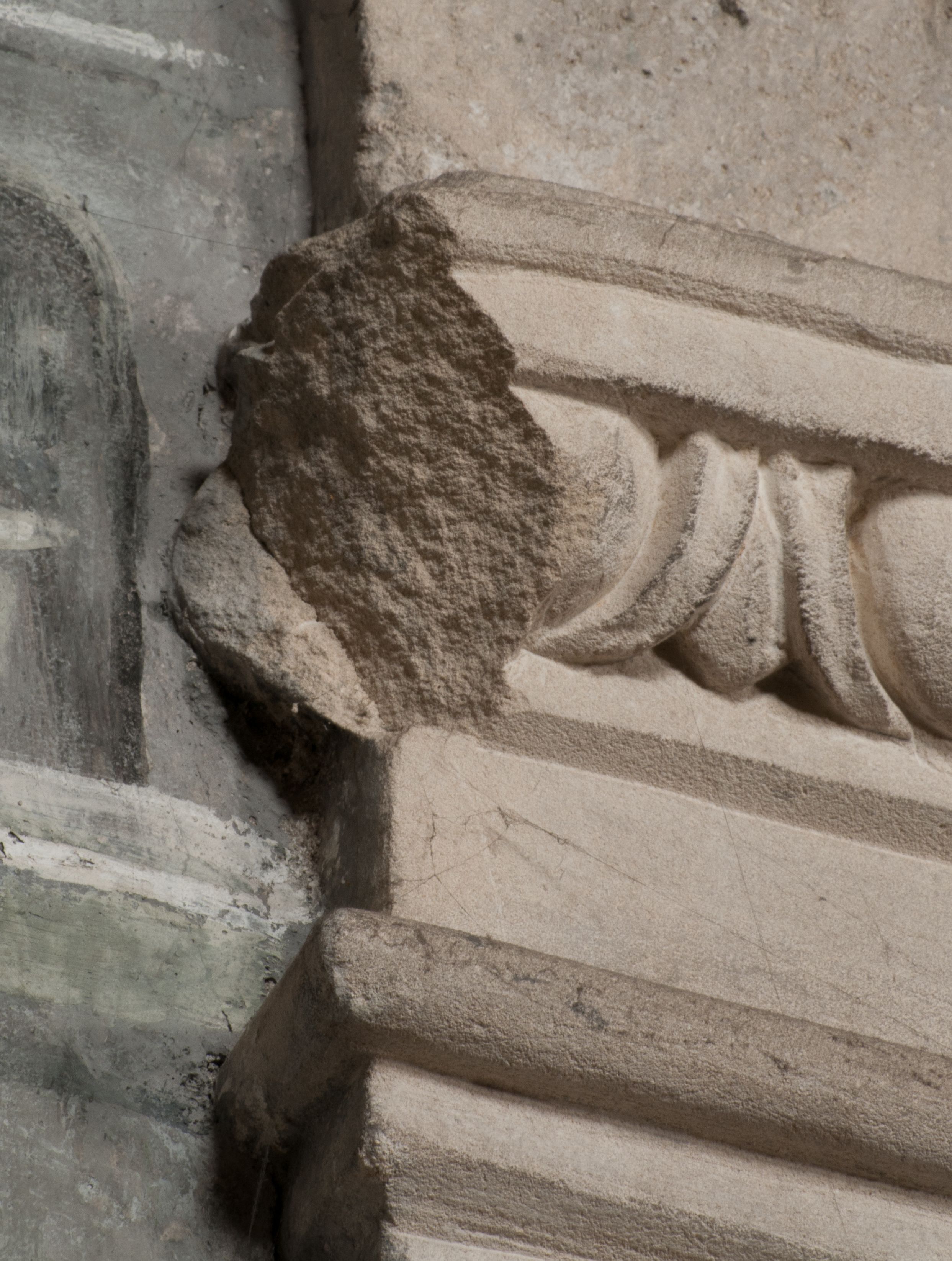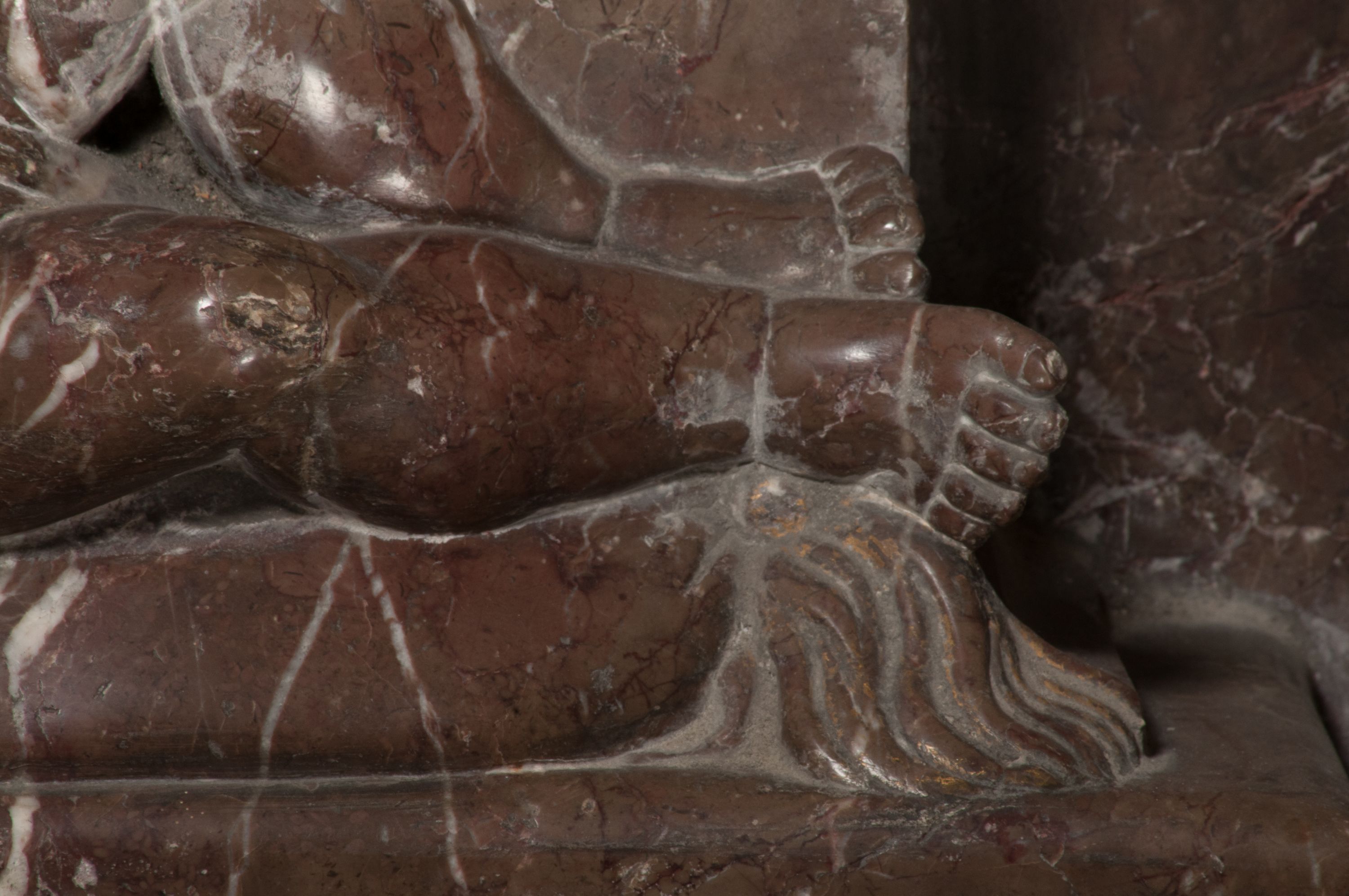 Postacie stoją na podwójnym postumencie. W jego górnej części wyryto sentencję łacińską na prostokątnej tablicy umieszczonej w ozdobnym kartuszu, z zawiniętym spiralnie wycięciem krawędzi górnej i z dodaną w krawędzi dolnej główką uskrzydlonego putta. Napis na postumencie: „PER QVEM ET NOS / RESVRGERE DEVOTA / MENTE, CREDIMVS”. Na płycie poniżej płaskorzeźbione, leżące na prawym boku putto podpierające głowę na prawej ręce, natomiast w lewej trzymające klepsydrę. Nagie ciało, lekko przysłonięte draperią, spoczywa na poduszce z dwoma pomponami. Prawa noga jest wyprostowana, lewa zgięta w kolanie. Twarz pucołowata, z otwartymi oczami, otoczona gęstymi puklami loków. Przed dzieckiem leży czaszka. Nad nim znajduje się grawerowany kartusz z napisem: „HODIE MIHI / CRAS TIBI”.