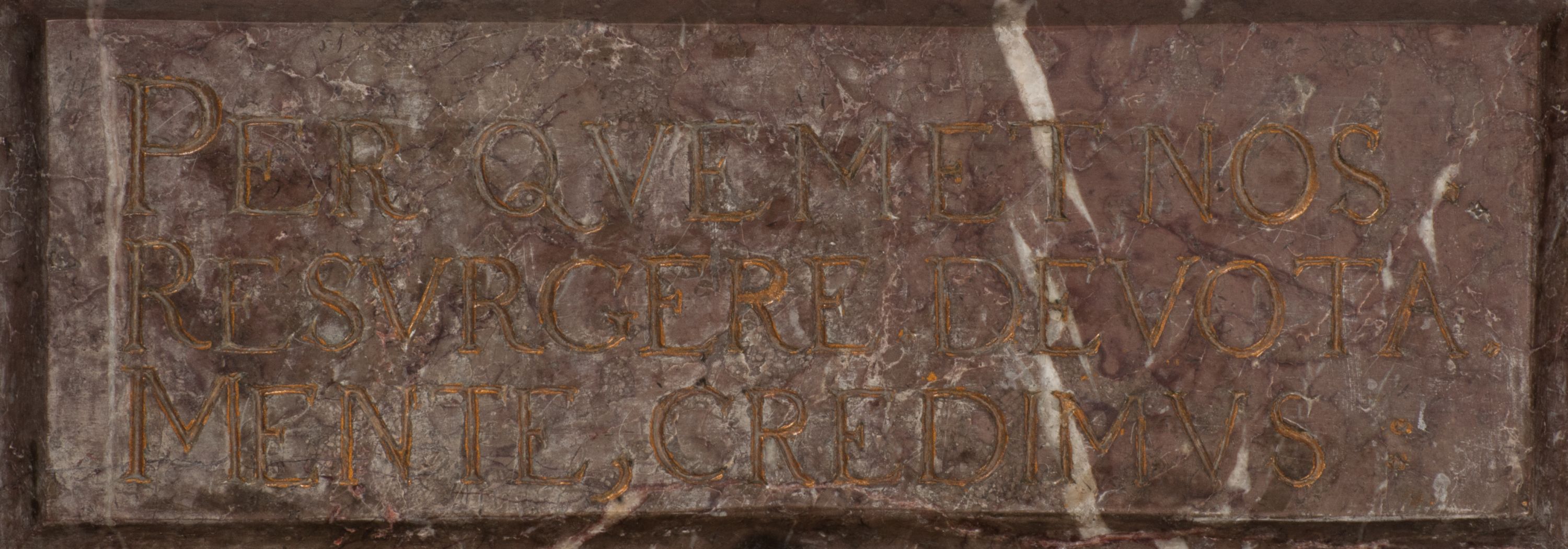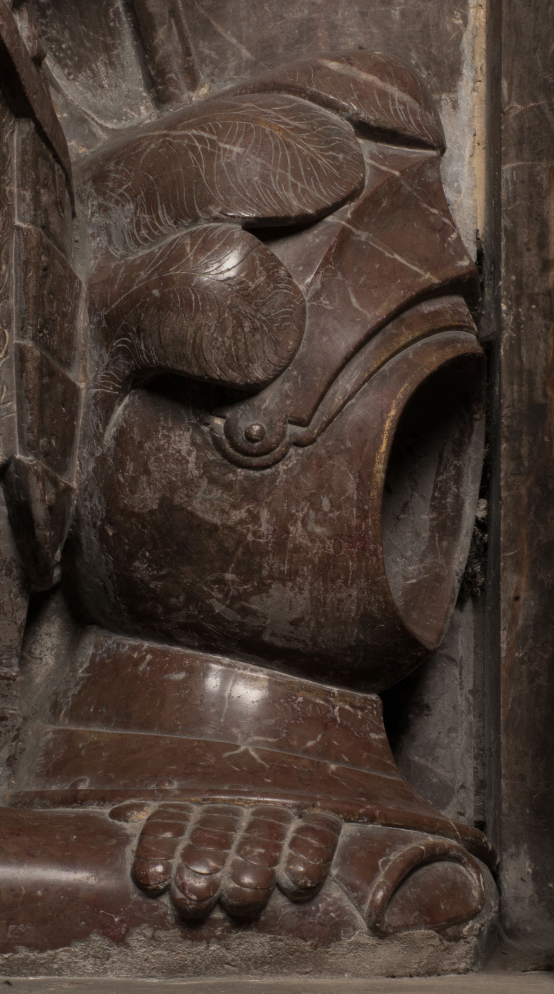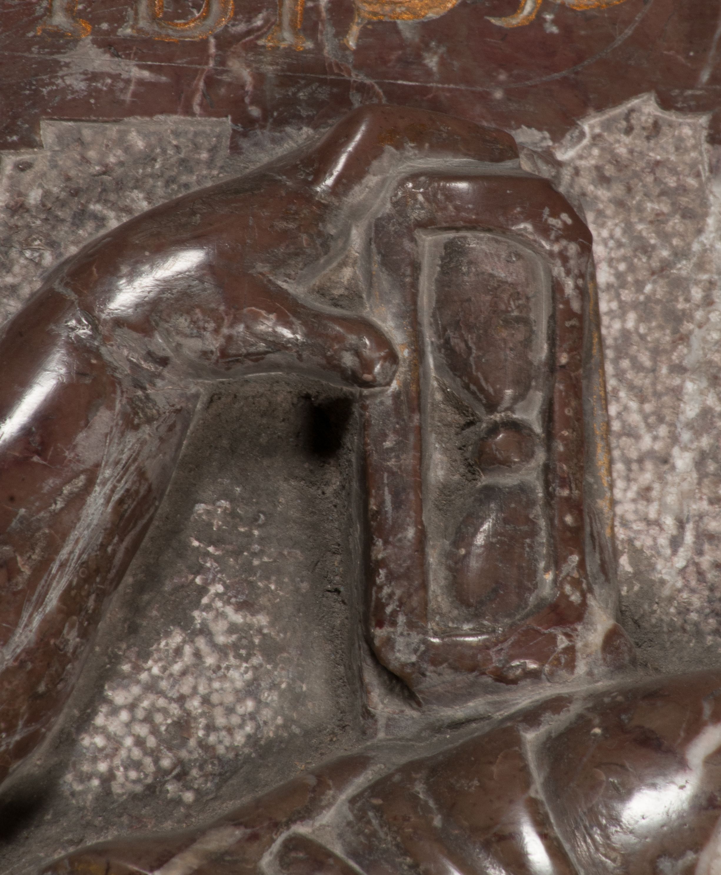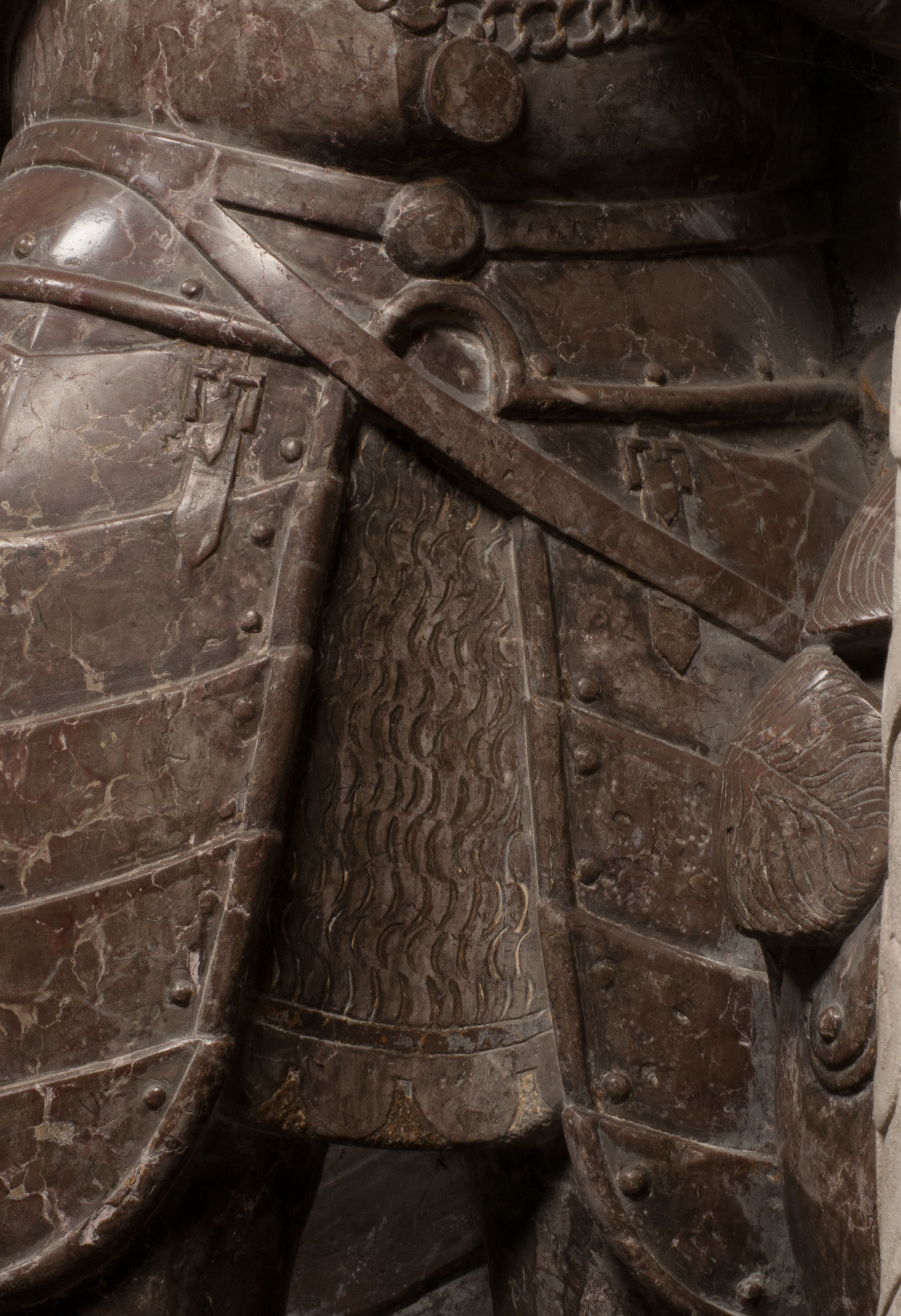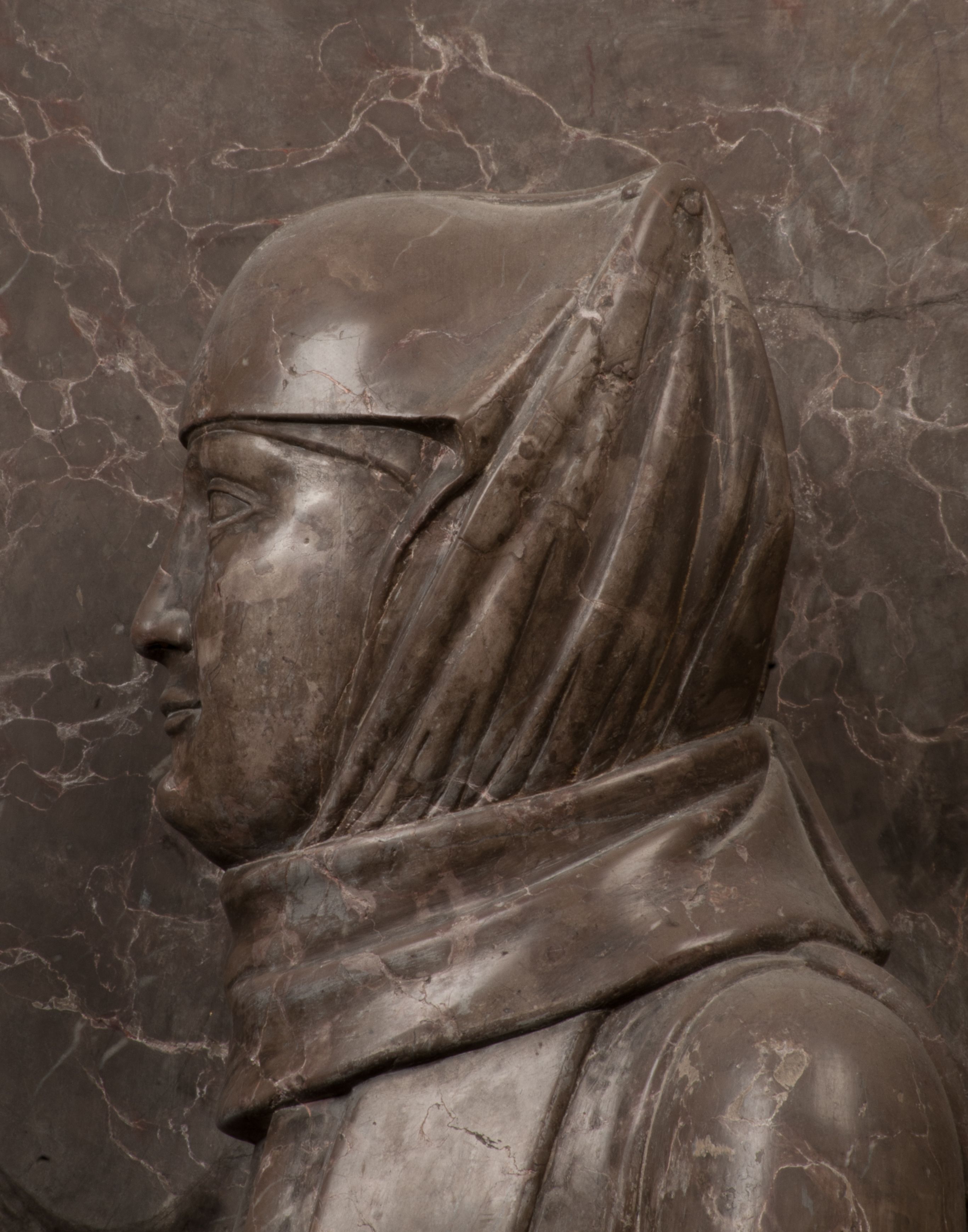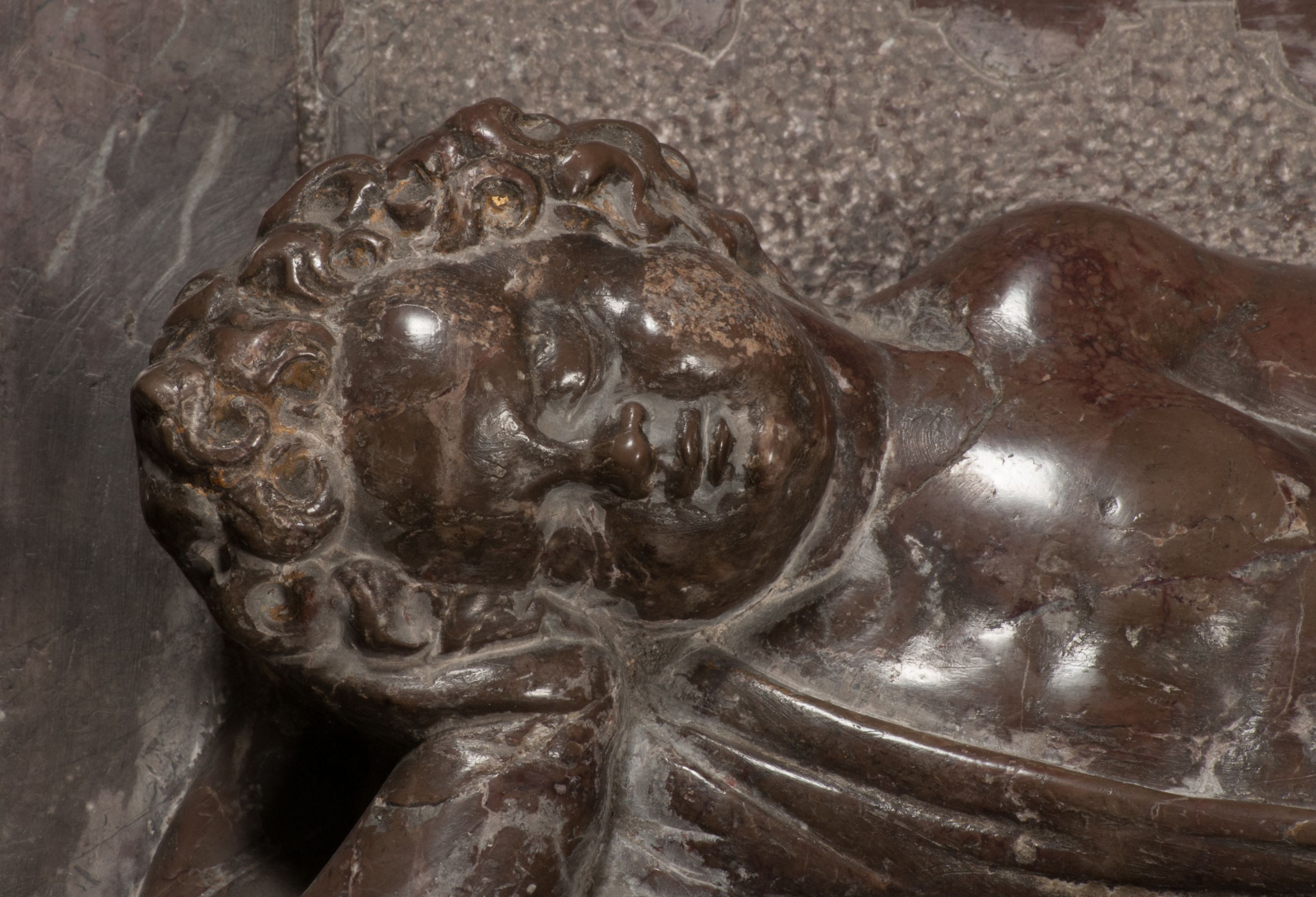 Postacie stoją na podwójnym postumencie. W jego górnej części wyryto sentencję łacińską na prostokątnej tablicy umieszczonej w ozdobnym kartuszu, z zawiniętym spiralnie wycięciem krawędzi górnej i z dodaną w krawędzi dolnej główką uskrzydlonego putta. Napis na postumencie: „PER QVEM ET NOS / RESVRGERE DEVOTA / MENTE, CREDIMVS”. Na płycie poniżej płaskorzeźbione, leżące na prawym boku putto podpierające głowę na prawej ręce, natomiast w lewej trzymające klepsydrę. Nagie ciało, lekko przysłonięte draperią, spoczywa na poduszce z dwoma pomponami. Prawa noga jest wyprostowana, lewa zgięta w kolanie. Twarz pucołowata, z otwartymi oczami, otoczona gęstymi puklami loków. Przed dzieckiem leży czaszka. Nad nim znajduje się grawerowany kartusz z napisem: „HODIE MIHI / CRAS TIBI”.