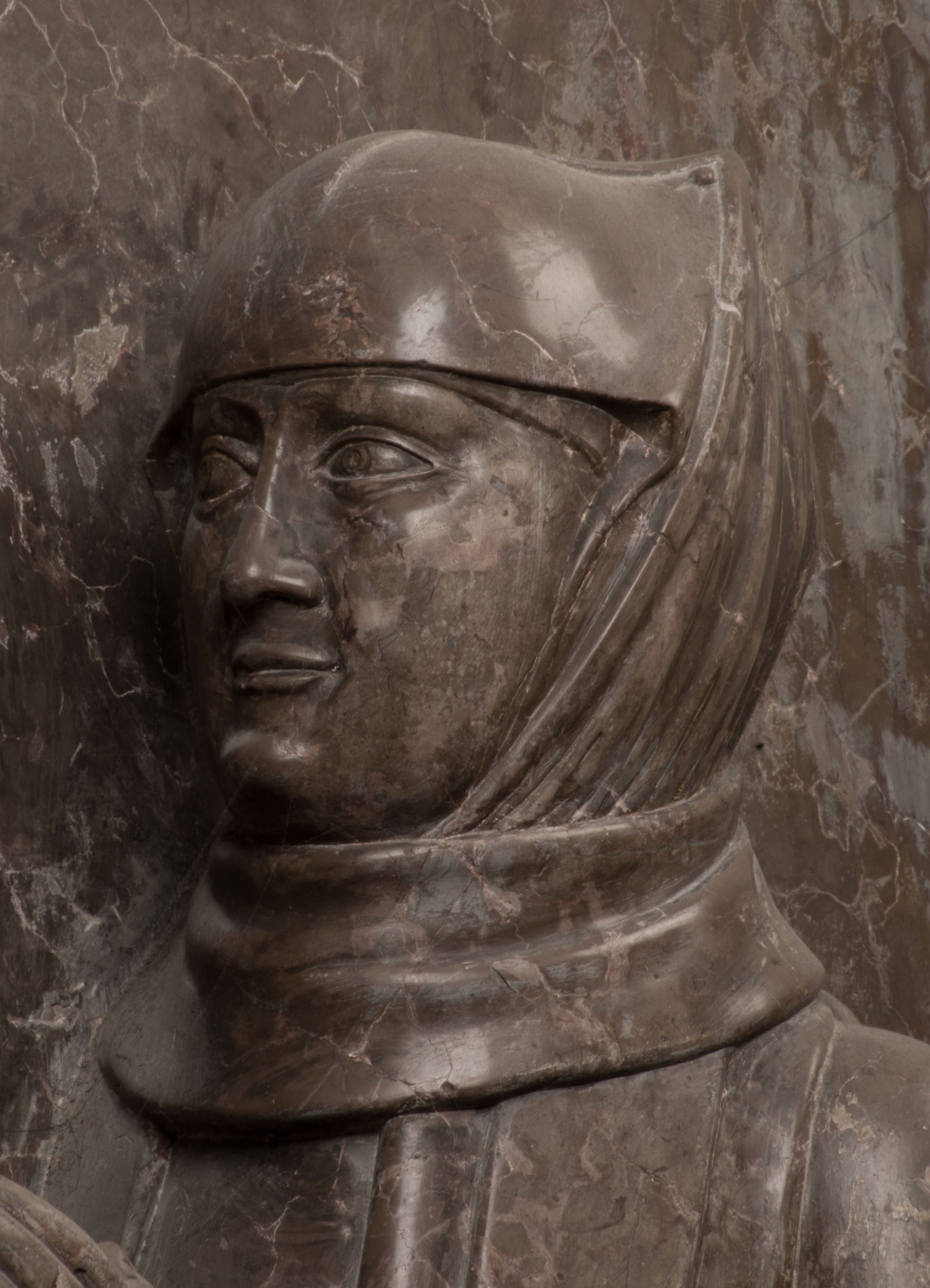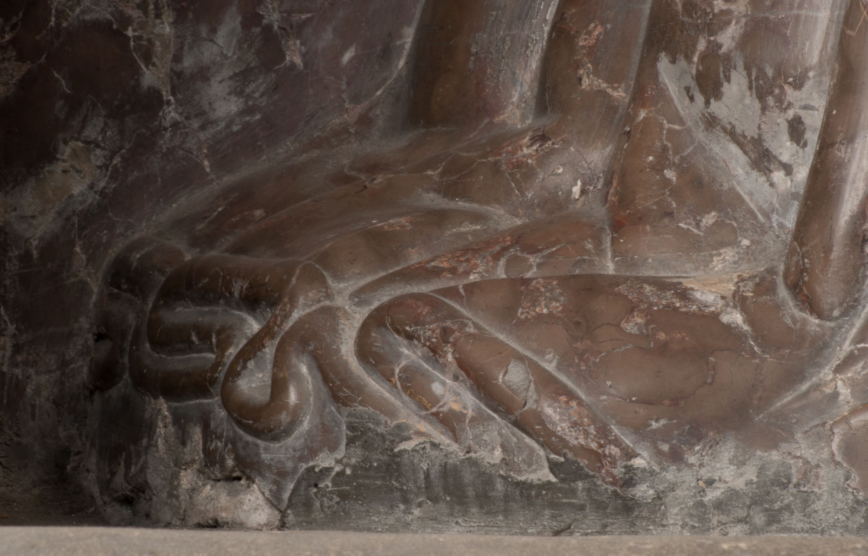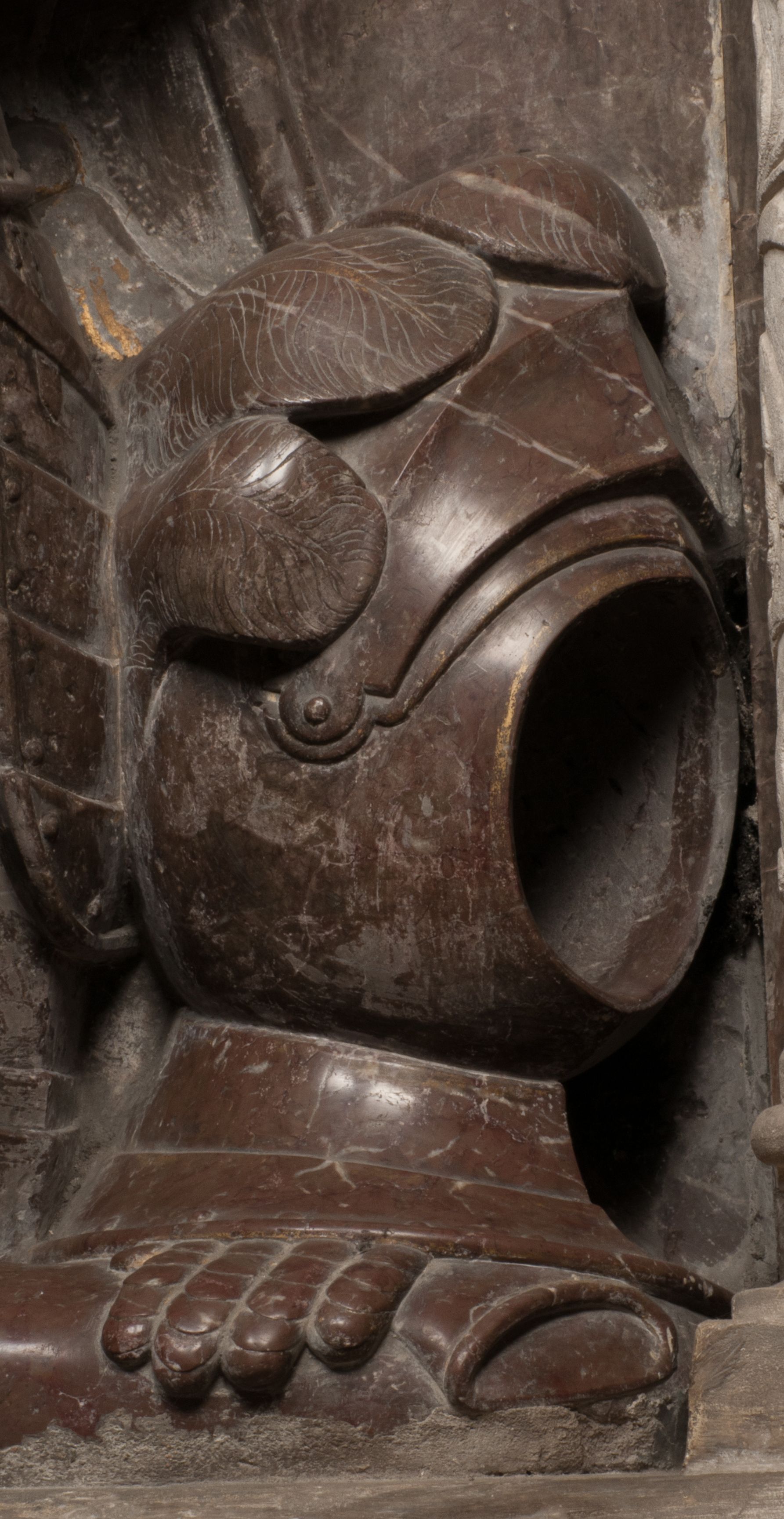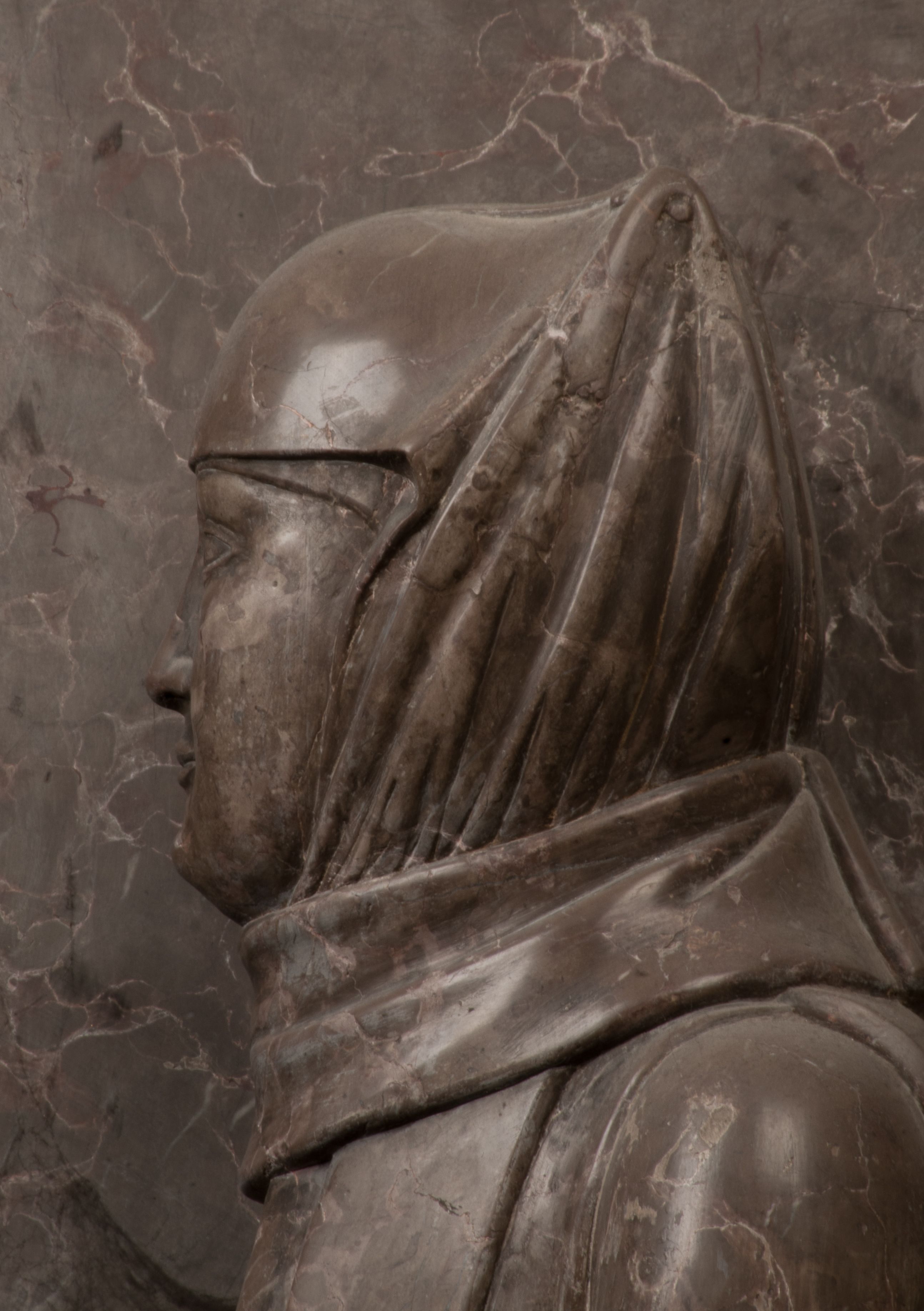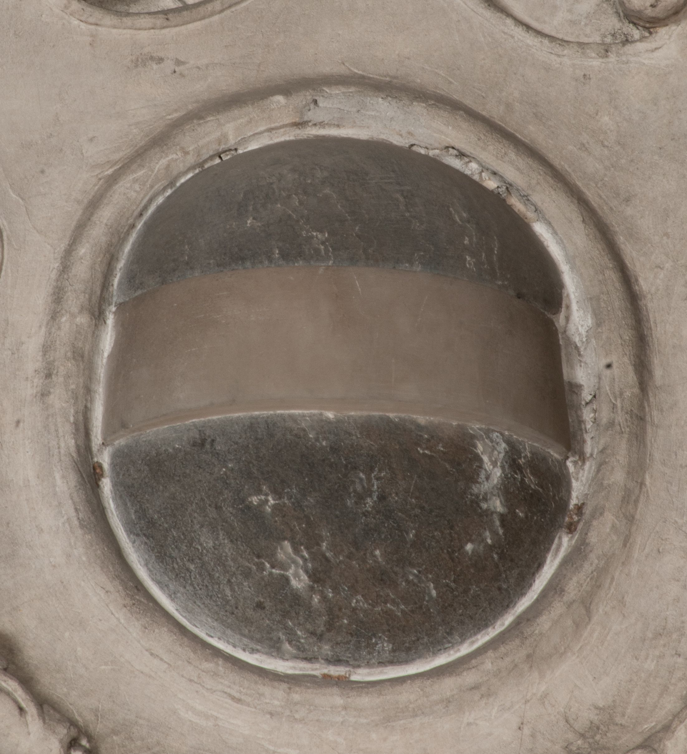 Postacie stoją na podwójnym postumencie. W jego górnej części wyryto sentencję łacińską na prostokątnej tablicy umieszczonej w ozdobnym kartuszu, z zawiniętym spiralnie wycięciem krawędzi górnej i z dodaną w krawędzi dolnej główką uskrzydlonego putta. Napis na postumencie: „PER QVEM ET NOS / RESVRGERE DEVOTA / MENTE, CREDIMVS”. Na płycie poniżej płaskorzeźbione, leżące na prawym boku putto podpierające głowę na prawej ręce, natomiast w lewej trzymające klepsydrę. Nagie ciało, lekko przysłonięte draperią, spoczywa na poduszce z dwoma pomponami. Prawa noga jest wyprostowana, lewa zgięta w kolanie. Twarz pucołowata, z otwartymi oczami, otoczona gęstymi puklami loków. Przed dzieckiem leży czaszka. Nad nim znajduje się grawerowany kartusz z napisem: „HODIE MIHI / CRAS TIBI”.