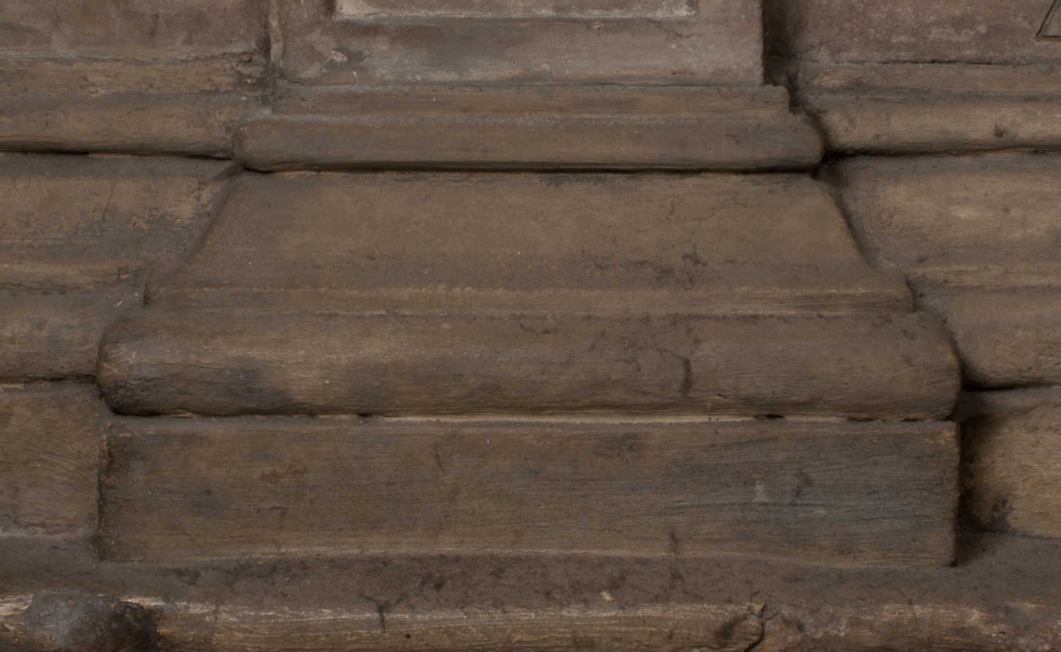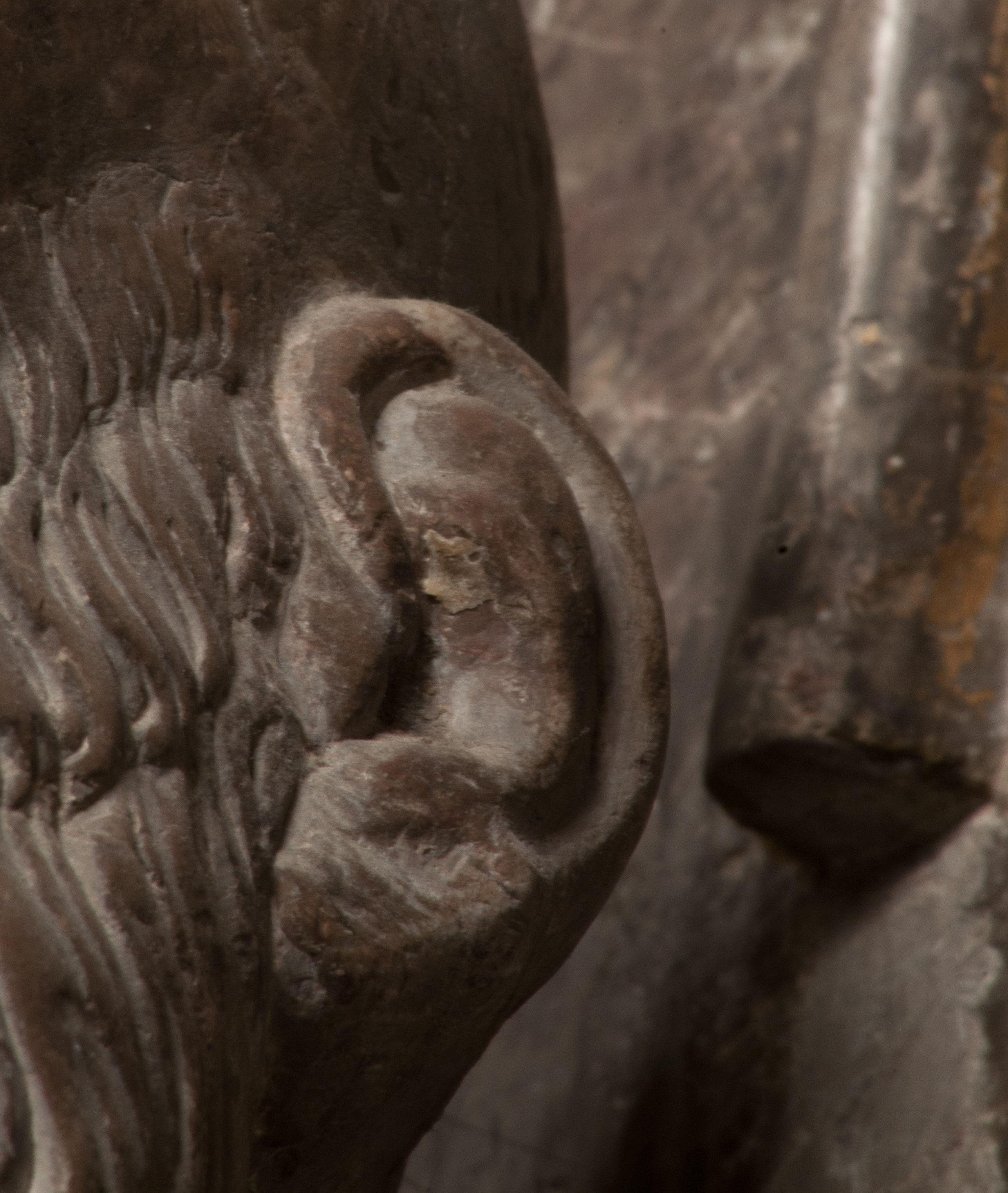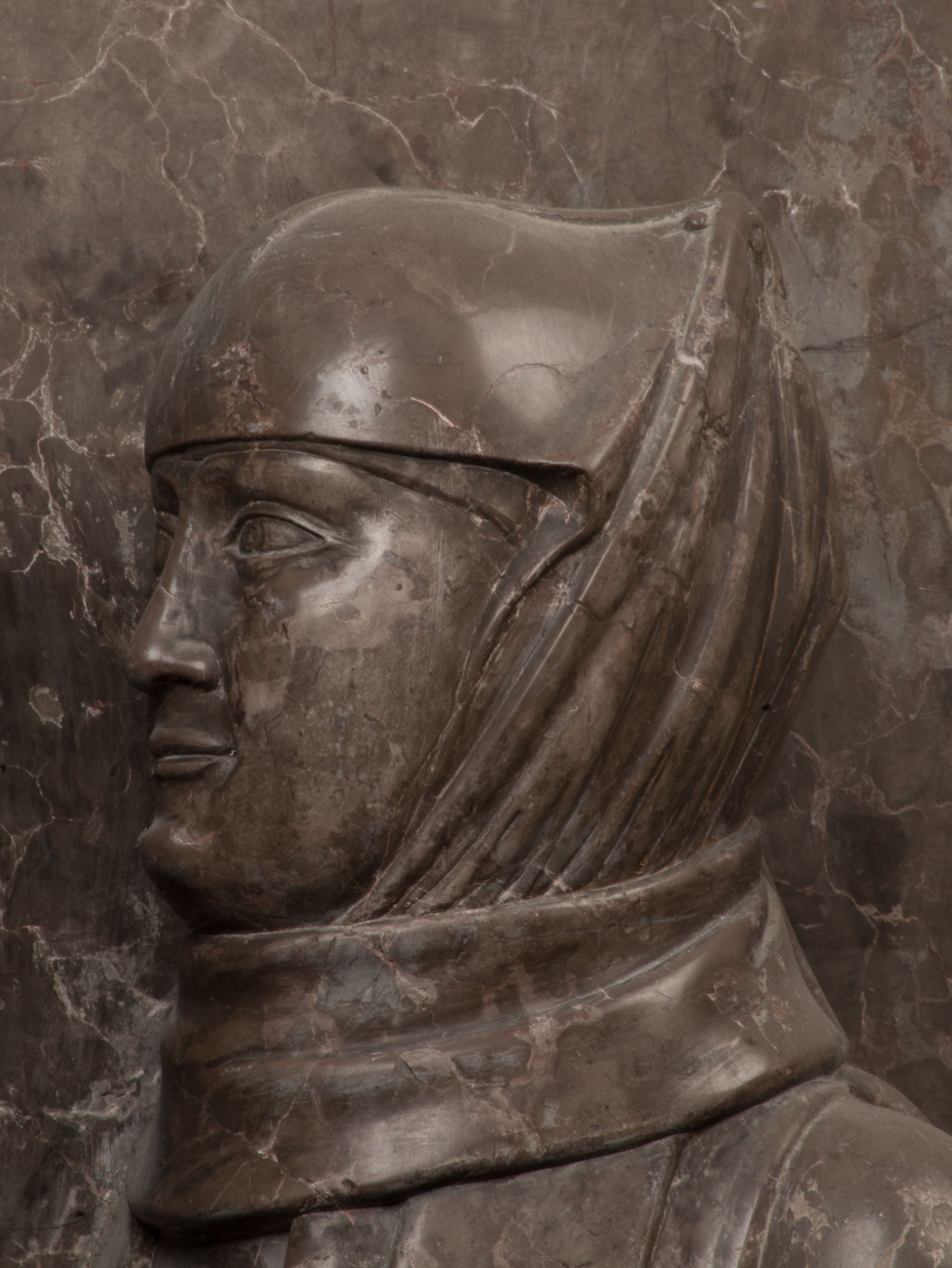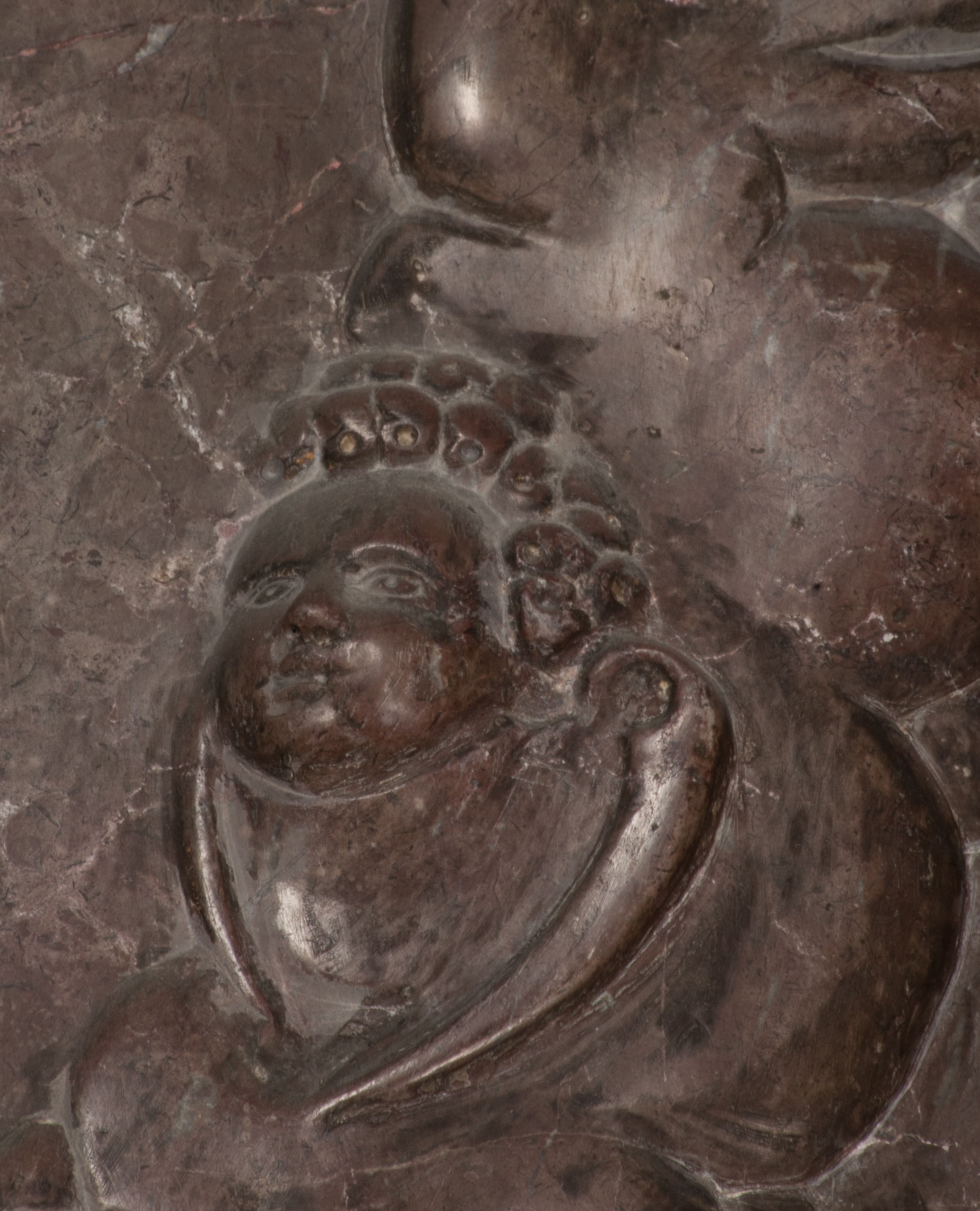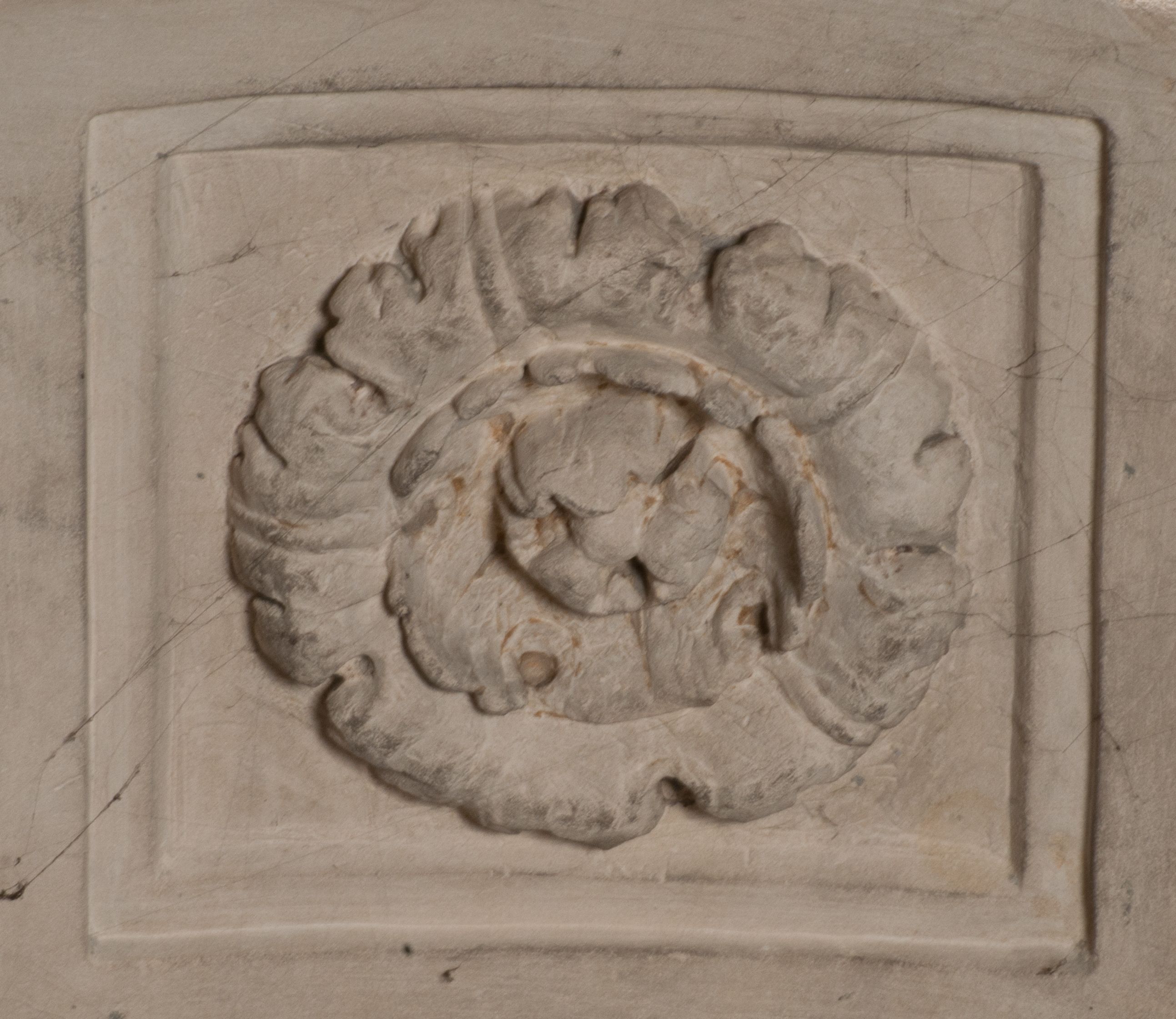Postacie stoją na podwójnym postumencie. W jego górnej części wyryto sentencję łacińską na prostokątnej tablicy umieszczonej w ozdobnym kartuszu, z zawiniętym spiralnie wycięciem krawędzi górnej i z dodaną w krawędzi dolnej główką uskrzydlonego putta. Napis na postumencie: „PER QVEM ET NOS / RESVRGERE DEVOTA / MENTE, CREDIMVS”. Na płycie poniżej płaskorzeźbione, leżące na prawym boku putto podpierające głowę na prawej ręce, natomiast w lewej trzymające klepsydrę. Nagie ciało, lekko przysłonięte draperią, spoczywa na poduszce z dwoma pomponami. Prawa noga jest wyprostowana, lewa zgięta w kolanie. Twarz pucołowata, z otwartymi oczami, otoczona gęstymi puklami loków. Przed dzieckiem leży czaszka. Nad nim znajduje się grawerowany kartusz z napisem: „HODIE MIHI / CRAS TIBI”.