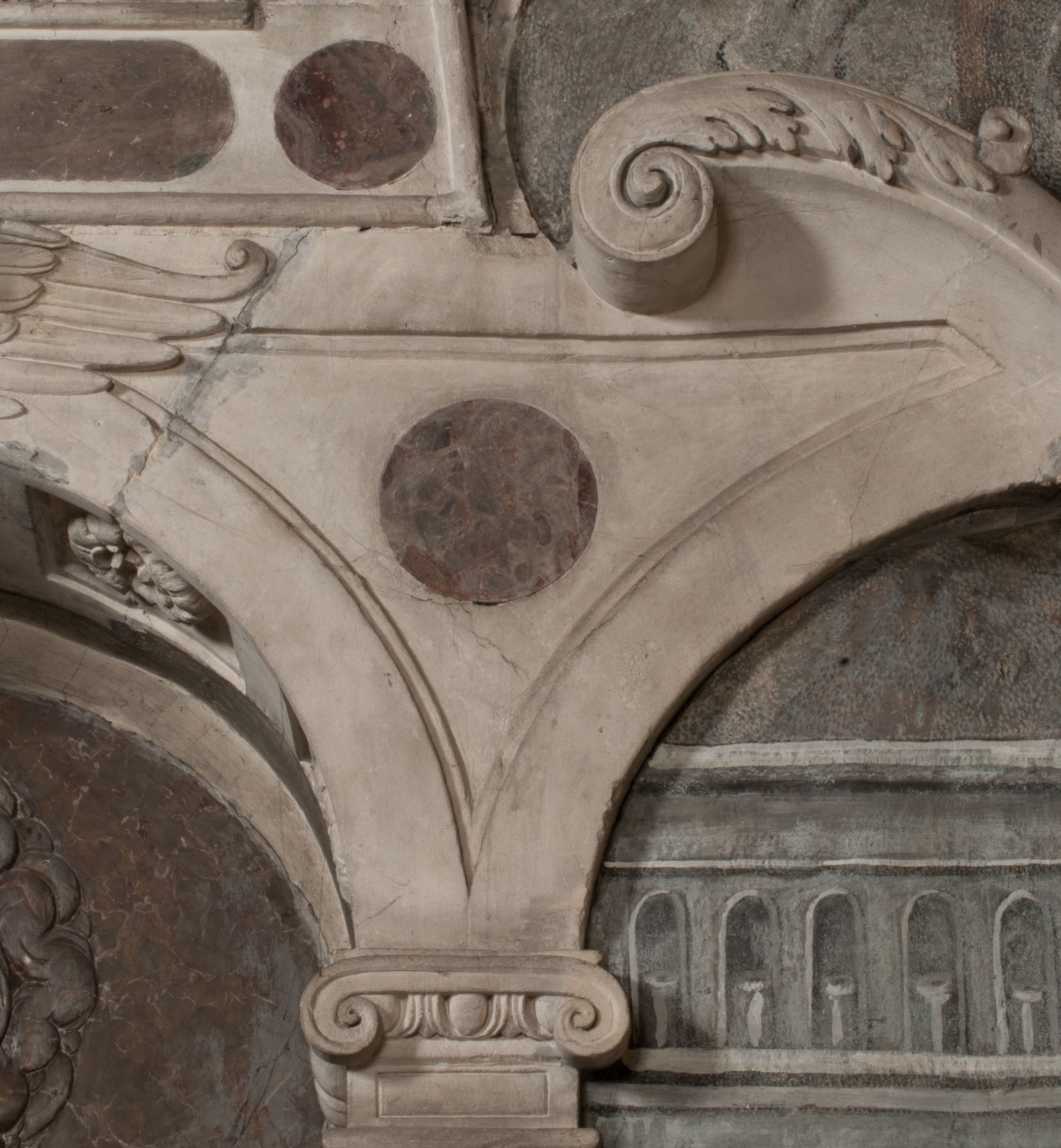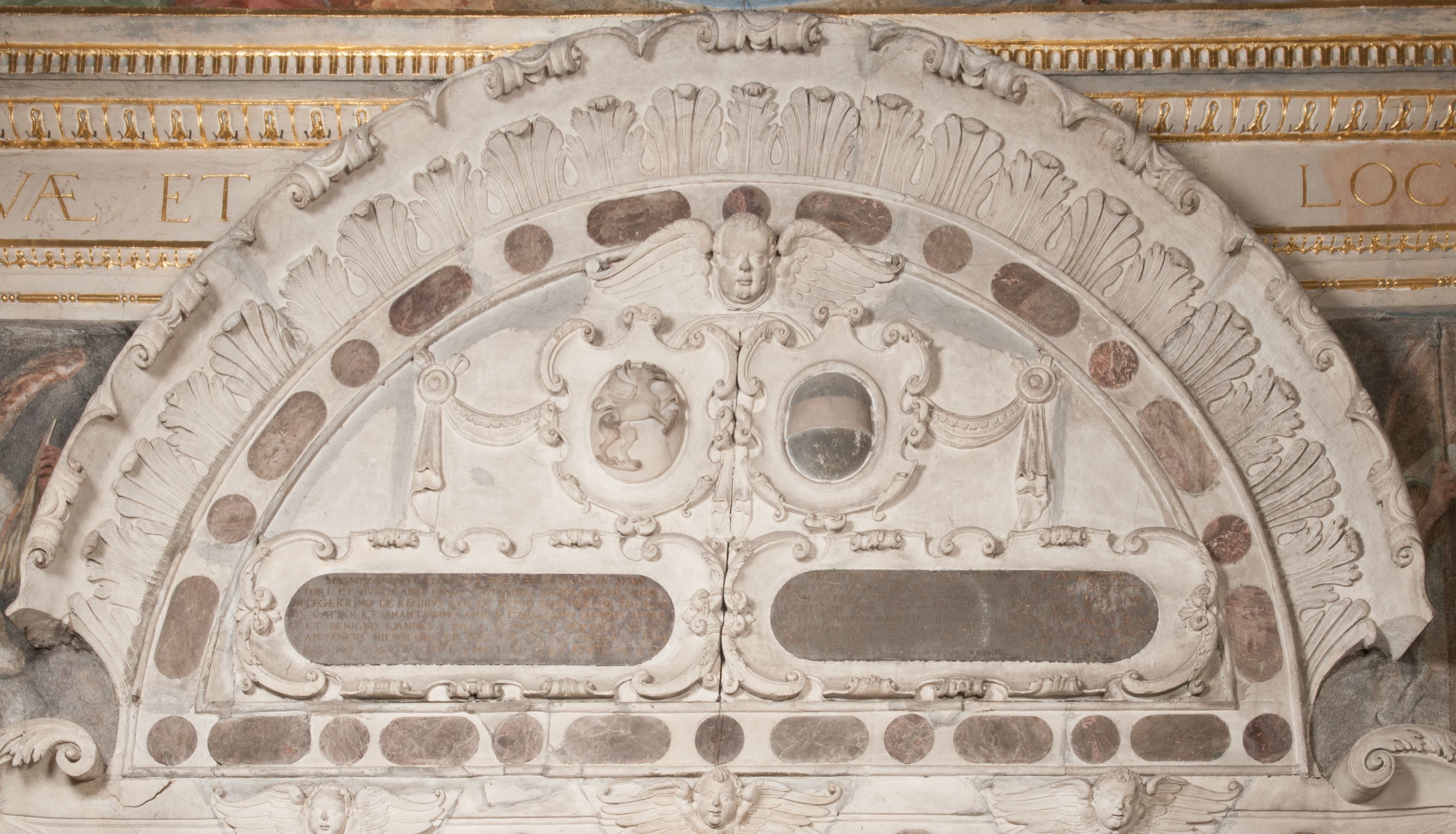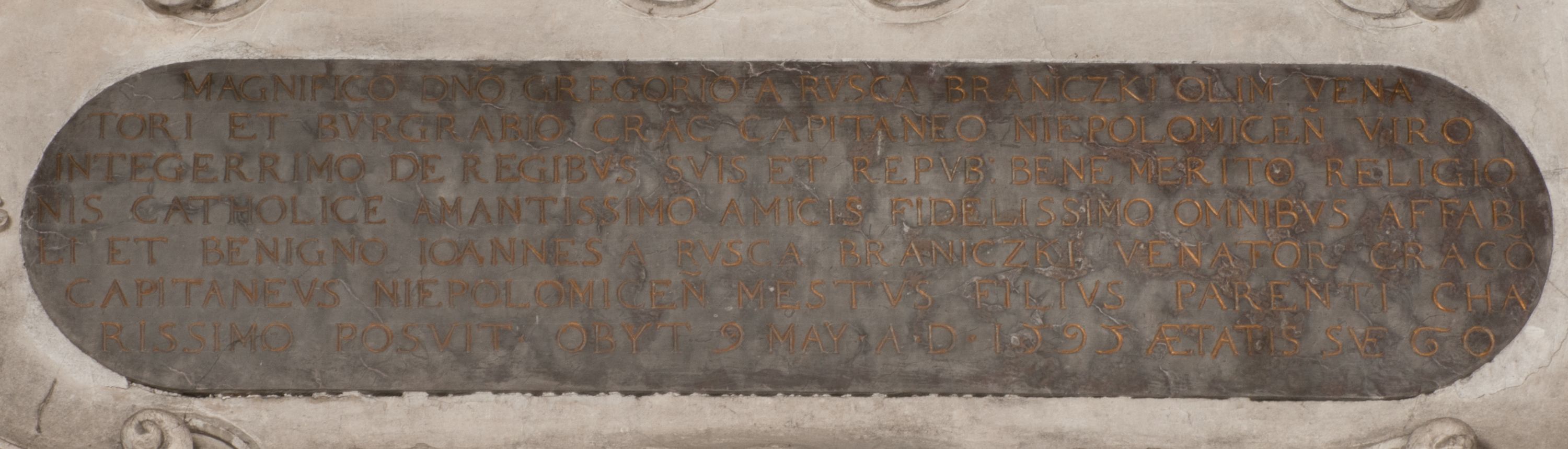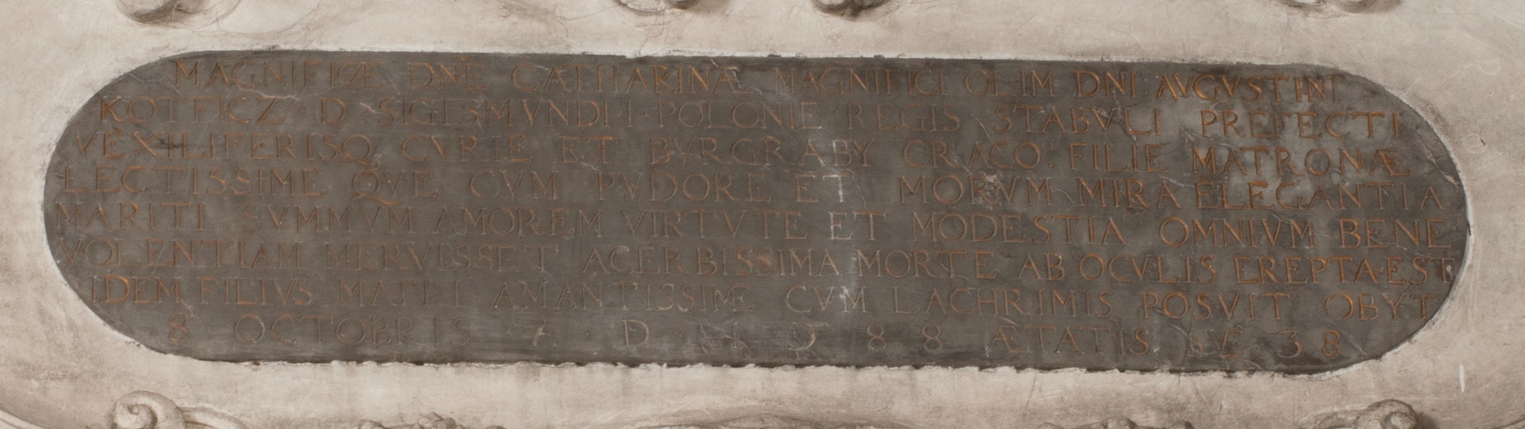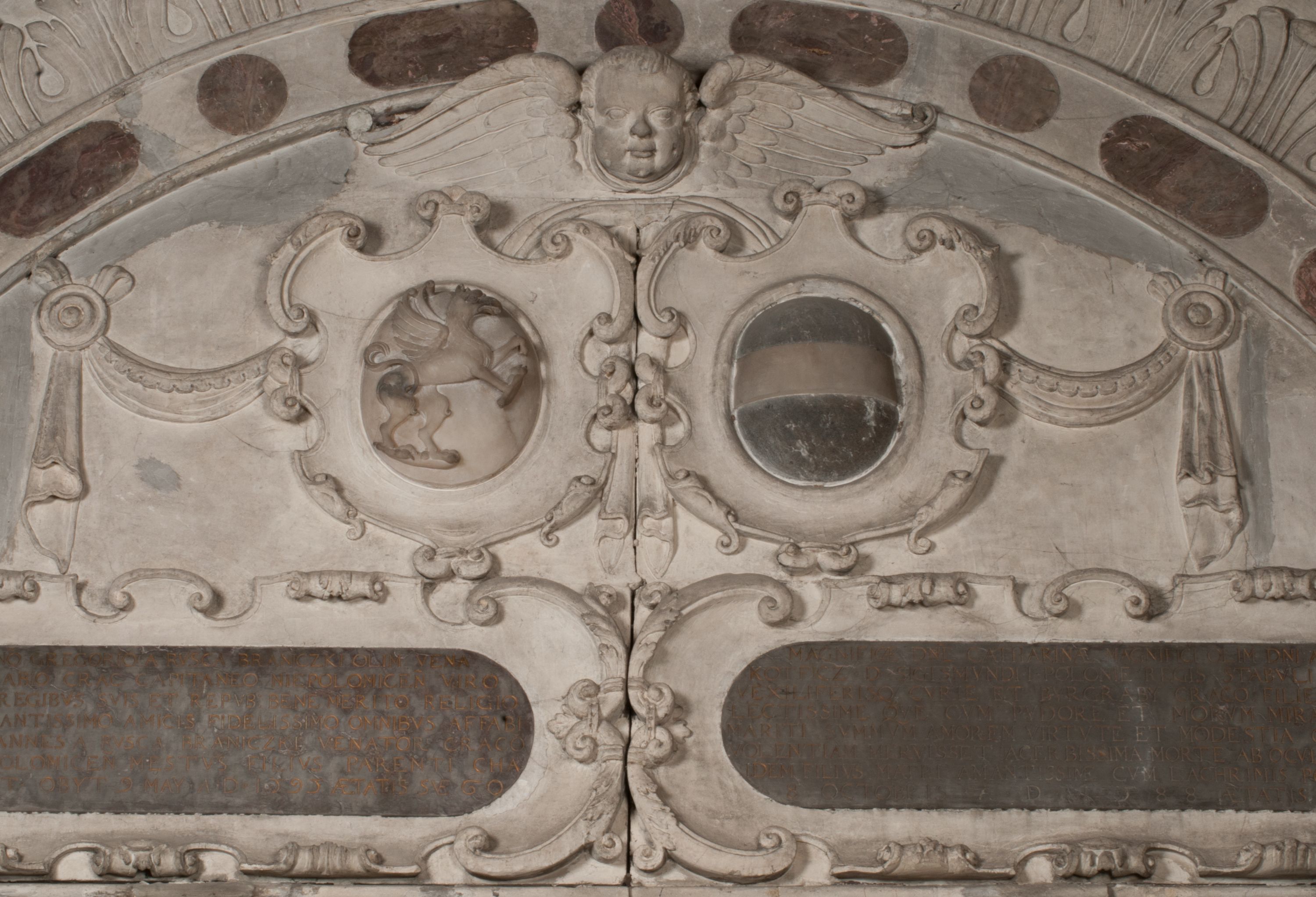Zwieńczenie nagrobka o brzegach inkrustowanych marmurowymi kołami i elipsami, ujęte ornamentalnymi uszami, jest zakończone pasem z zawijającymi się do środkami kartuszami i równolegle ułożonymi liśćmi akantu. Tympanon wypełnia dekoracja złożona z czterech kartuszy: dwóch owalnych na tle paludamentu, zwieńczonych uskrzydloną główką anioła z godłami herbów Gryf i Kotwicz i dwóch podłużnych z inskrypcjami. Na tablicy po lewej stronie inskrypcja: „MAGNIFICO D(OMI)NO GREGORIO A RUSCA BRANICZKI OLIM VENA/TORI ET BURGRABIO CRAC(OVIENSI) CAPITANEO NIEPOŁOMIECEN(SI) VIRO / INTEGERRIMO DE REGIBVS SVIS ET RE PVB(LICA) BENE MERITO RELIGIO/NIS CATHOLICE AMANTISSIMO AMICIS FIDELISSIMO, OMNIBVS AFFABI/LI ET BENIGNO JOANNES A RUSCA BRANICZKI VENATOR CRACO(VIENSIS) CAPITANEVS NIEPOŁOMICEN(SI) MESTVS FILIUS PARENTI CHA/RISSIMO POSVIT OBYT 9 MAII A(NNO) D(OMINI) 1595 AETATIS SUE 60”. Napis wykuty po prawej stronie: “MAGNIFICAE D(OMI)NE CATHARINAE MAGNIFICI OLIM D(OMI)NI AUGUSTINI / KOTFICZ D(OMINI) SIGISMVNDI I POLONIAE REGIS STABVLI PREFECTI / VEXILIFERISQUE CURIE ET BURGRABY CRACO(VIENSIS) FILIE MATRONAE / LECTISSIME QVE CVM PVDORE ET MORVM MIRA ELEGANTIA / MARITI SUMMUM AMOREM VIRTUTE ET MODESTIA OMNIVM BENE/VOLENTIAM MERVISSET ACERBISSIMA MORTE AB OCVLIS EREPTA EST / IDEM FILIUS MATRI AMANTISSIME CVM LACRIMIS POSVIT. OBYT / 8 OCTOBRIS A(NNO) D)OMINI) 1588 AETATIS SUE 38".