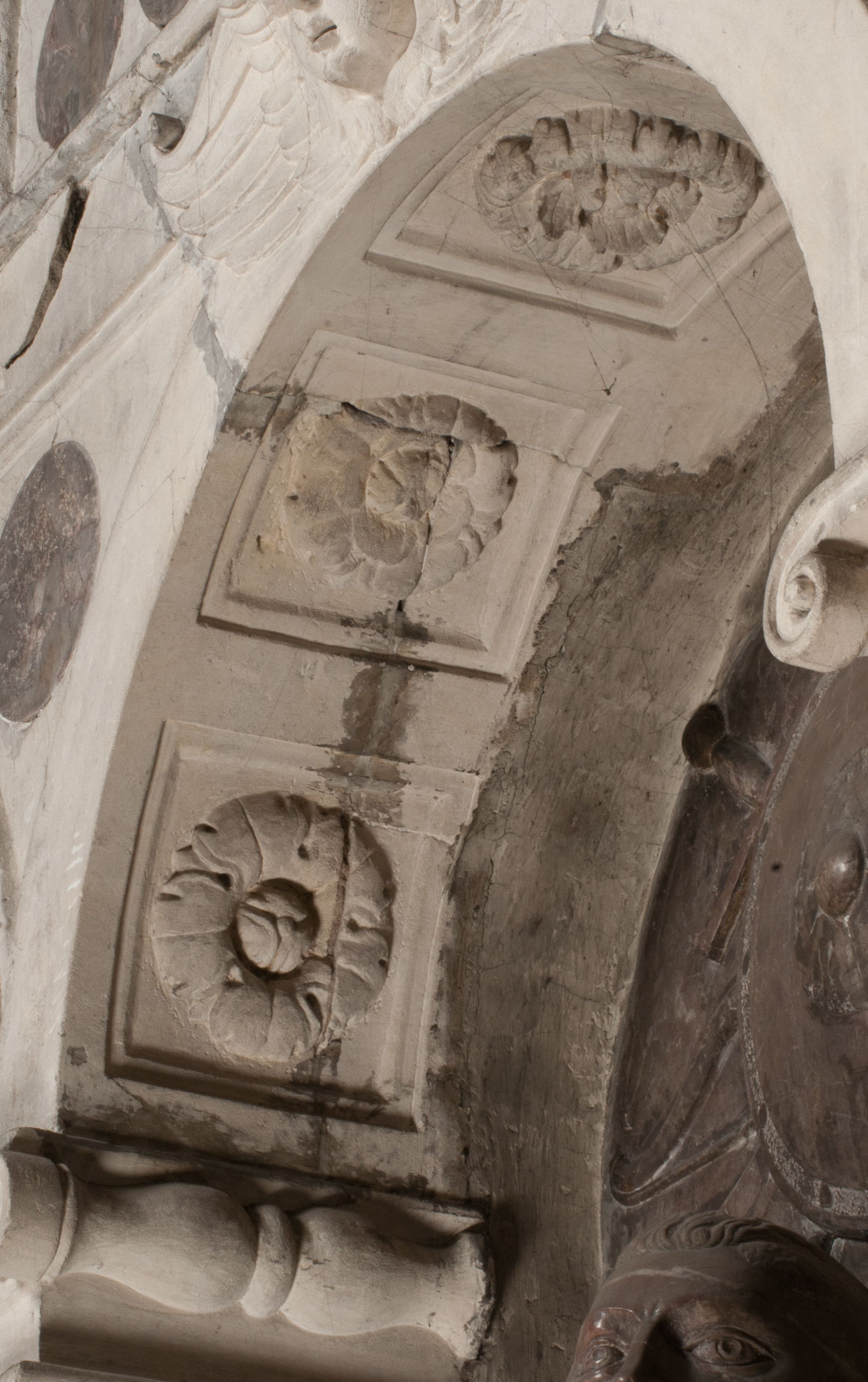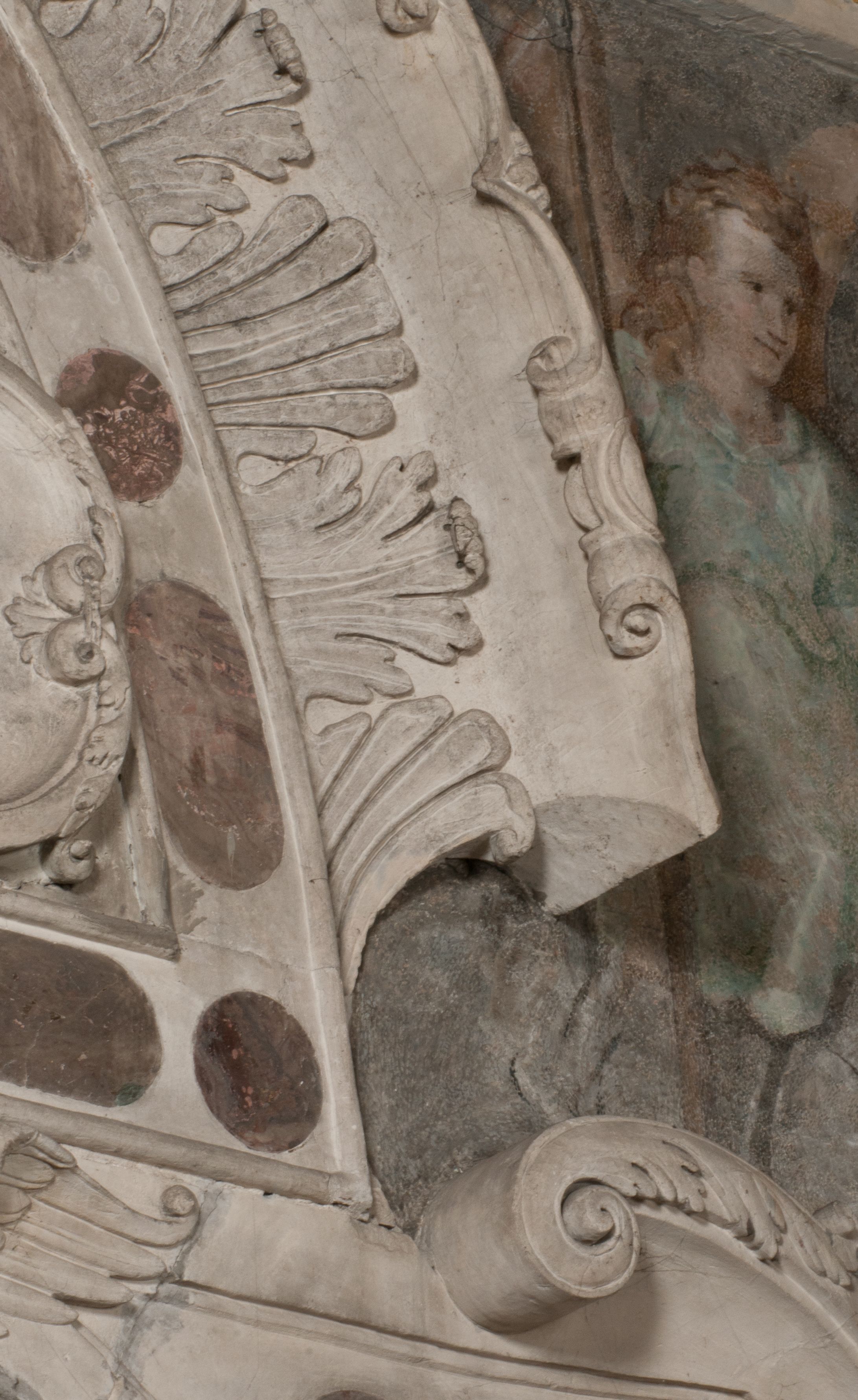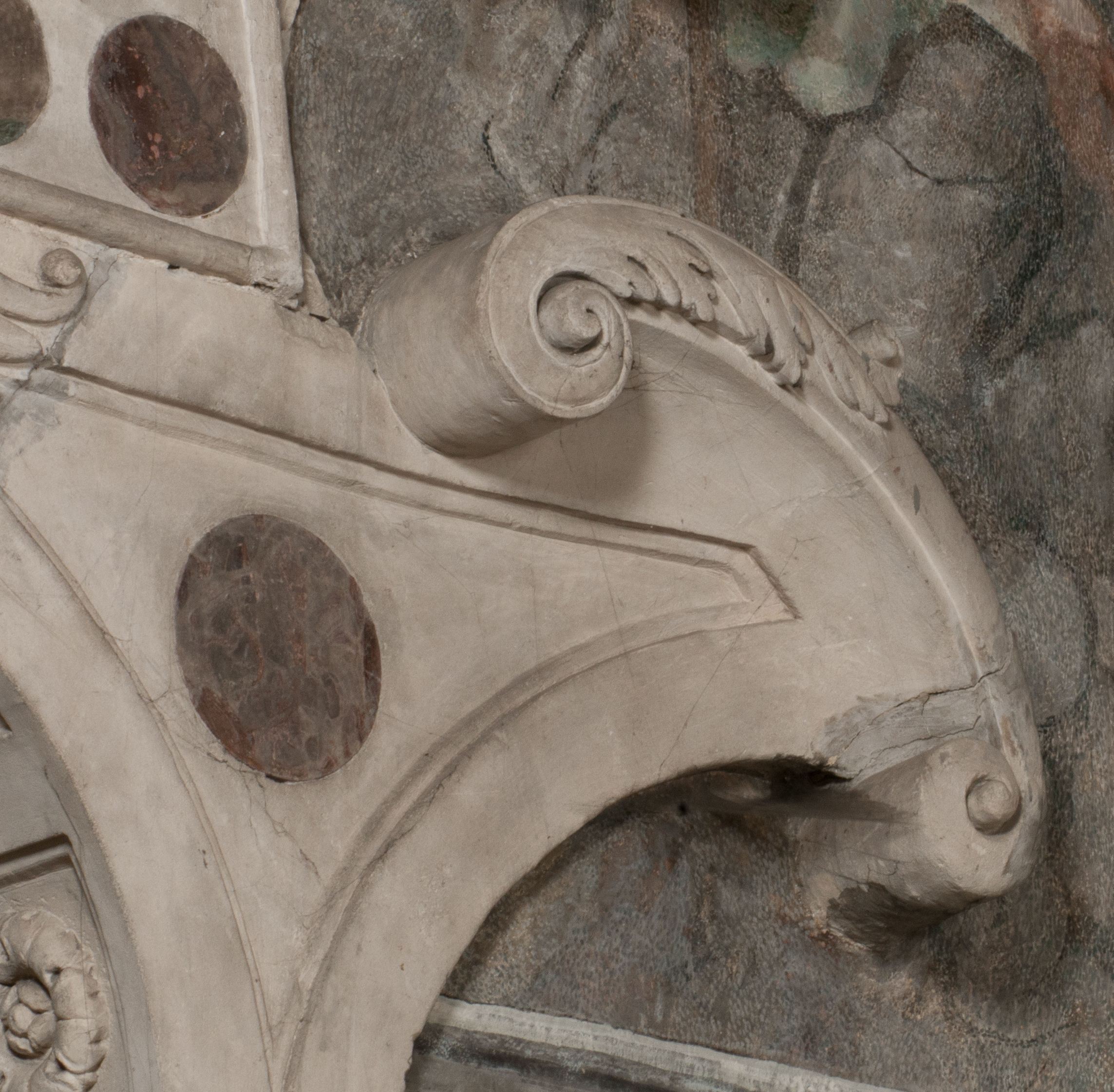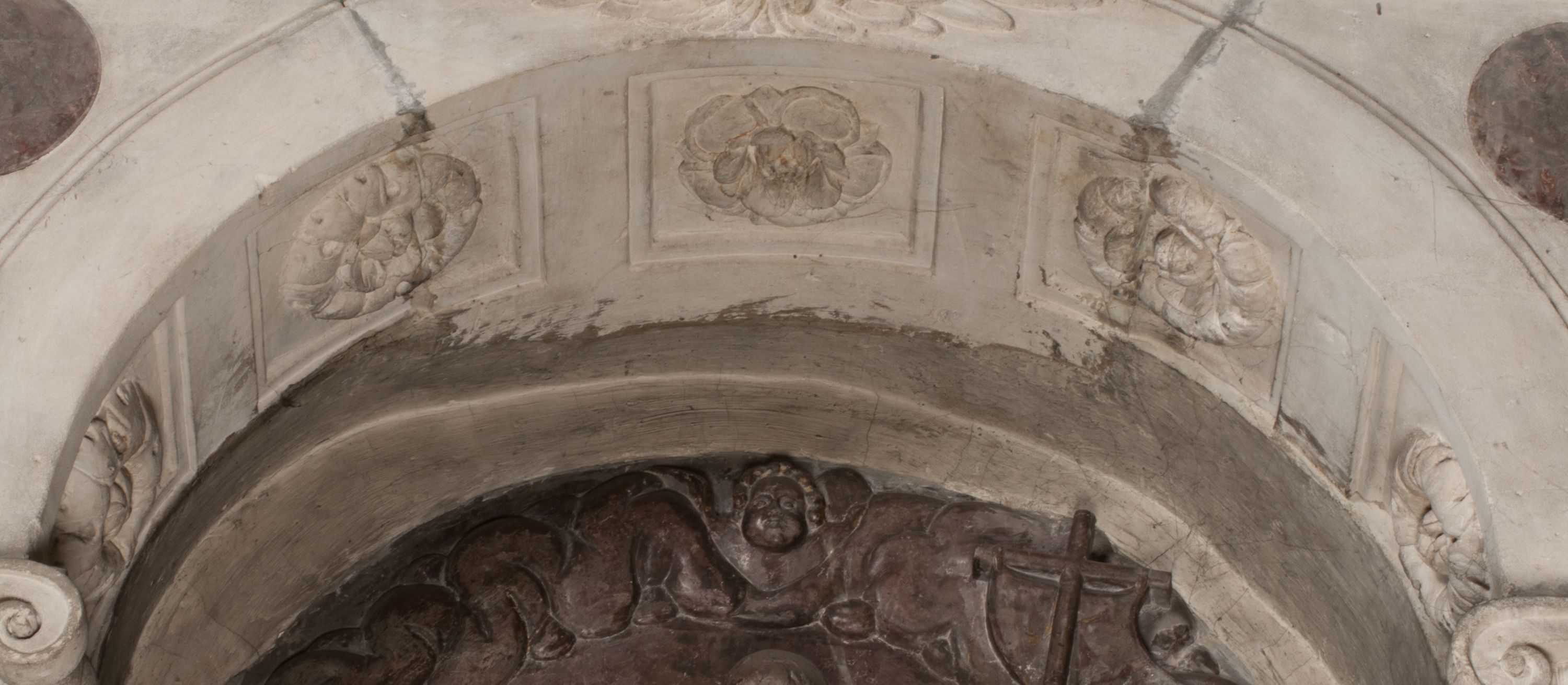 Zwieńczenie nagrobka o brzegach inkrustowanych marmurowymi kołami i elipsami, ujęte ornamentalnymi uszami, jest zakończone pasem z zawijającymi się do środkami kartuszami i równolegle ułożonymi liśćmi akantu. Tympanon wypełnia dekoracja złożona z czterech kartuszy: dwóch owalnych na tle paludamentu, zwieńczonych uskrzydloną główką anioła z godłami herbów Gryf i Kotwicz i dwóch podłużnych z inskrypcjami. Na tablicy po lewej stronie inskrypcja: „MAGNIFICO D(OMI)NO GREGORIO A RUSCA BRANICZKI OLIM VENA/TORI ET BURGRABIO CRAC(OVIENSI) CAPITANEO NIEPOŁOMIECEN(SI) VIRO / INTEGERRIMO DE REGIBVS SVIS ET RE PVB(LICA) BENE MERITO RELIGIO/NIS CATHOLICE AMANTISSIMO AMICIS FIDELISSIMO, OMNIBVS AFFABI/LI ET BENIGNO JOANNES A RUSCA BRANICZKI VENATOR CRACO(VIENSIS) CAPITANEVS NIEPOŁOMICEN(SI) MESTVS FILIUS PARENTI CHA/RISSIMO POSVIT OBYT 9 MAII A(NNO) D(OMINI) 1595 AETATIS SUE 60”. Napis wykuty po prawej stronie: “MAGNIFICAE D(OMI)NE CATHARINAE MAGNIFICI OLIM D(OMI)NI AUGUSTINI / KOTFICZ D(OMINI) SIGISMVNDI I POLONIAE REGIS STABVLI PREFECTI / VEXILIFERISQUE CURIE ET BURGRABY CRACO(VIENSIS) FILIE MATRONAE / LECTISSIME QVE CVM PVDORE ET MORVM MIRA ELEGANTIA / MARITI SUMMUM AMOREM VIRTUTE ET MODESTIA OMNIVM BENE/VOLENTIAM MERVISSET ACERBISSIMA MORTE AB OCVLIS EREPTA EST / IDEM FILIUS MATRI AMANTISSIME CVM LACRIMIS POSVIT. OBYT / 8 OCTOBRIS A(NNO) D)OMINI) 1588 AETATIS SUE 38".