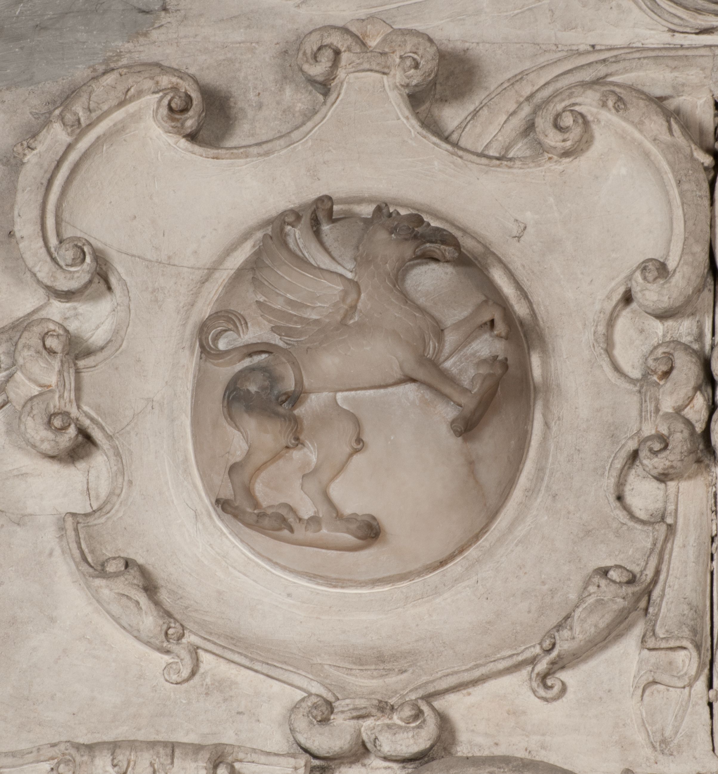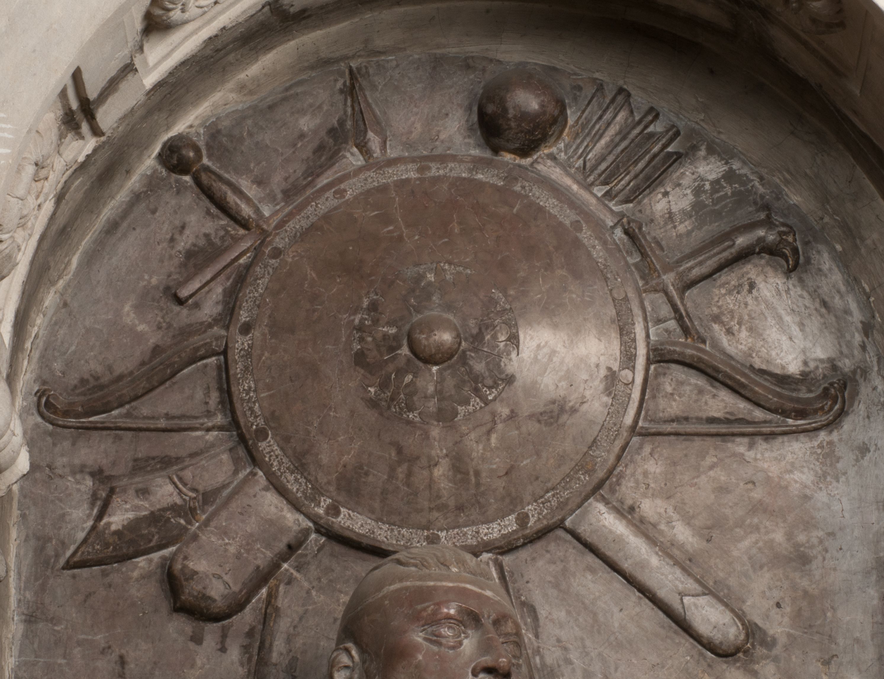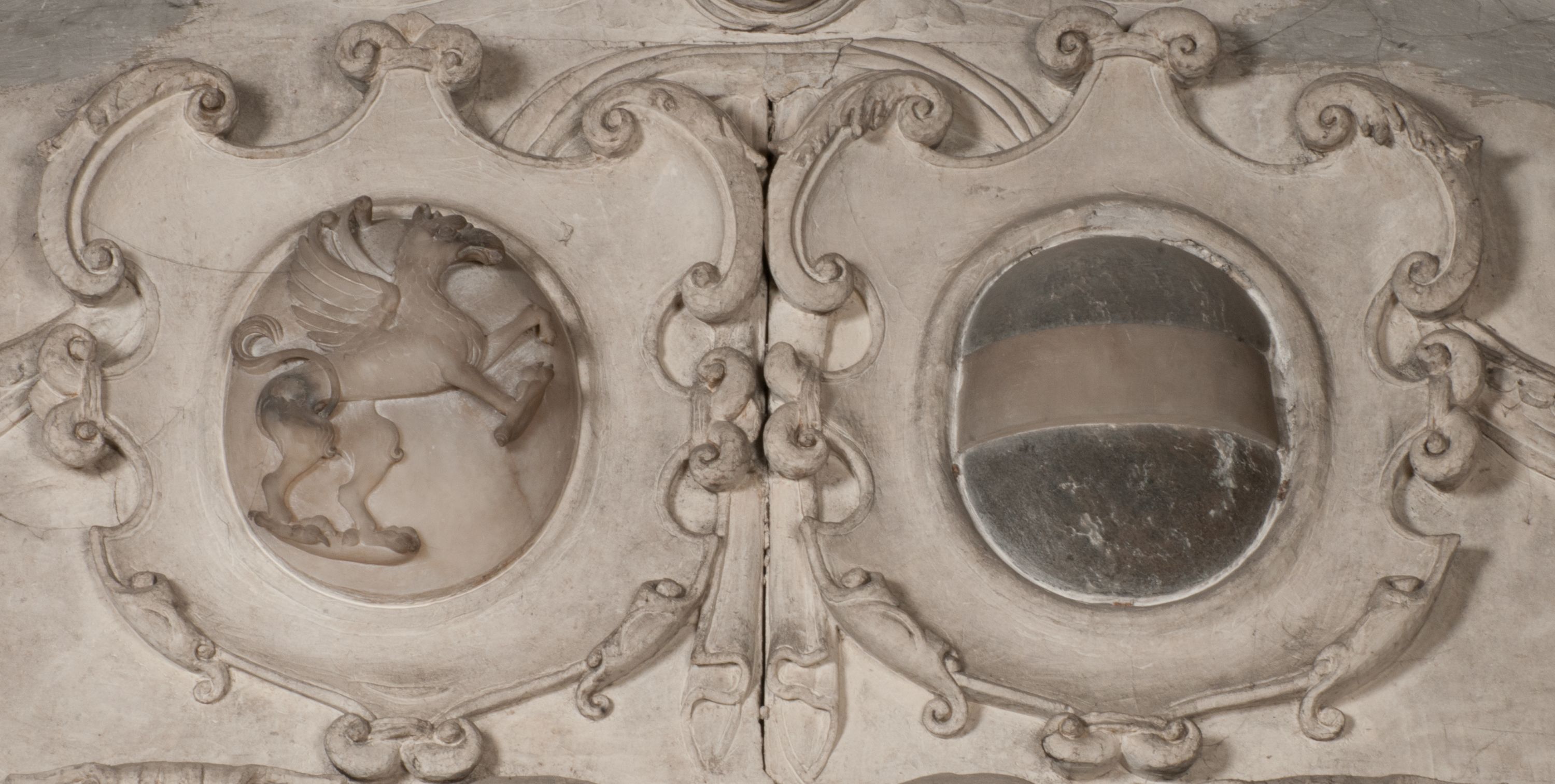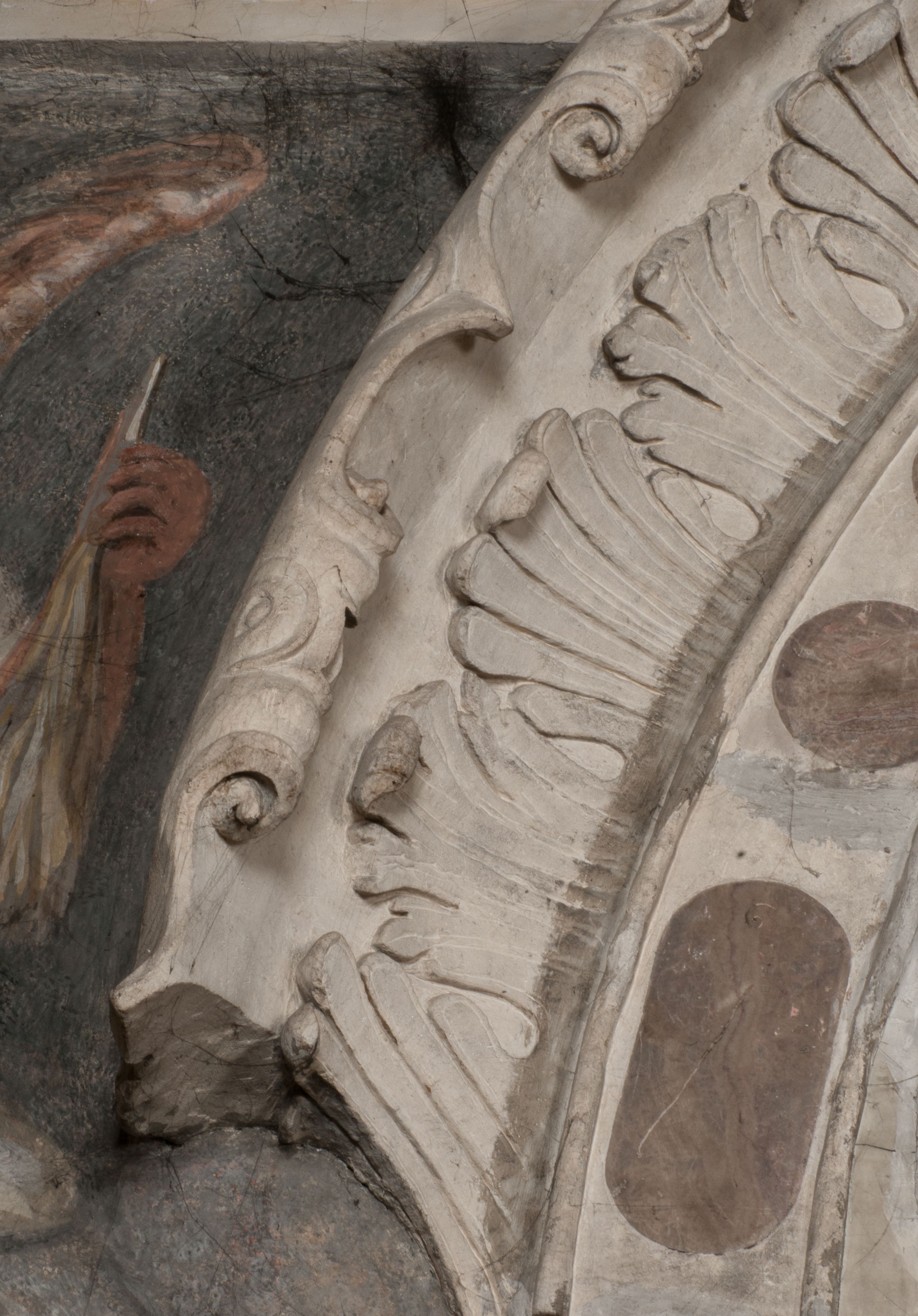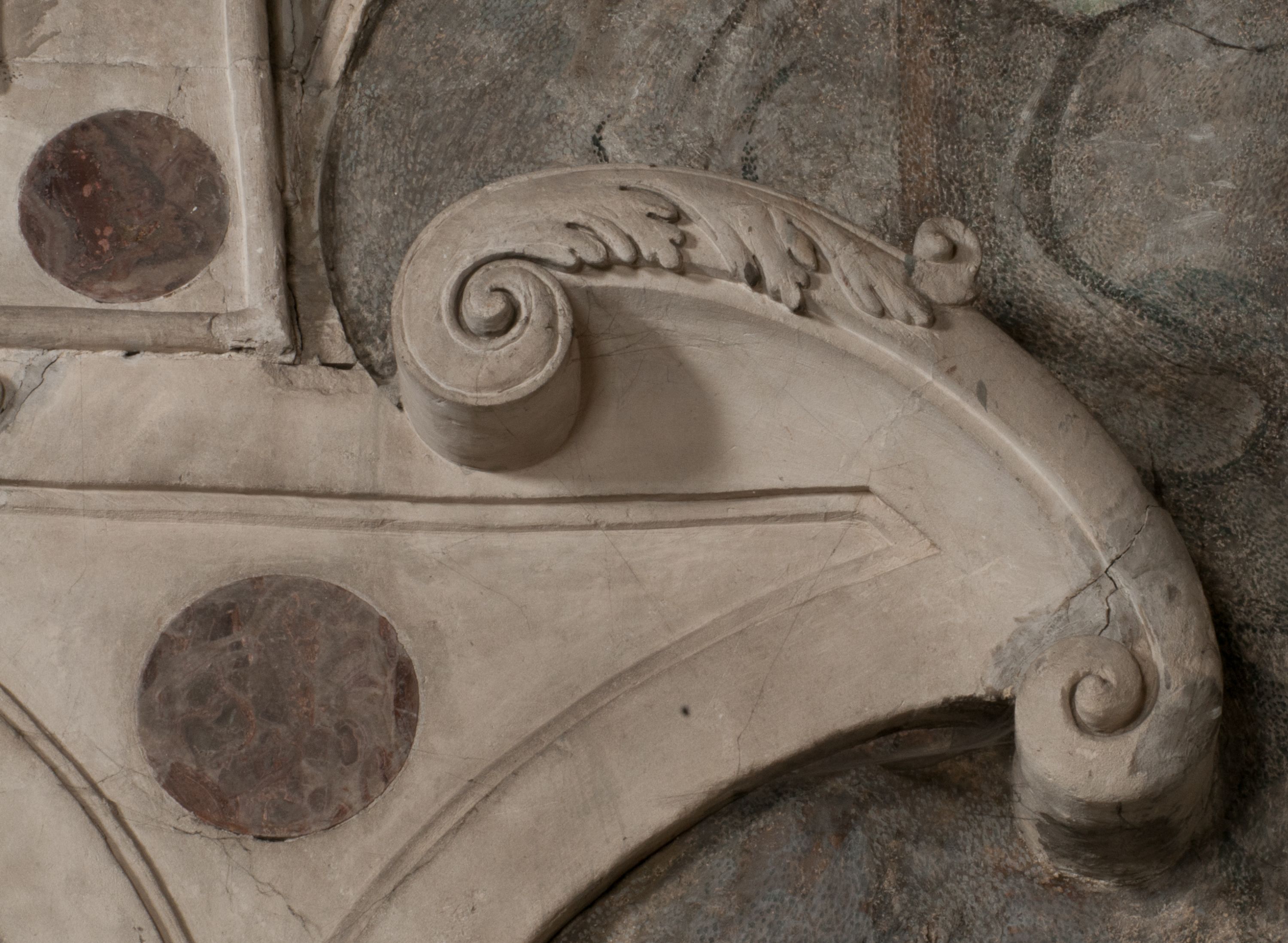 Zwieńczenie nagrobka o brzegach inkrustowanych marmurowymi kołami i elipsami, ujęte ornamentalnymi uszami, jest zakończone pasem z zawijającymi się do środkami kartuszami i równolegle ułożonymi liśćmi akantu. Tympanon wypełnia dekoracja złożona z czterech kartuszy: dwóch owalnych na tle paludamentu, zwieńczonych uskrzydloną główką anioła z godłami herbów Gryf i Kotwicz i dwóch podłużnych z inskrypcjami. Na tablicy po lewej stronie inskrypcja: „MAGNIFICO D(OMI)NO GREGORIO A RUSCA BRANICZKI OLIM VENA/TORI ET BURGRABIO CRAC(OVIENSI) CAPITANEO NIEPOŁOMIECEN(SI) VIRO / INTEGERRIMO DE REGIBVS SVIS ET RE PVB(LICA) BENE MERITO RELIGIO/NIS CATHOLICE AMANTISSIMO AMICIS FIDELISSIMO, OMNIBVS AFFABI/LI ET BENIGNO JOANNES A RUSCA BRANICZKI VENATOR CRACO(VIENSIS) CAPITANEVS NIEPOŁOMICEN(SI) MESTVS FILIUS PARENTI CHA/RISSIMO POSVIT OBYT 9 MAII A(NNO) D(OMINI) 1595 AETATIS SUE 60”. Napis wykuty po prawej stronie: “MAGNIFICAE D(OMI)NE CATHARINAE MAGNIFICI OLIM D(OMI)NI AUGUSTINI / KOTFICZ D(OMINI) SIGISMVNDI I POLONIAE REGIS STABVLI PREFECTI / VEXILIFERISQUE CURIE ET BURGRABY CRACO(VIENSIS) FILIE MATRONAE / LECTISSIME QVE CVM PVDORE ET MORVM MIRA ELEGANTIA / MARITI SUMMUM AMOREM VIRTUTE ET MODESTIA OMNIVM BENE/VOLENTIAM MERVISSET ACERBISSIMA MORTE AB OCVLIS EREPTA EST / IDEM FILIUS MATRI AMANTISSIME CVM LACRIMIS POSVIT. OBYT / 8 OCTOBRIS A(NNO) D)OMINI) 1588 AETATIS SUE 38".