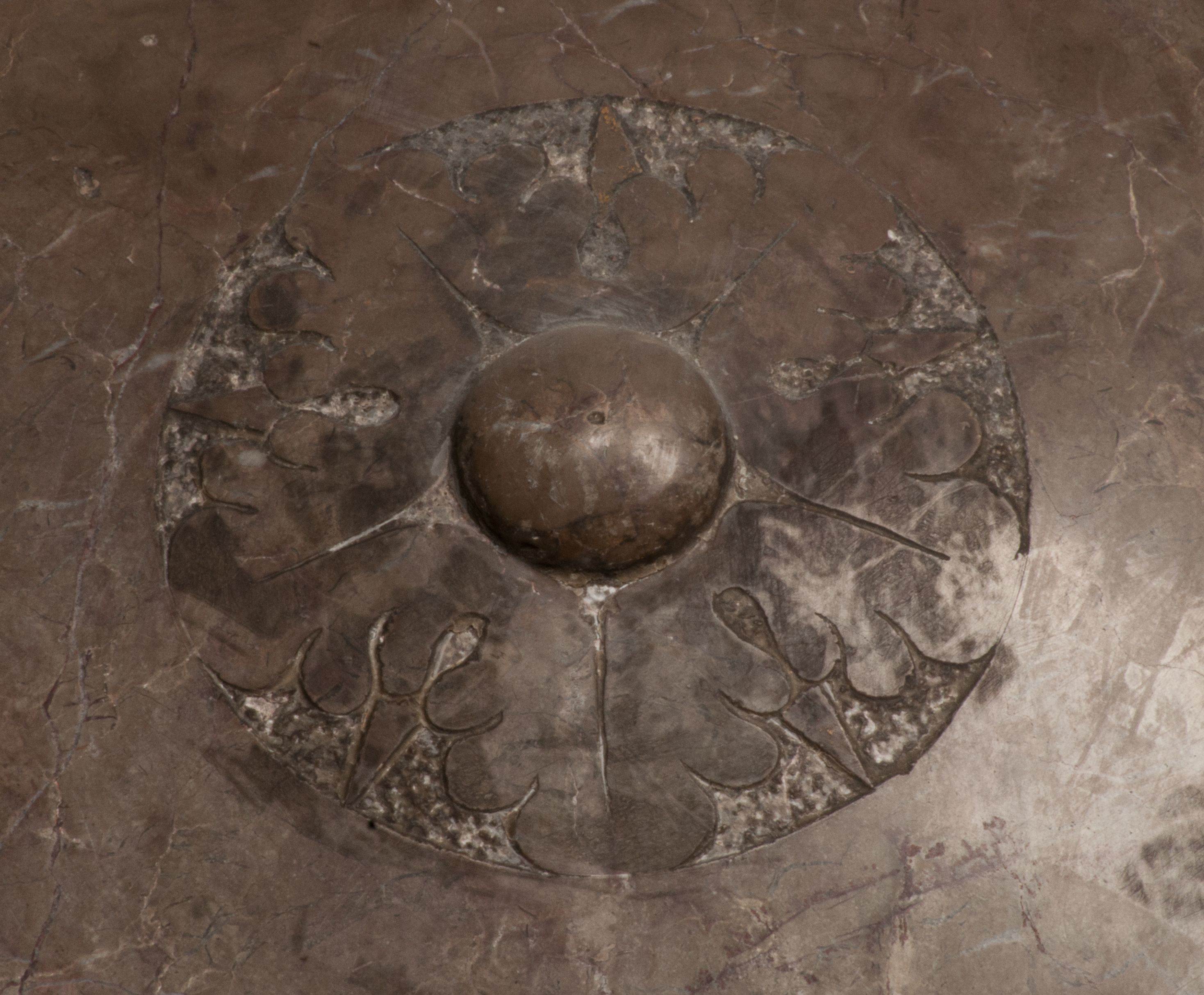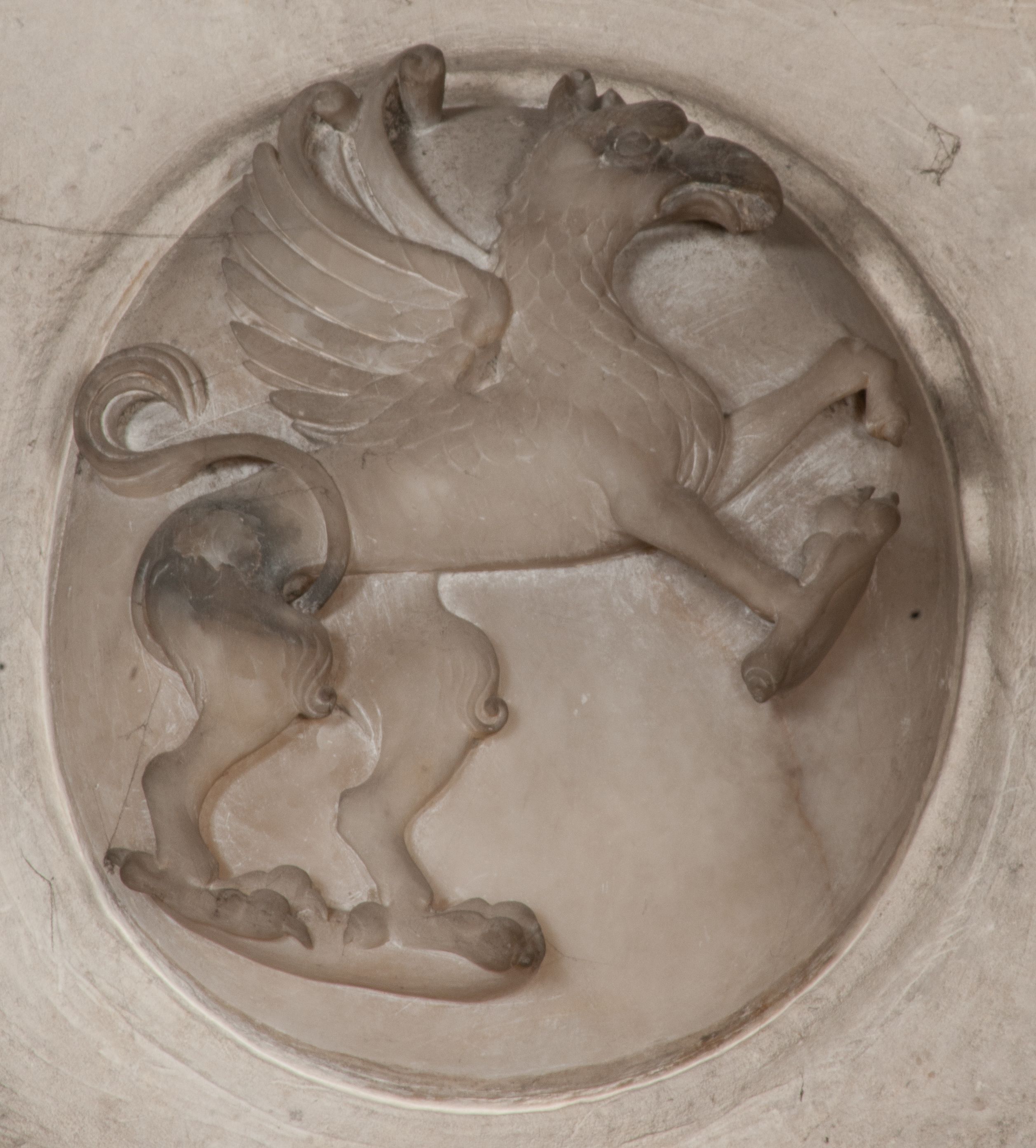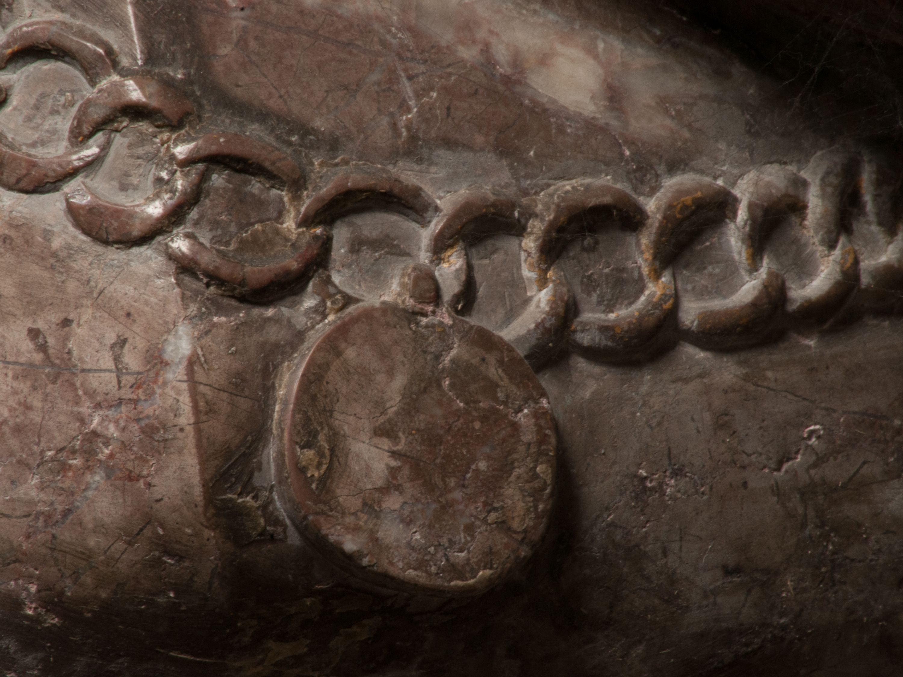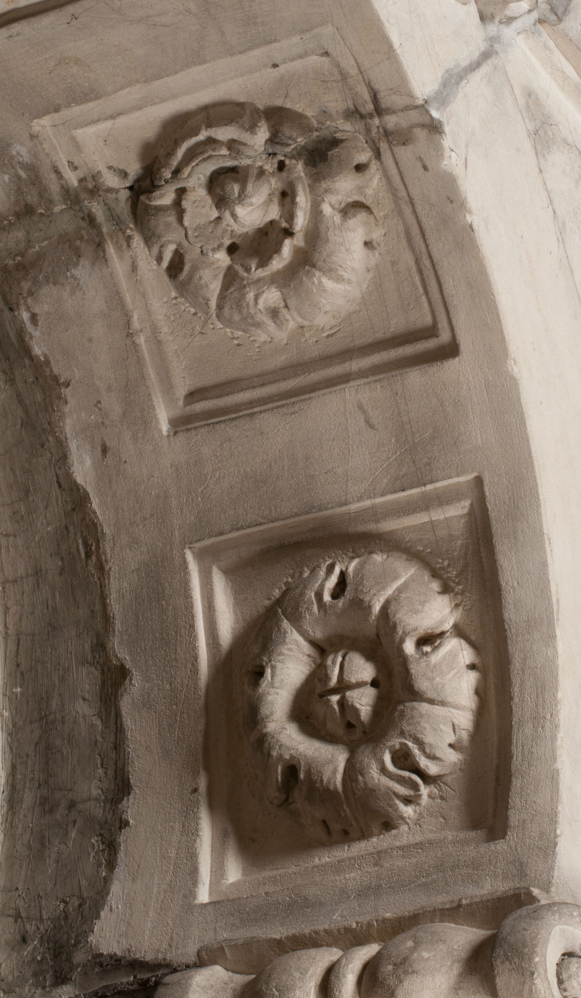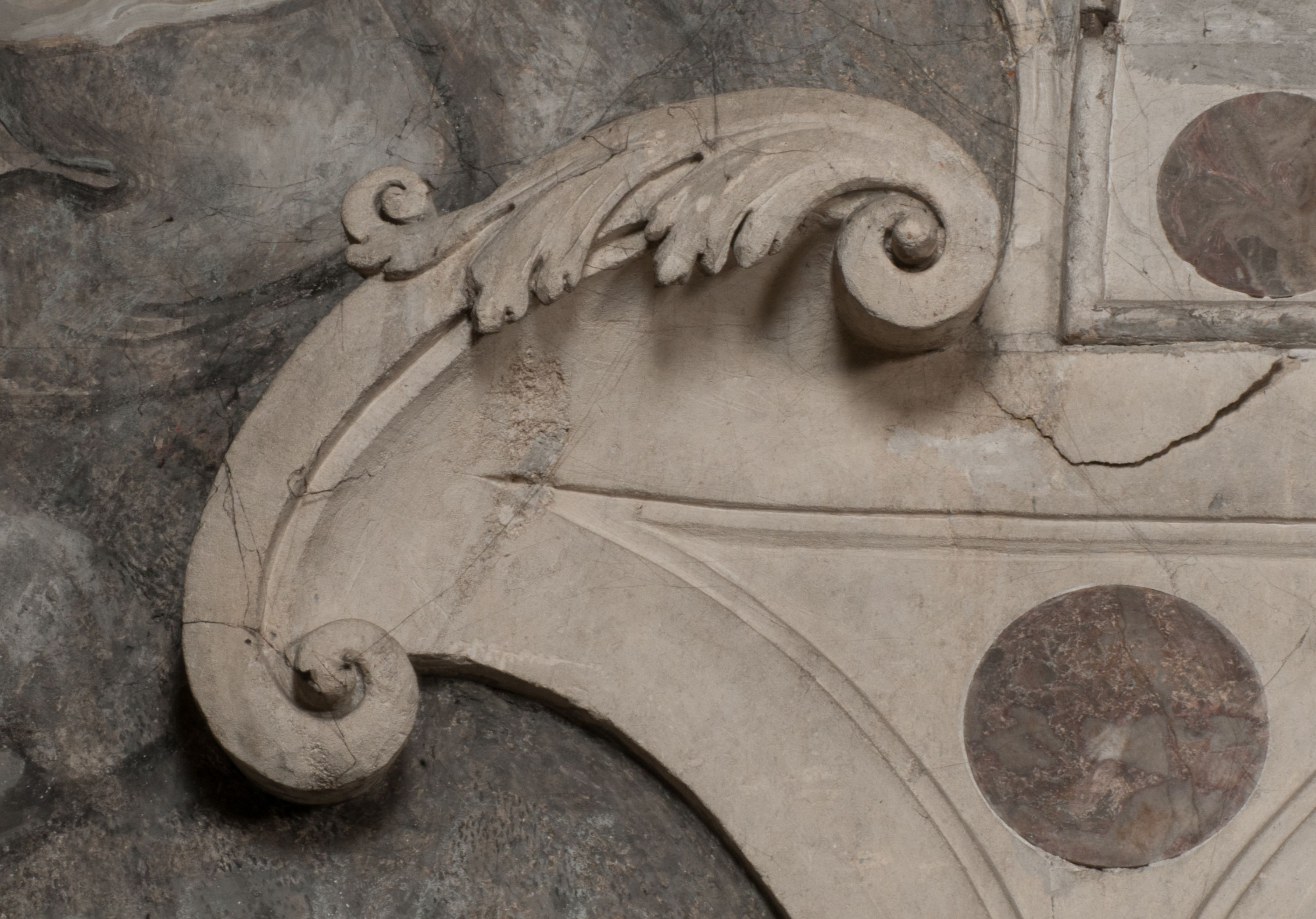 Zwieńczenie nagrobka o brzegach inkrustowanych marmurowymi kołami i elipsami, ujęte ornamentalnymi uszami, jest zakończone pasem z zawijającymi się do środkami kartuszami i równolegle ułożonymi liśćmi akantu. Tympanon wypełnia dekoracja złożona z czterech kartuszy: dwóch owalnych na tle paludamentu, zwieńczonych uskrzydloną główką anioła z godłami herbów Gryf i Kotwicz i dwóch podłużnych z inskrypcjami. Na tablicy po lewej stronie inskrypcja: „MAGNIFICO D(OMI)NO GREGORIO A RUSCA BRANICZKI OLIM VENA/TORI ET BURGRABIO CRAC(OVIENSI) CAPITANEO NIEPOŁOMIECEN(SI) VIRO / INTEGERRIMO DE REGIBVS SVIS ET RE PVB(LICA) BENE MERITO RELIGIO/NIS CATHOLICE AMANTISSIMO AMICIS FIDELISSIMO, OMNIBVS AFFABI/LI ET BENIGNO JOANNES A RUSCA BRANICZKI VENATOR CRACO(VIENSIS) CAPITANEVS NIEPOŁOMICEN(SI) MESTVS FILIUS PARENTI CHA/RISSIMO POSVIT OBYT 9 MAII A(NNO) D(OMINI) 1595 AETATIS SUE 60”. Napis wykuty po prawej stronie: “MAGNIFICAE D(OMI)NE CATHARINAE MAGNIFICI OLIM D(OMI)NI AUGUSTINI / KOTFICZ D(OMINI) SIGISMVNDI I POLONIAE REGIS STABVLI PREFECTI / VEXILIFERISQUE CURIE ET BURGRABY CRACO(VIENSIS) FILIE MATRONAE / LECTISSIME QVE CVM PVDORE ET MORVM MIRA ELEGANTIA / MARITI SUMMUM AMOREM VIRTUTE ET MODESTIA OMNIVM BENE/VOLENTIAM MERVISSET ACERBISSIMA MORTE AB OCVLIS EREPTA EST / IDEM FILIUS MATRI AMANTISSIME CVM LACRIMIS POSVIT. OBYT / 8 OCTOBRIS A(NNO) D)OMINI) 1588 AETATIS SUE 38".