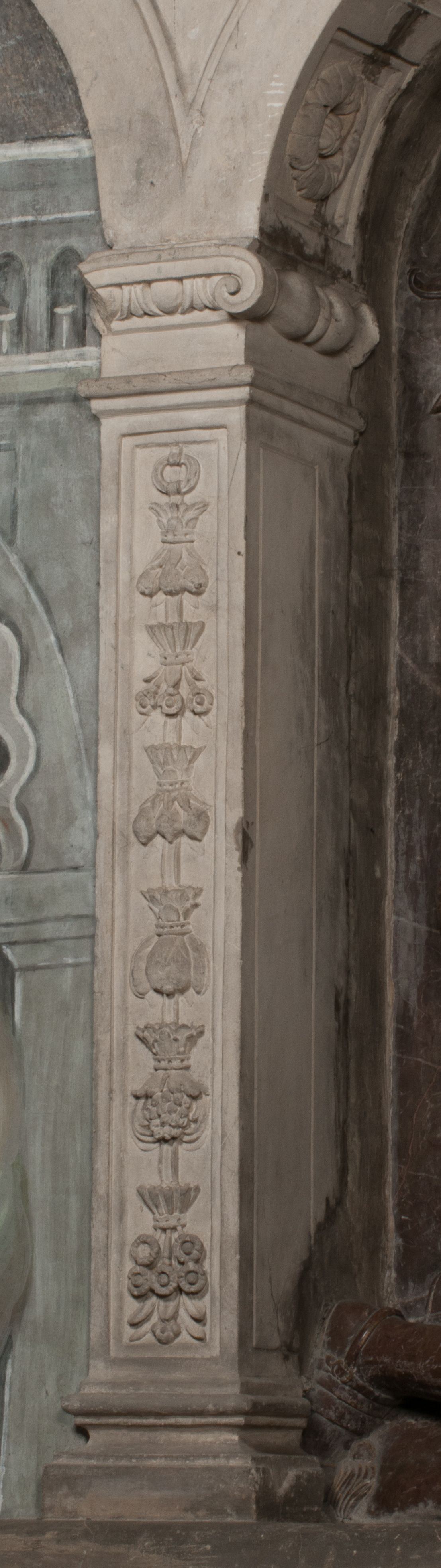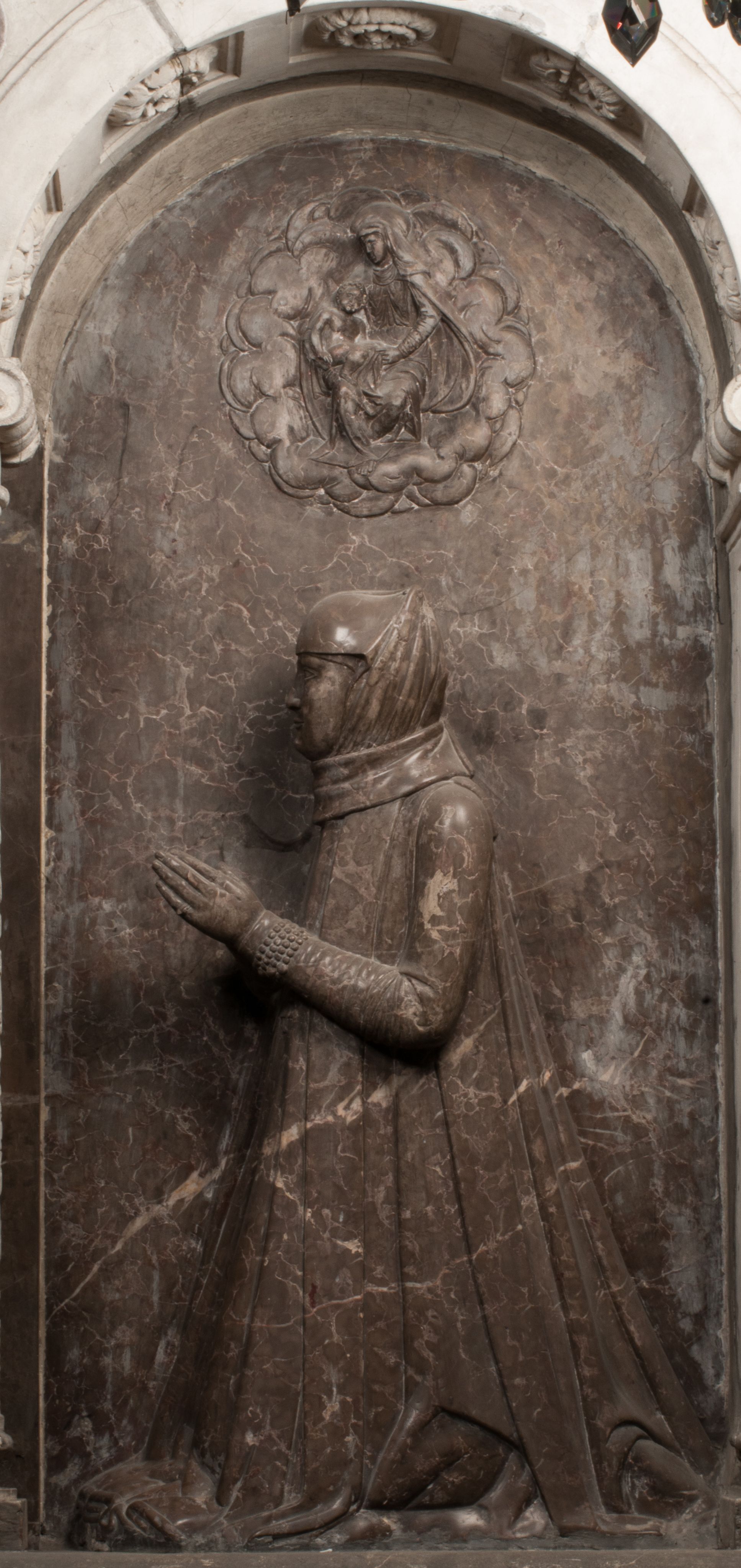 Po lewej stronie arkadę wypełnia ujęta z profilu, postać klęczącej na dwóch kolanach Katarzyny Branickiej. Jest ubrana w długą szubę, opadającą sztywnymi, rozchodzącymi się fałdami, u dołu załamującymi się, które zasłaniają sylwetkę. Na głowie ma czepiec przysłaniający włosy i podwikę. Twarz o łagodnych rysach, z długim nosem, małymi ustami i lekko zadartym podbródkiem. Ręce złożone razem na piersiach. Na palcach wskazującym i serdecznym lewej dłoni pierścienie, a ponad nadgarstkiem czterokrotnie nawinięty różaniec. Ponad figurą płaskorzeźbione tondo z Matką Boską z Dzieciątkiem otoczonymi wieńcem obłoków. Maria siedzi, ubrana w długą suknię, z welonem na głowie, z płaszczem zarzuconym na ramiona, którym lekko okrywa nagie Dzieciątko.