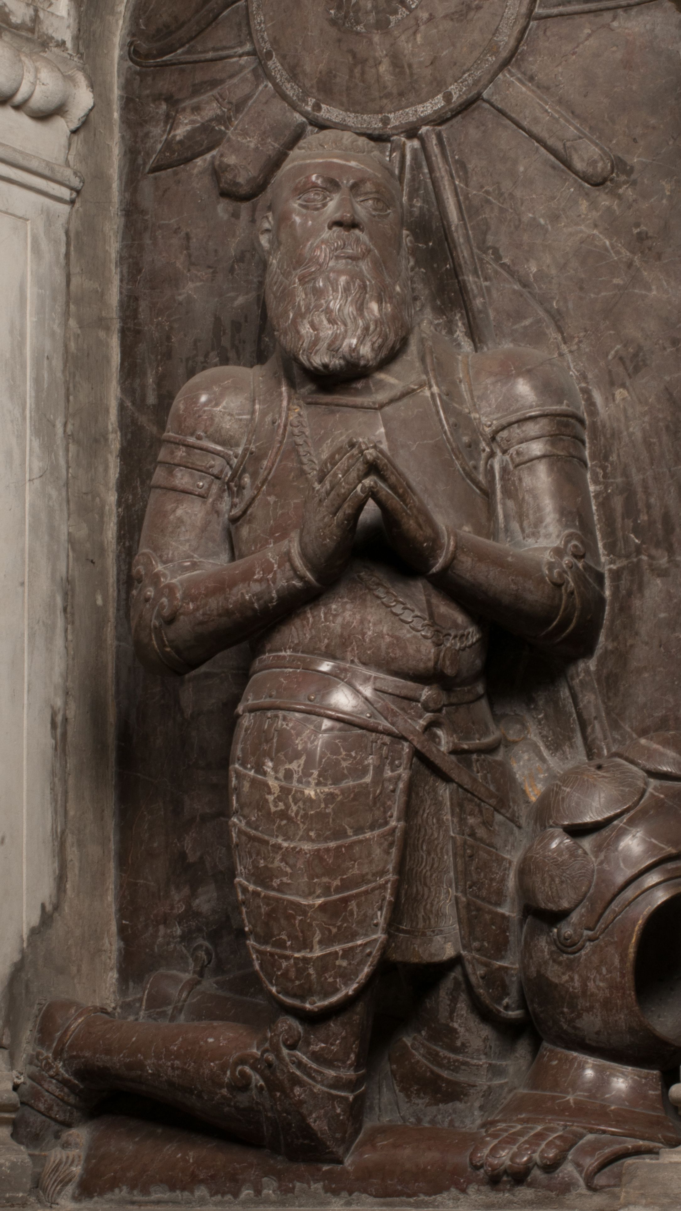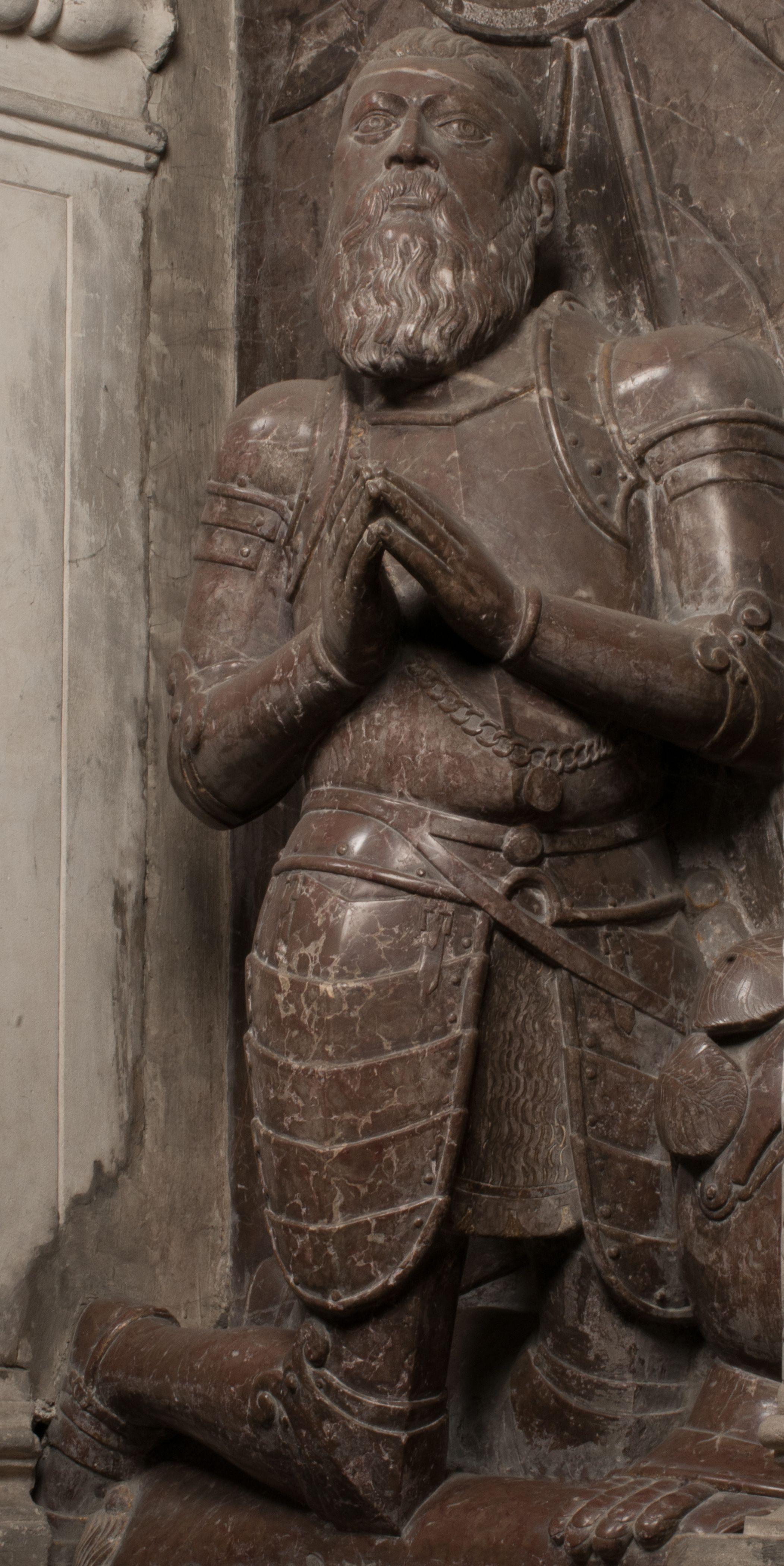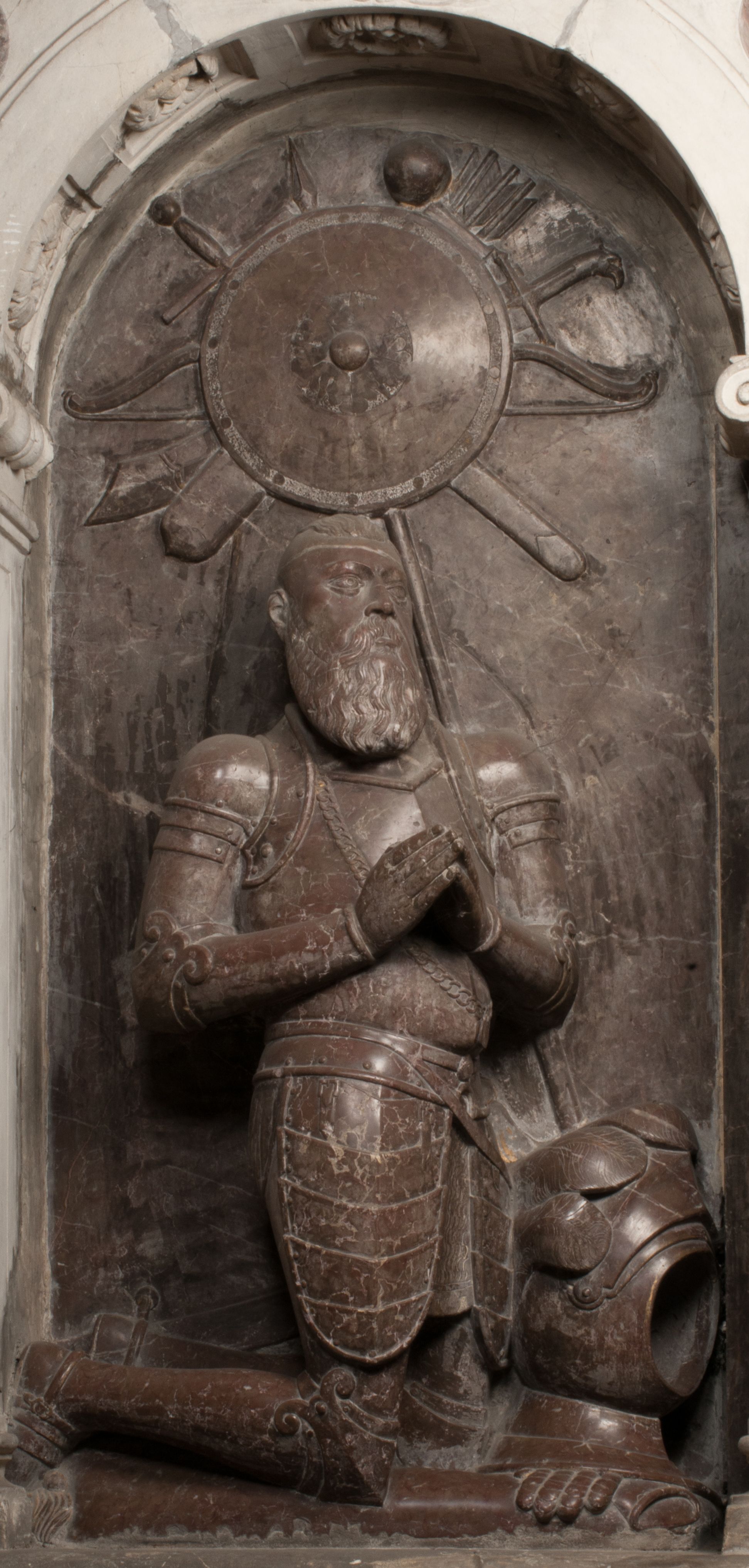W arkadzie po lewej stronie przedstawiony został w trzech czwartych, zwrócony ramionami do widza Grzegorz Branicki. Postać klęczy na poduszce, szerokie dłonie złożone ma razem na piersiach, a głowę lekko uniesioną. Twarz Branickiego o pociągłych rysach, szerokich kościach policzkowych i dużych oczach, z wysokim czołem przysłoniętym zaczesanymi do przodu włosami. Ukazany z wąsami i długą, pofalowaną brodą. Ubrany jest w pełną, dekorowaną zbroję, spod której wystaje jaka i nogawice. Na szyi zawieszony łańcuch, a u stóp ostrogi. Przy nogach Branickiego leżą rękawice i hełm z trzema piórami. Nad głową wznoszą się panoplia, złożone z okrągłej tarczy i skrzyżowanych miecza, szabli, buławy, łuku, kołczanu ze strzałami i włóczni.