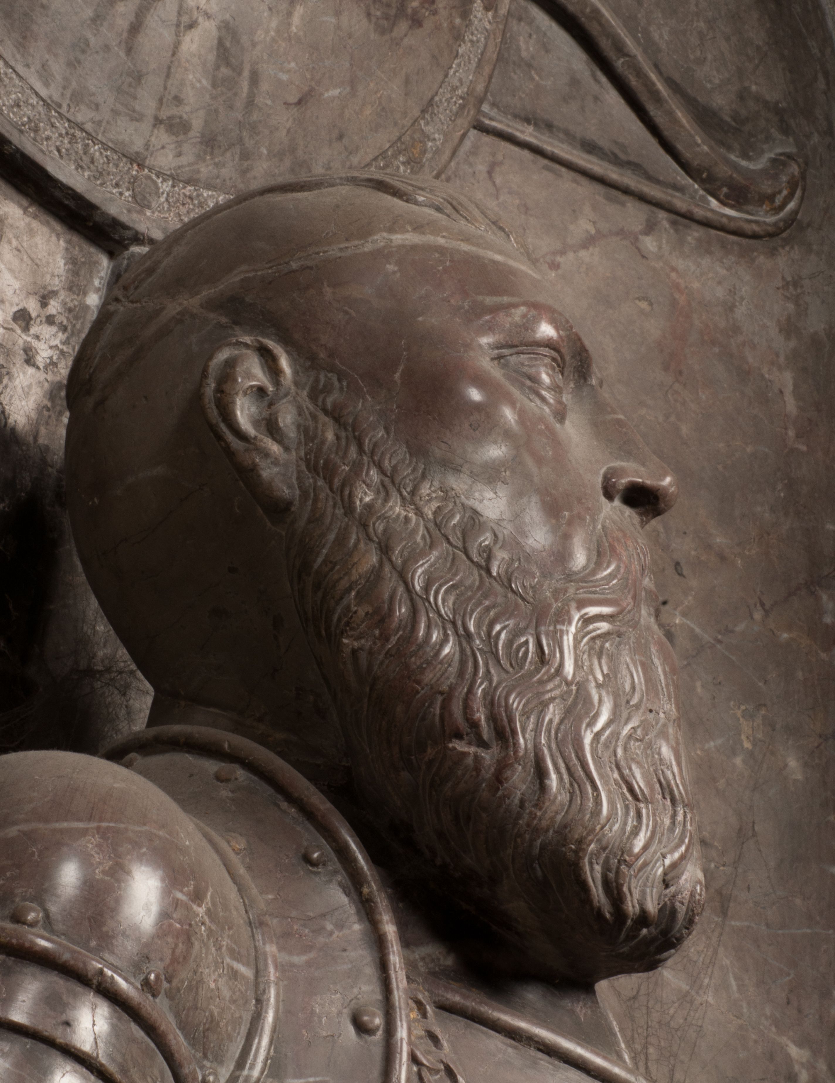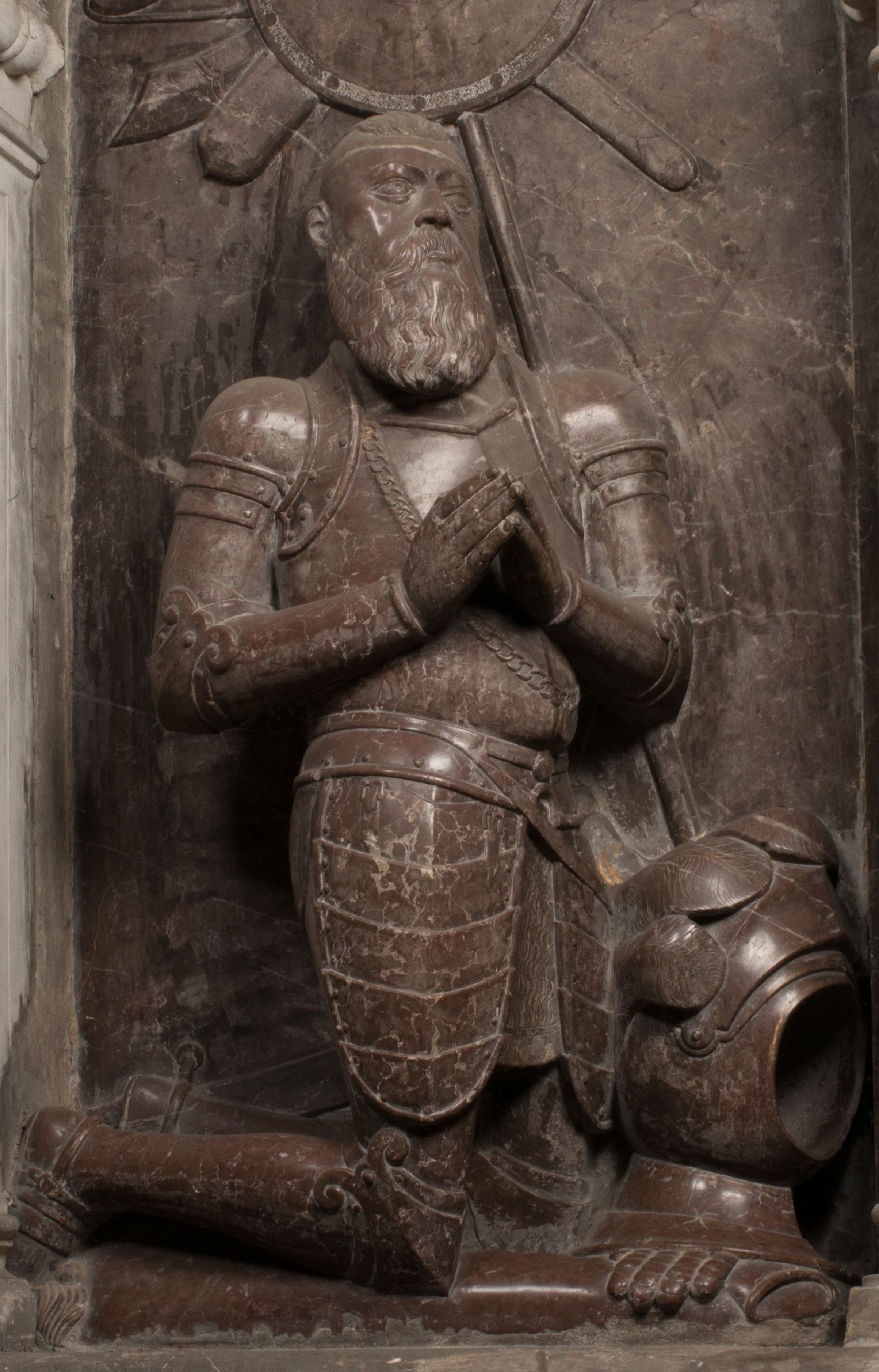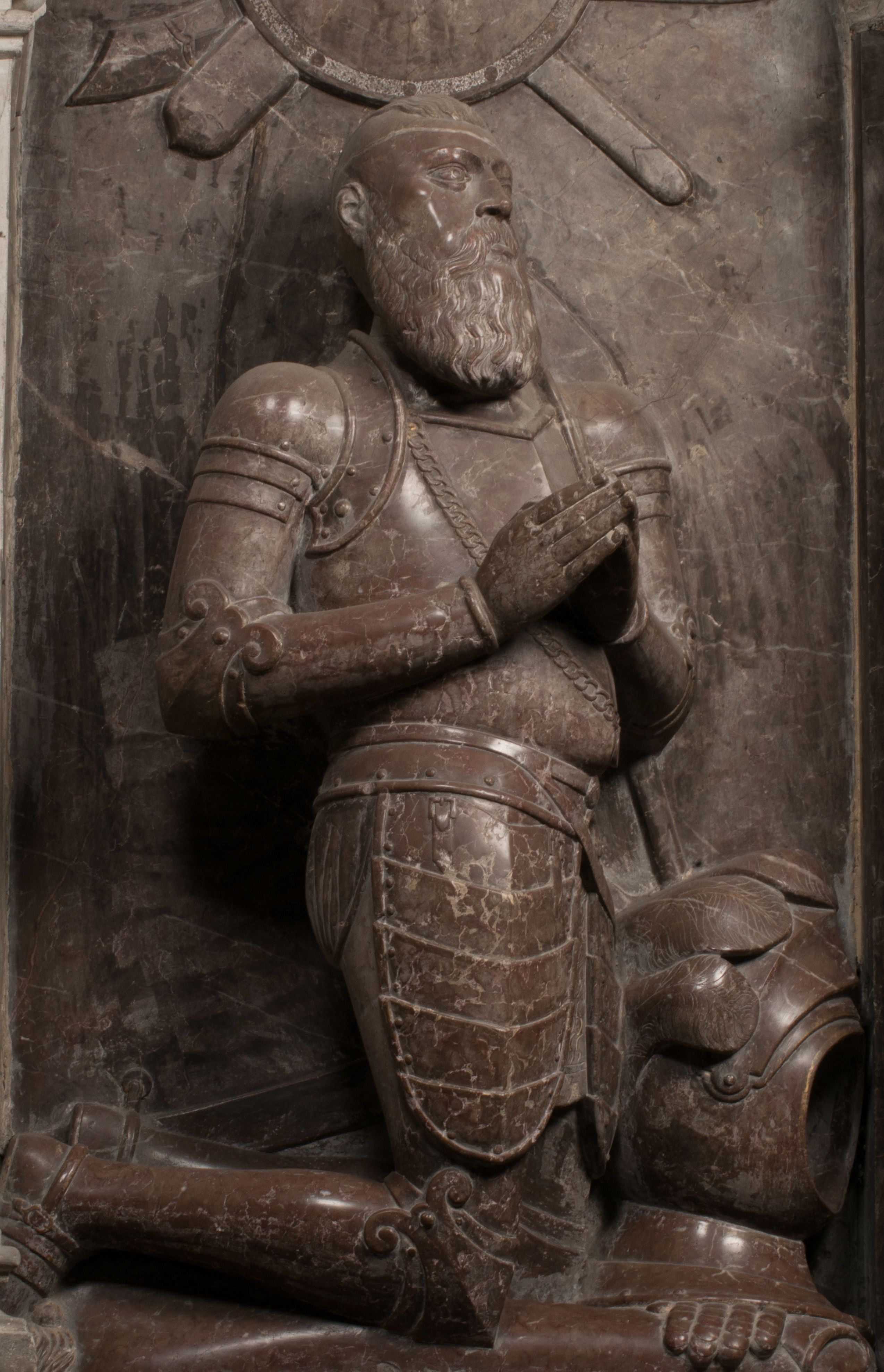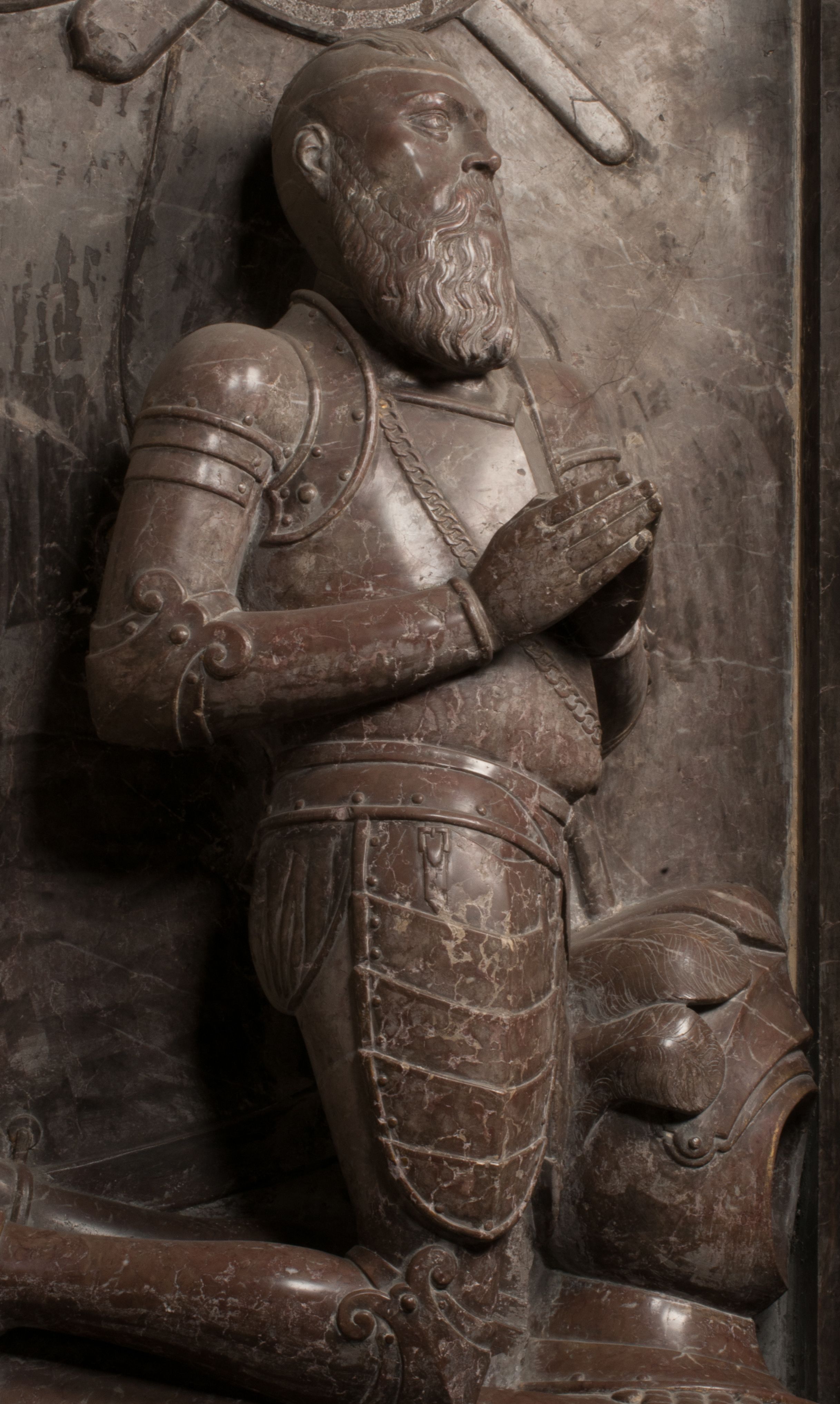 W arkadzie po lewej stronie przedstawiony został w trzech czwartych, zwrócony ramionami do widza Grzegorz Branicki. Postać klęczy na poduszce, szerokie dłonie złożone ma razem na piersiach, a głowę lekko uniesioną. Twarz Branickiego o pociągłych rysach, szerokich kościach policzkowych i dużych oczach, z wysokim czołem przysłoniętym zaczesanymi do przodu włosami. Ukazany z wąsami i długą, pofalowaną brodą. Ubrany jest w pełną, dekorowaną zbroję, spod której wystaje jaka i nogawice. Na szyi zawieszony łańcuch, a u stóp ostrogi. Przy nogach Branickiego leżą rękawice i hełm z trzema piórami. Nad głową wznoszą się panoplia, złożone z okrągłej tarczy i skrzyżowanych miecza, szabli, buławy, łuku, kołczanu ze strzałami i włóczni.