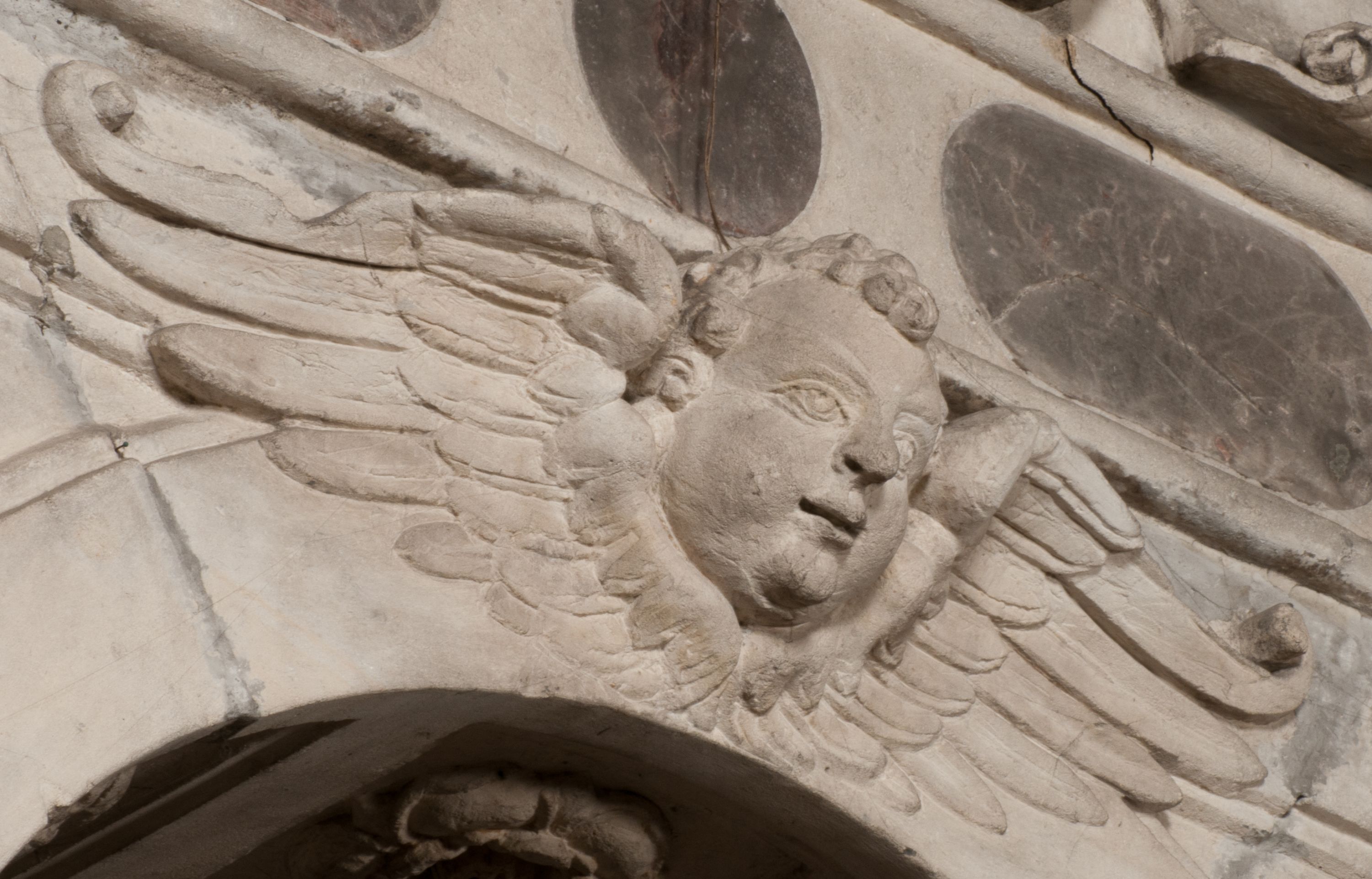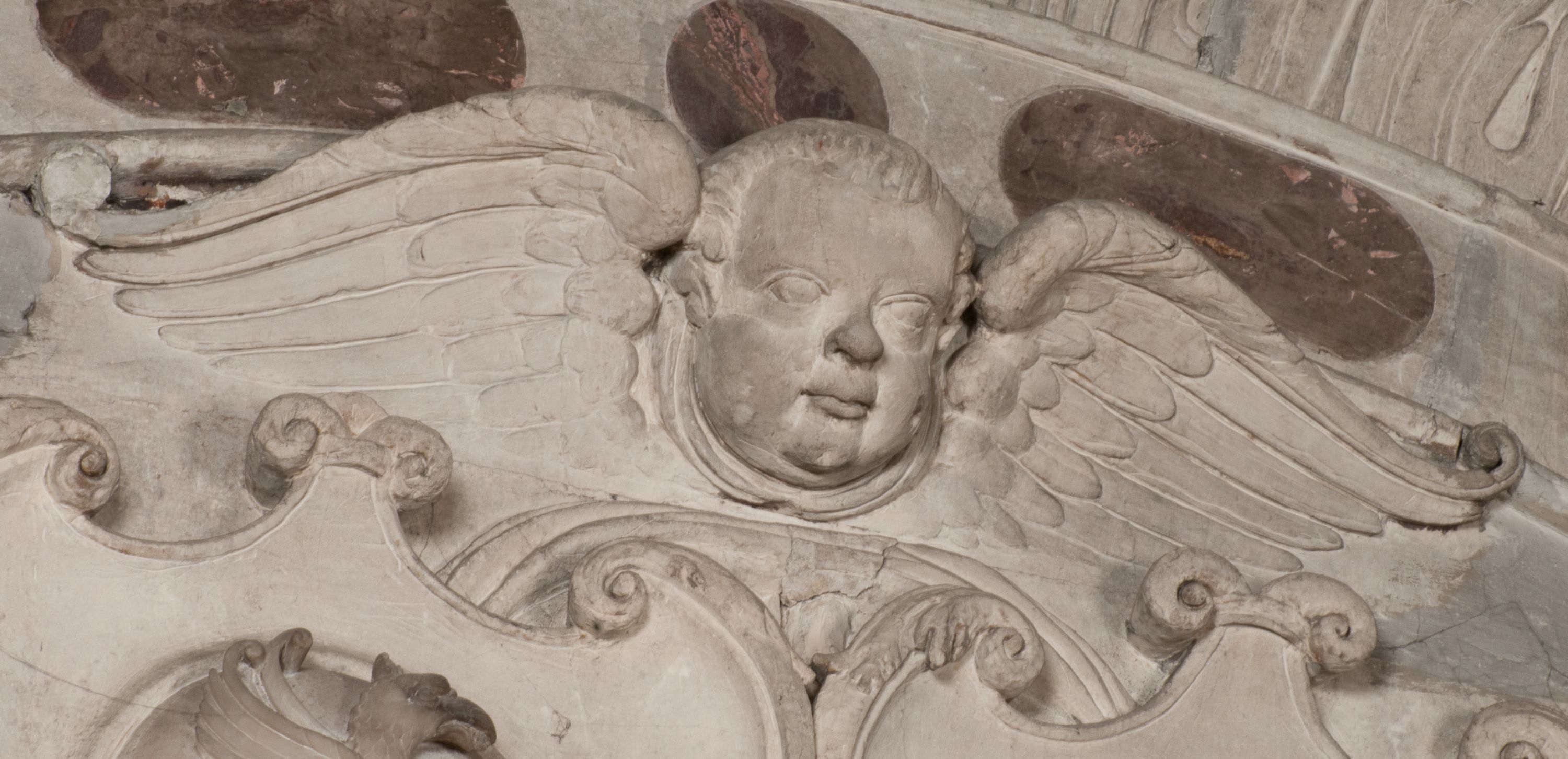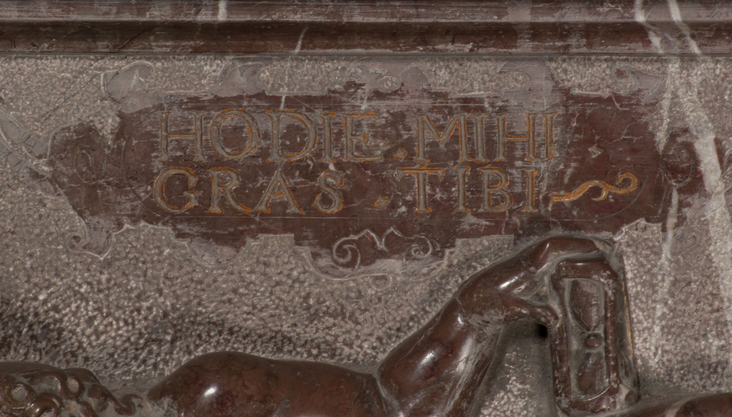 W warstwie ikonograficznej na uwagę zasługuje szereg motywów eschatologicznych takich jak skrzyżowane piszczele z trupią czaszką, czy leżące putto z klepsydrą. To ostatnie przedstawienie należy do tradycyjnych wyobrażeń śmierci, ukazywanej jako młodzieńczy bóg Thanatos. Wanitatywną wymowę podkreśla klepsydra, uważana powszechnie za symbol przemijania czasu, co dobitnie podkreśla inskrypcja „Dzisiaj mnie / jutro Tobie”. Taki sposób przedstawiania śmierci pojawił się po raz pierwszy w 1458 roku na medalu weneckiego medaliera Giovanniego Boldù i został spopularyzowany w malarstwie, a szczególnie w grafice niderlandzkiej XVI i XVII wieku. O jego popularności niech świadczy zachowany w zbiorach wawelskich obraz Bartholomeusa Sprangera z około 1600 roku.