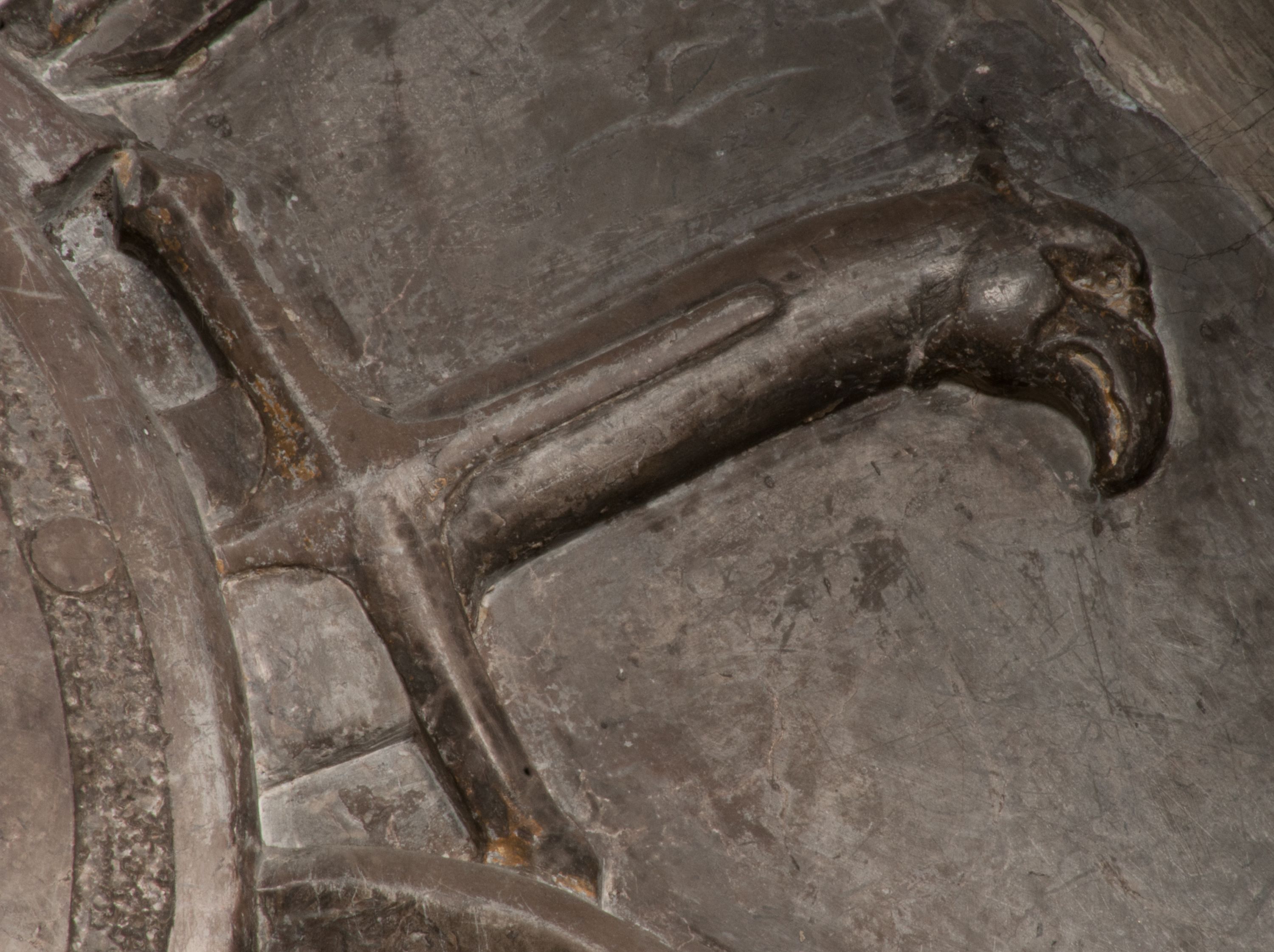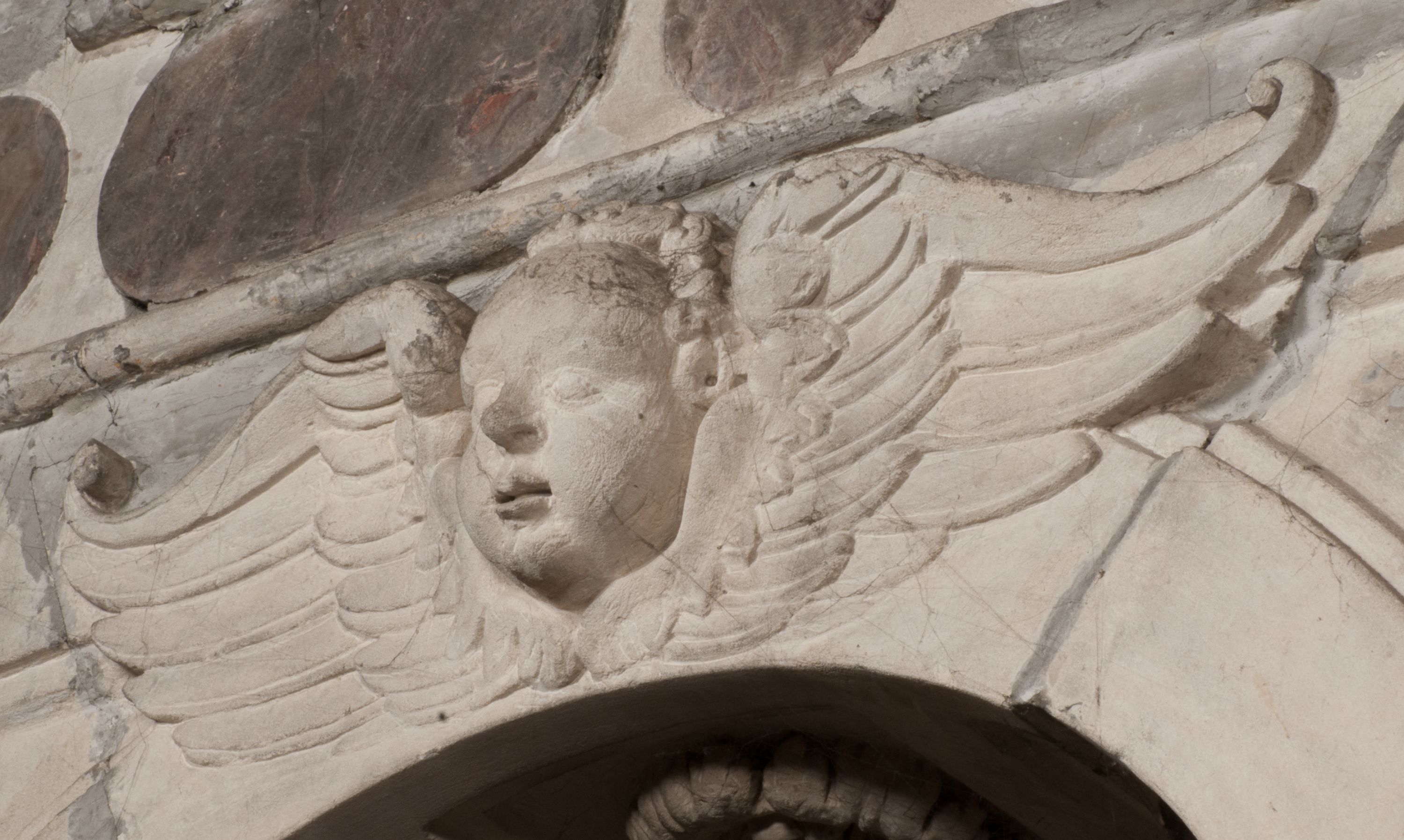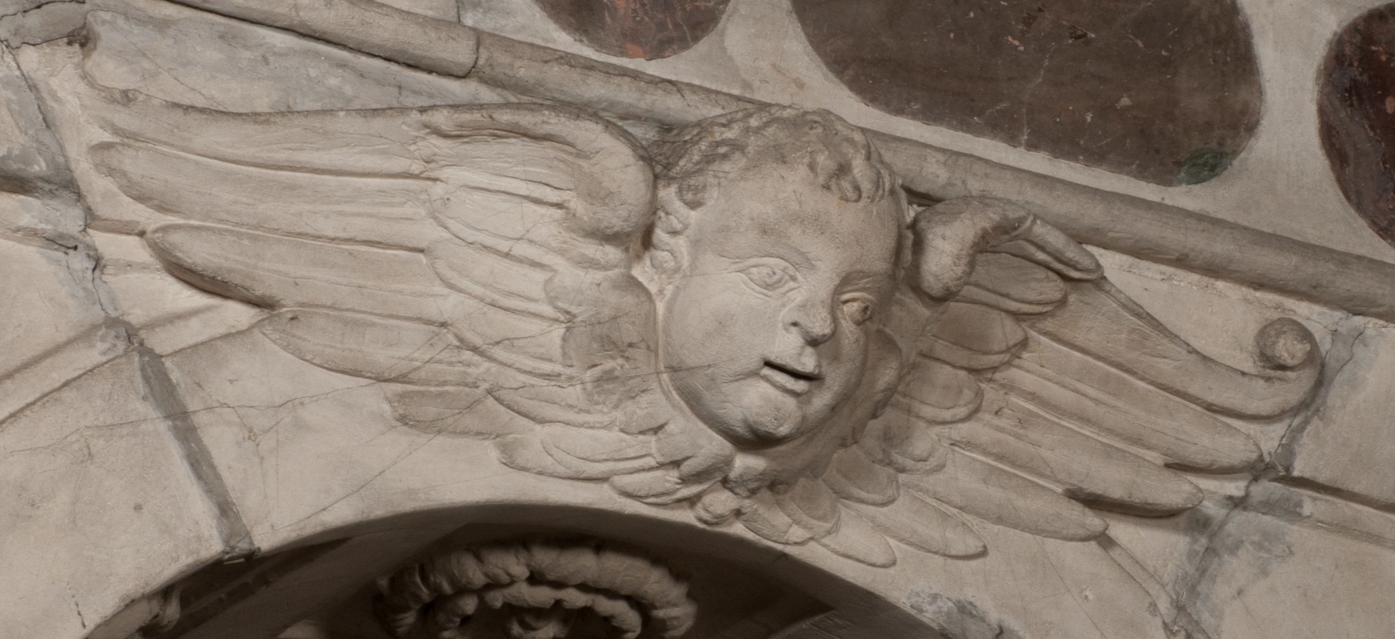 W warstwie ikonograficznej na uwagę zasługuje szereg motywów eschatologicznych takich jak skrzyżowane piszczele z trupią czaszką, czy leżące putto z klepsydrą. To ostatnie przedstawienie należy do tradycyjnych wyobrażeń śmierci, ukazywanej jako młodzieńczy bóg Thanatos. Wanitatywną wymowę podkreśla klepsydra, uważana powszechnie za symbol przemijania czasu, co dobitnie podkreśla inskrypcja „Dzisiaj mnie / jutro Tobie”. Taki sposób przedstawiania śmierci pojawił się po raz pierwszy w 1458 roku na medalu weneckiego medaliera Giovanniego Boldù i został spopularyzowany w malarstwie, a szczególnie w grafice niderlandzkiej XVI i XVII wieku. O jego popularności niech świadczy zachowany w zbiorach wawelskich obraz Bartholomeusa Sprangera z około 1600 roku.