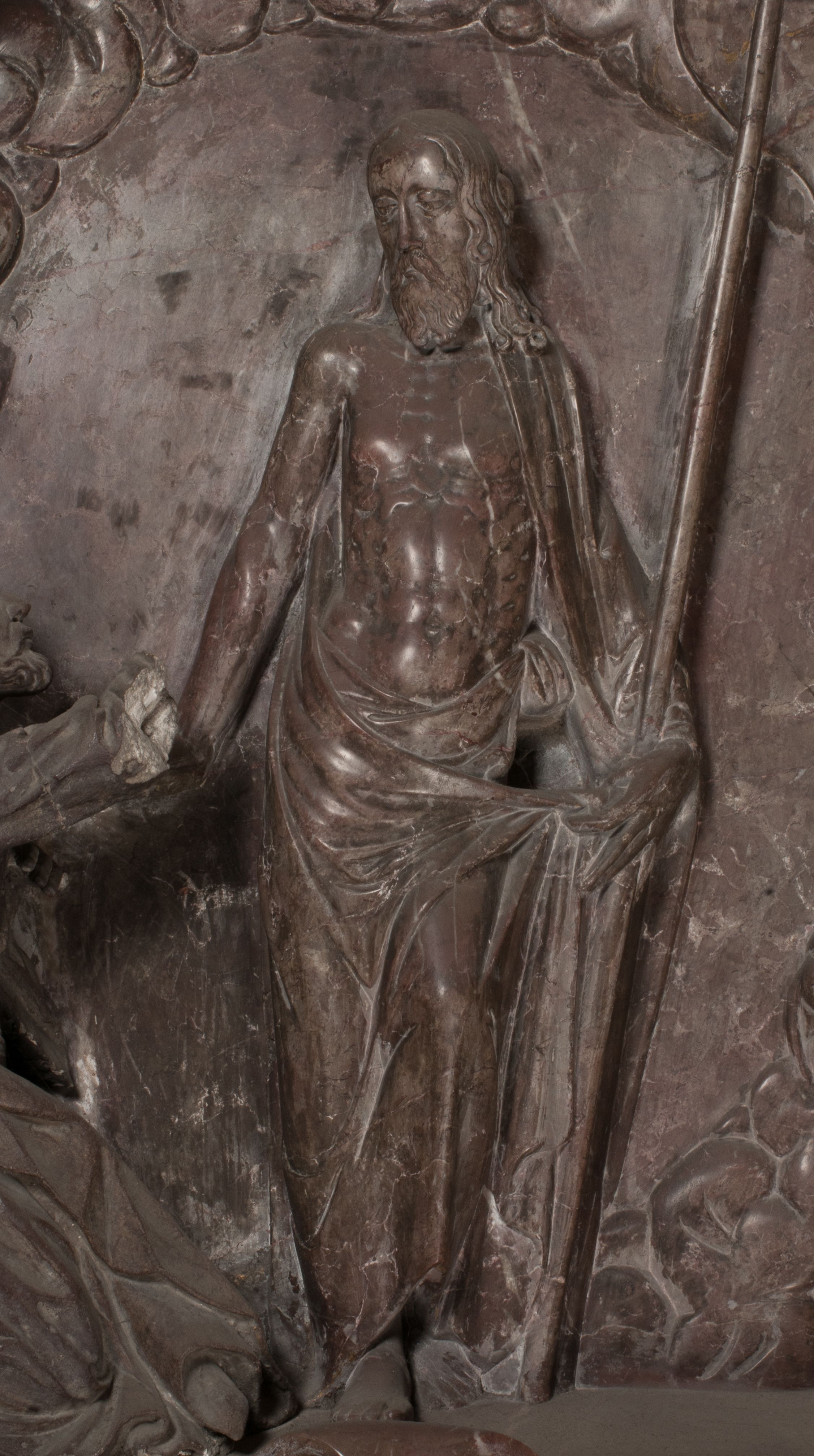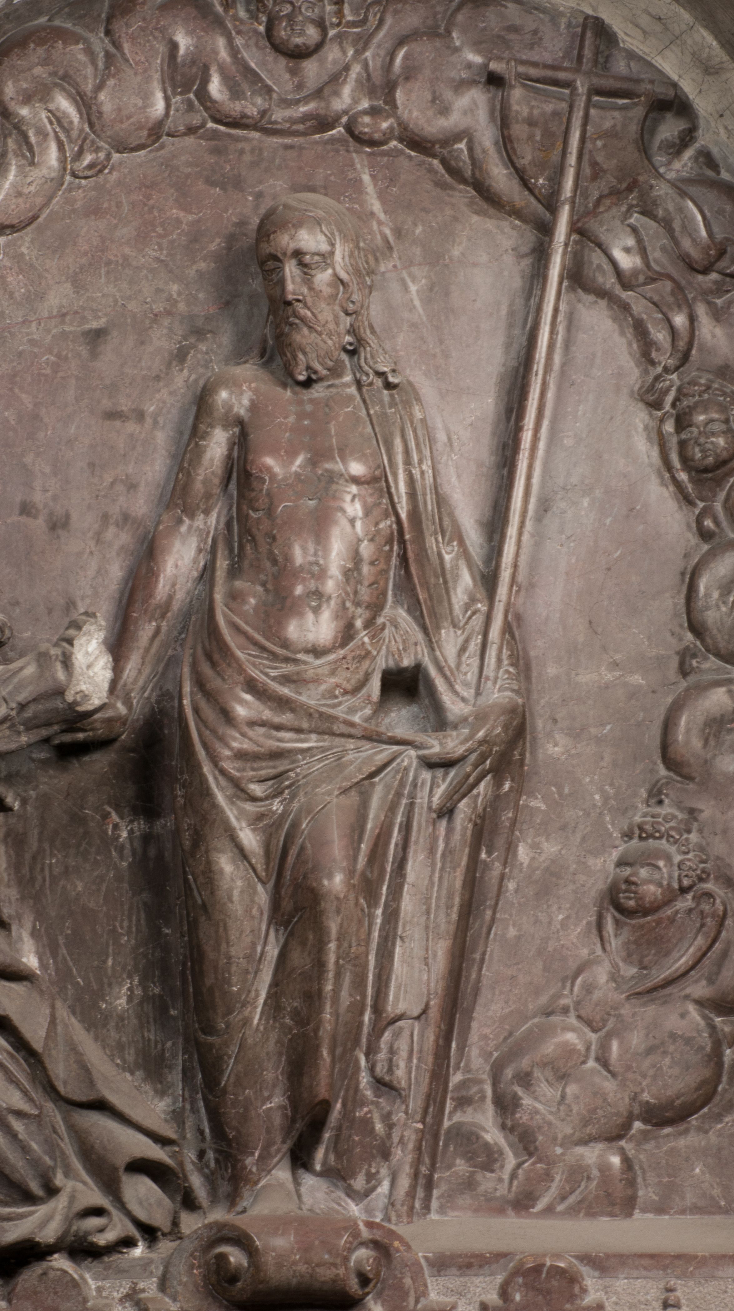 Zbawiciel jest ujęty całopostaciowo, frontalnie, w niewielkim wykroku, z głową zwróconą lekko do klęczącego po prawej stronie św. Tomasza. Jego ciało jest smukłe, wąskie w ramionach, z zaznaczonymi żebrami i mięśniami, osłonięte przewiązaną na biodrach szatą i płaszczem na lewym ramieniu. Chrystus ma pociągłą twarz, o wysokim czole, szerokich kościach policzkowych, wydatnym nosie i z głębokimi oczodołami. Przedstawiony został z długimi wąsami i brodą oraz opadającymi na ramiona, kręconymi włosami. W lewej ręce trzyma chorągiew i podtrzymuje szatę, a prawą rękę ma opuszczoną ku dołowi.