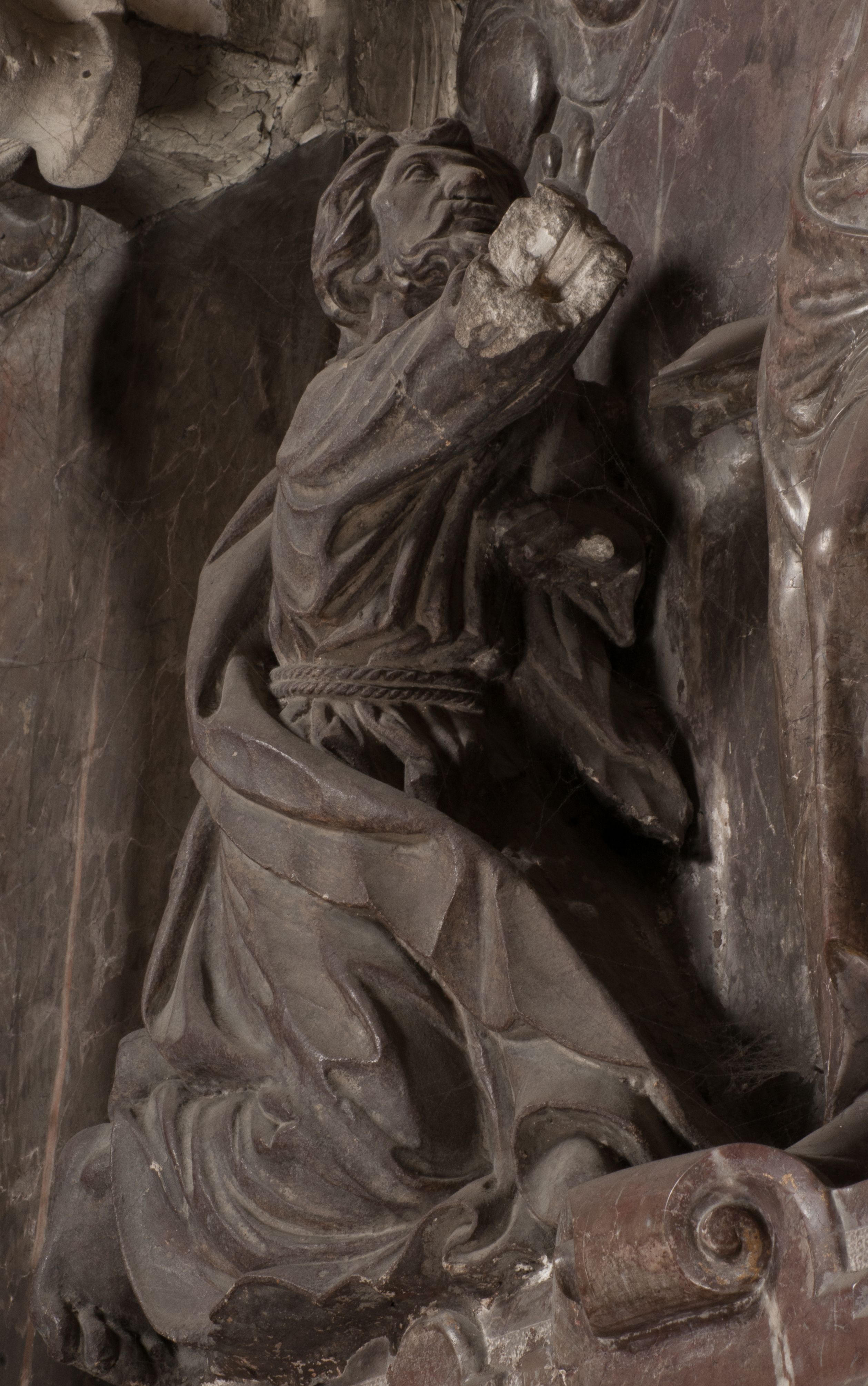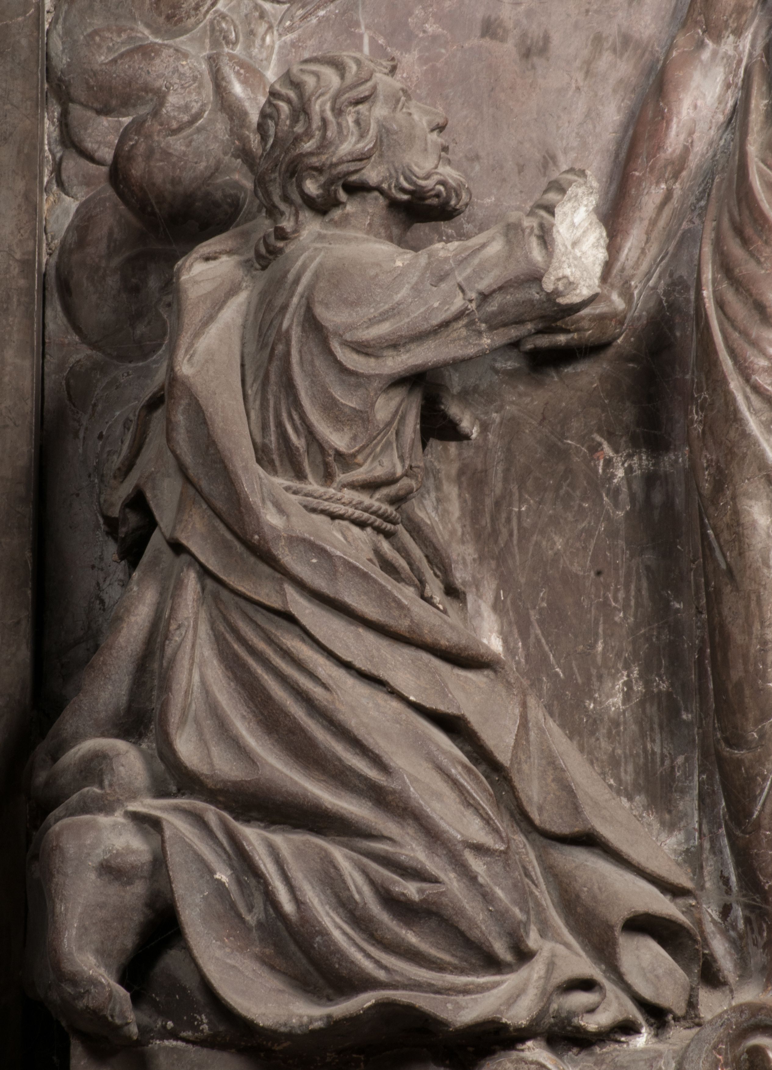 Święty Tomasz ukazany jest z profilu, w szacie podwójnie przewiązanej w pasie sznurem i przerzuconym przez lewe ramie płaszczem. Twarz z brodą i długimi włosami, odwrócona w stronę Chrystusa. Do góry unosi również prawą rękę, zachowaną tylko do łokcia, lewą rękę trzyma ponad pasem. Figura mężczyzny wyrzeźbiona w kamieniu, polichromowana, przysłania wieniec z obłoków i uskrzydlonych głów puttów otaczający Chrystusa.