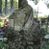 Kamień zabrudzony, pokryty mchem, miejcami z widocznymi odpryskami.
