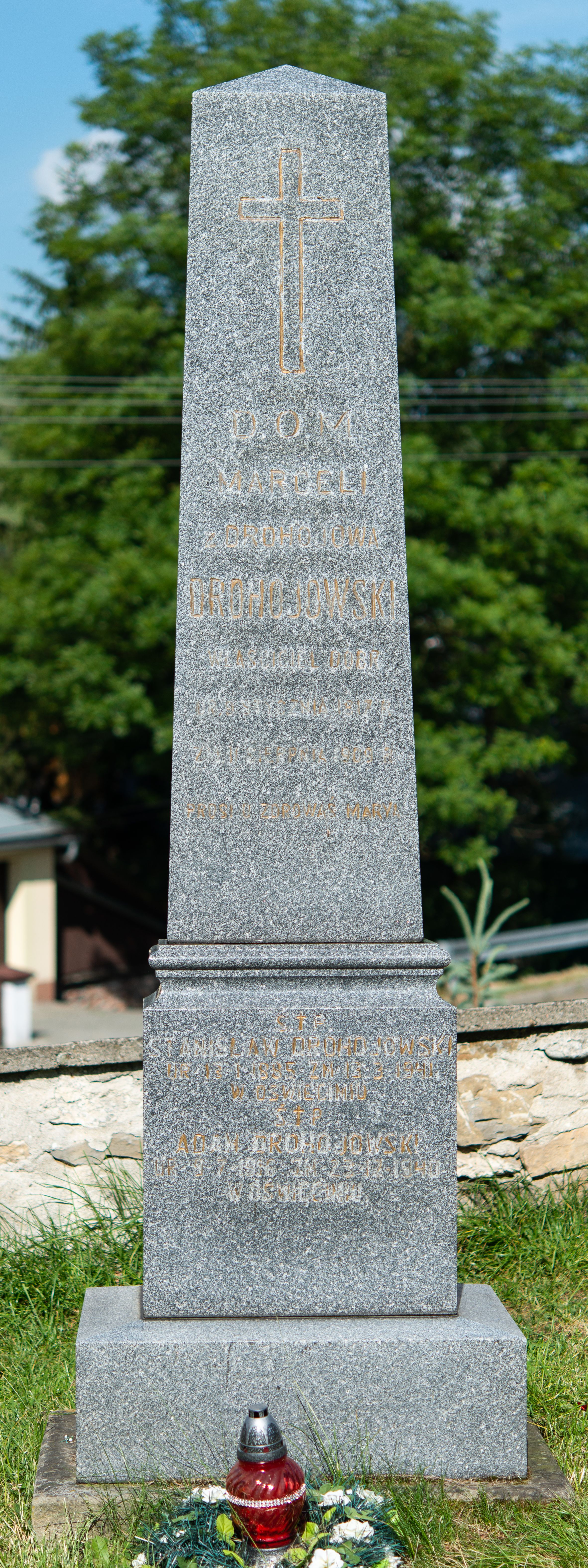 Nagrobek w formie obelisku, ustawionego na wysokim stopniu oraz cokole zakończonym profilowaniem. Na froncie obelisku złocony krzyż i inskrypcja: „D(EO) O(PTIMO) M(AXIMO) / MARCELI / z DROHOJOWA / DROHOJOWSKI / WŁAŚCICIEL DÓBR / UR(ODZONY) 9. STYCZNIA 1817 R(OKU) / ZM(ARŁY) 1[...] SIERPNIA 1909 R(OKU) / PROSI O ZDROWAŚ MARYA”. W partii cokołu inskrypcje: „Ś(WIĘTEJ) P(AMIĘCI) / STANISŁAW DROHOJOWSKI / UR(ODZONY) 13 1 1885 ZM(ARŁY) 13-3-1941 / W OŚWIĘCIMIU” oraz „Ś(WIĘTEJ) P(AMIĘCI) / ADAM DROHOJOWSKI / UR(ODZONY) 9 7 1916 ZM(ARŁY) 23 12 1940 / W OŚWIĘCIMIU”.