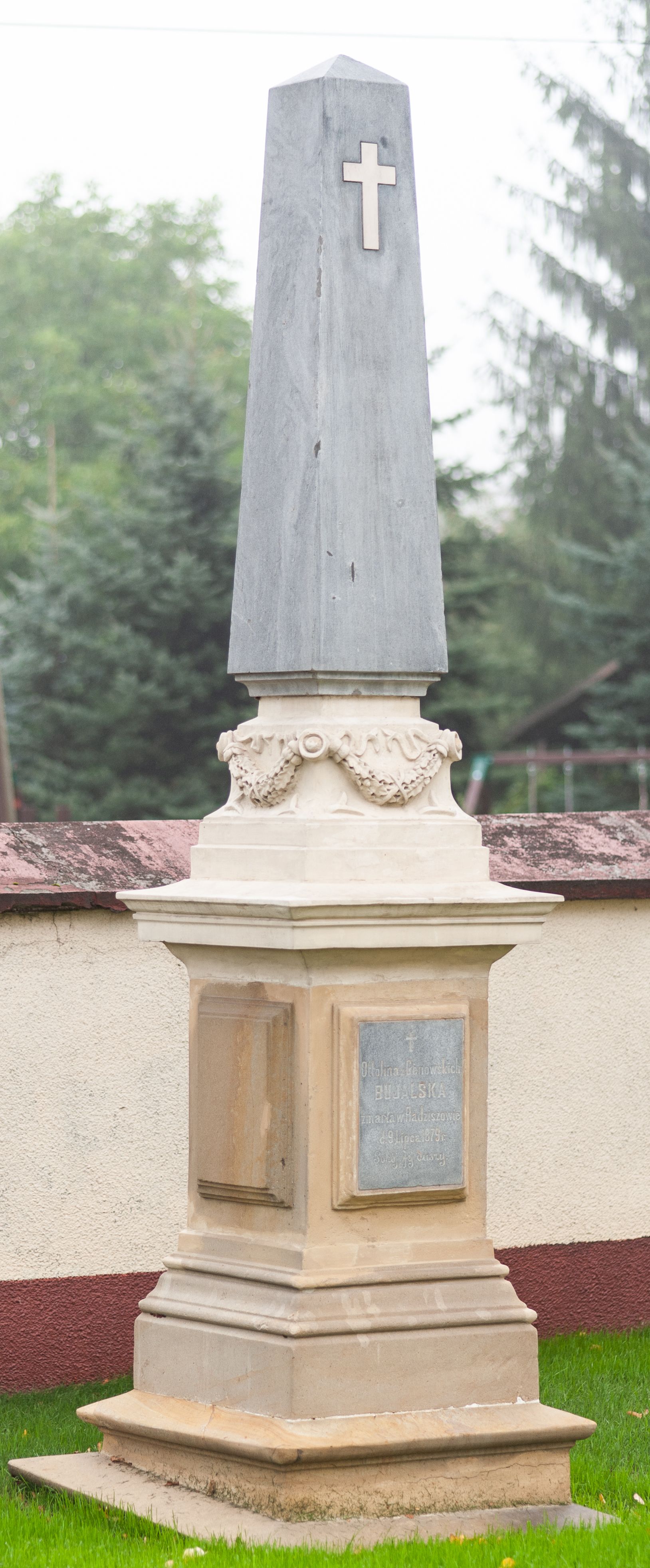 Nagrobek w formie obelisku ustawionego na trzystrefowym, wysokim cokole, dekorowanym w górnej części festonami i wstążkami. Na frontowej ścianie środkowej części tablica w kształcie stojącego prostokąta z inskrypcją poniżej krzyża łacińskiego „Ottolina z Cenowskich / BUJALSKA / zmarła w Radziszowie / d(nia) 9 Lipca 1879 r(oku) / Pokój Jej duszy.”