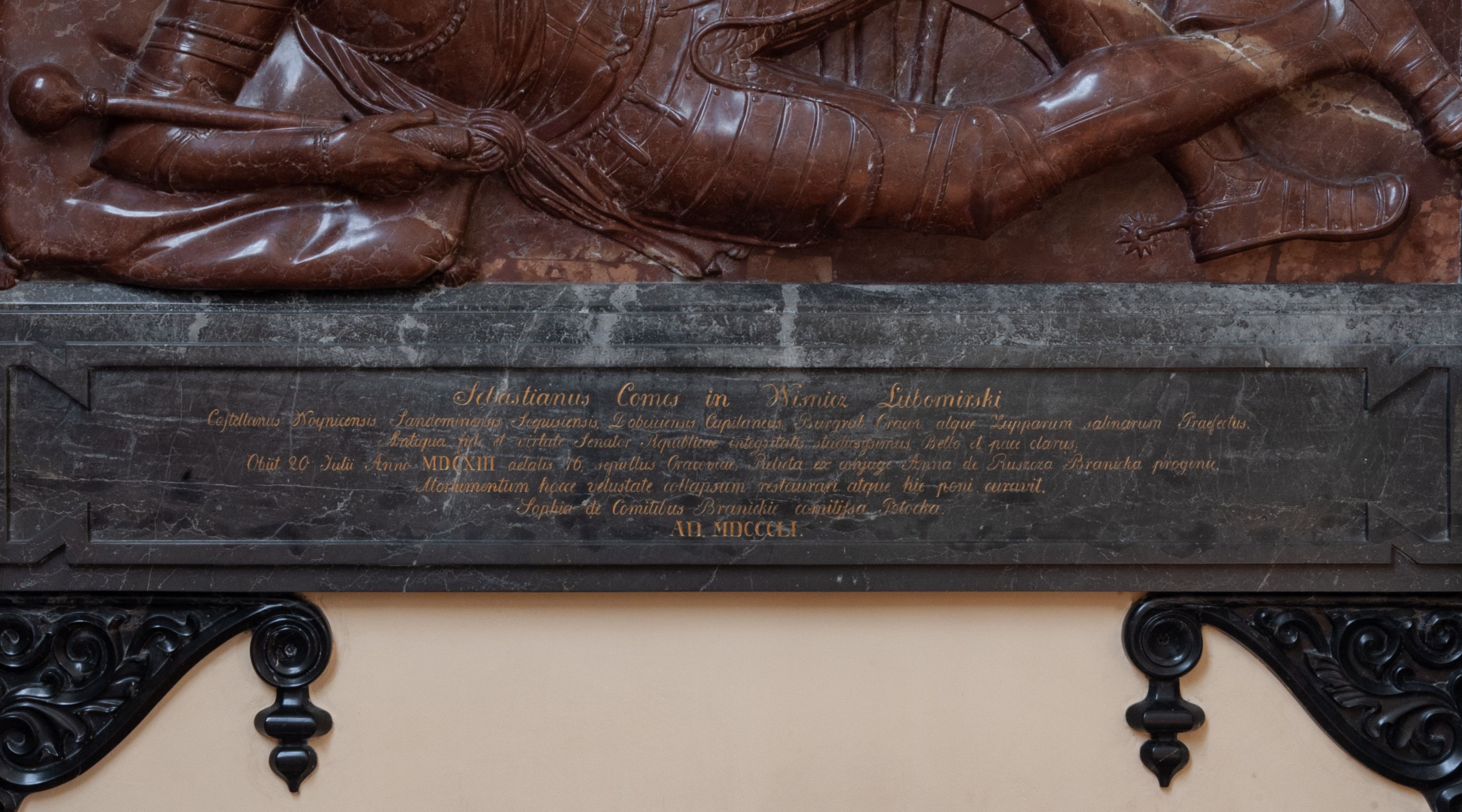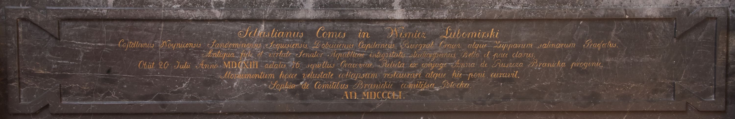Na podstawie obramienia inskrypcja "Sebastianus Comes in Wisnicz Lubomirski / Castellanus Woynicensis Sandomiriensis Scepusiensis, Dobciciensis Capitaneus Burgrab(ius) Cracov(iensis) atque Zupparum salinarum Praefectus. / Antiqua fide et virtute Senator Republicae integritatis studiosysimus, Bello et pace clarus; / Obiit 20 Julii Anno MDCXIII aetatis 76; sepullus Cracoviae; Relicta ex conjuge Anna de Ruszcza Branicka progenie. / Monumentum hocce velustate collapsum restaurari atque hic poni curavit. Sophia de Comitibus Branickie comitissa Potocka. / A(NNO) D(OMINI) MDCCCLI".