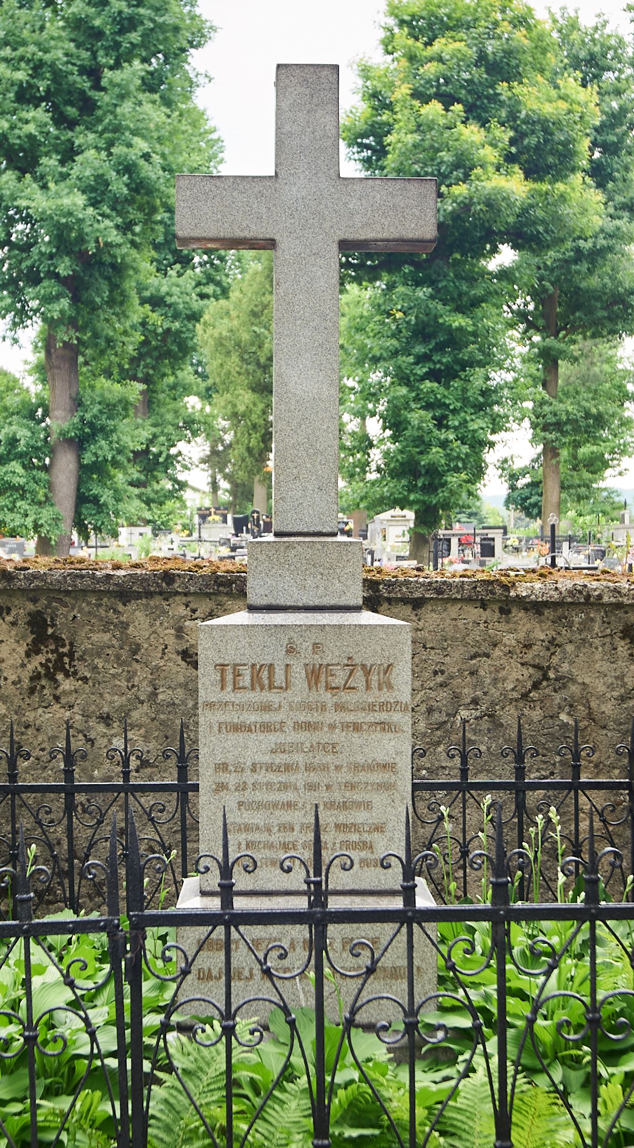 „Ś(WIĘTEJ) P(AMIĘCI) / TEKLI WĘŻYK / PRZEŁOŻONEJ SIÓSTR MIŁOSIERDZIA / I FUNDATORCE DOMU W TENCZYNKU / JUBILATCE / UR(ODZONEJ) 27 STYCZNIA 1830 W KRAKOWIE / ZM(ARŁEJ) 23 STYCZNIA 1911 W TENCZYNKU / POCHOWANEJ W KRAKOWIE / STAWIAJĄ TEN KRZYŻ WDZIĘCZNE / I KOCHAJĄCE SERCA Z PROŚBĄ […]”