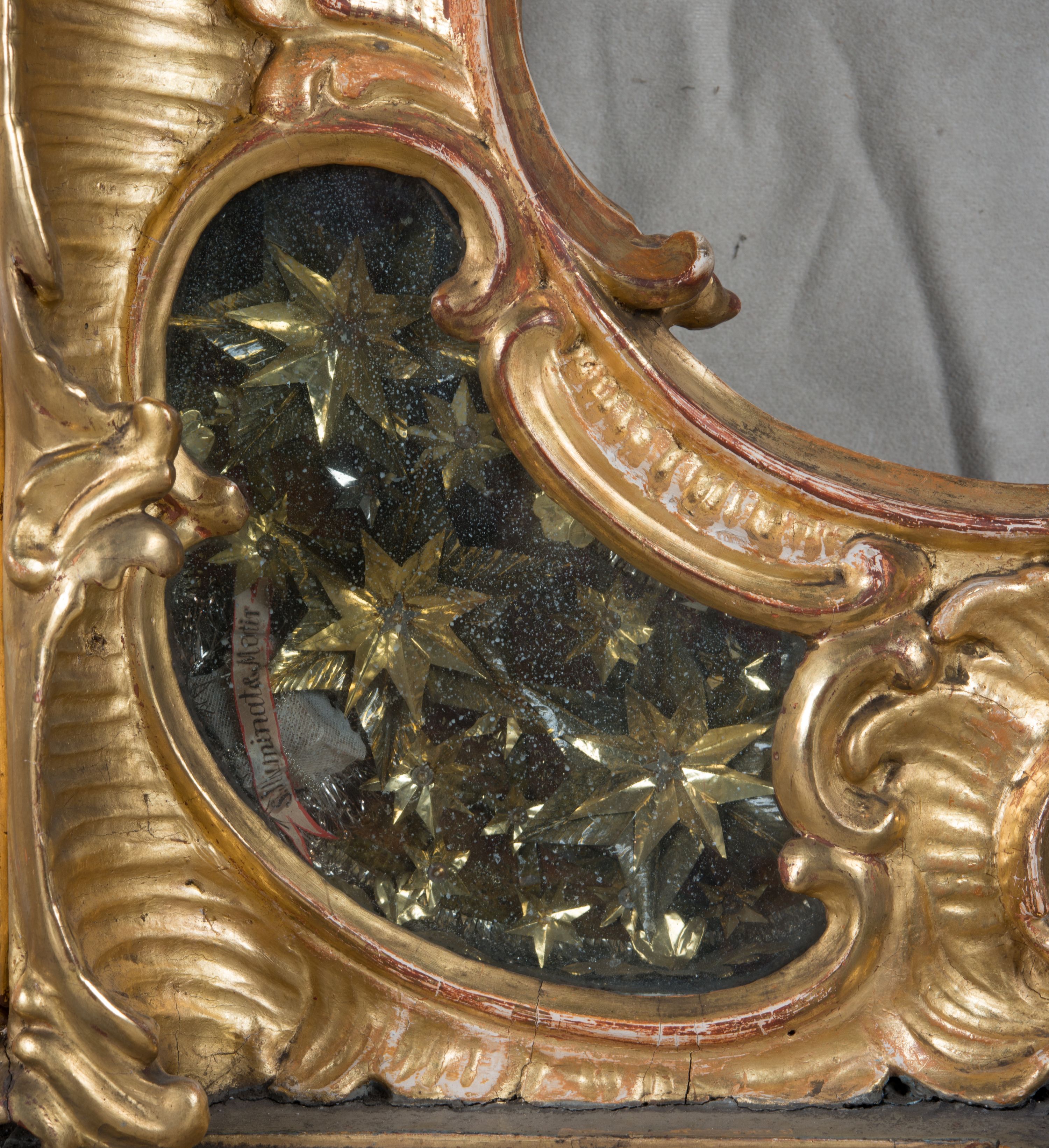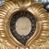 Po bokach zamiast gablotek owoidalne pola, w których znajduje się złocona, drobna kratka.
