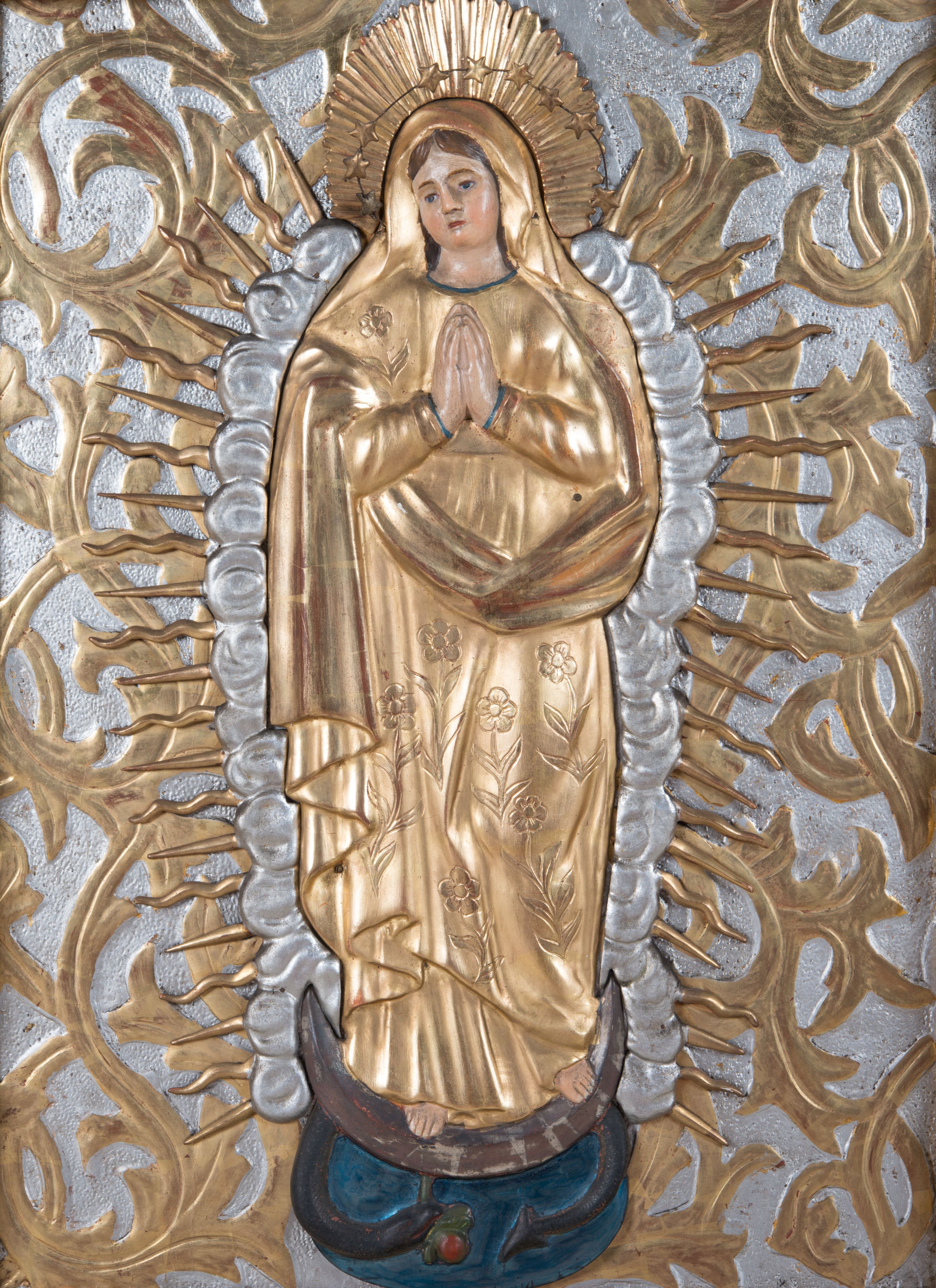 i falujących. Wokół głowy złoty, kolisty nimb z gęsto ułożonych promieni; na nim okrąg z gwiazd dwunastu, częściowo nie zachowany. Tło srebrne, zdobione złoconą