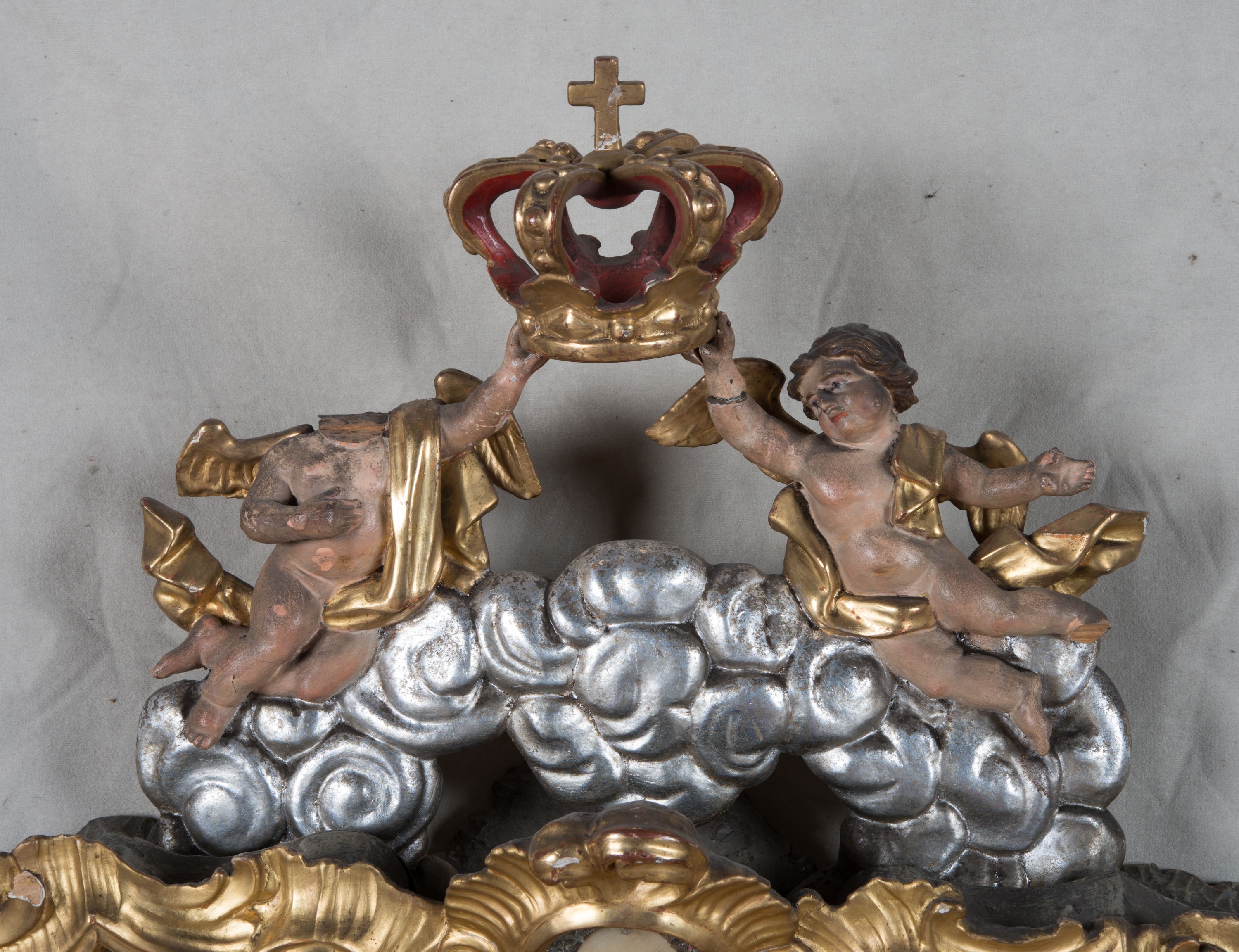 W zwieńczeniu, w polu środkowym monogram Marii, powyżej aniołki trzymające koronę widoczne od tyłu.