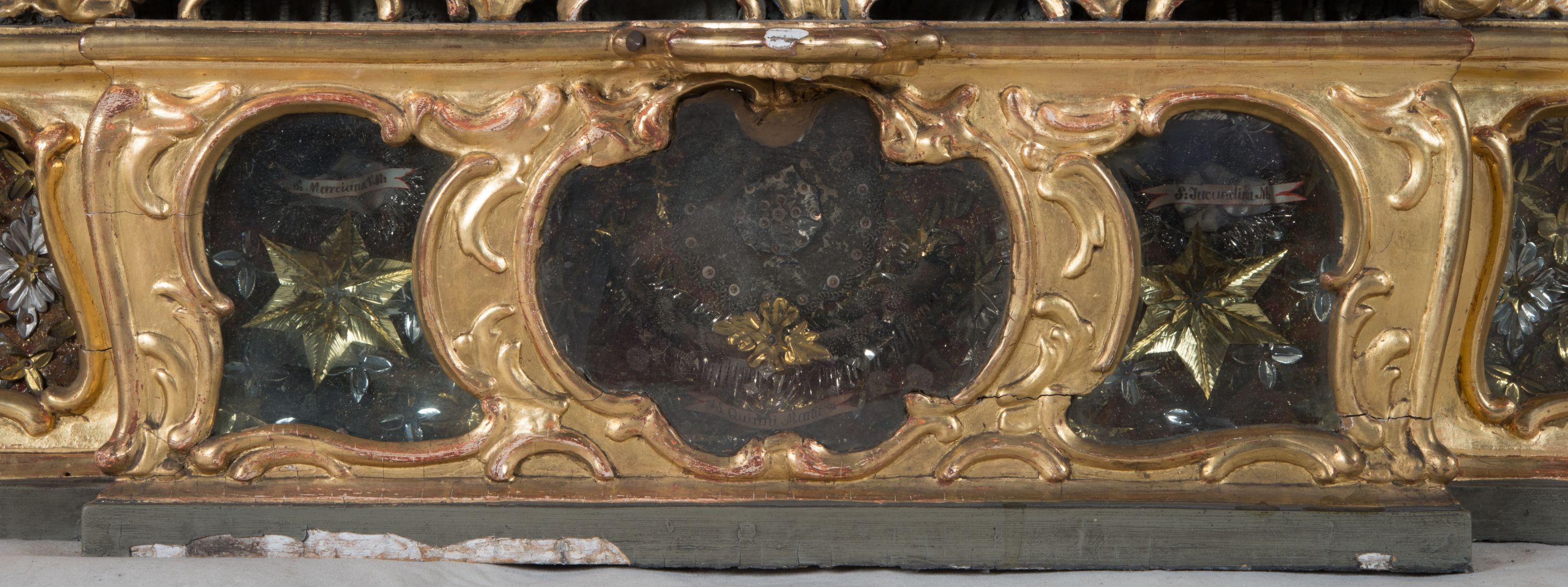 Relikwie świętych umieszczone w niewielkich gablotkach za szybkami, opisane na karteczkach. Zwieńczenie feretronu, od lewej: nierozpoznane relikwie świętego, plakietka z kości