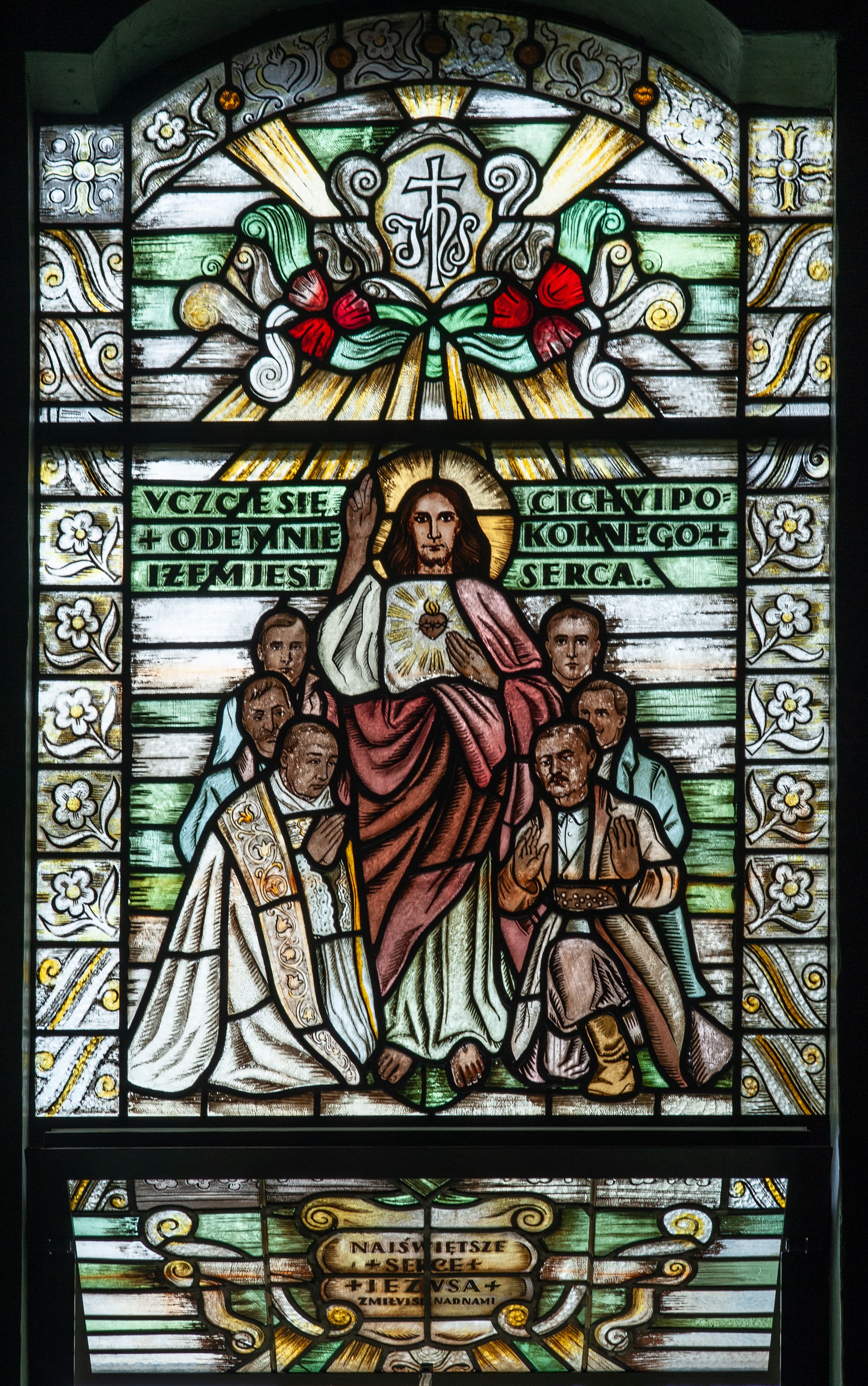 Witraż o wykroju prostokąta stojącego zakończonego łukiem odcinkowym nadwieszonym. Wewnątrz przedstawienie Chrystusa w otoczeniu sześciu postaci męskich. Chrystus w nimbie stojący frontalnie z prawą dłonią wyciągniętą w geście błogosławieństwa, lewą wskazuje na gorejące serce na piersi. Ubrany jest w białą tunikę i czerwony płaszcz przewinięty na wysokości pasa. W otoczeniu Chrystusa po lewej strony trzy postacie duchownych, z których pierwszy ubrany jest w komżę, kapę i stułę, a po prawej trzech mężczyzn w strojach chłopskich. Pierwszy z nich ma na sobie koszulę, kamizelkę, szerokie spodnie i sukmanę. Scena otoczona bordiurą z dekoracją kwiatową. Na wysokości głowy Chrystusa inskrypcja: „VCZCIE SIĘ / +ODE MNIE / IŻEM JEST / CICHY I PO/KORNEGO+ / SERCA.." Powyżej sceny katusz z inskrypcją „IHS”, otoczony wolutami i czerwonymi kwiatami, w glorii. Poniżej kartusz z inskrypcją „NAJŚWIĘTSZE / +SERCE+ / +JEZUSA+ / ZMIŁUJ SIĘ NAD NAMI” również w otoczeniu wolut. Witraż utrzymany w chłodnej kolorystyce, z przewagą szarości i zieleni.