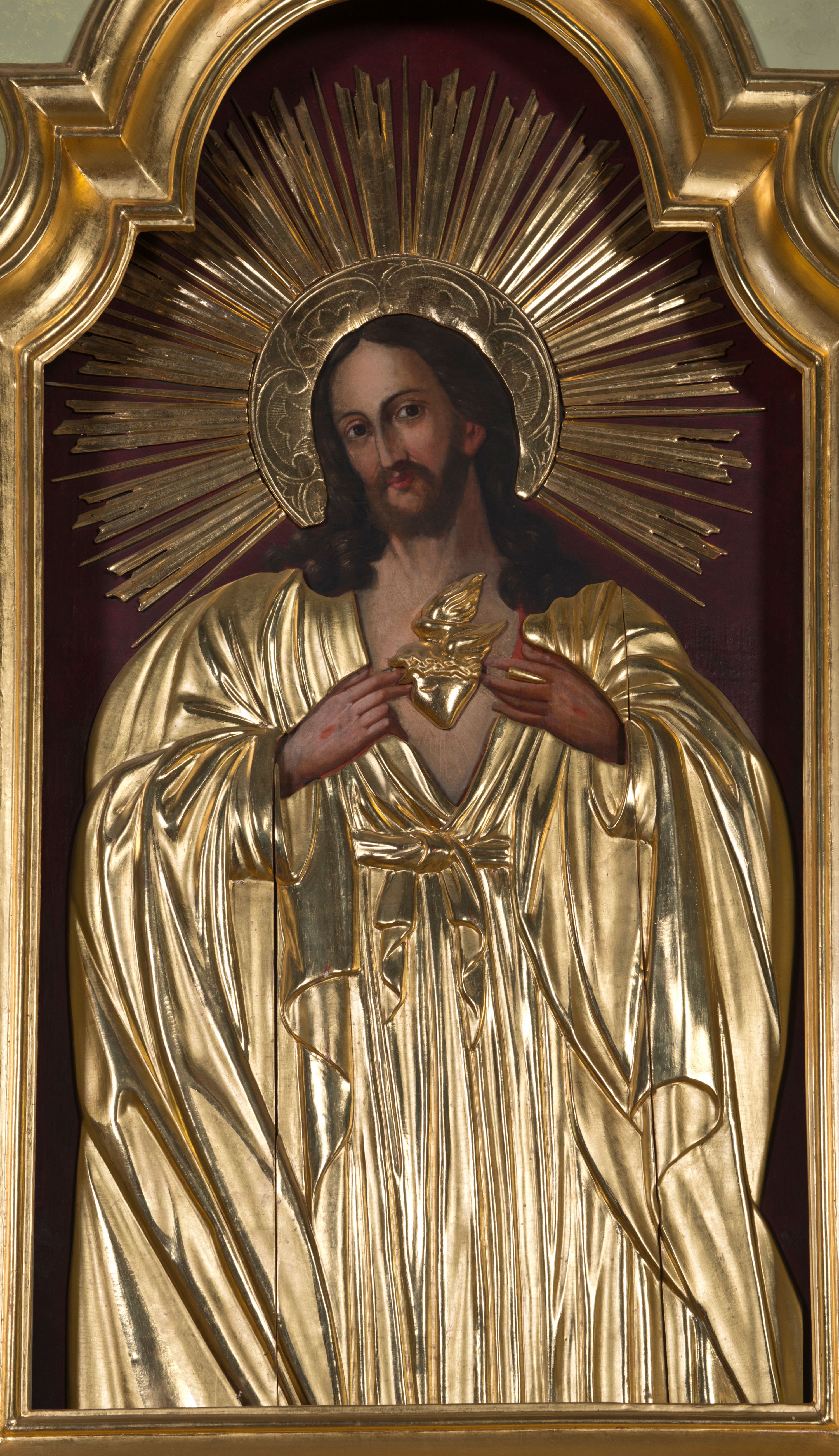 Obraz z wizerunkiem Najświętszego Serca Jezusa jest w kształcie stojącego prostokąta, od góry zamkniętego łukiem półkolistym, z górnymi narożnikami zaakcentowanymi przez wklęsłe łuki odcinkowe. Jezus został ukazany w półpostaci, niemal na wprost, głowę lekko przechyla w prawo. Pociągłą twarz charakteryzują delikatne rysy, długi prosty nos i krótki, ciemnobrązowy zarost. Długie, ciemnobrązowe, z przedziałkiem pośrodku, skręcone na końcach włosy opadają na ramiona. Dalsze elementy przedstawienia wydobyte są w obrębie partii złoconej sukienki: sylwetkę Jezusa osłania przewiązana pośrodku w pasie suknia o głęboko rozchylonym dekolcie; na ramiona narzucony jest płaszcz; dłońmi z ranami po gwoździach Jezus wskazuje na gorejące serce; jego głowę otacza nimb z wieńcem promieni. Tło jest jednolite, ciemnobordowe. Obraz ujęty jest profilowaną, złoconą ramą.